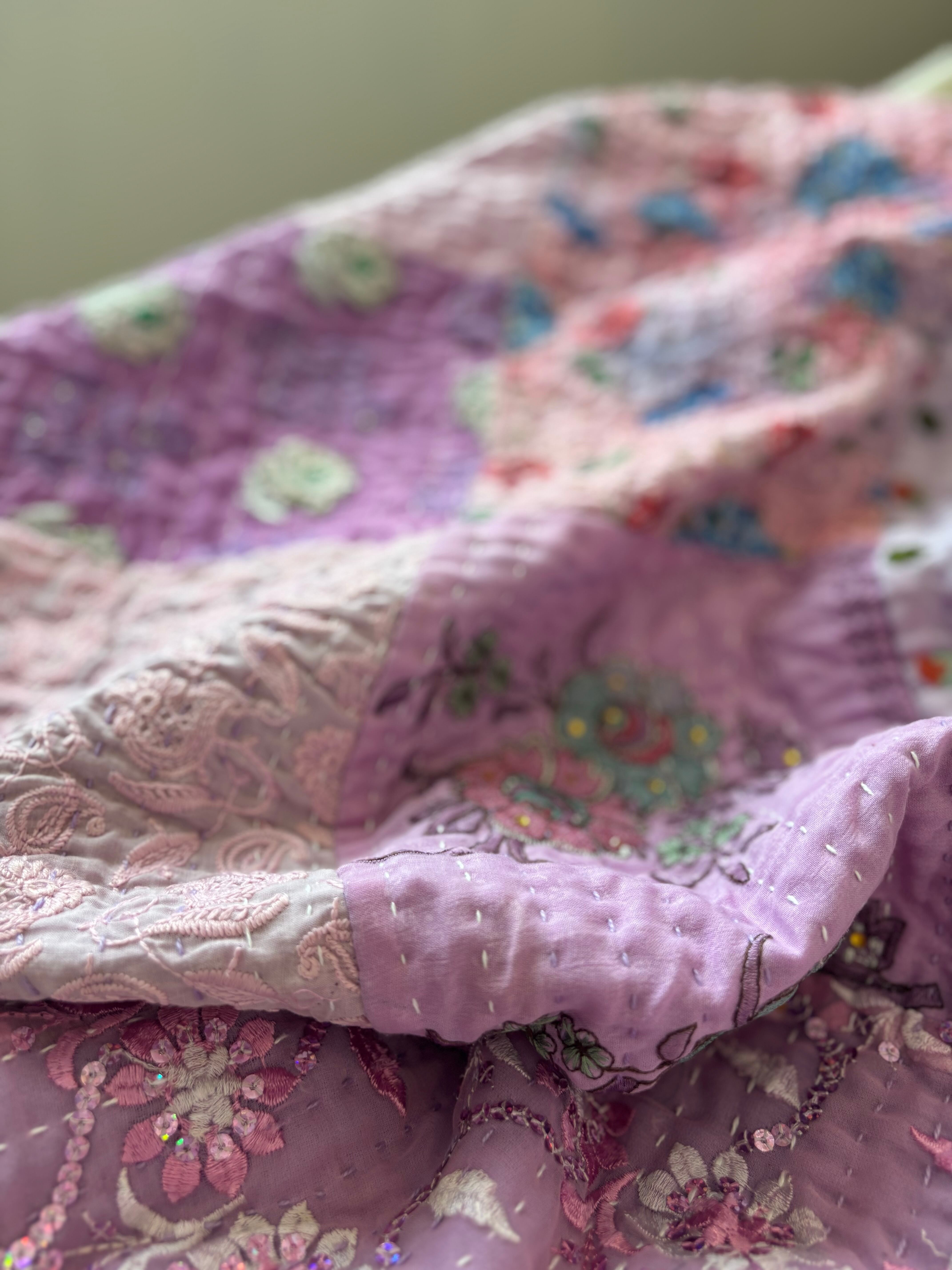 繋ぎ合わせたパッチワークキルトはとても華やか。