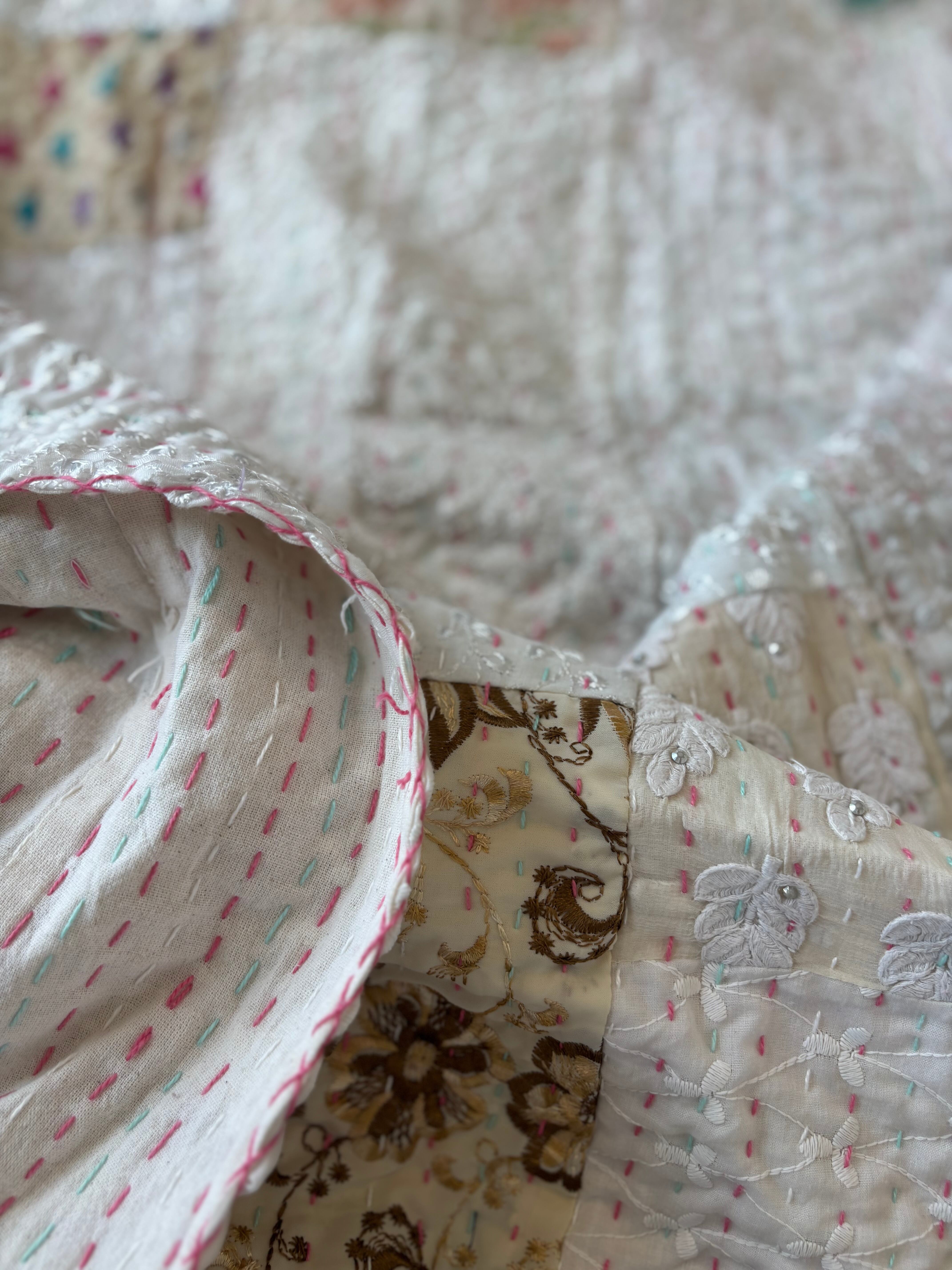 繋ぎ合わせたパッチワークキルトはとても華やか。