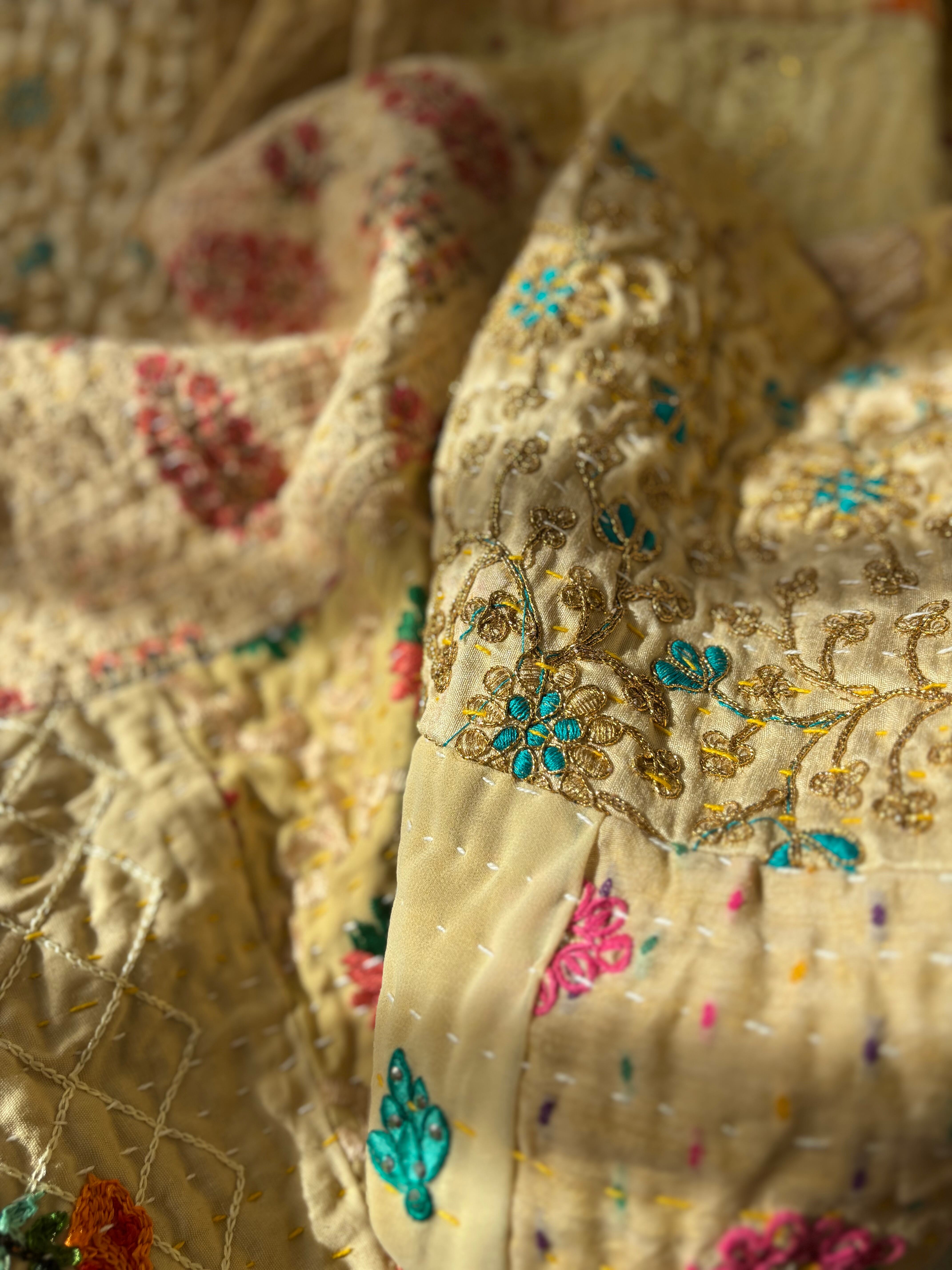 繋ぎ合わせたパッチワークキルトはとても華やか。