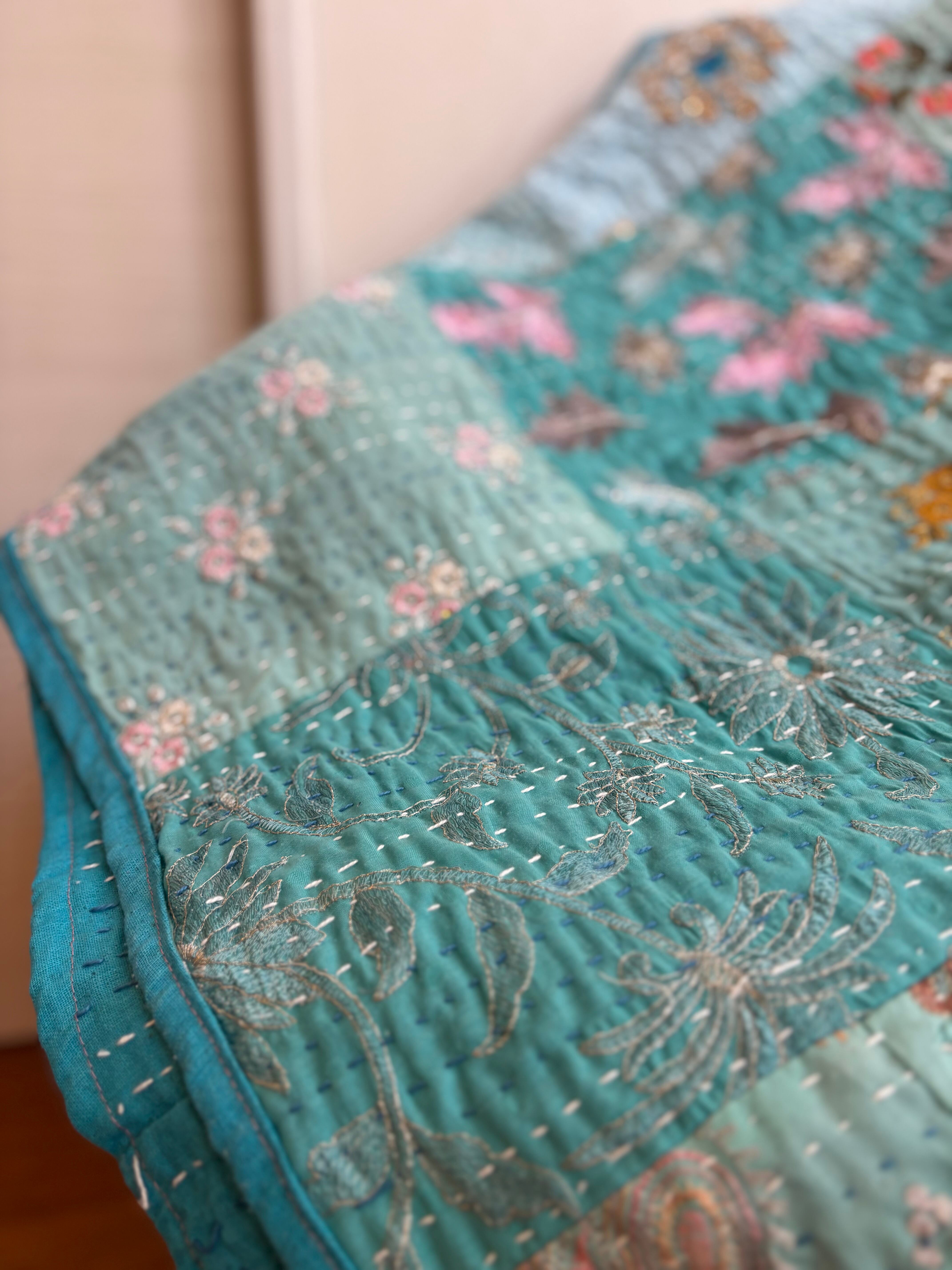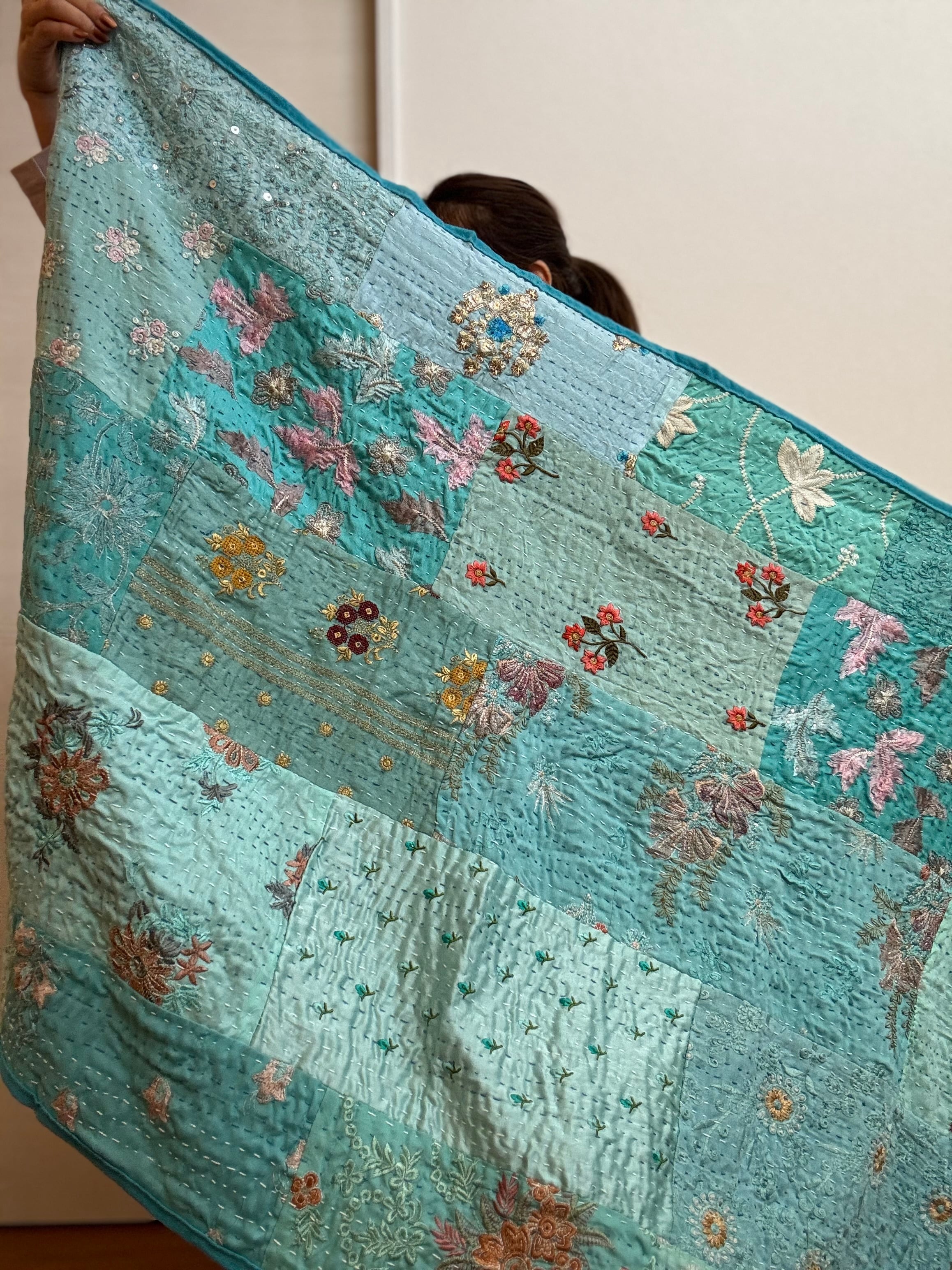 繋ぎ合わせたパッチワークキルトはとても華やか。