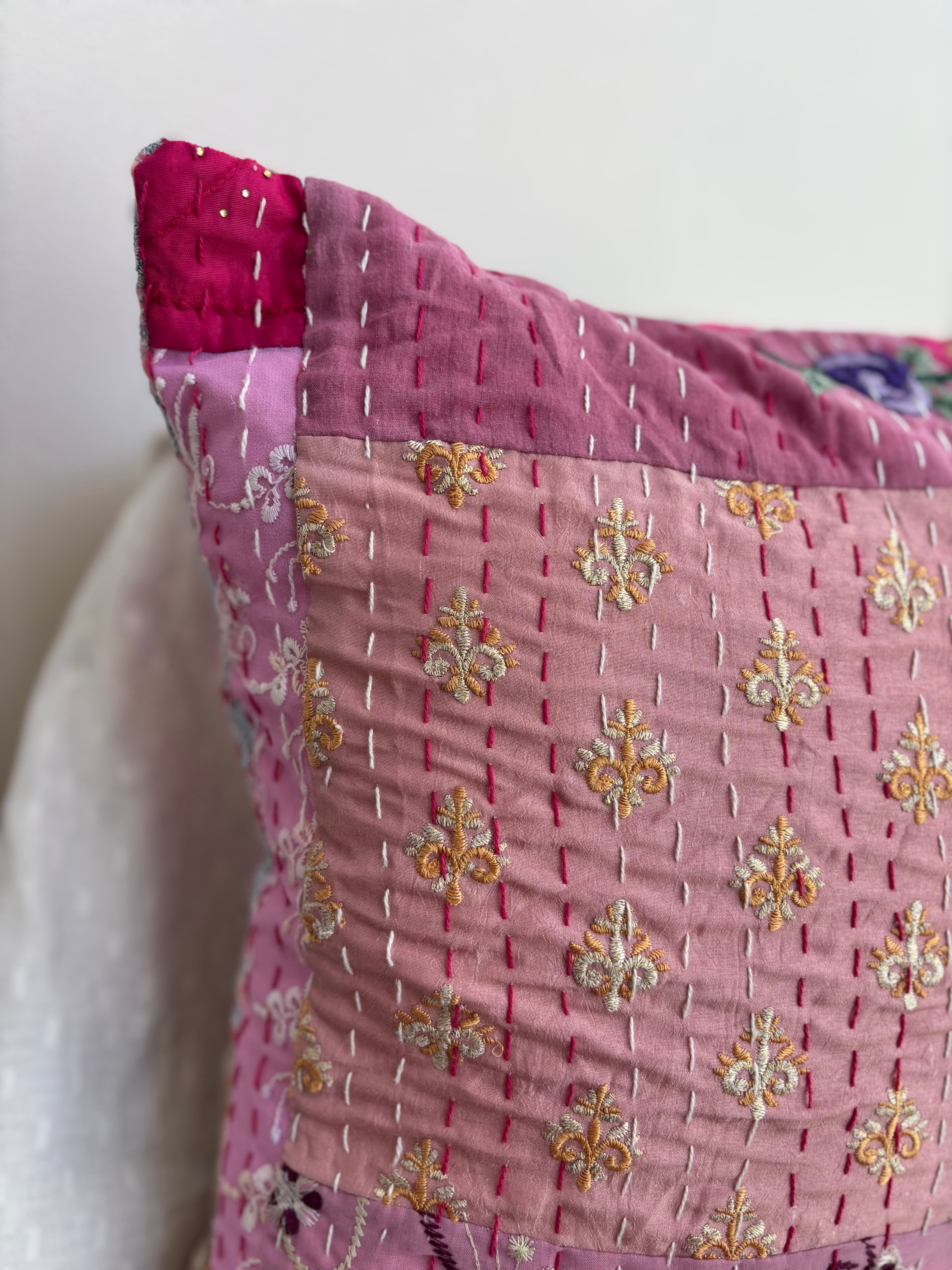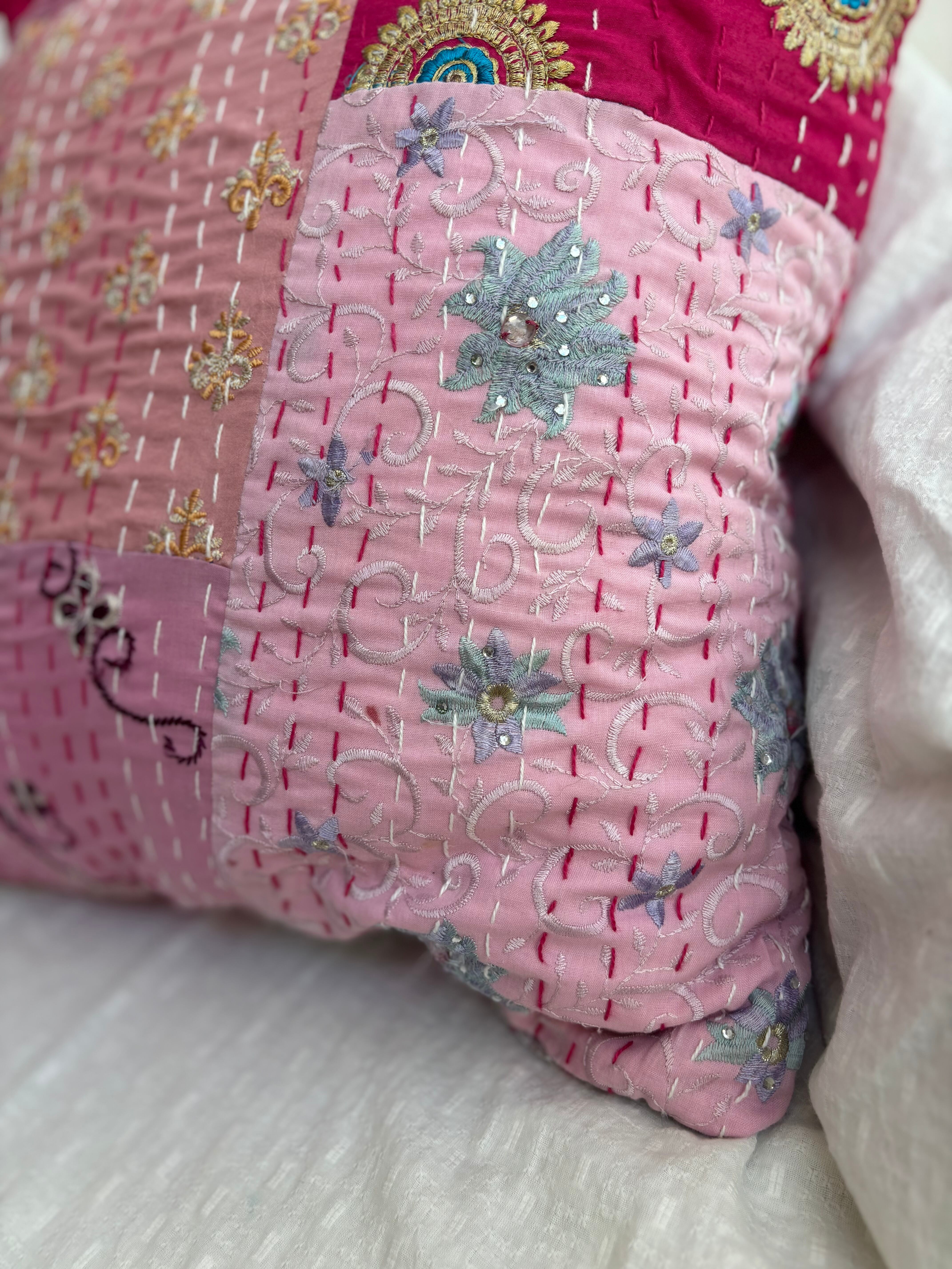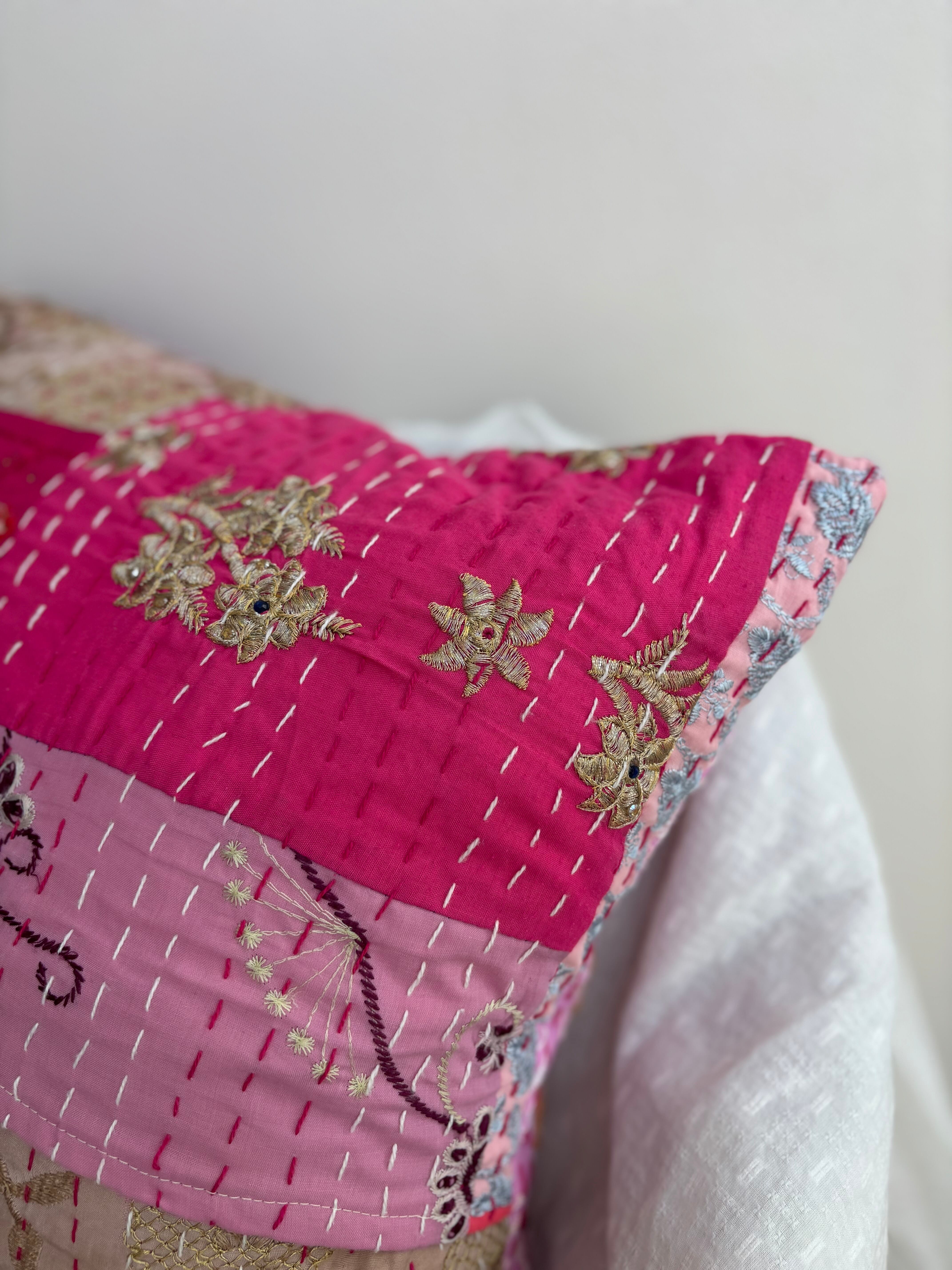 繋ぎ合わせたパッチワークキルトはとても華やか。