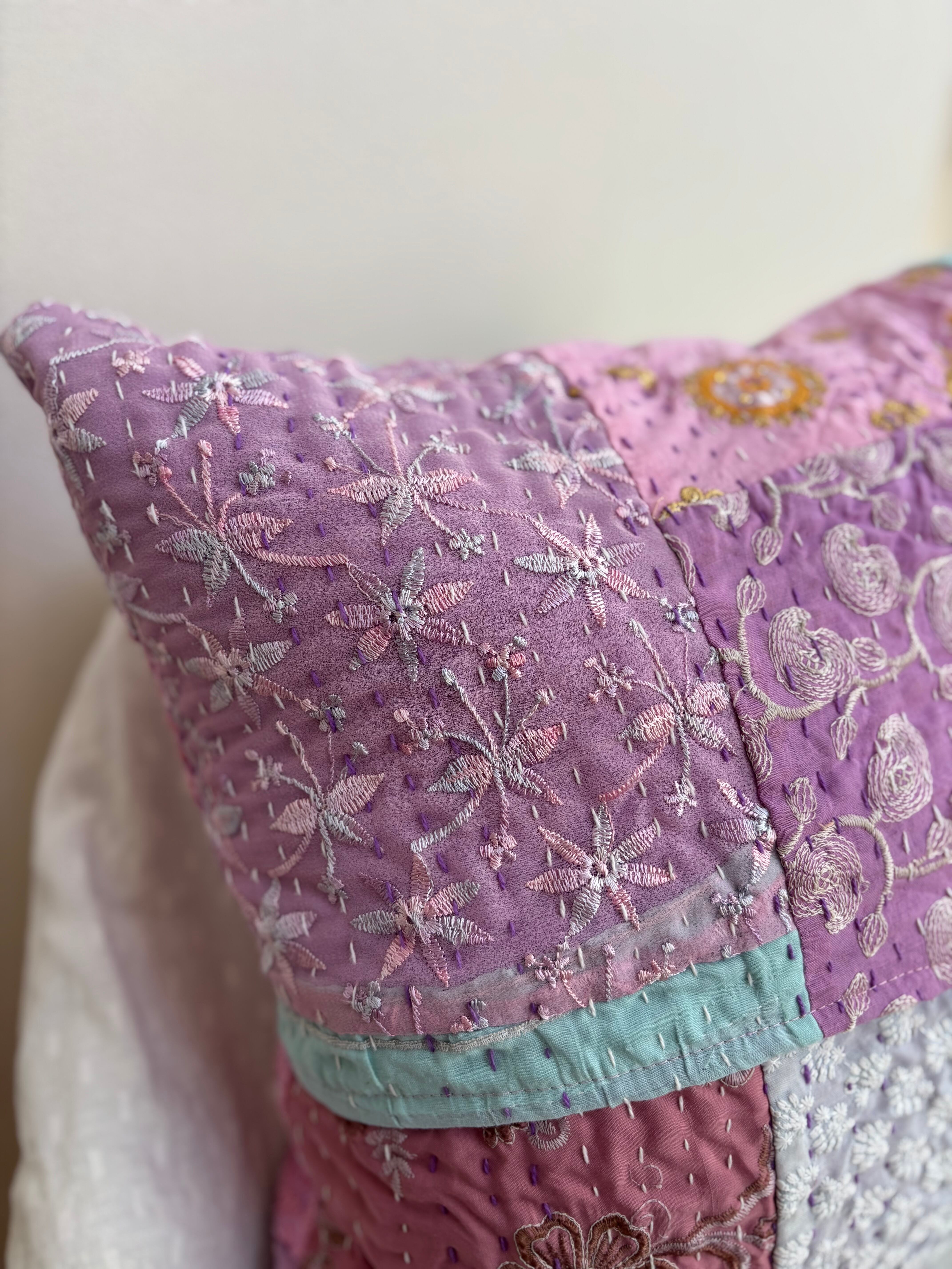 繋ぎ合わせたパッチワークキルトはとても華やか。