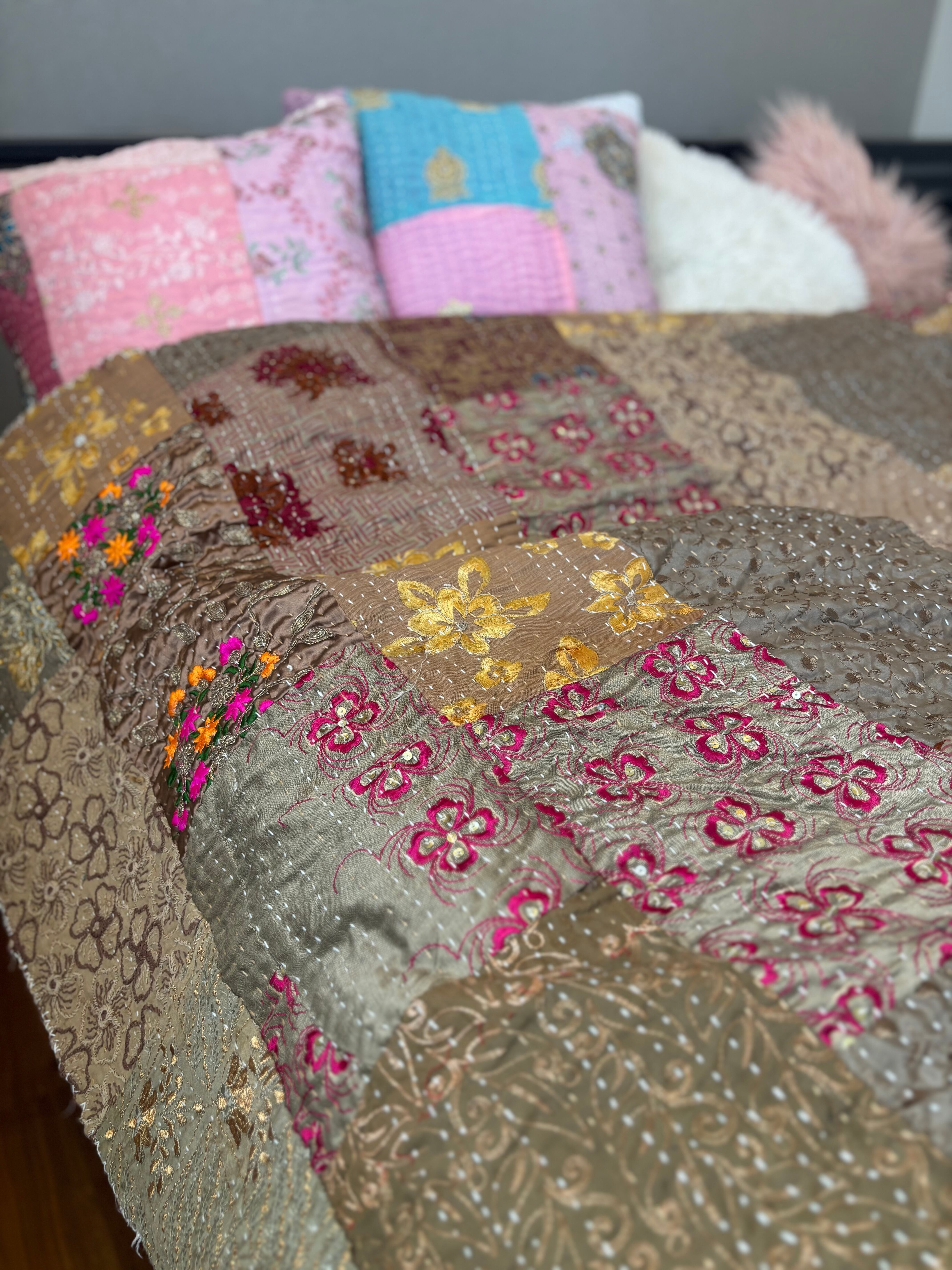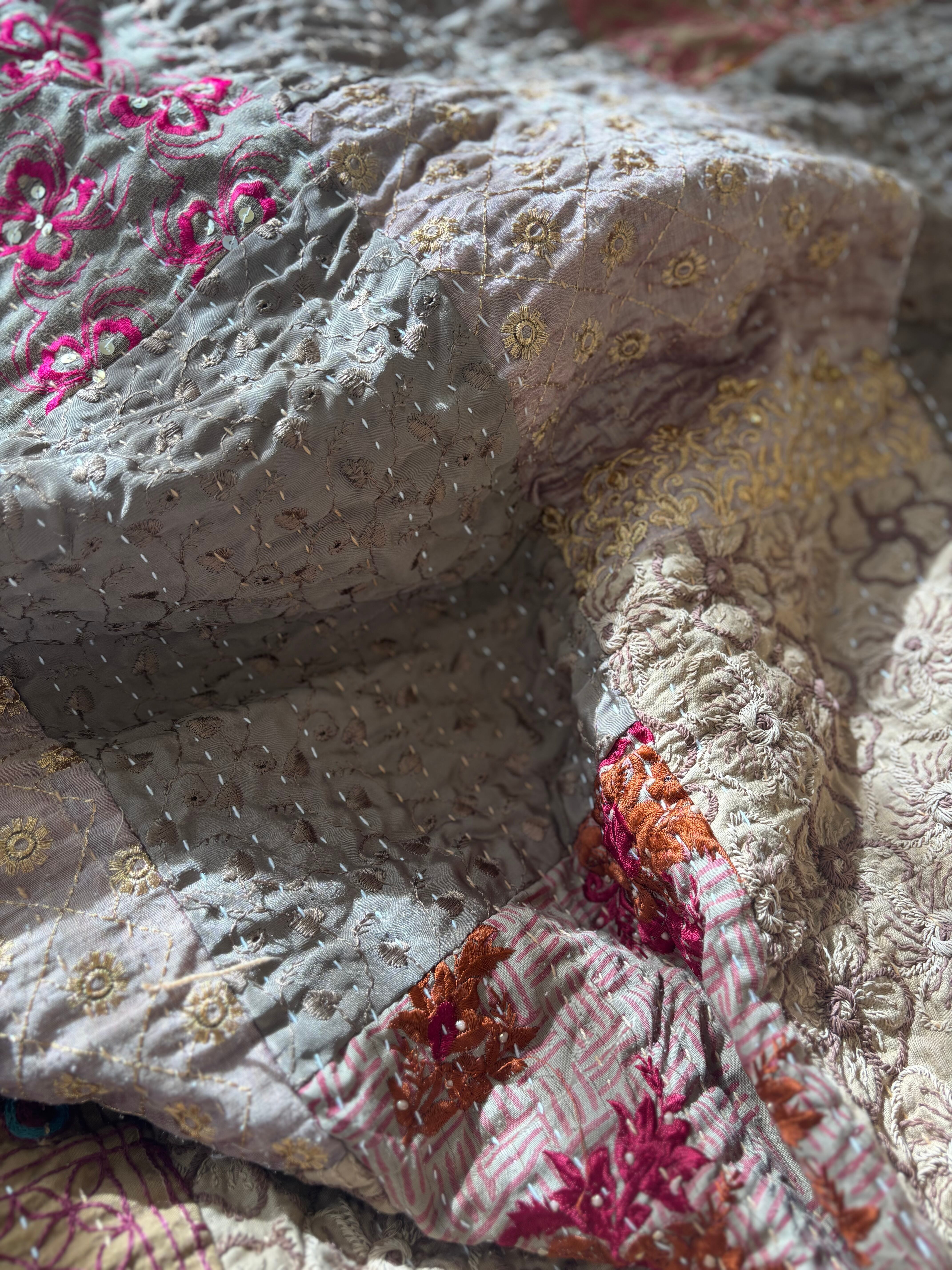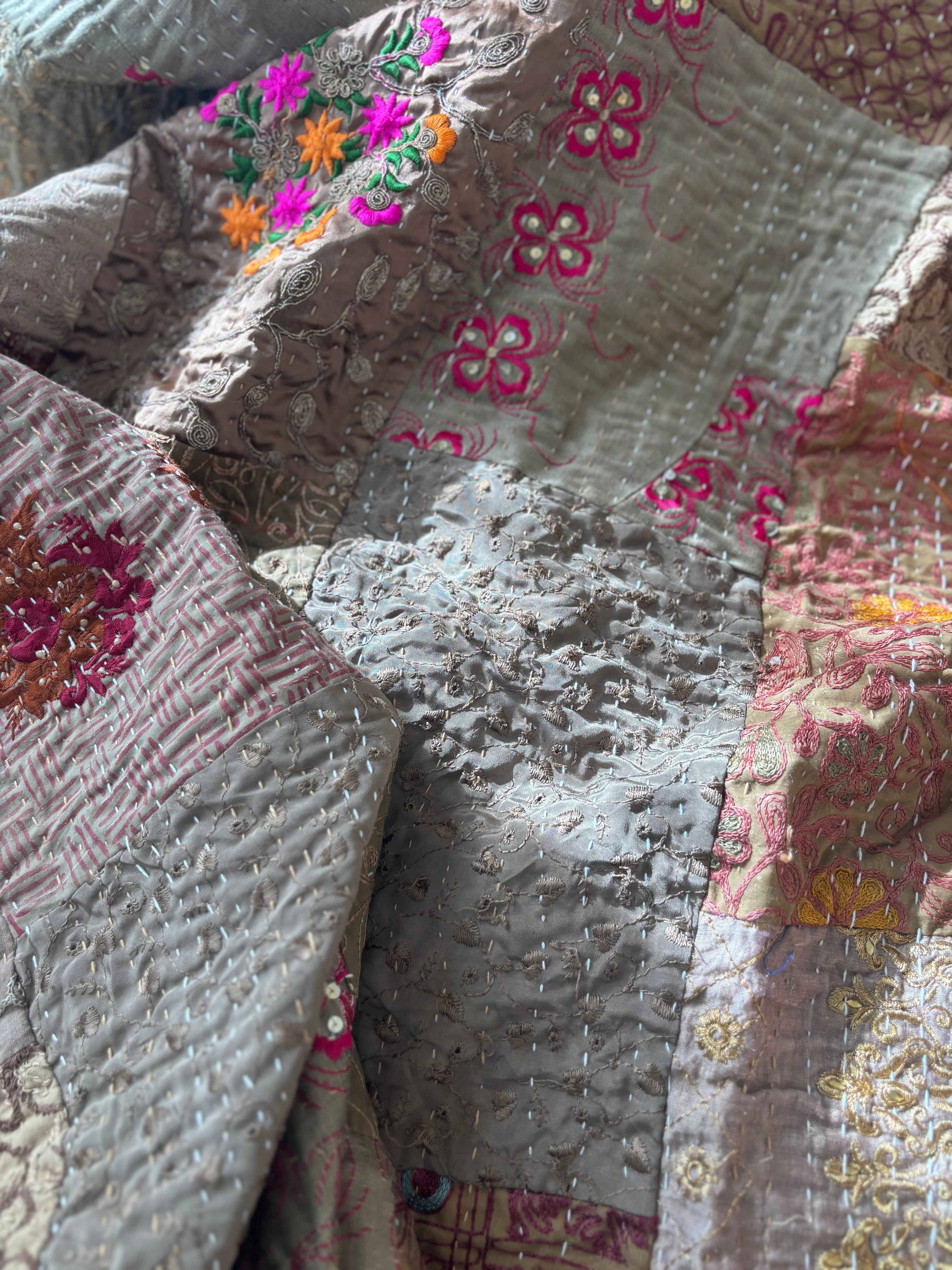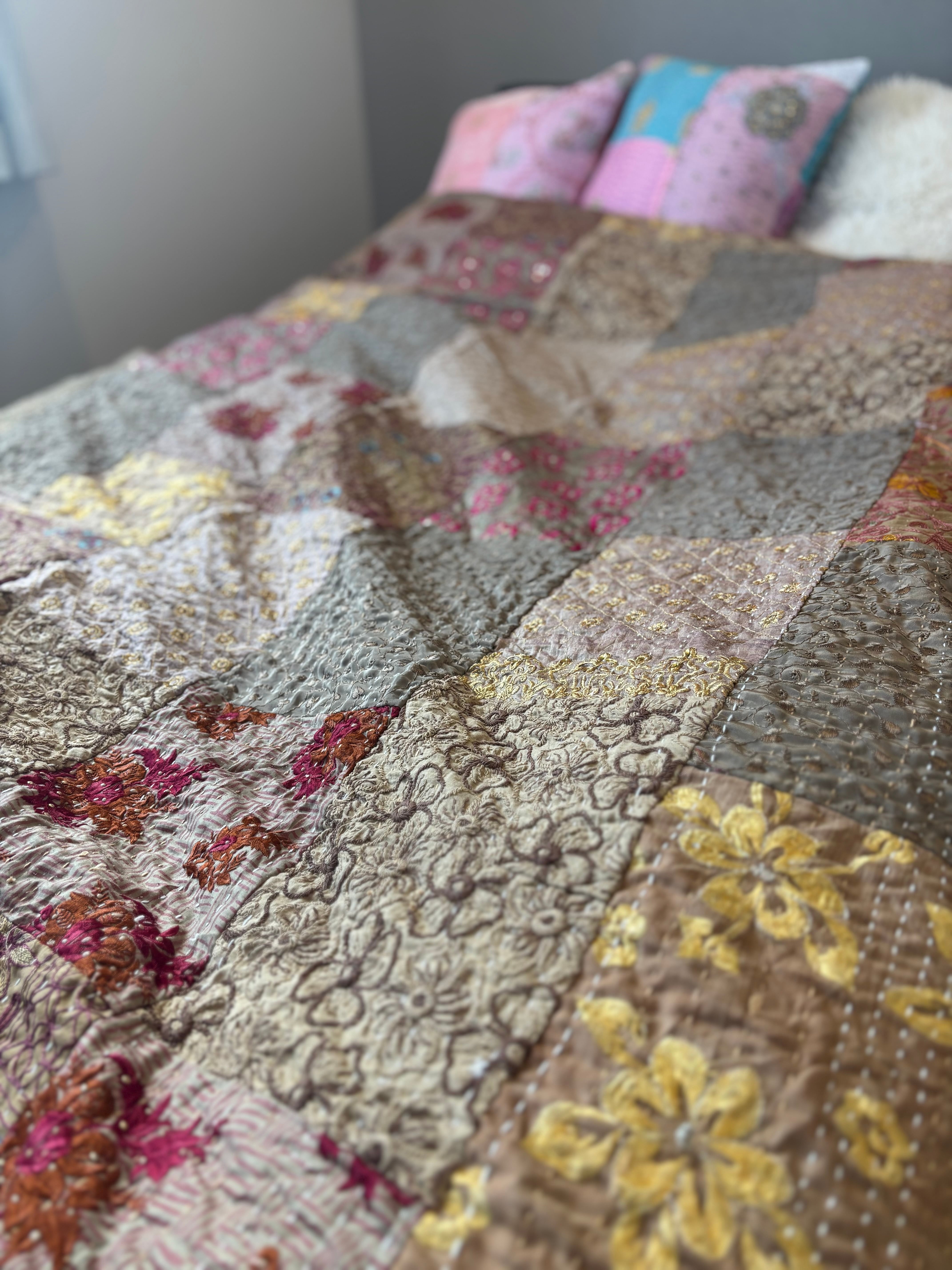 繋ぎ合わせたパッチワークキルトはとても華やか。
