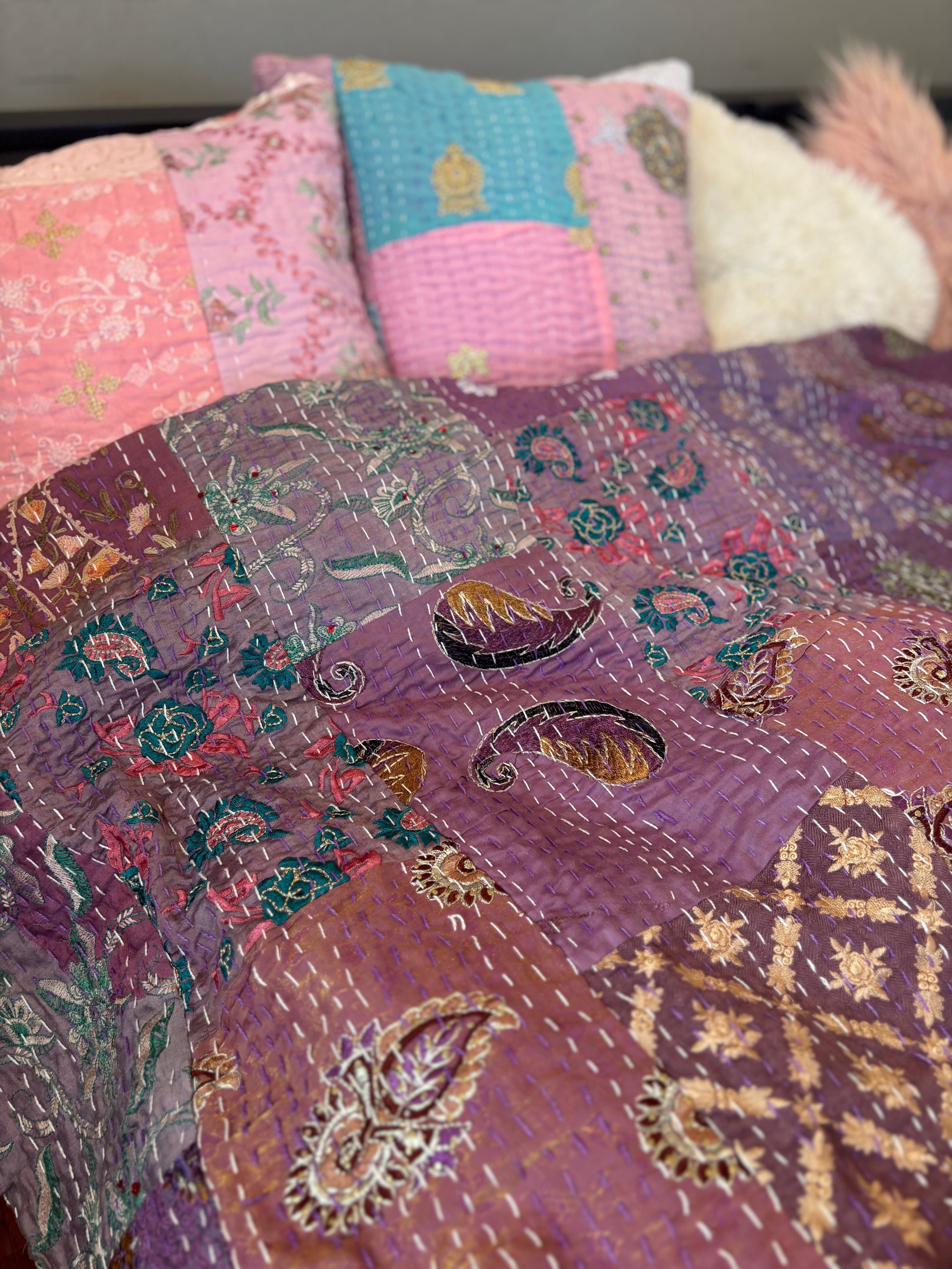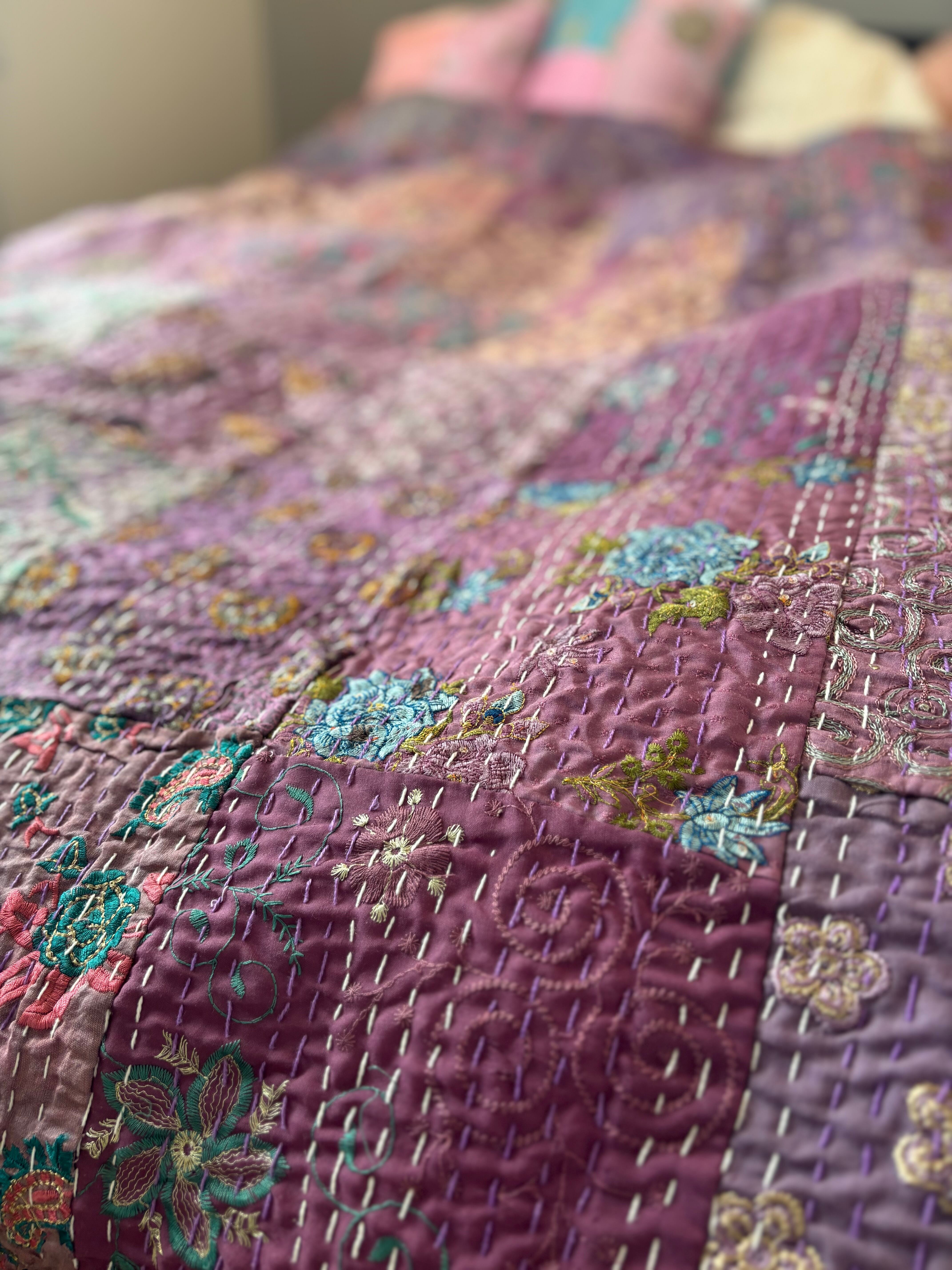 繋ぎ合わせたパッチワークキルトはとても華やか。