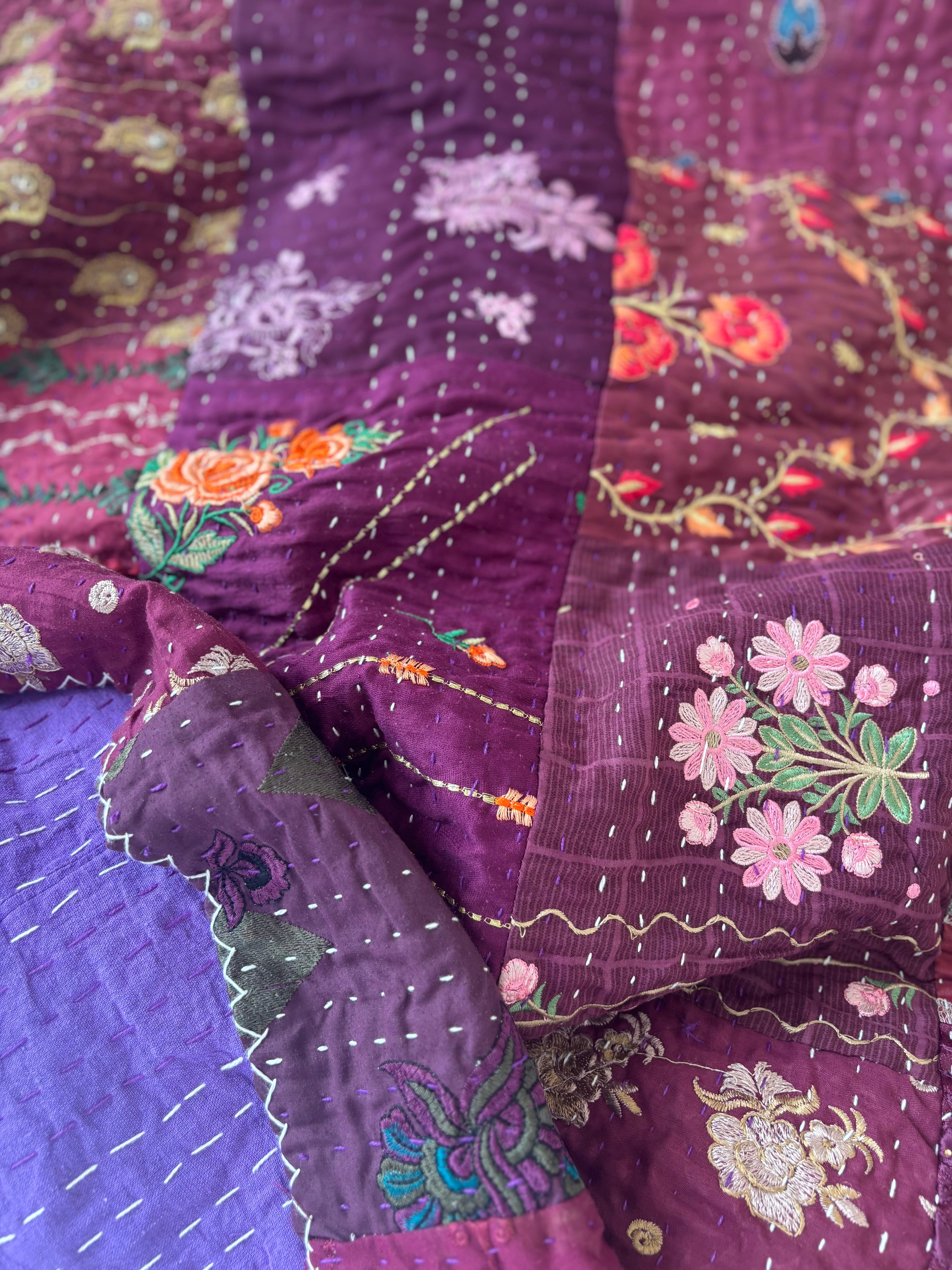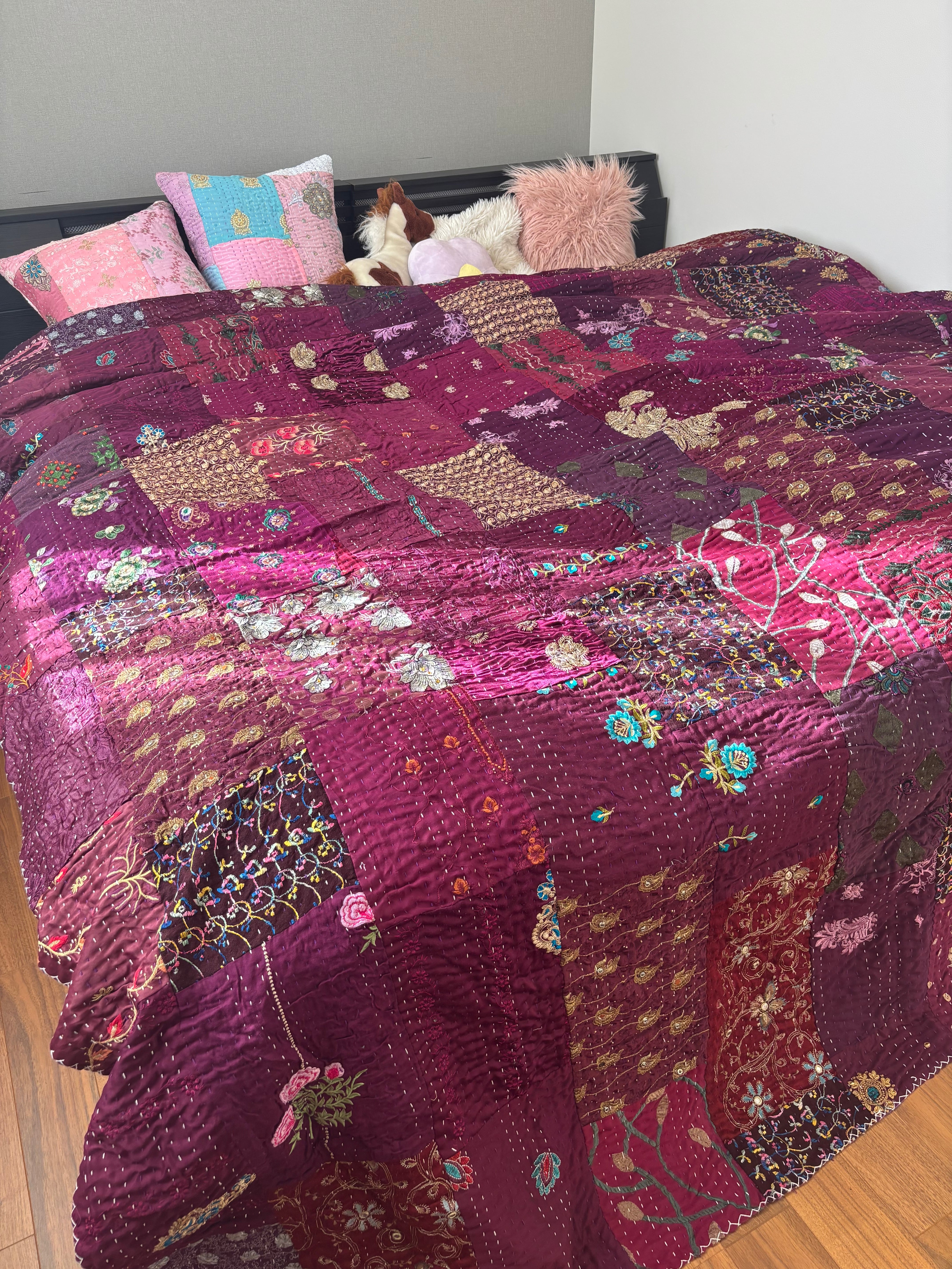 繋ぎ合わせたパッチワークキルトはとても華やか。