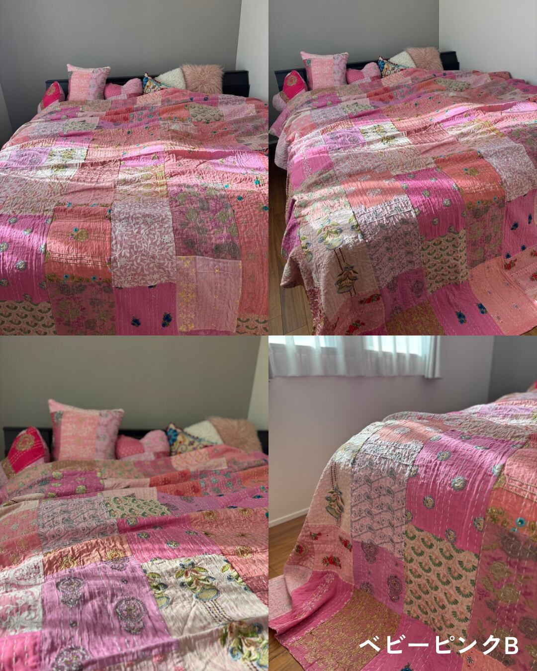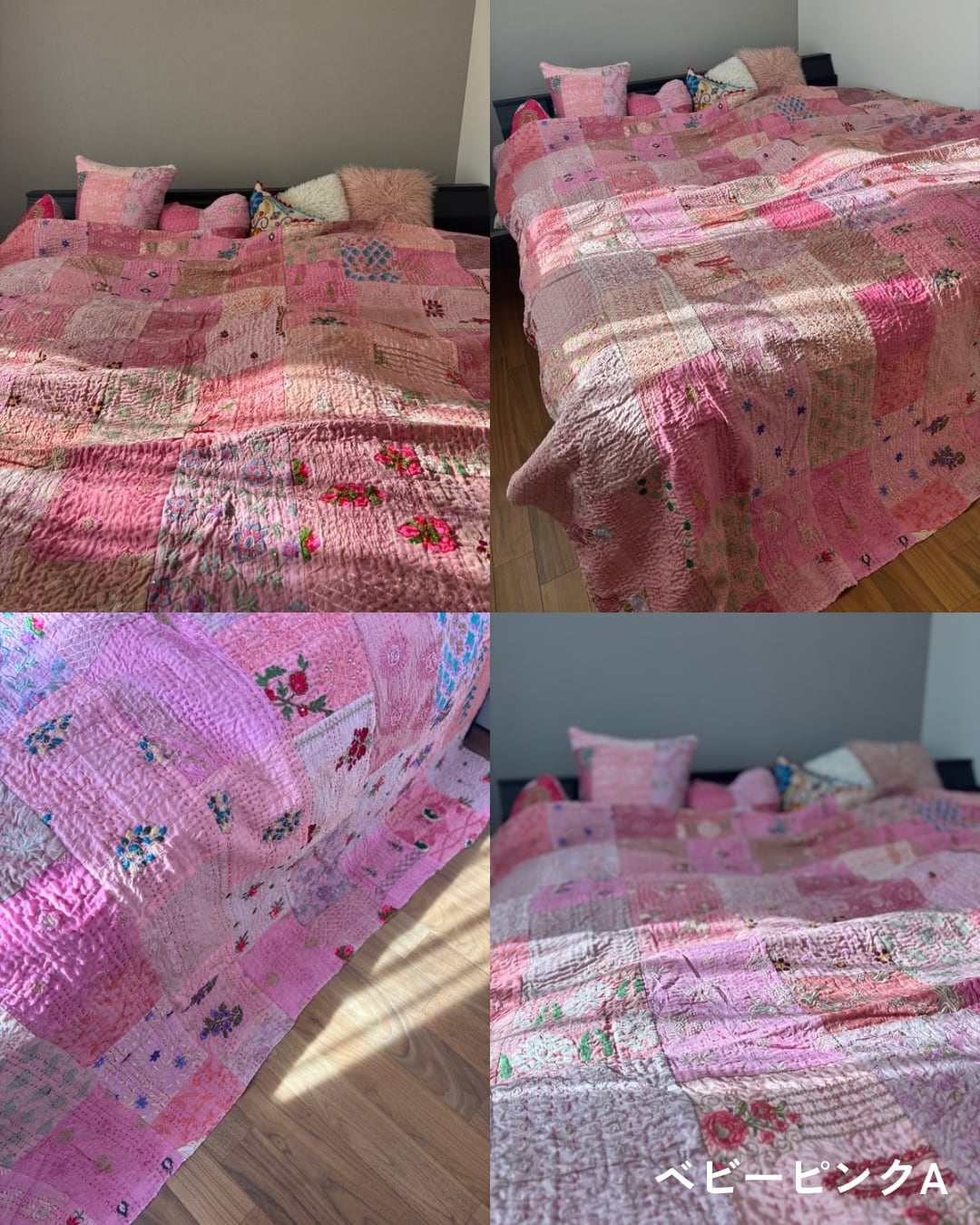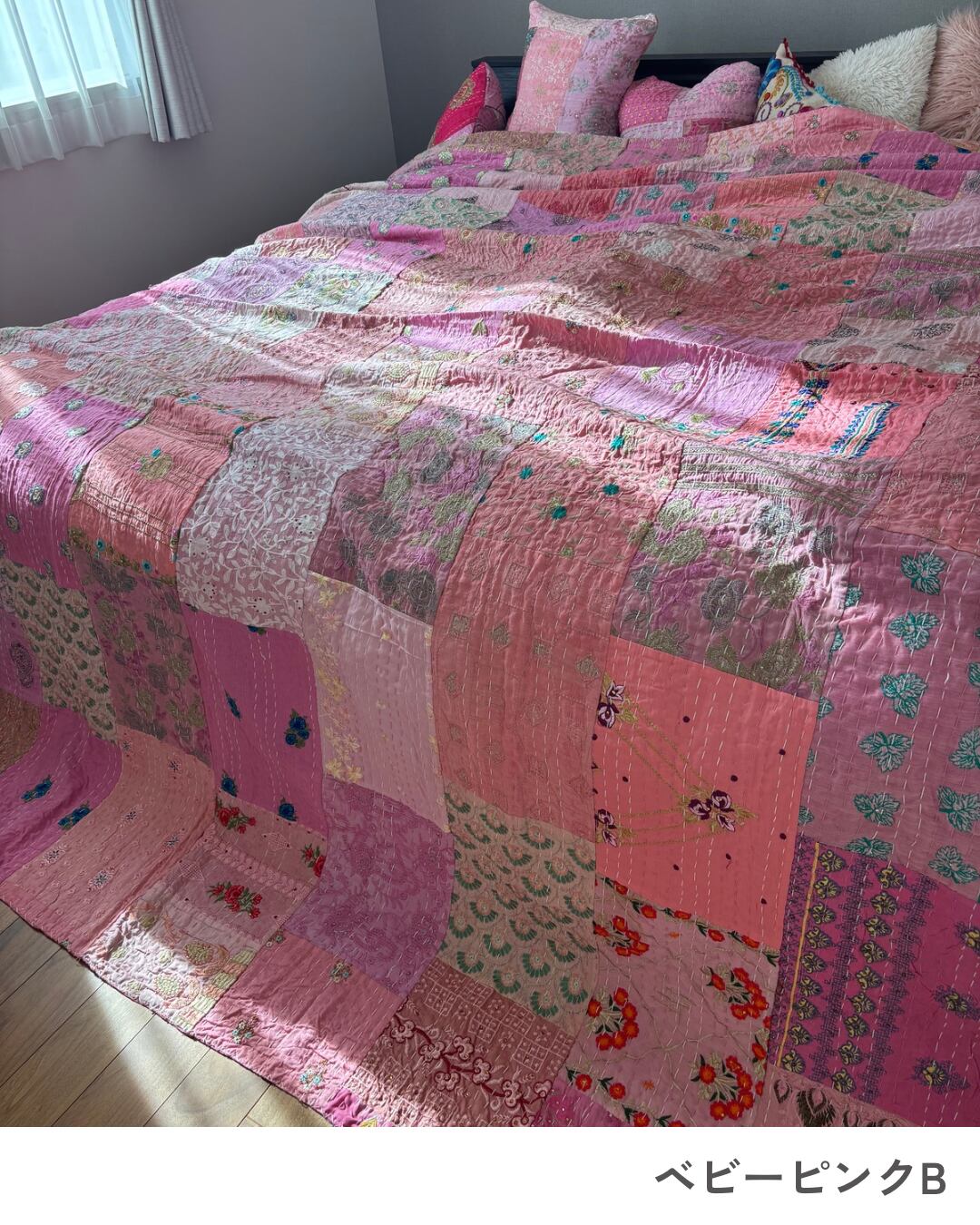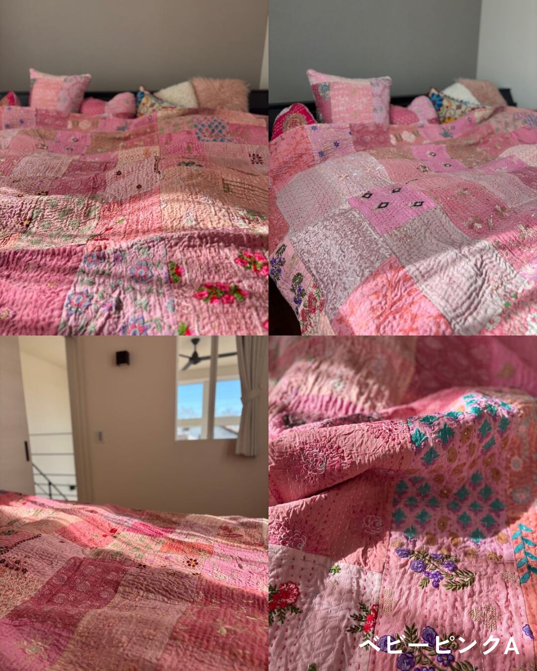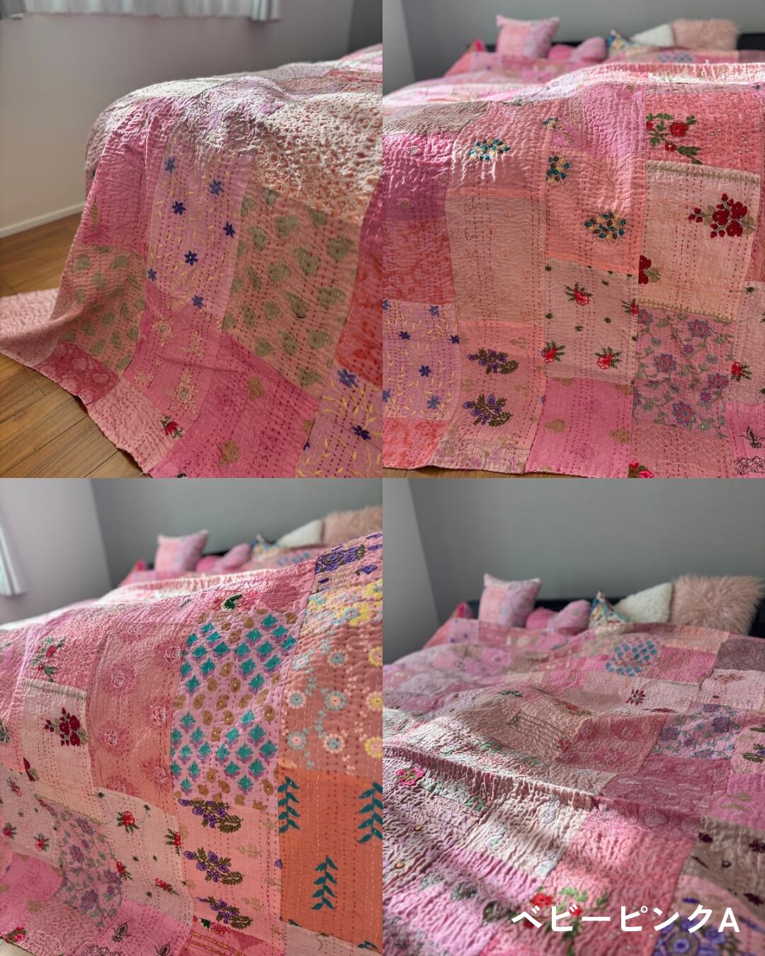 【L】ベビーピンク カンバディアキルト(ダブルサイズ) インド刺繍パッチワーク