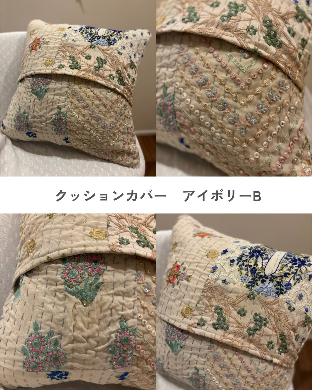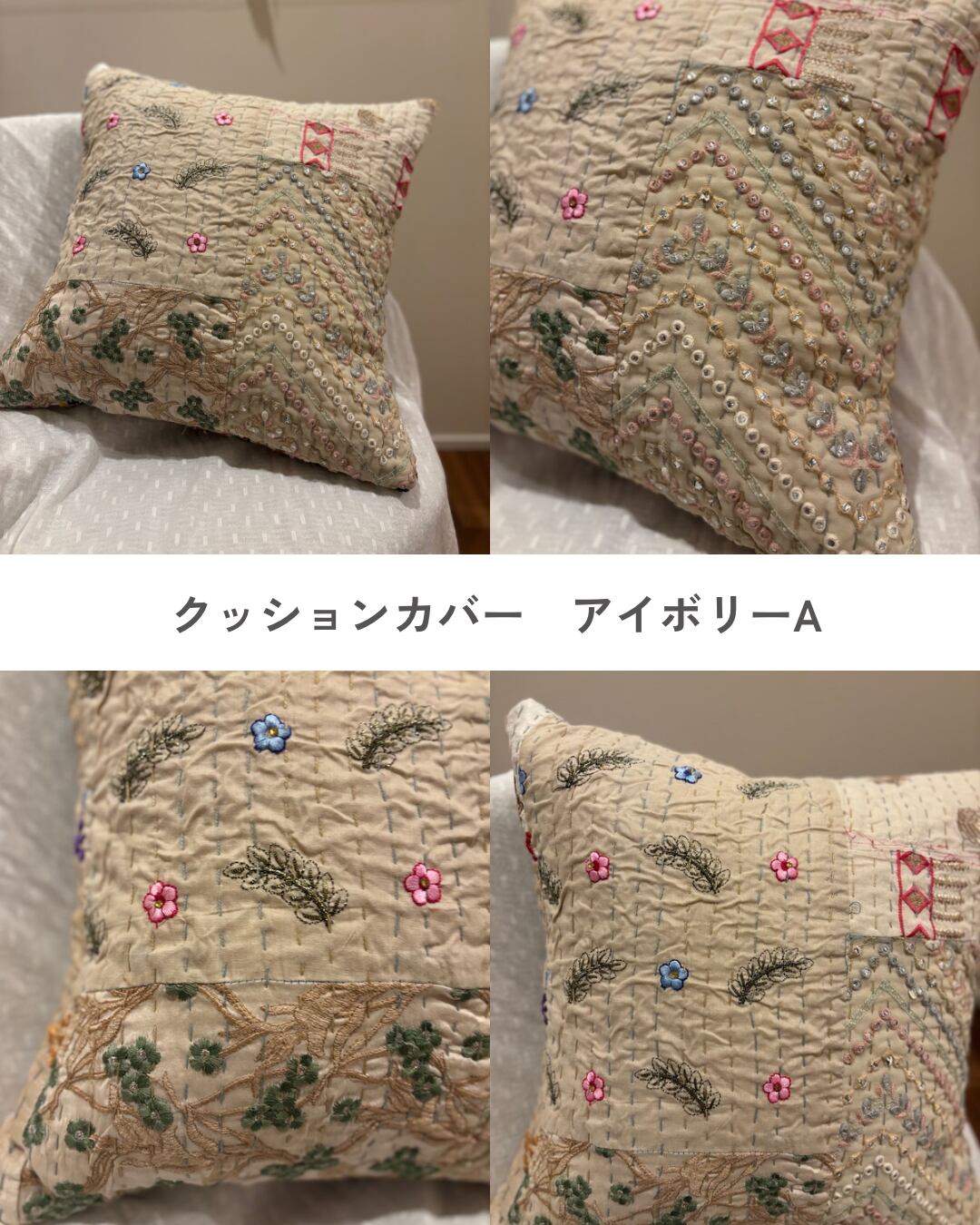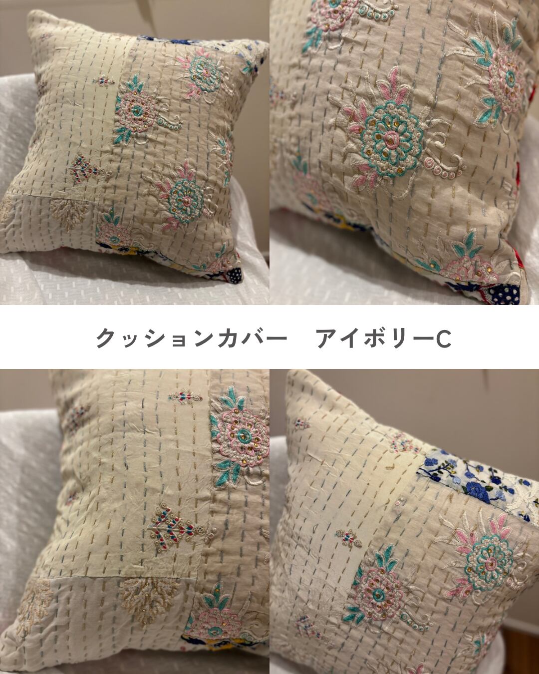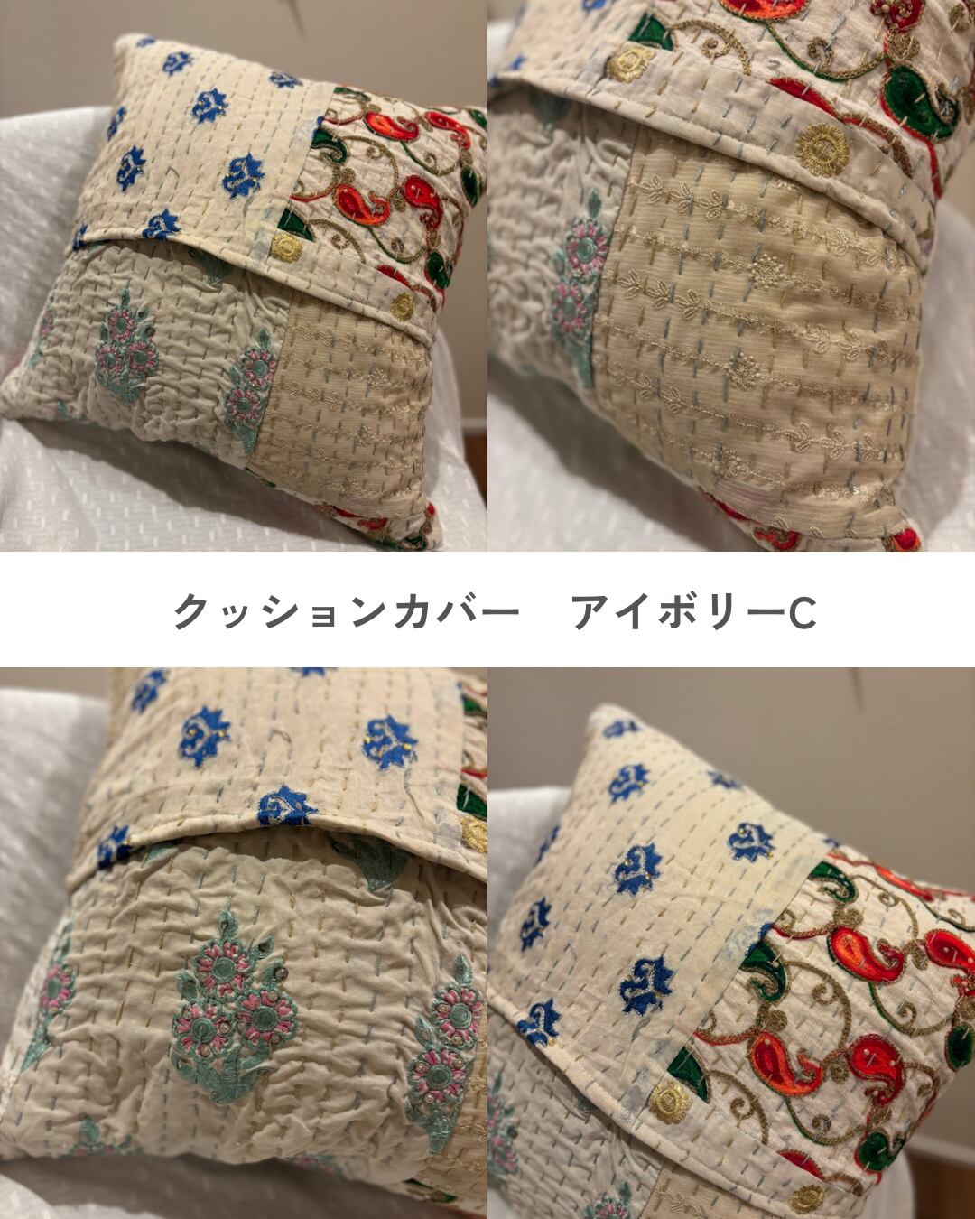 【クッションカバー】アイボリー カンバディアキルト インド刺繍パッチワーク