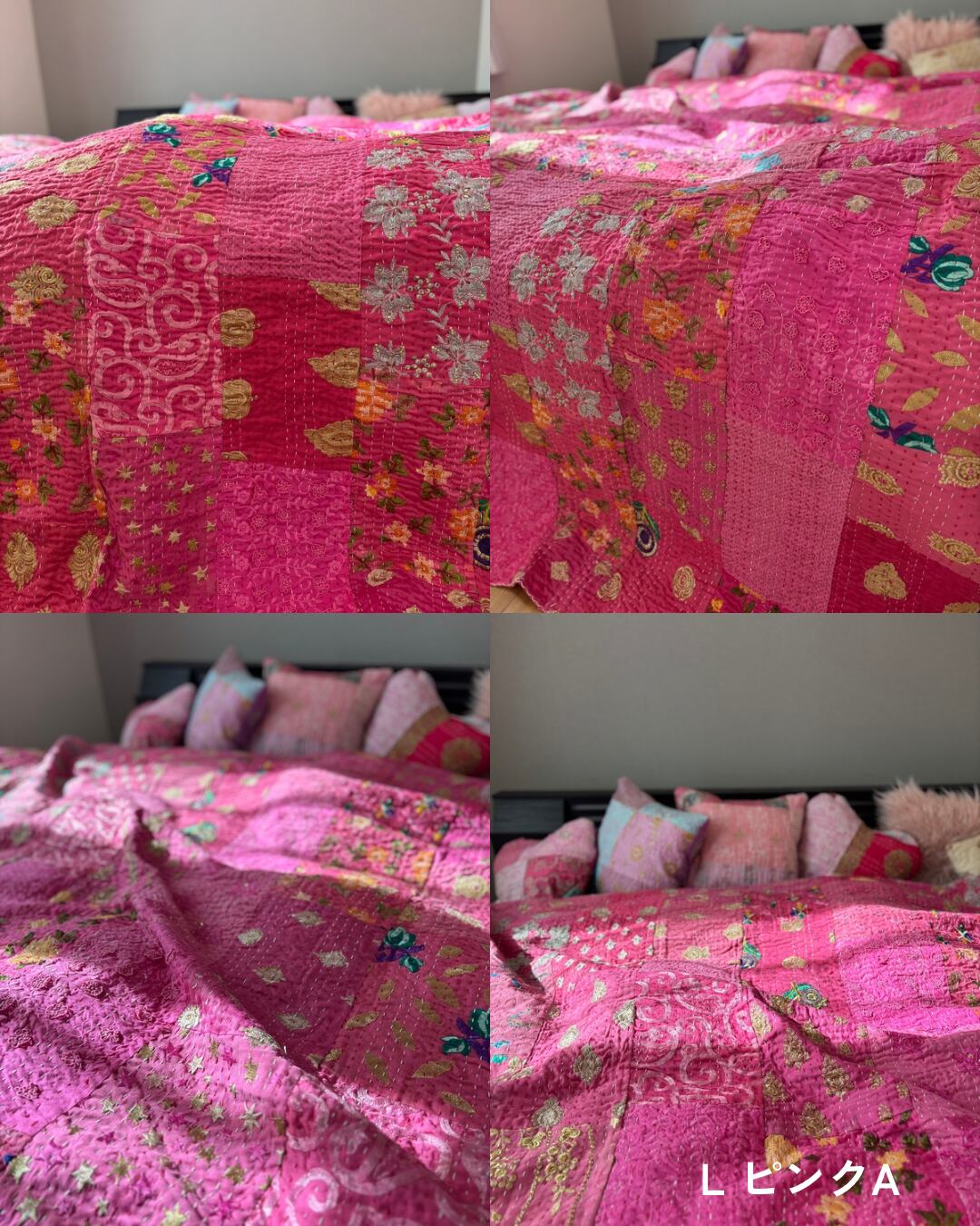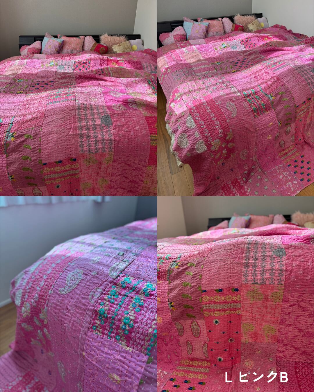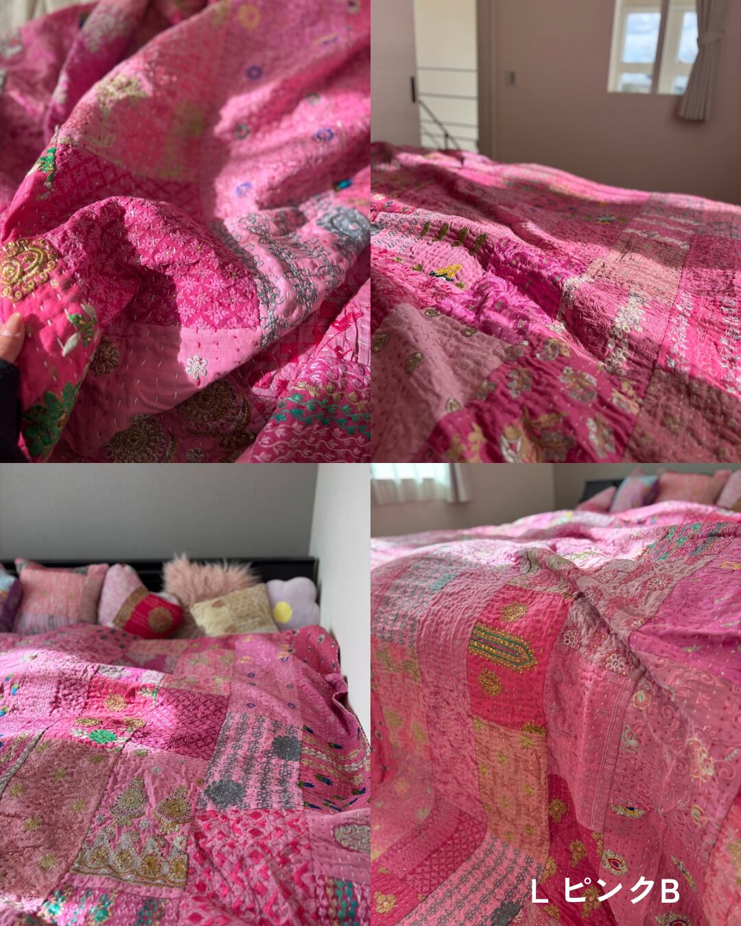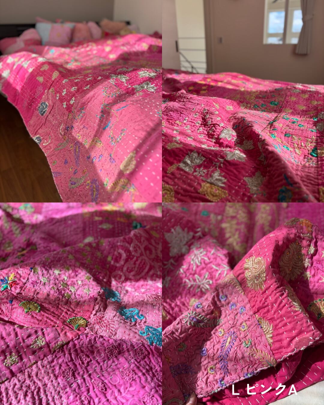 【L】ピンク カンバディアキルト(ダブルサイズ) インド刺繍パッチワーク