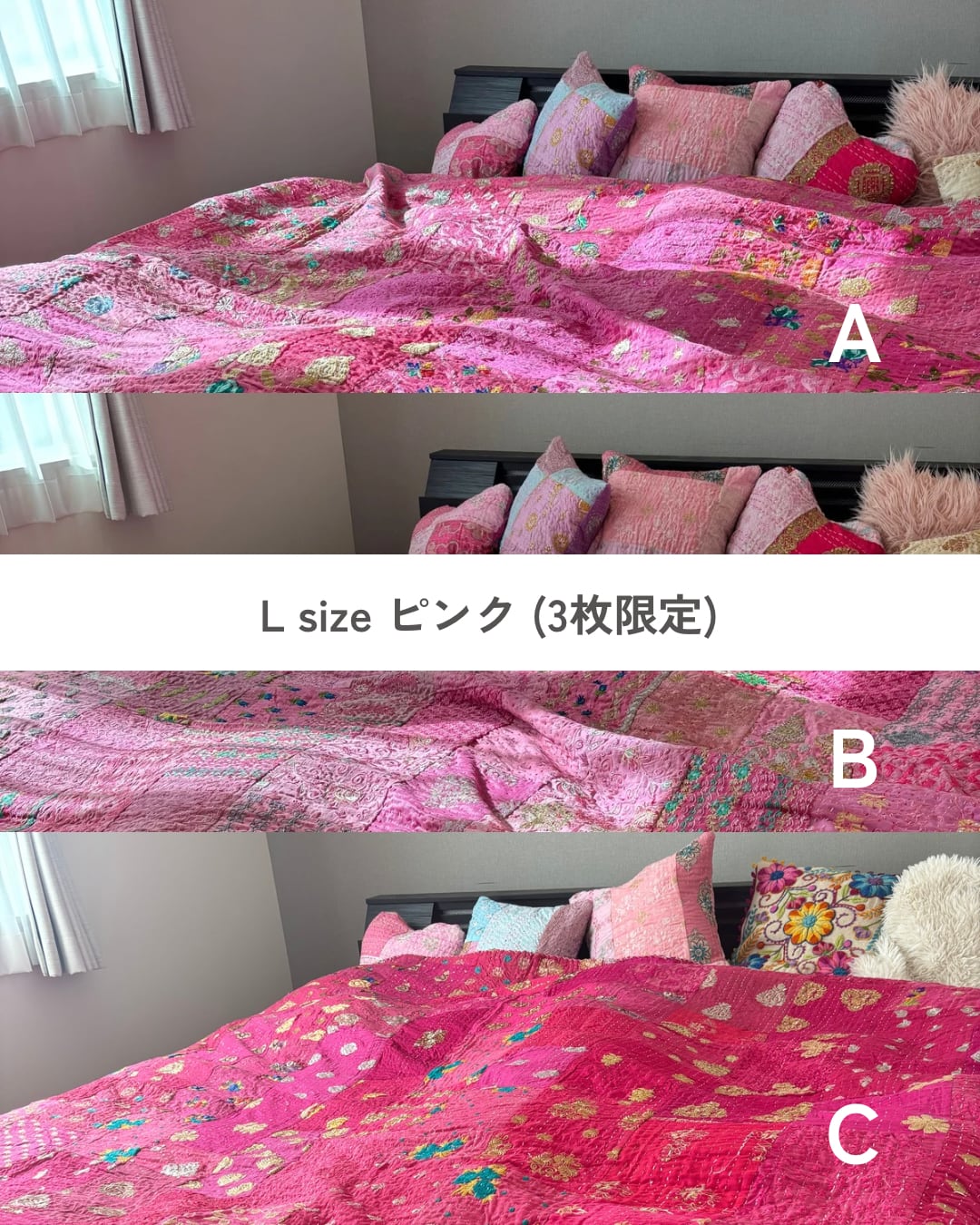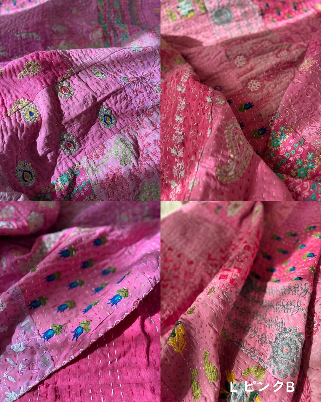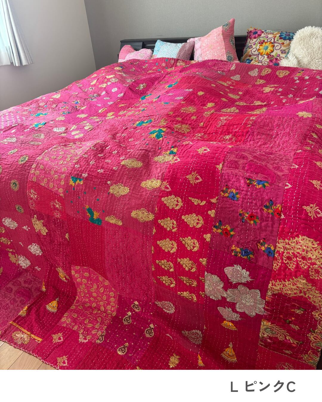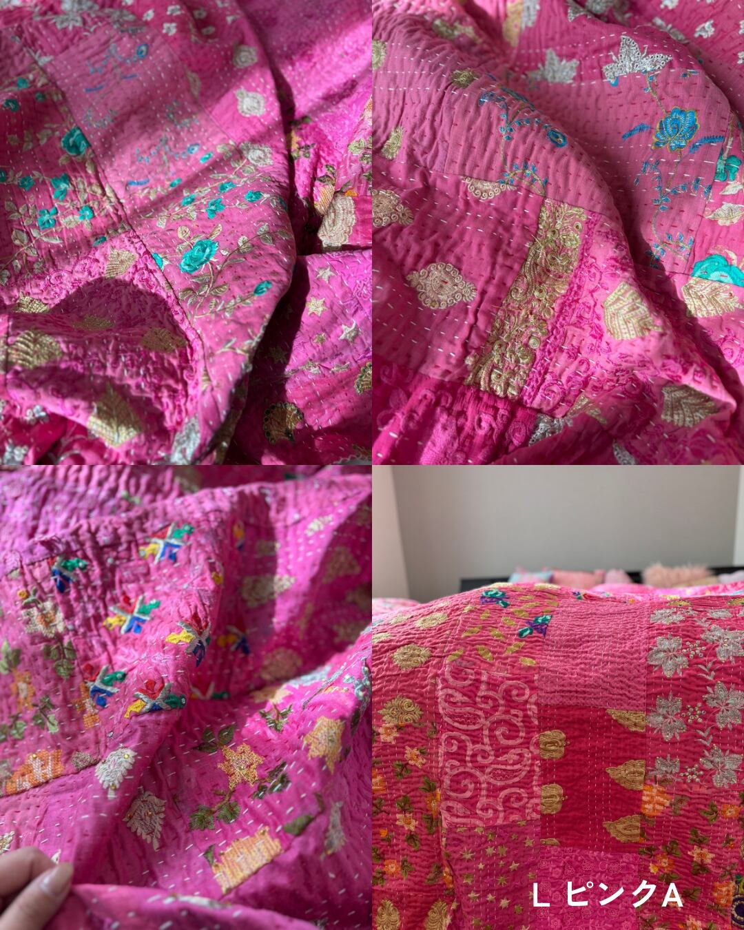 【L】ピンク カンバディアキルト(ダブルサイズ) インド刺繍パッチワーク