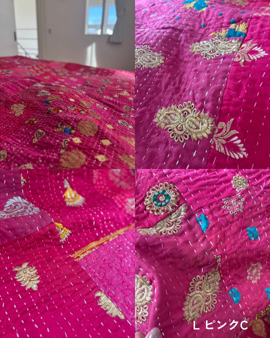 C:濃いピンクにゴールドの刺繍が映えるゴージャスなキルト。