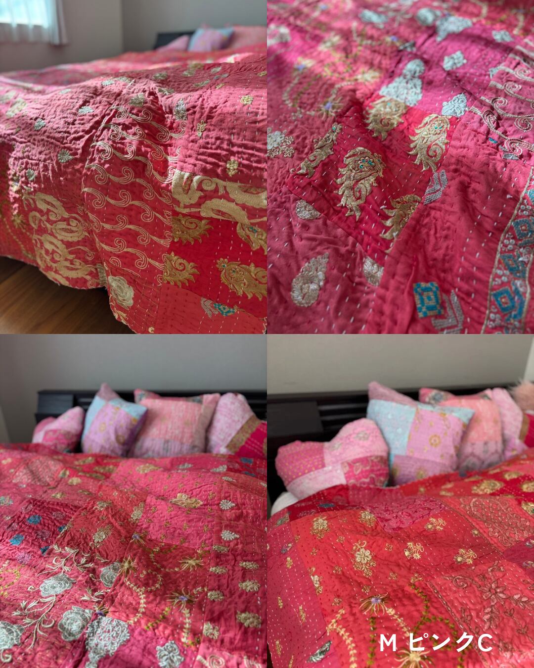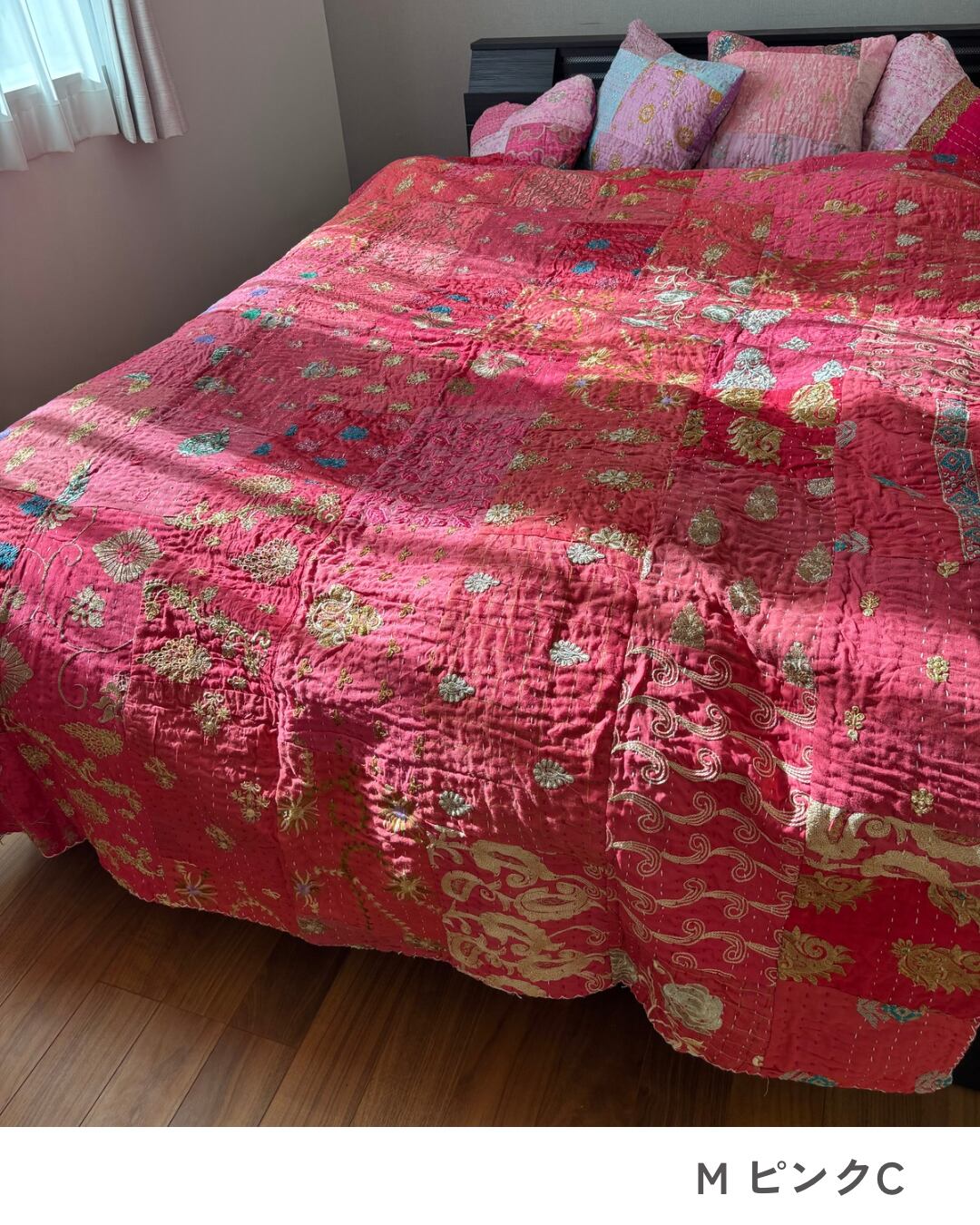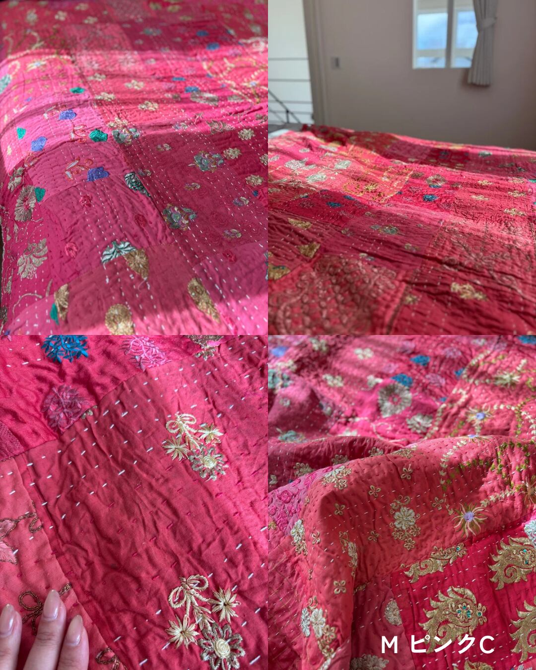 【M】ピンク カンバディアキルト(シングルサイズ) インド刺繍パッチワーク