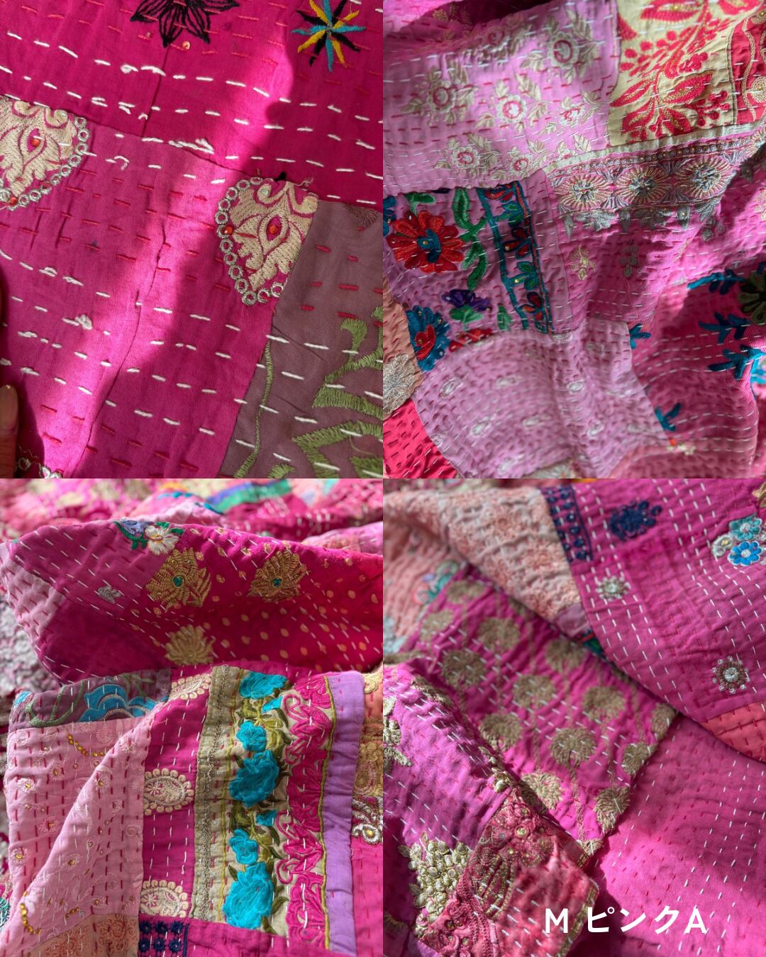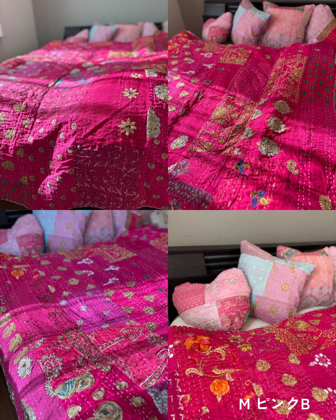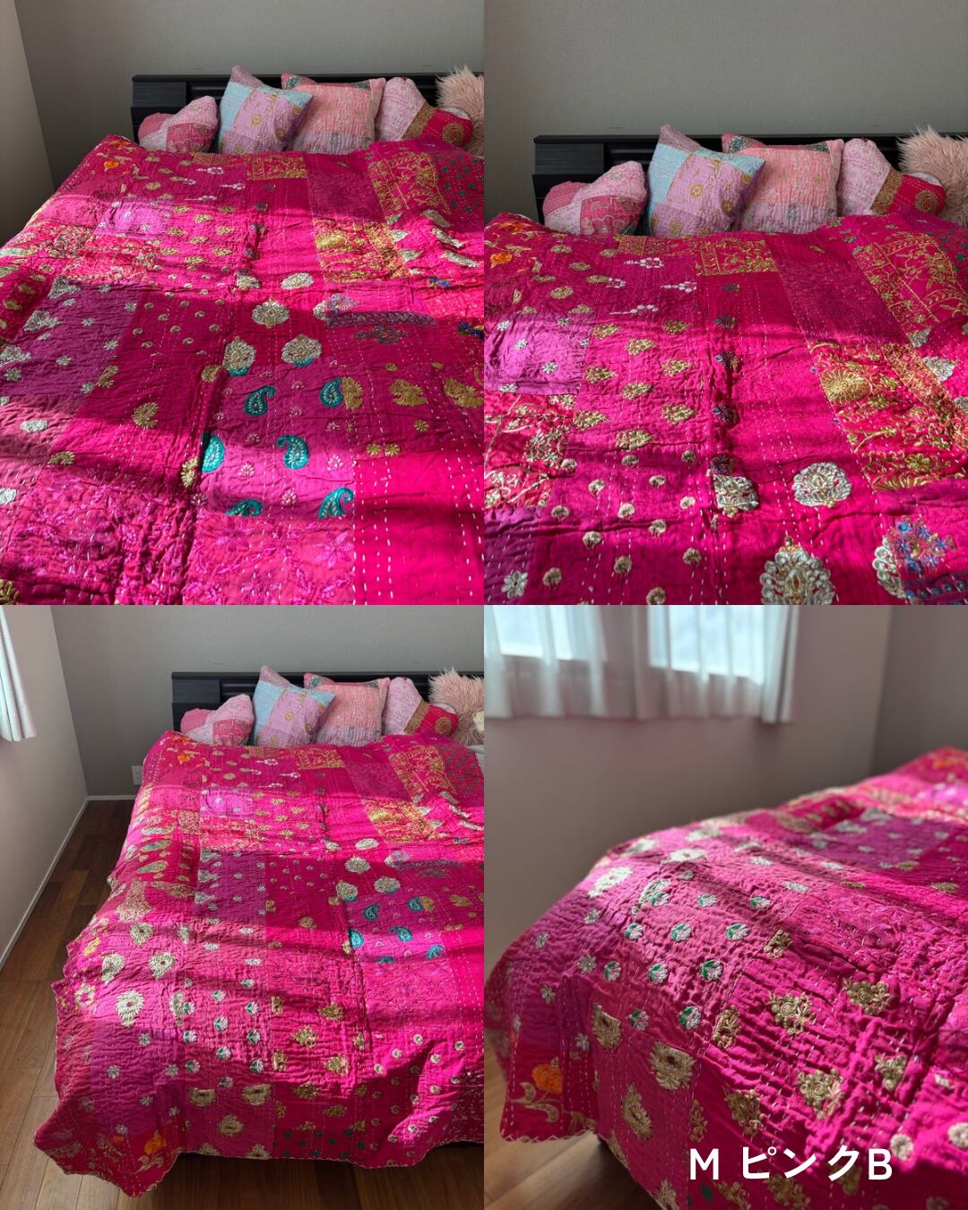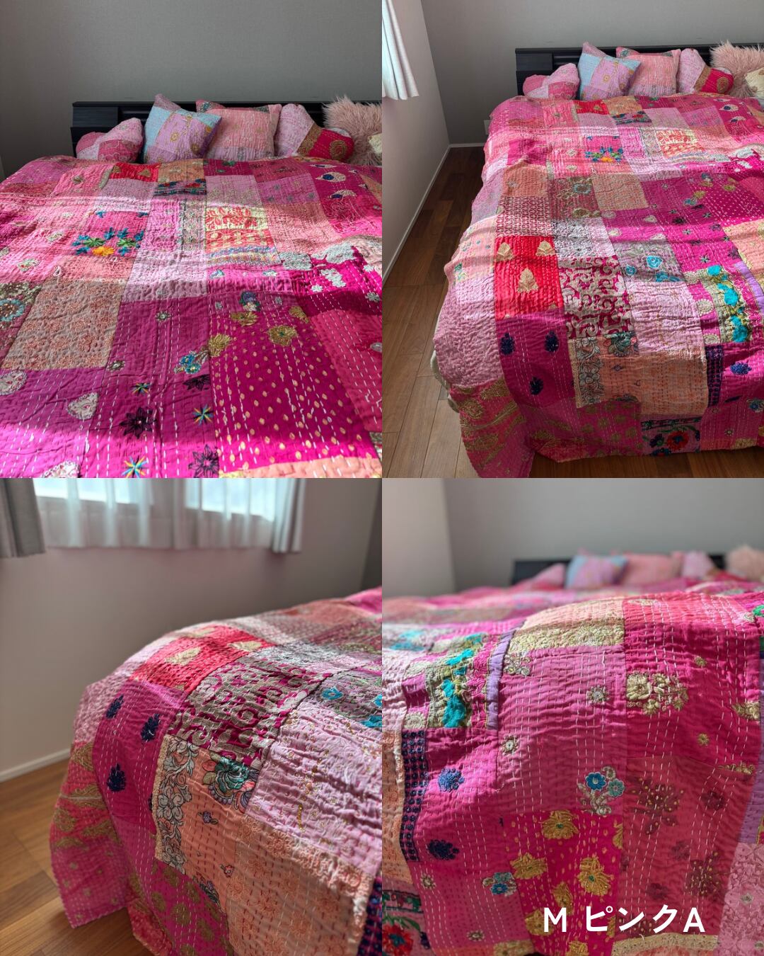 【M】ピンク カンバディアキルト(シングルサイズ) インド刺繍パッチワーク