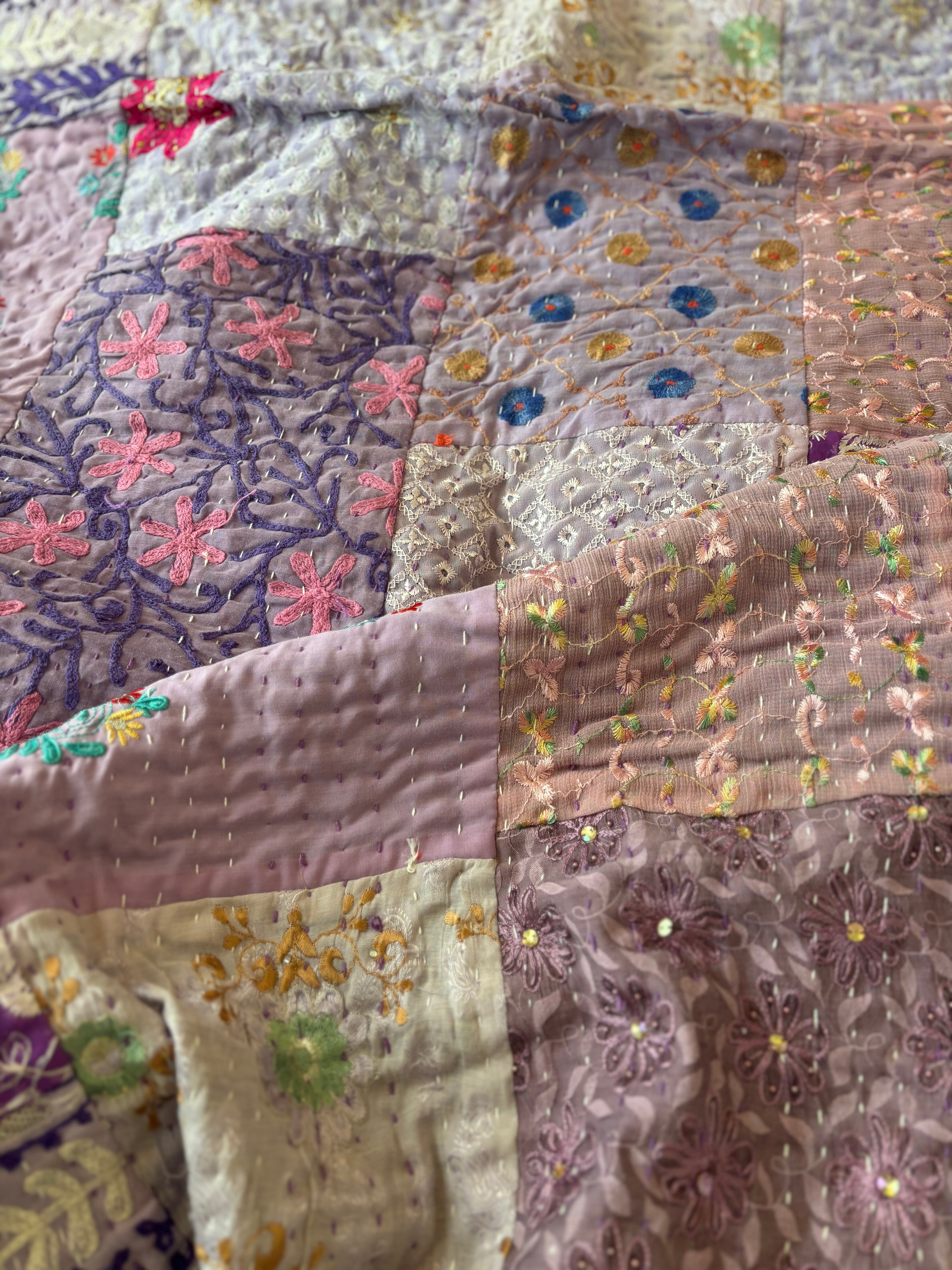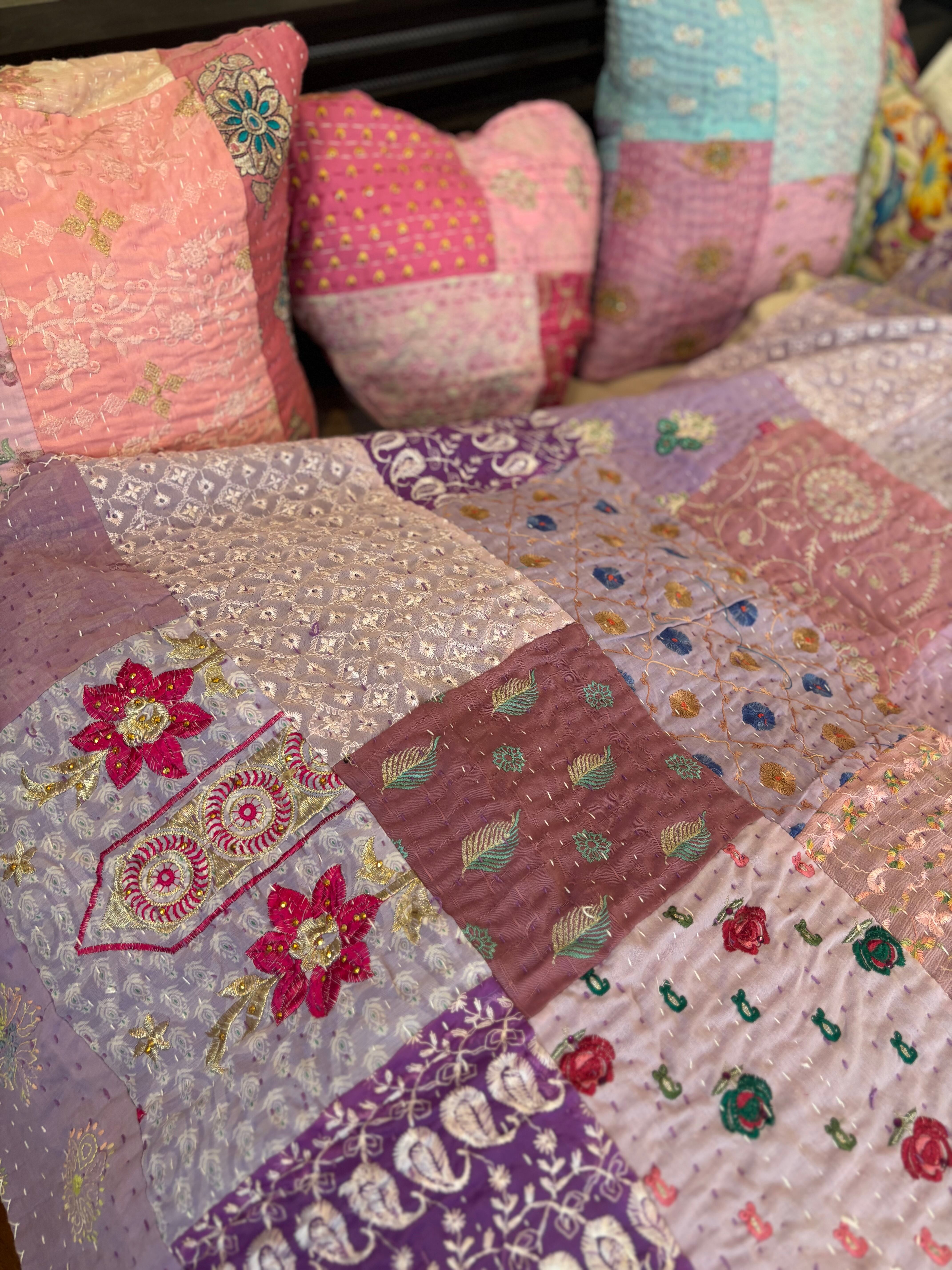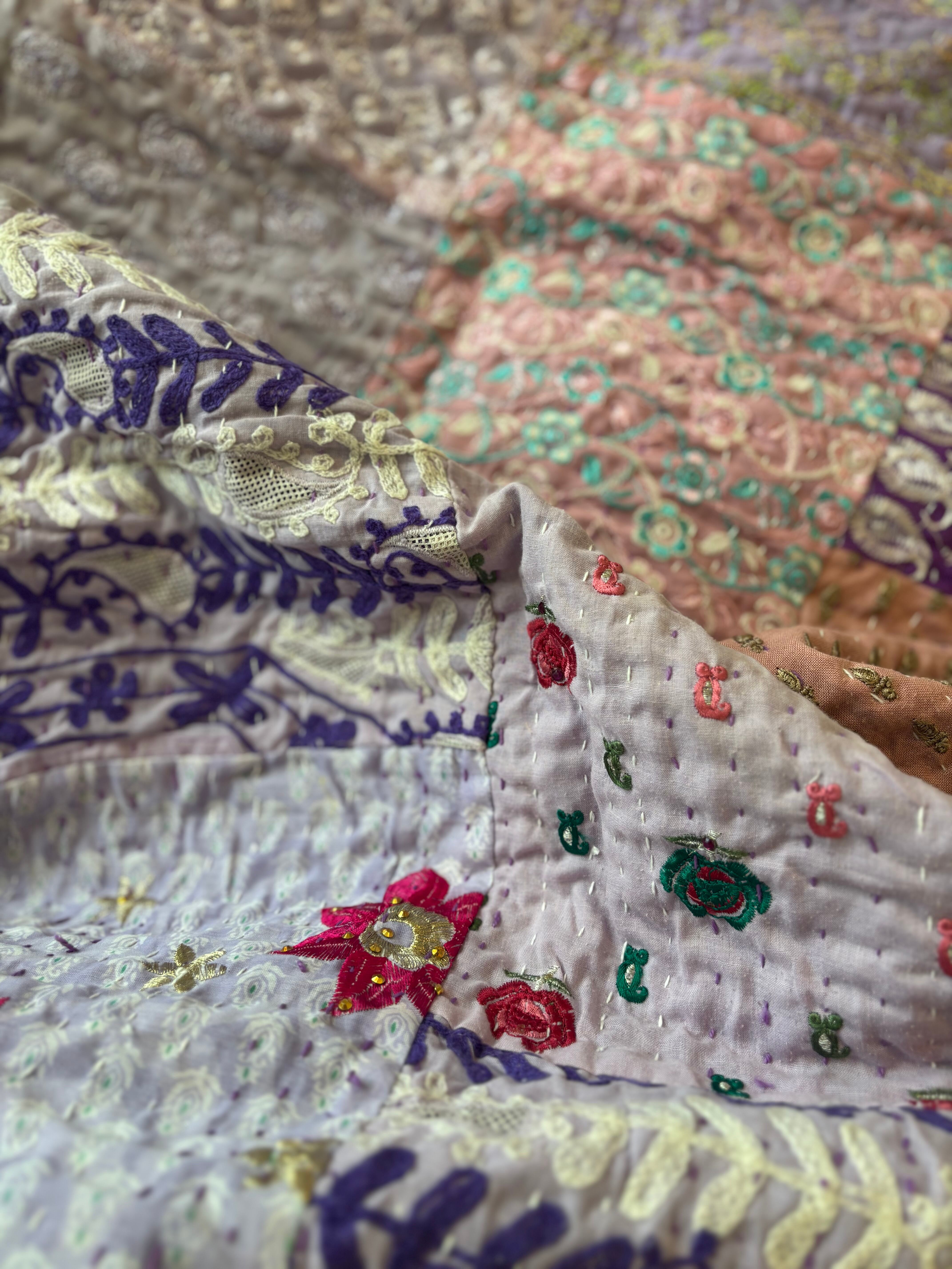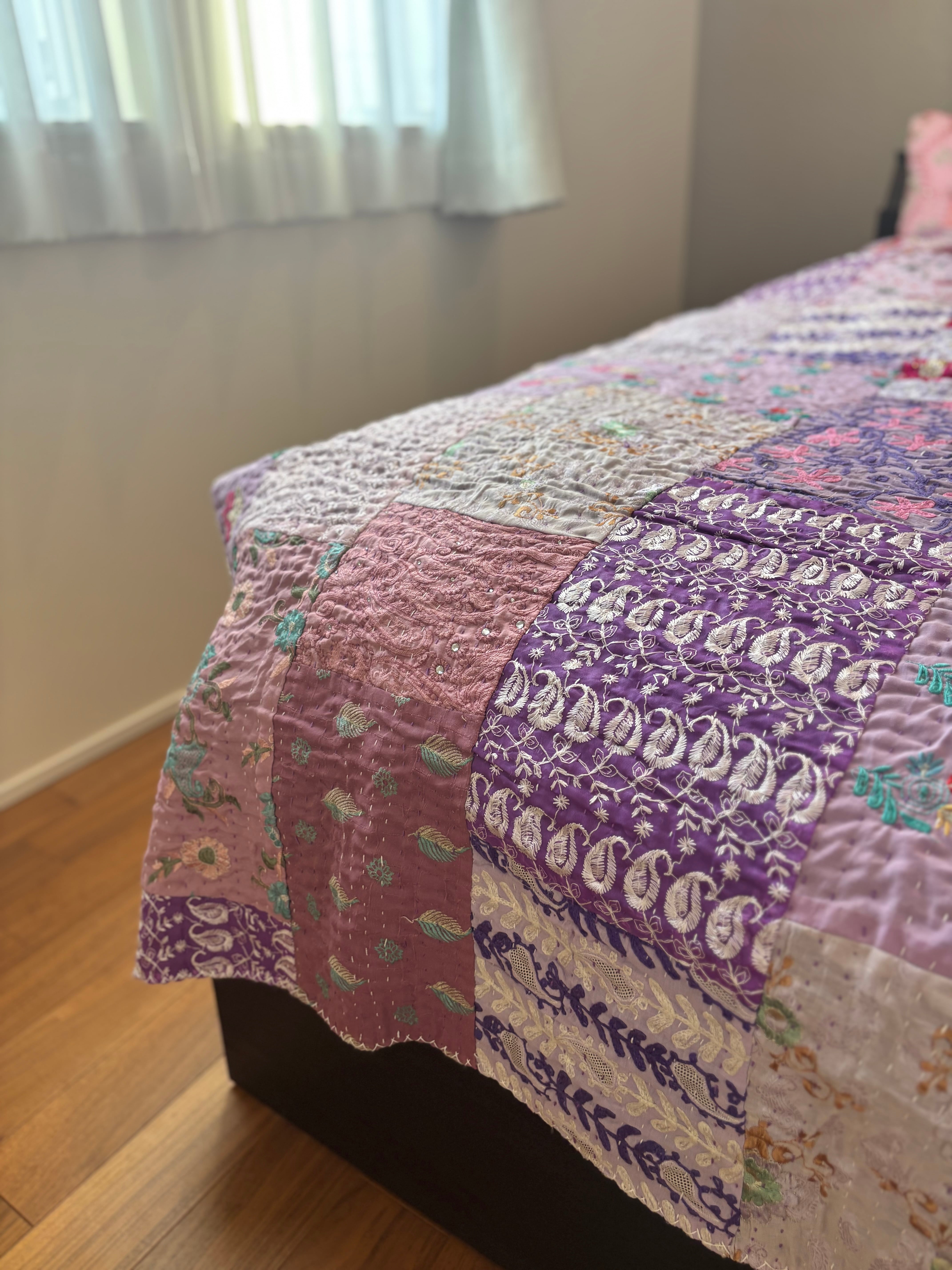 【M】 ラベンダー カンバディアキルト(ダブルサイズ) インド刺繍パッチワーク