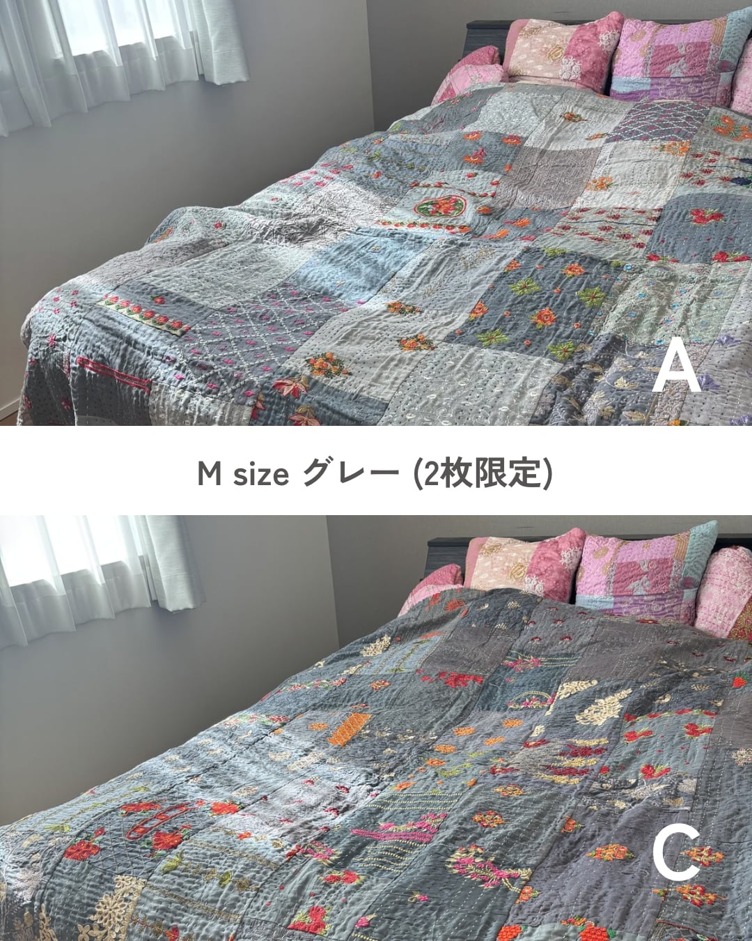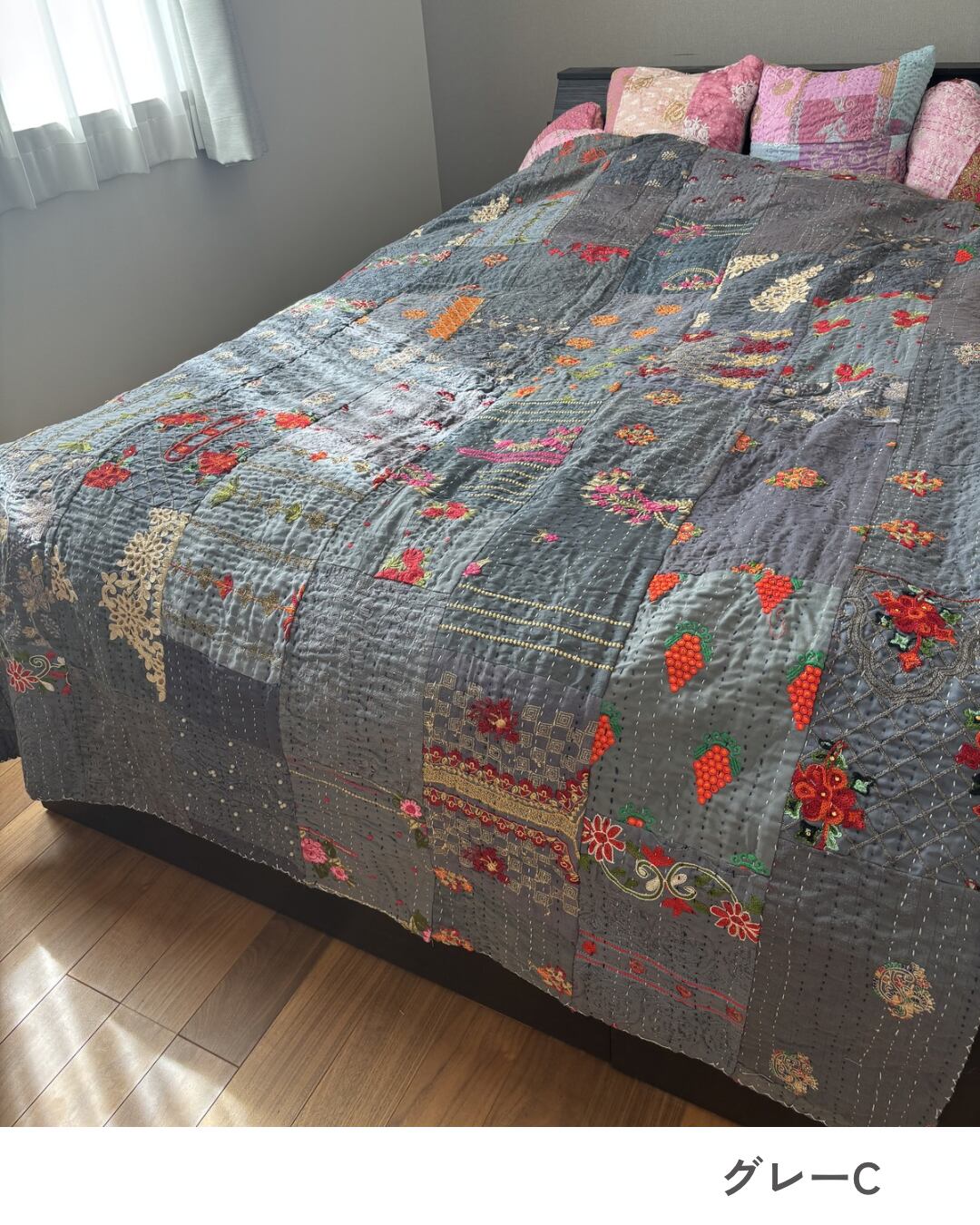 B:落ち着いたグレーにパッと目を引くゴールドやピンクのお花がゴージャスなキルト。