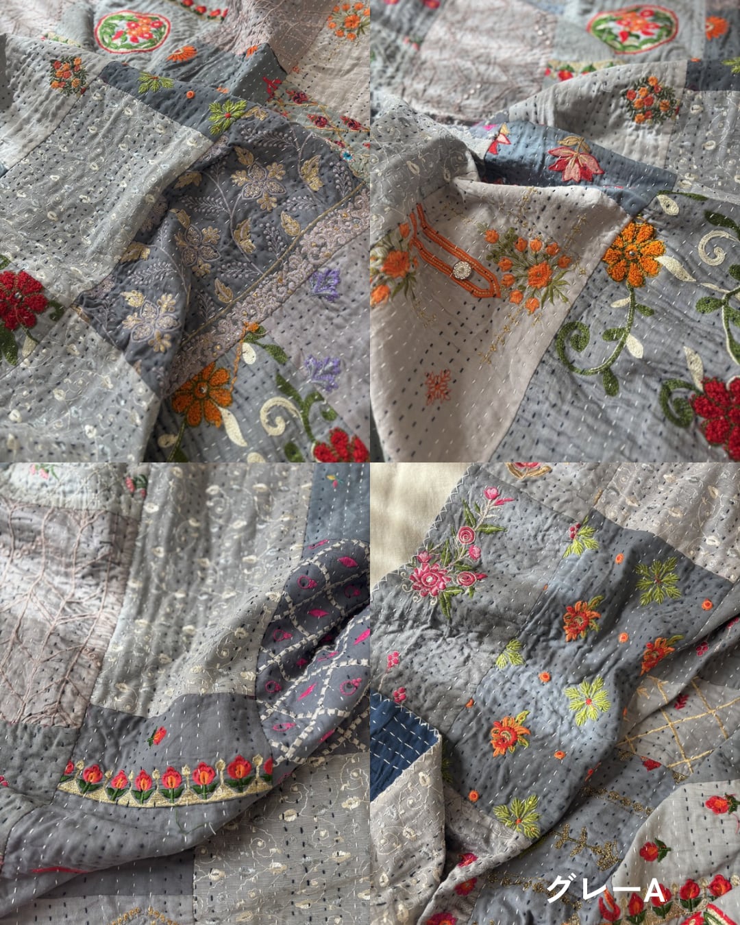 【M】グレー カンバディアキルト(シングルサイズ) インド刺繍パッチワーク