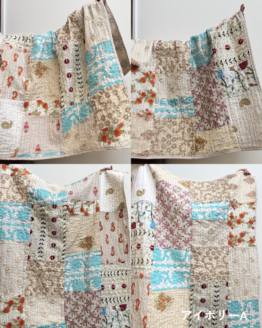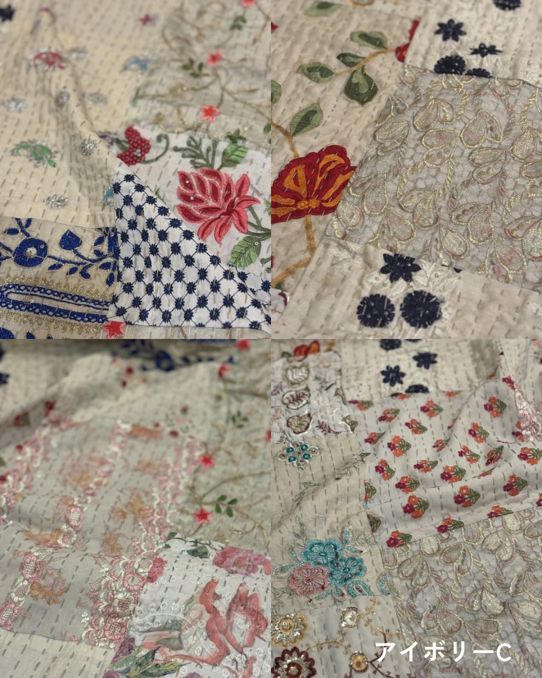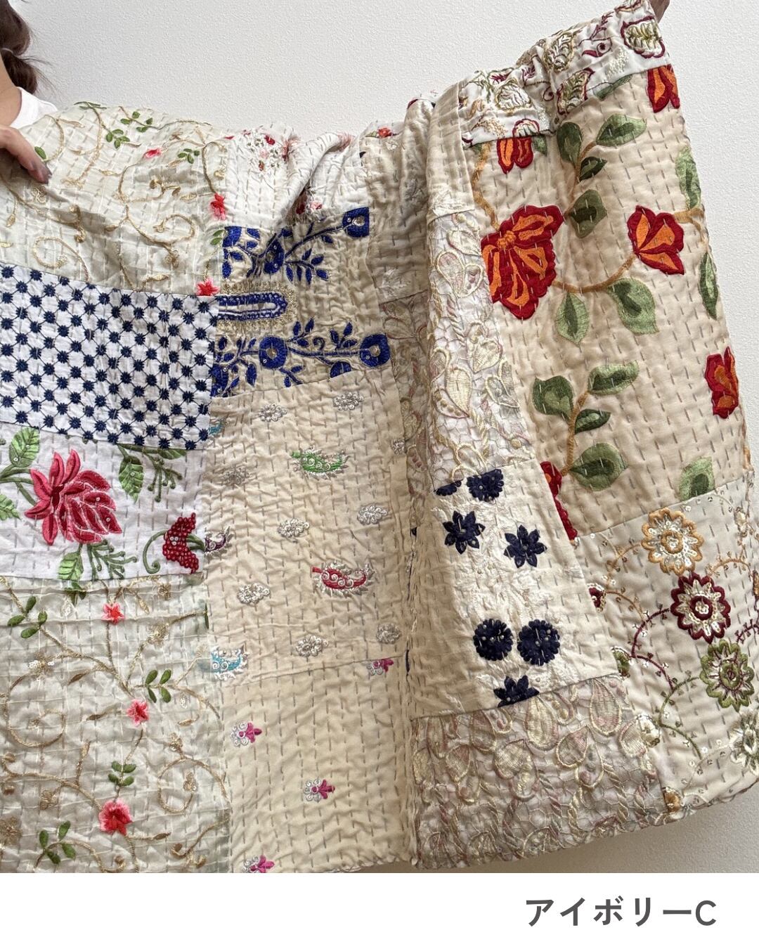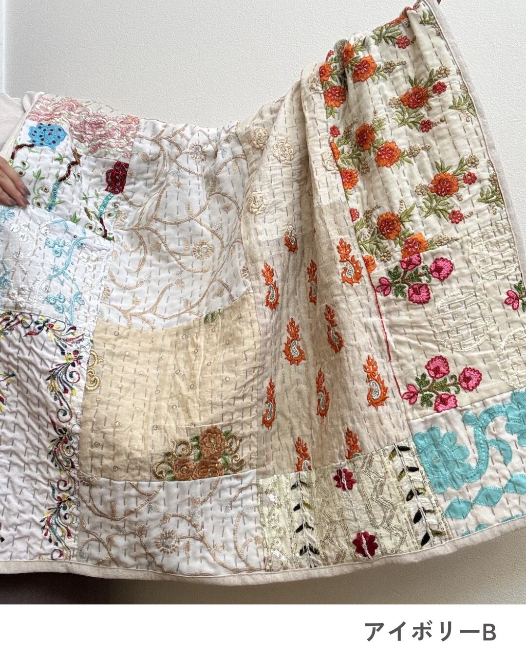 【SS】アイボリー カンバディアキルト(シングルサイズ) インド刺繍パッチワーク