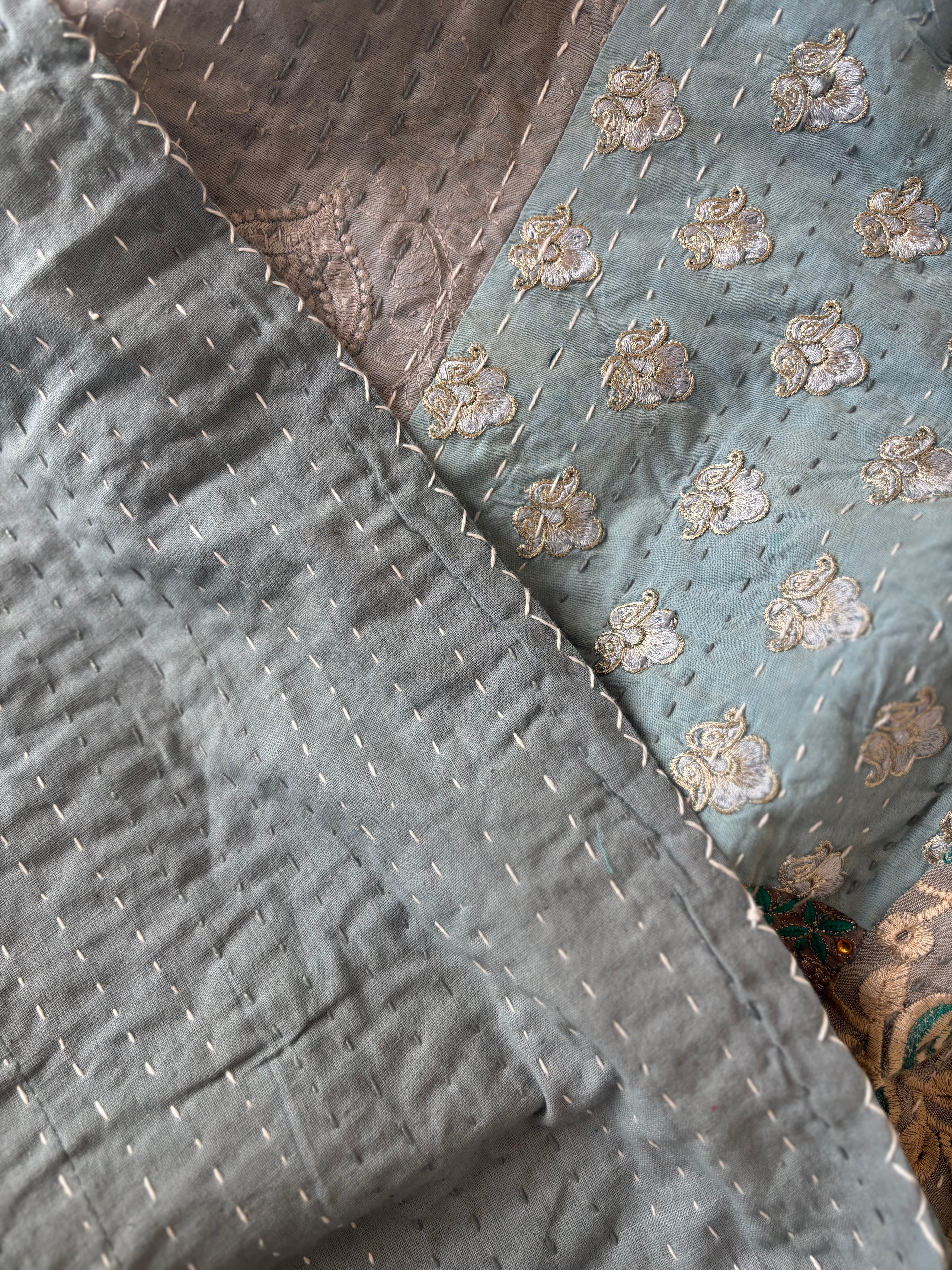 繋ぎ合わせたパッチワークキルトはとても華やか。