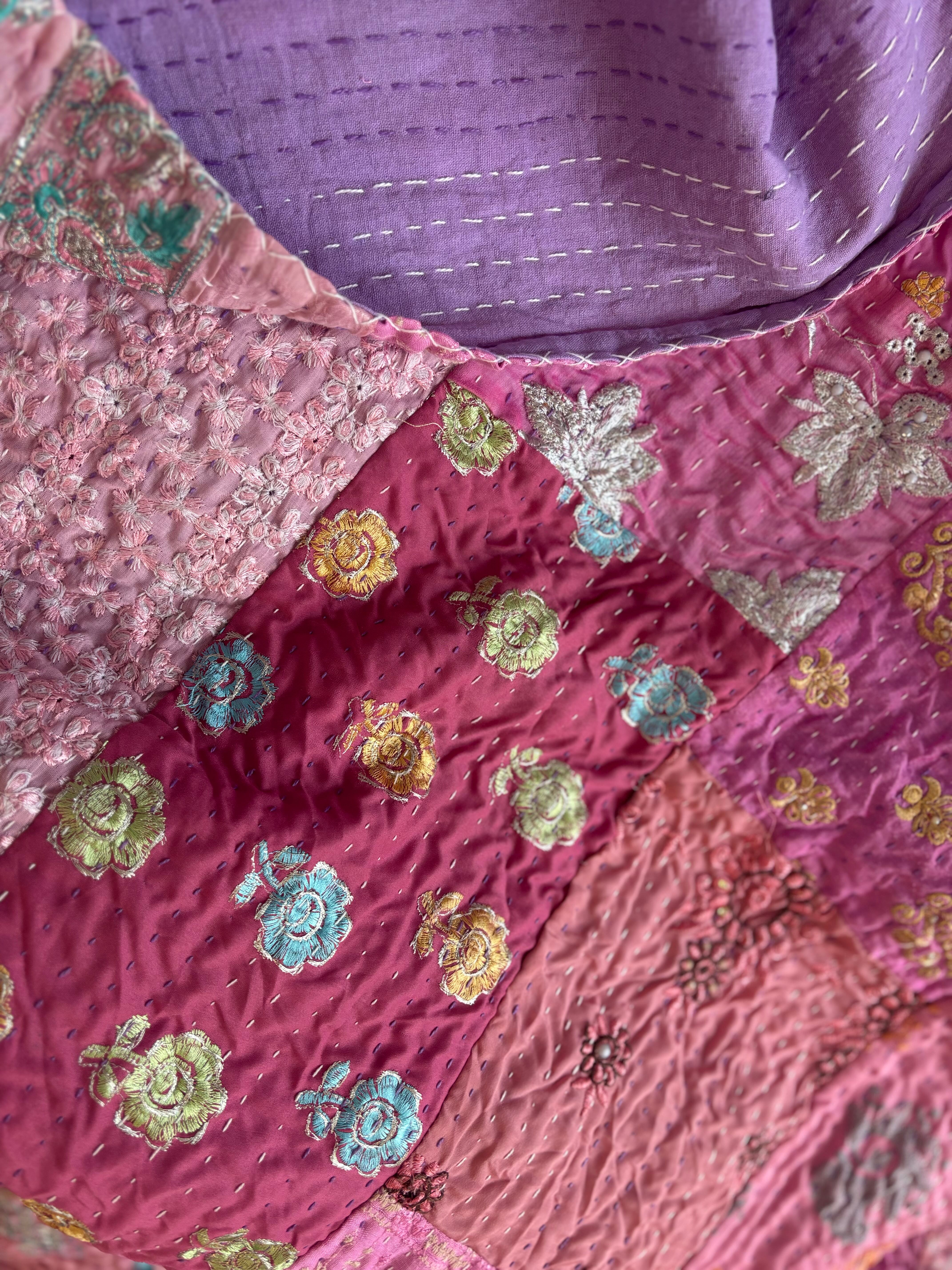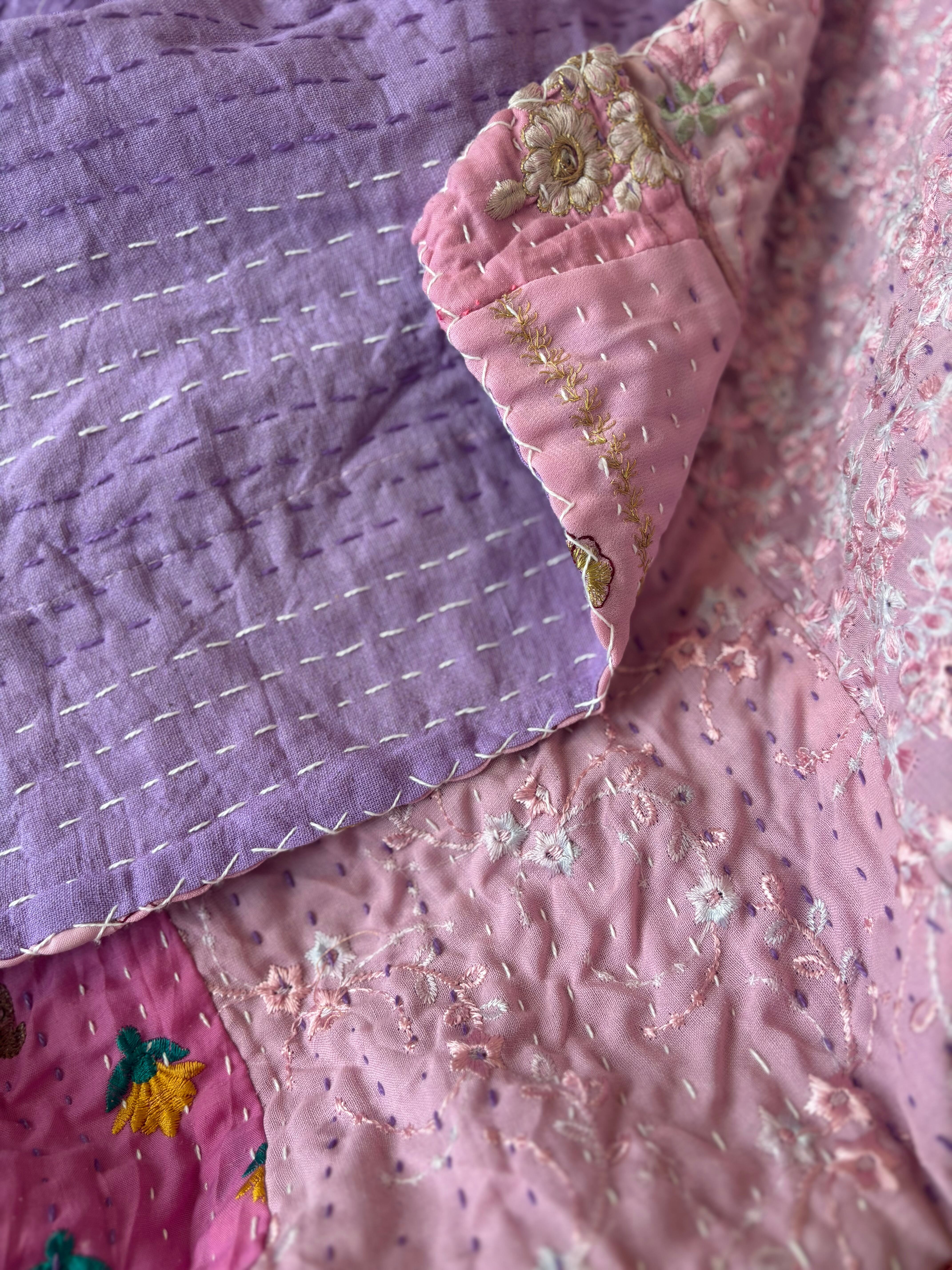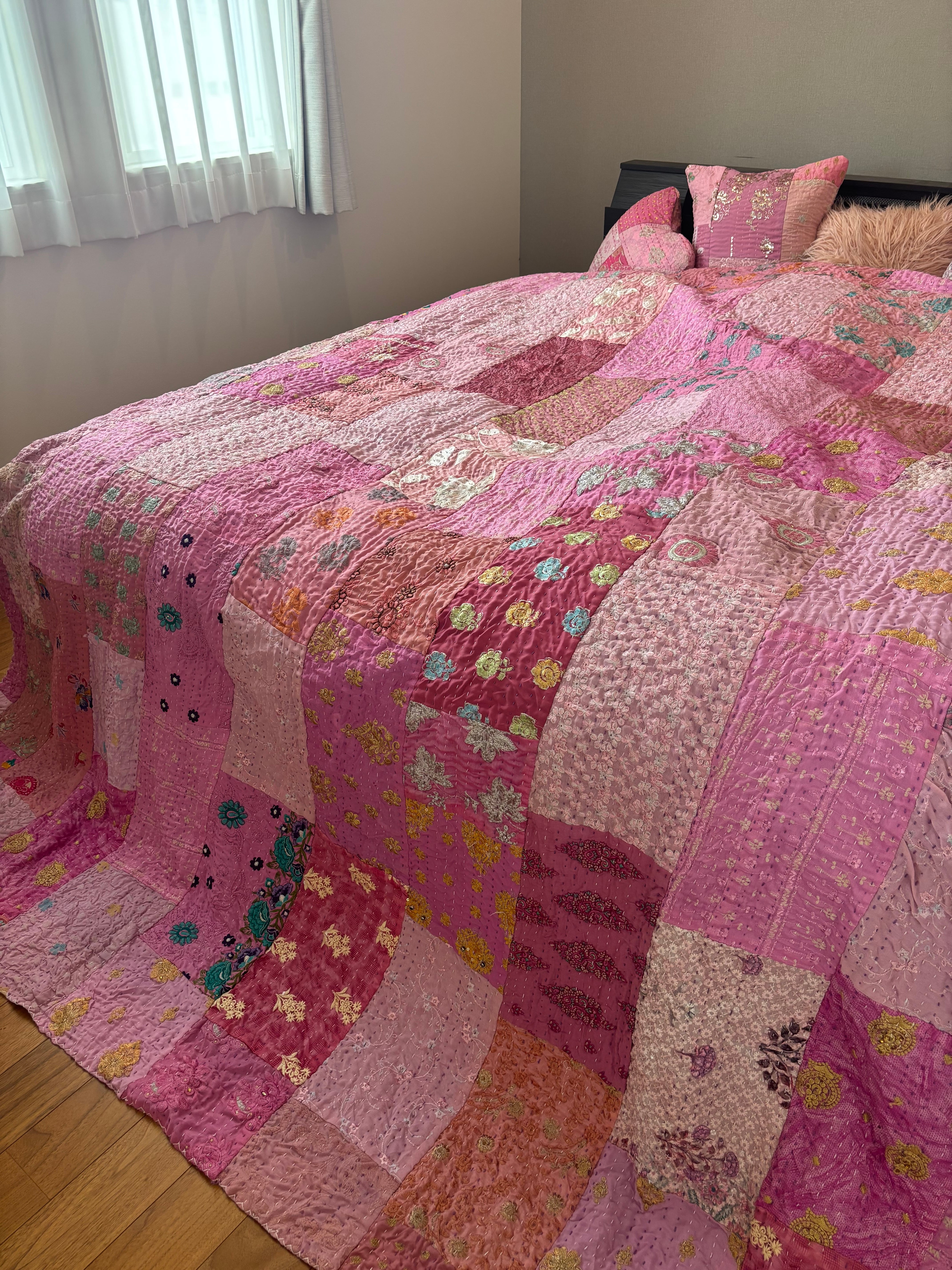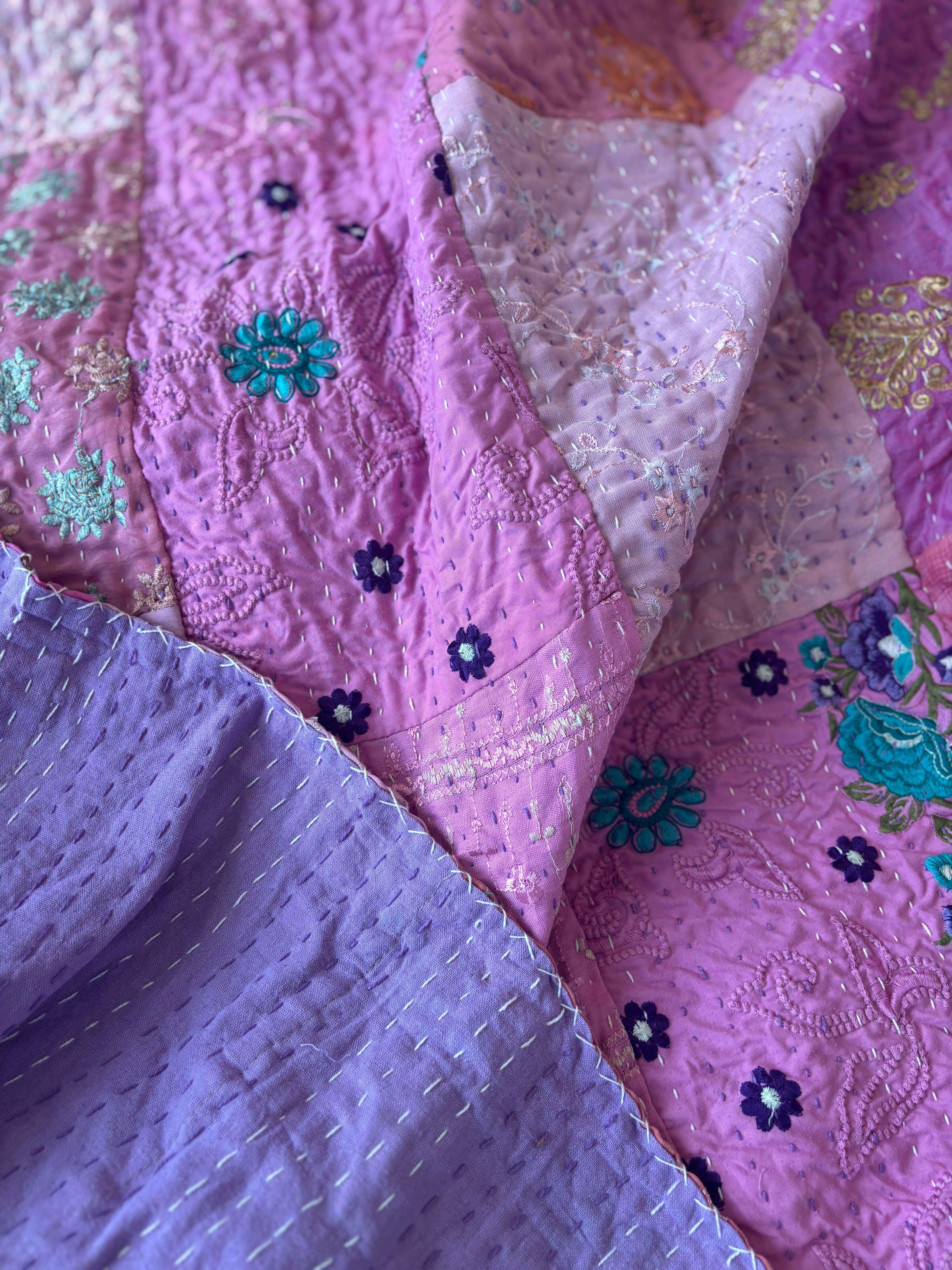 【L】ラベンダーA カンバディアキルト(ダブルサイズ) インド刺繍パッチワーク