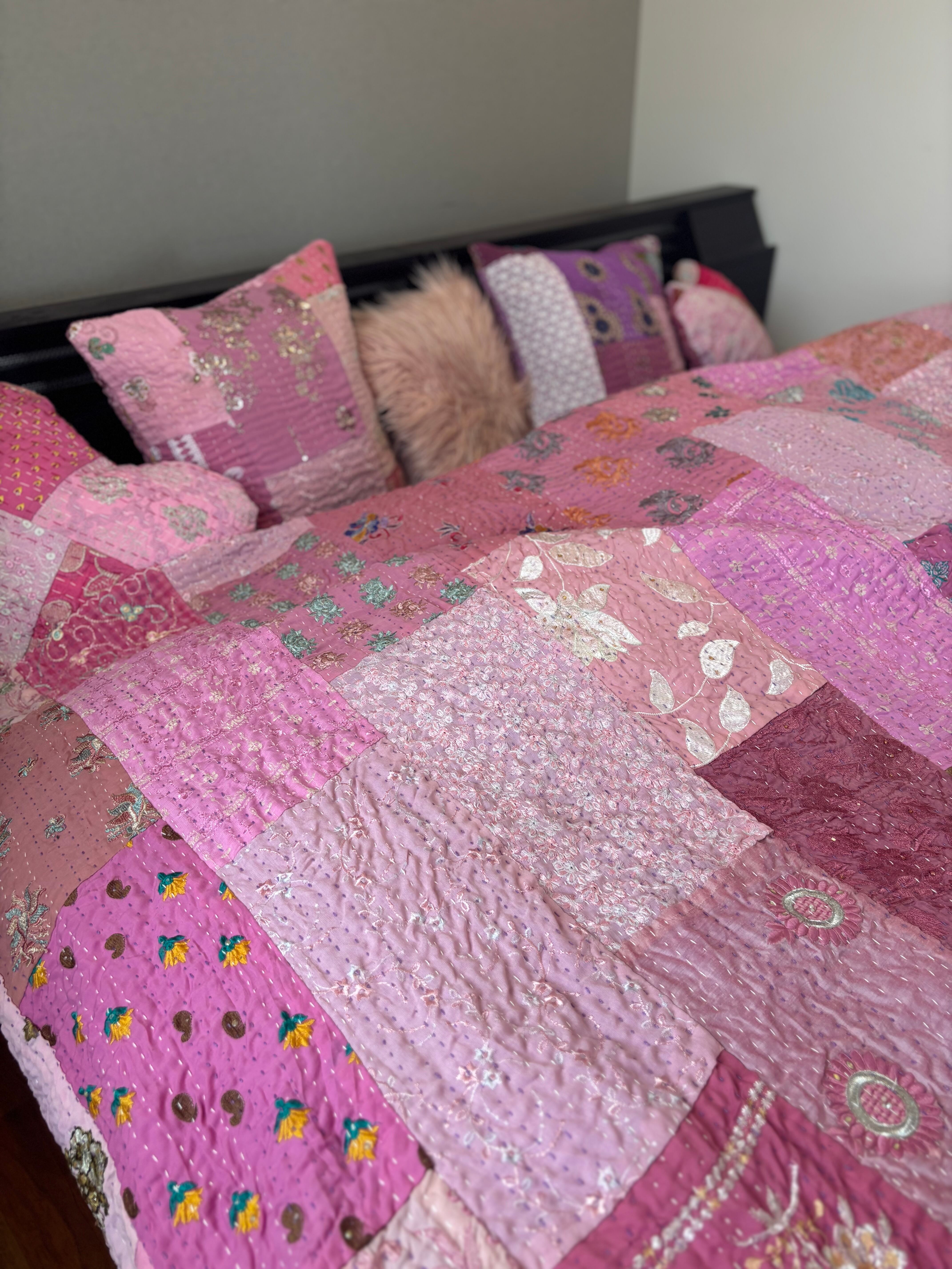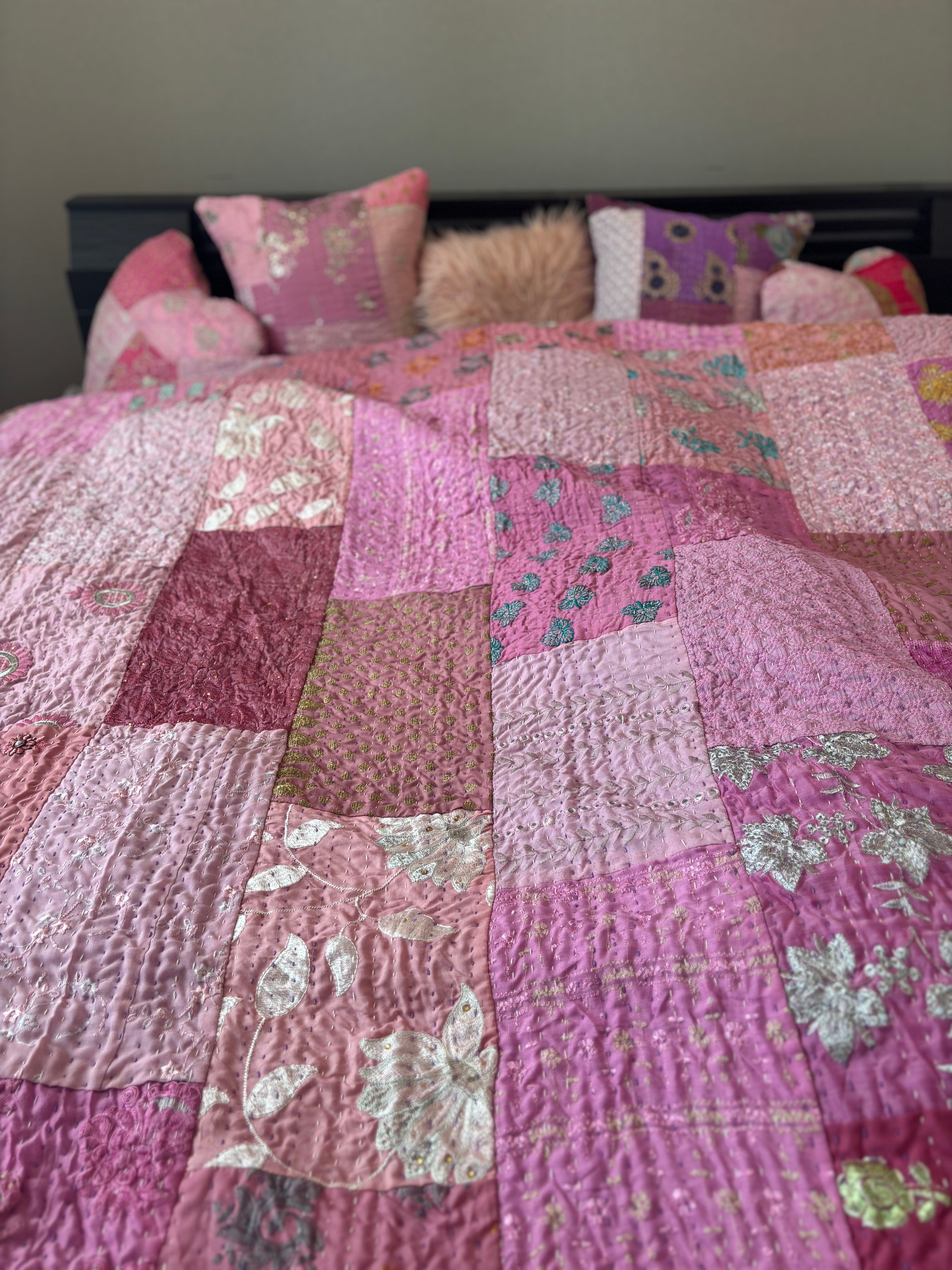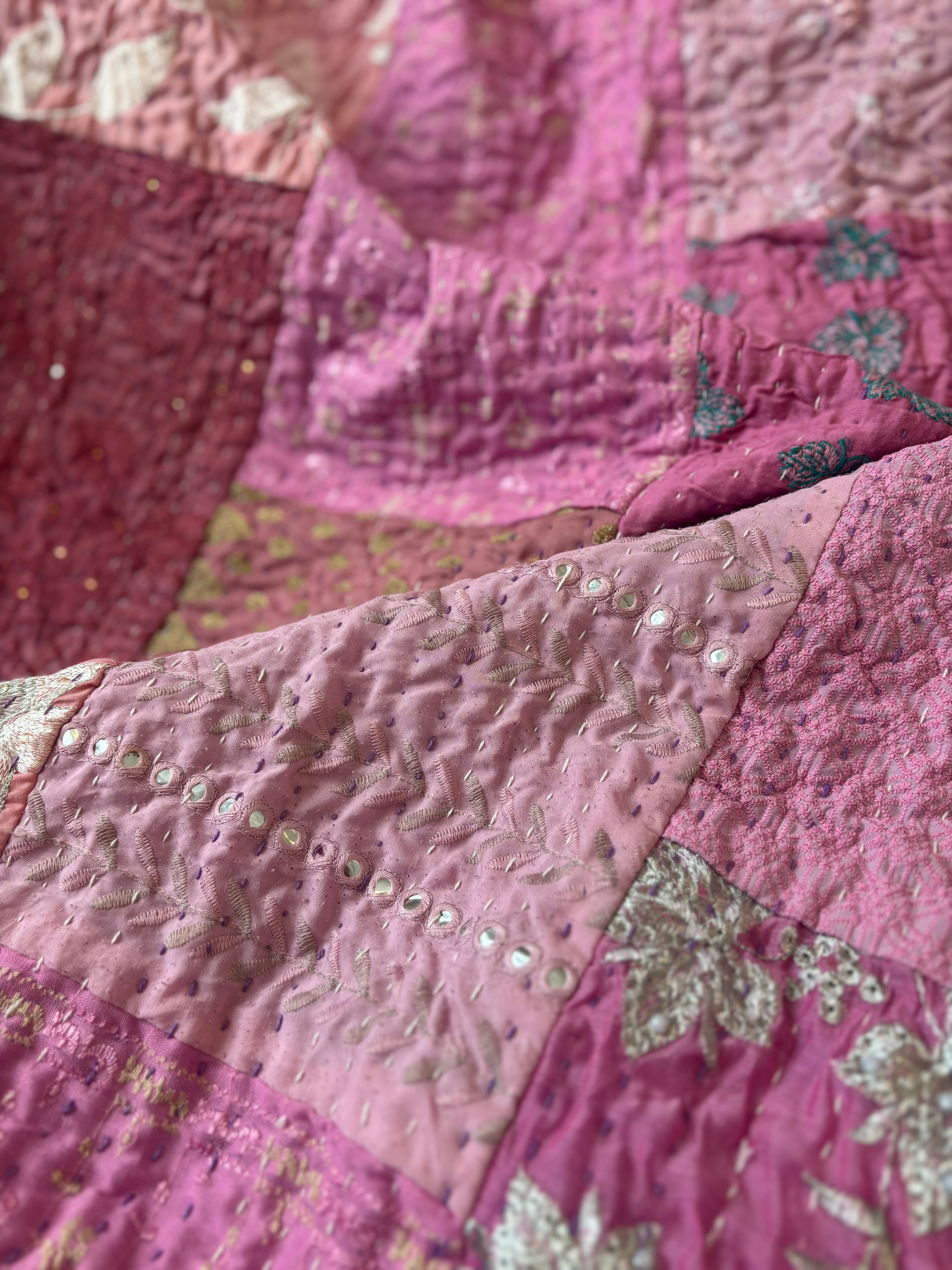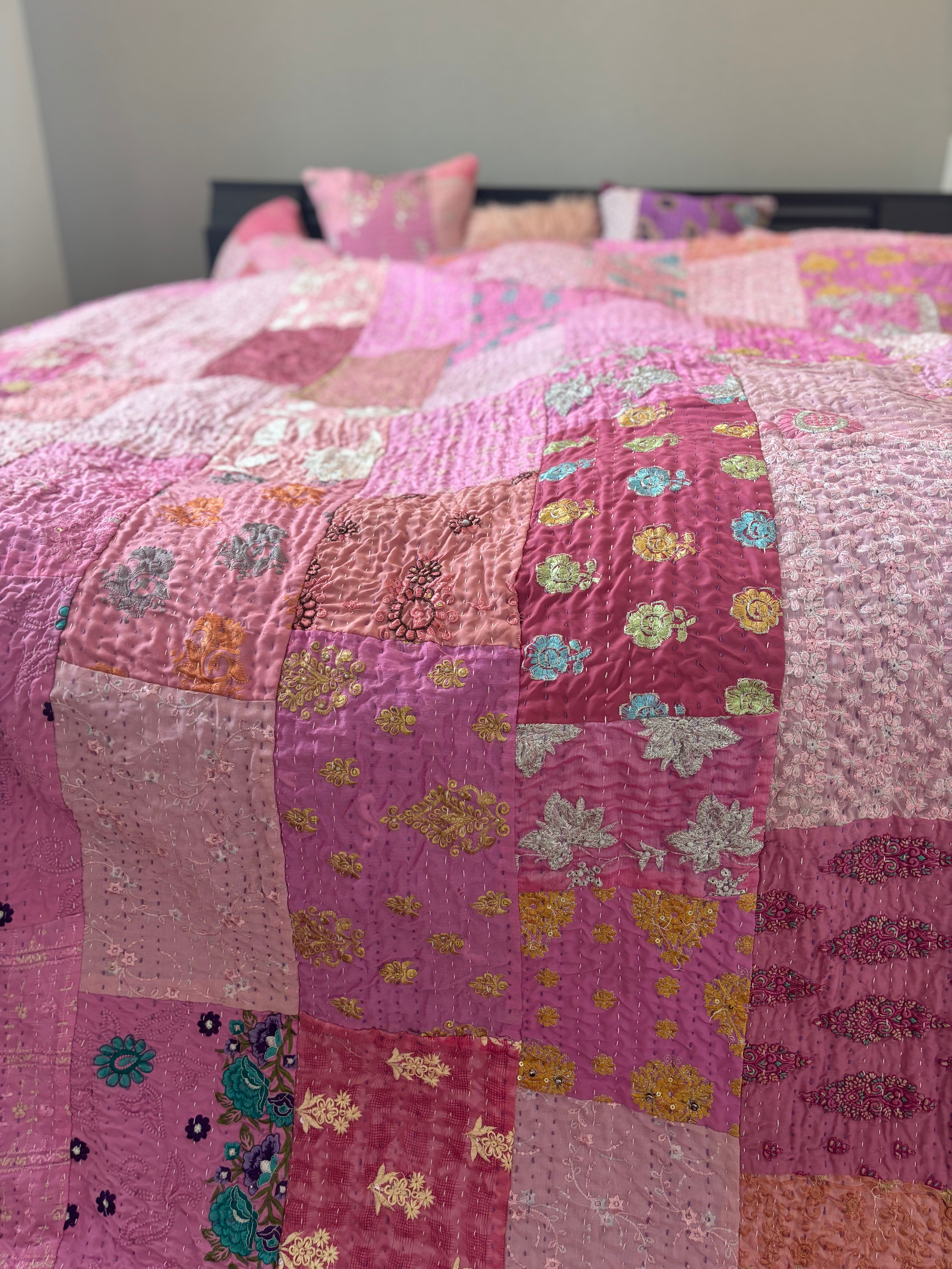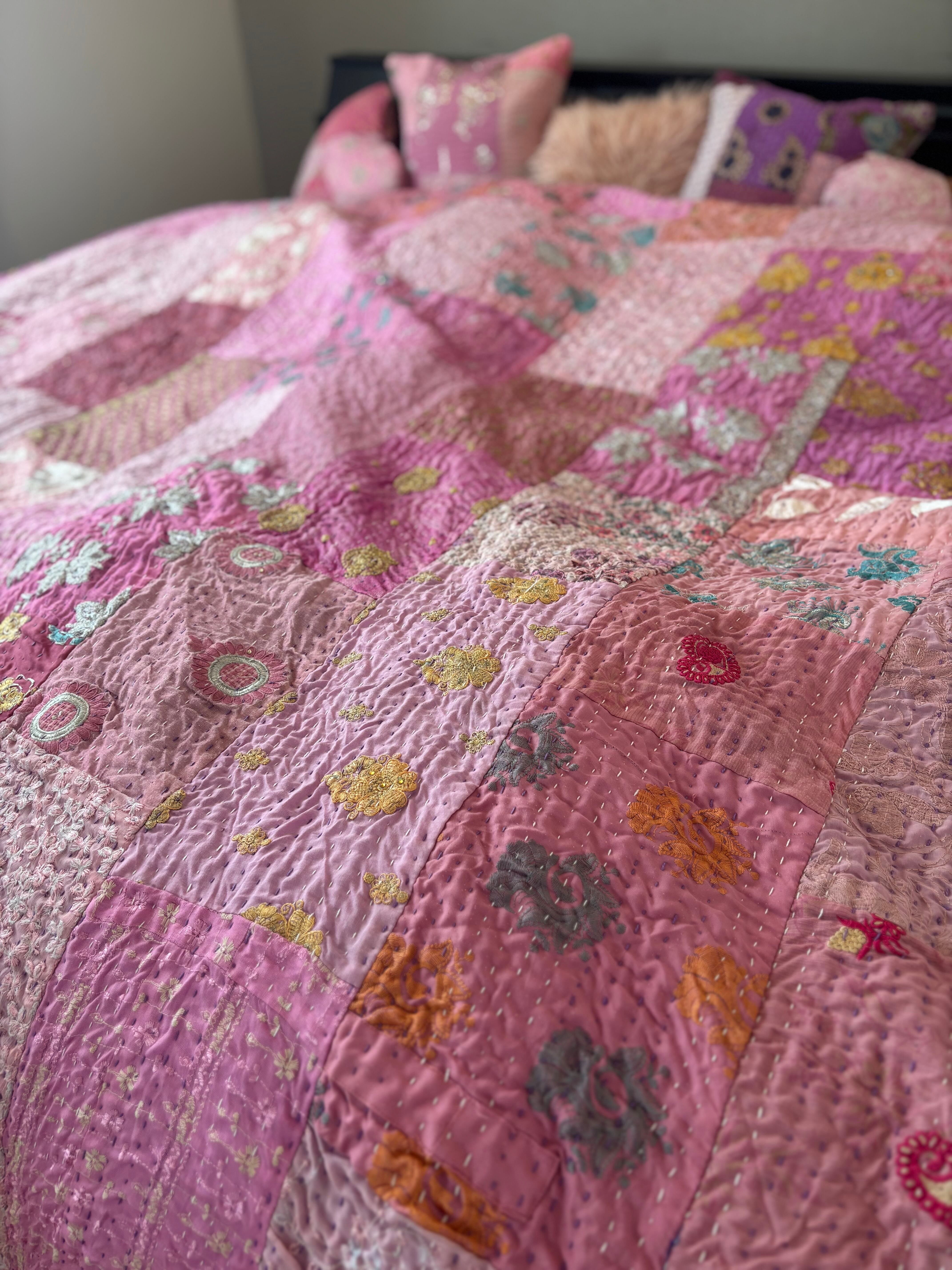 【L】ラベンダーA カンバディアキルト(ダブルサイズ) インド刺繍パッチワーク