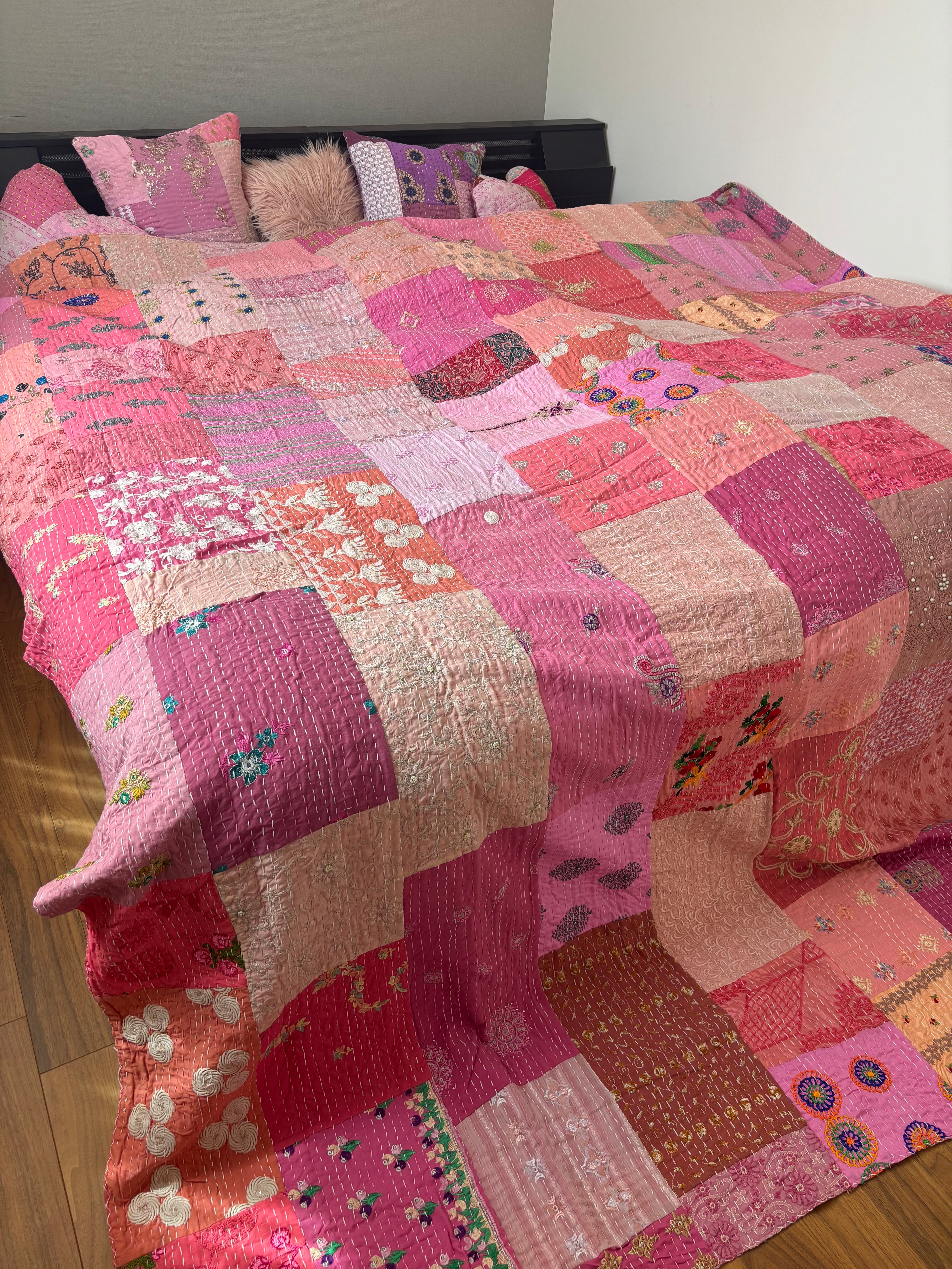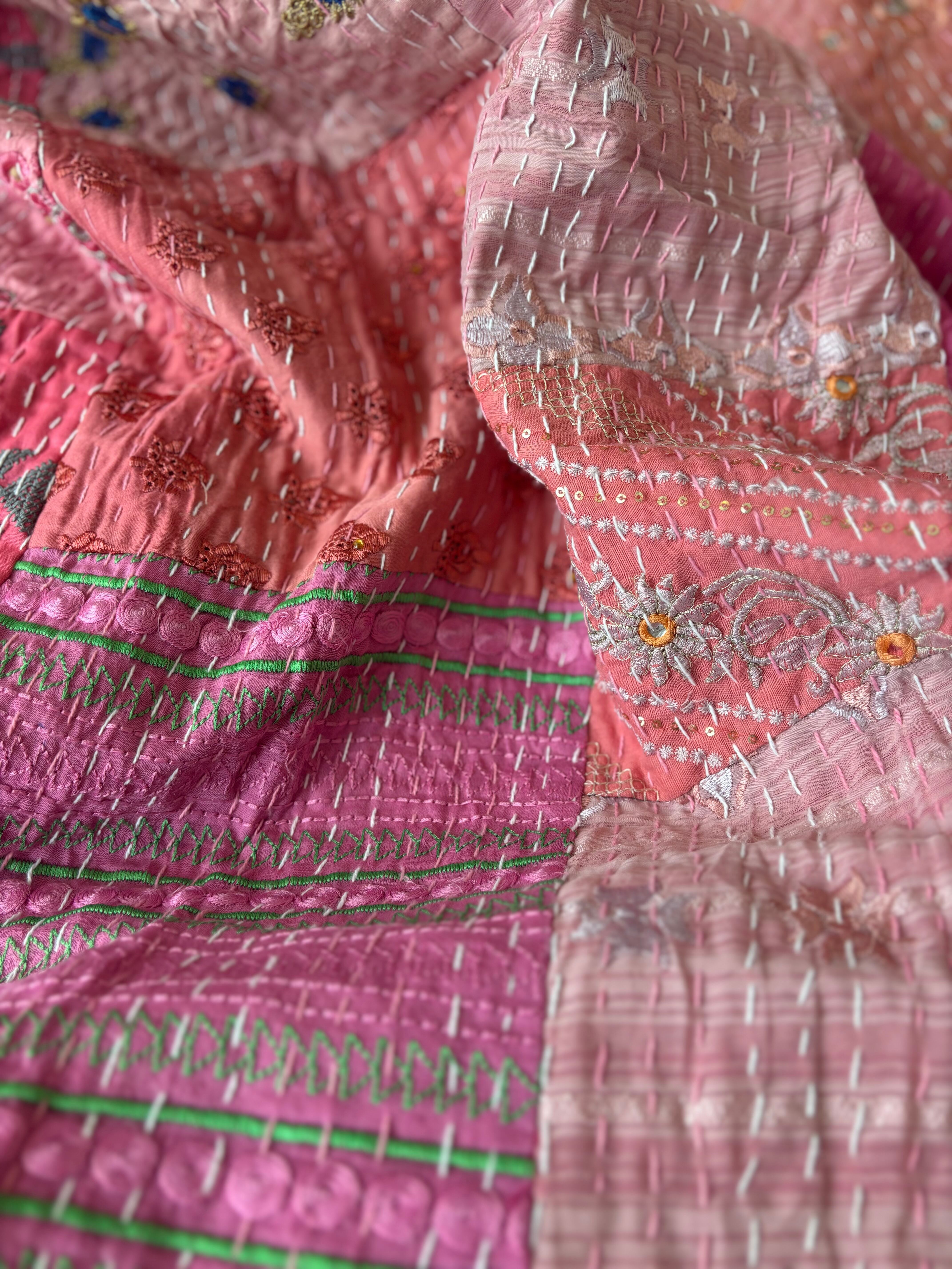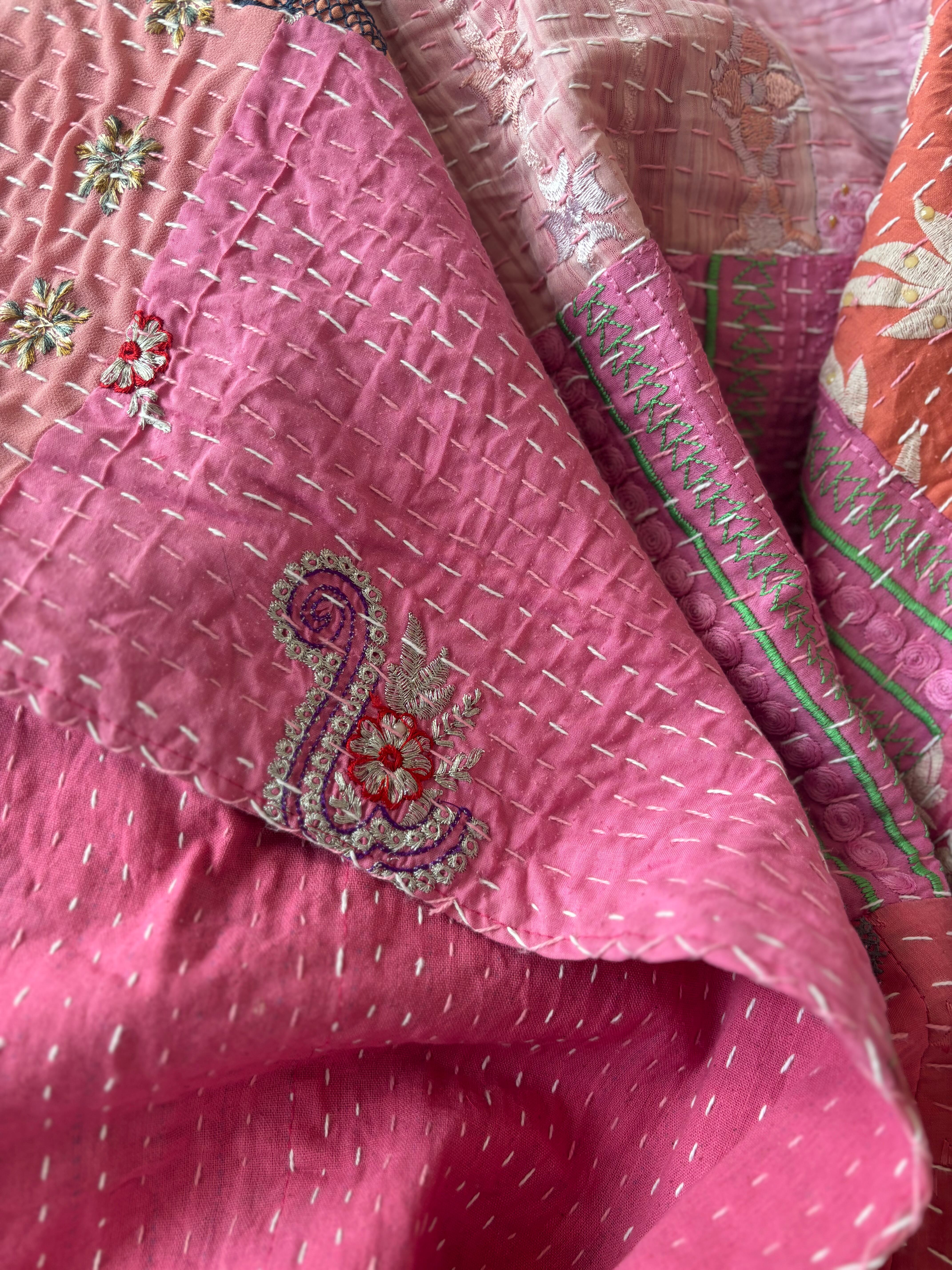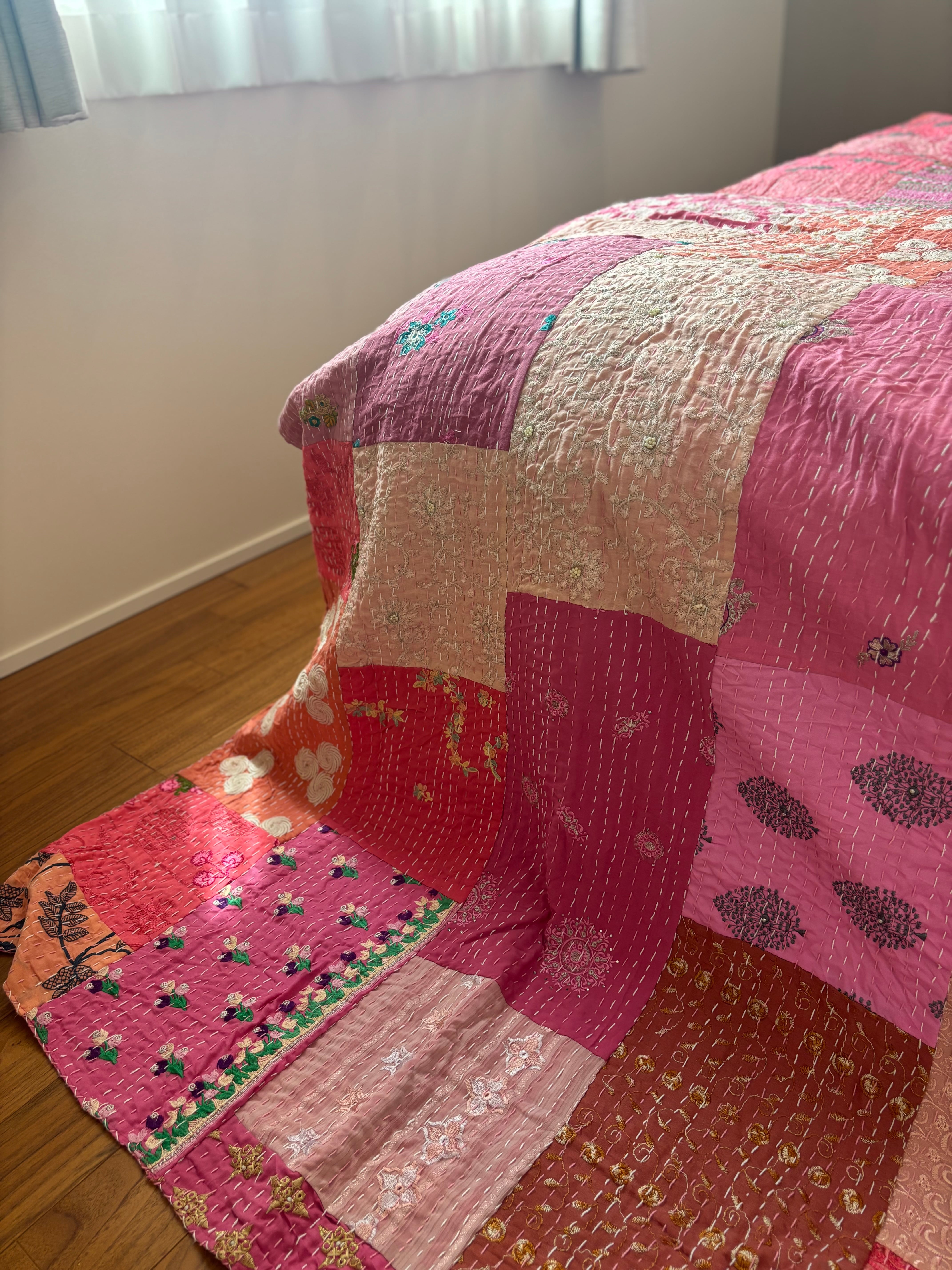 オンライン限定【L】ベビーピンクB カンバディアキルト(ダブルサイズ) インド刺繍パッチワーク