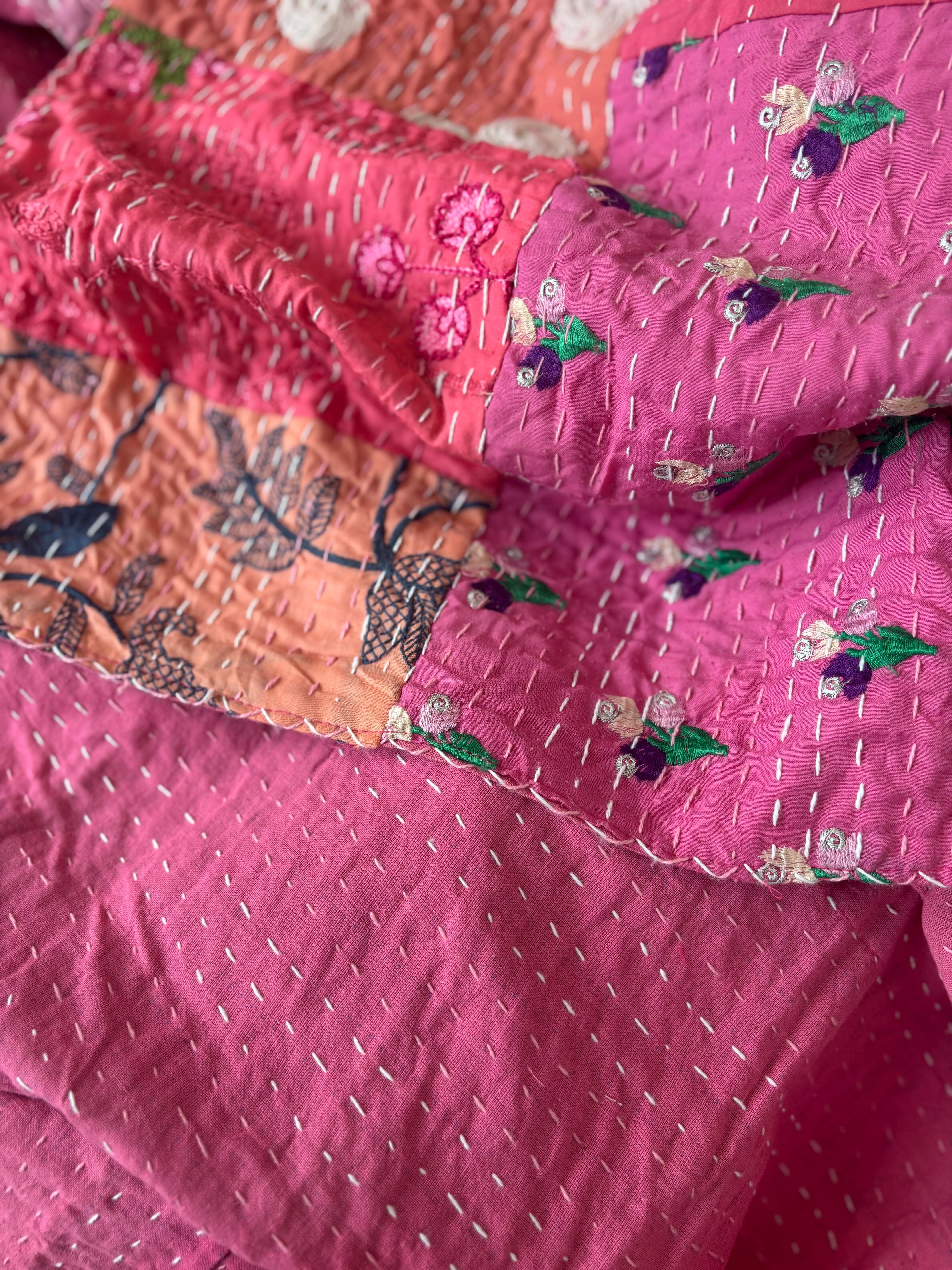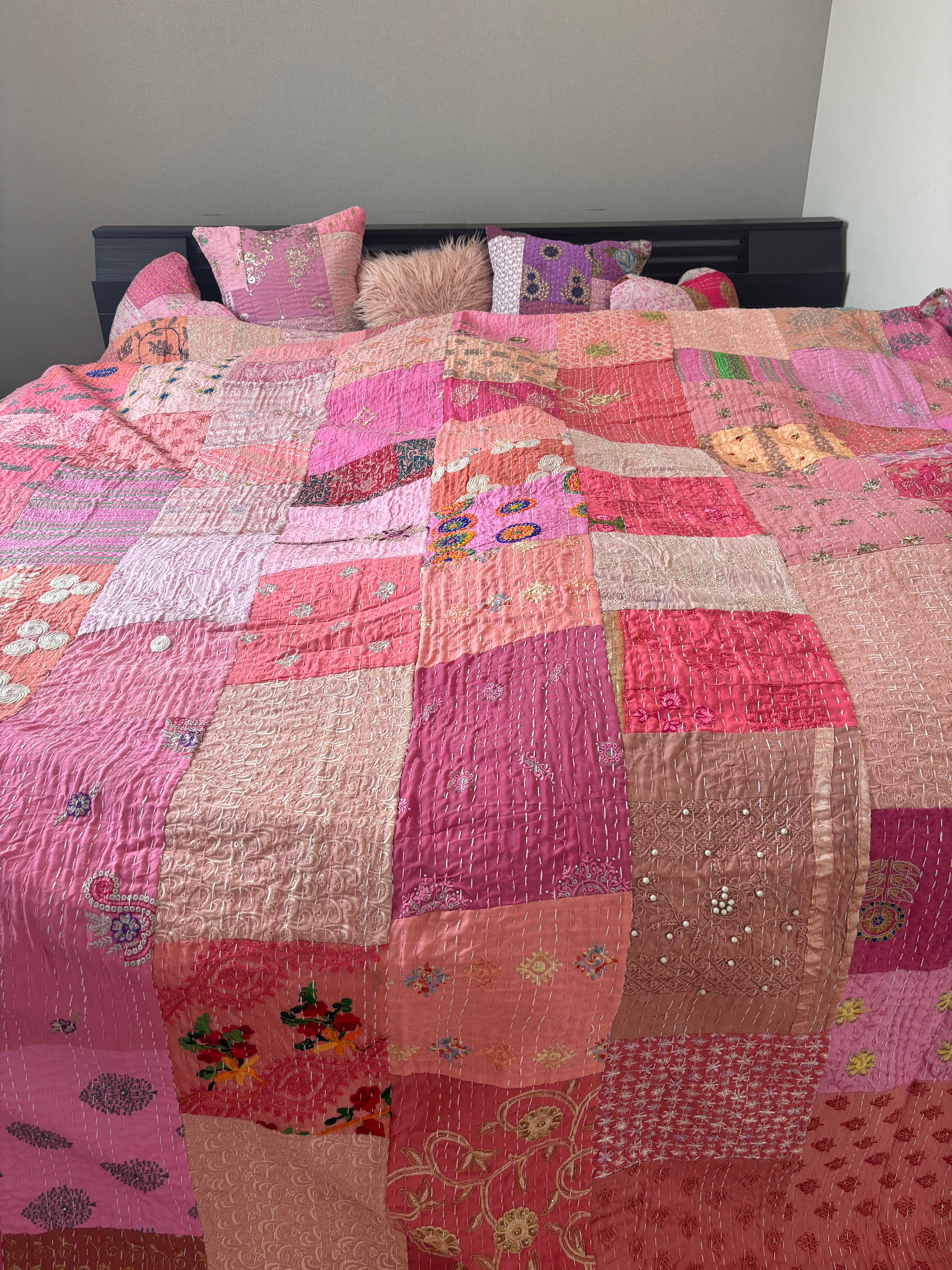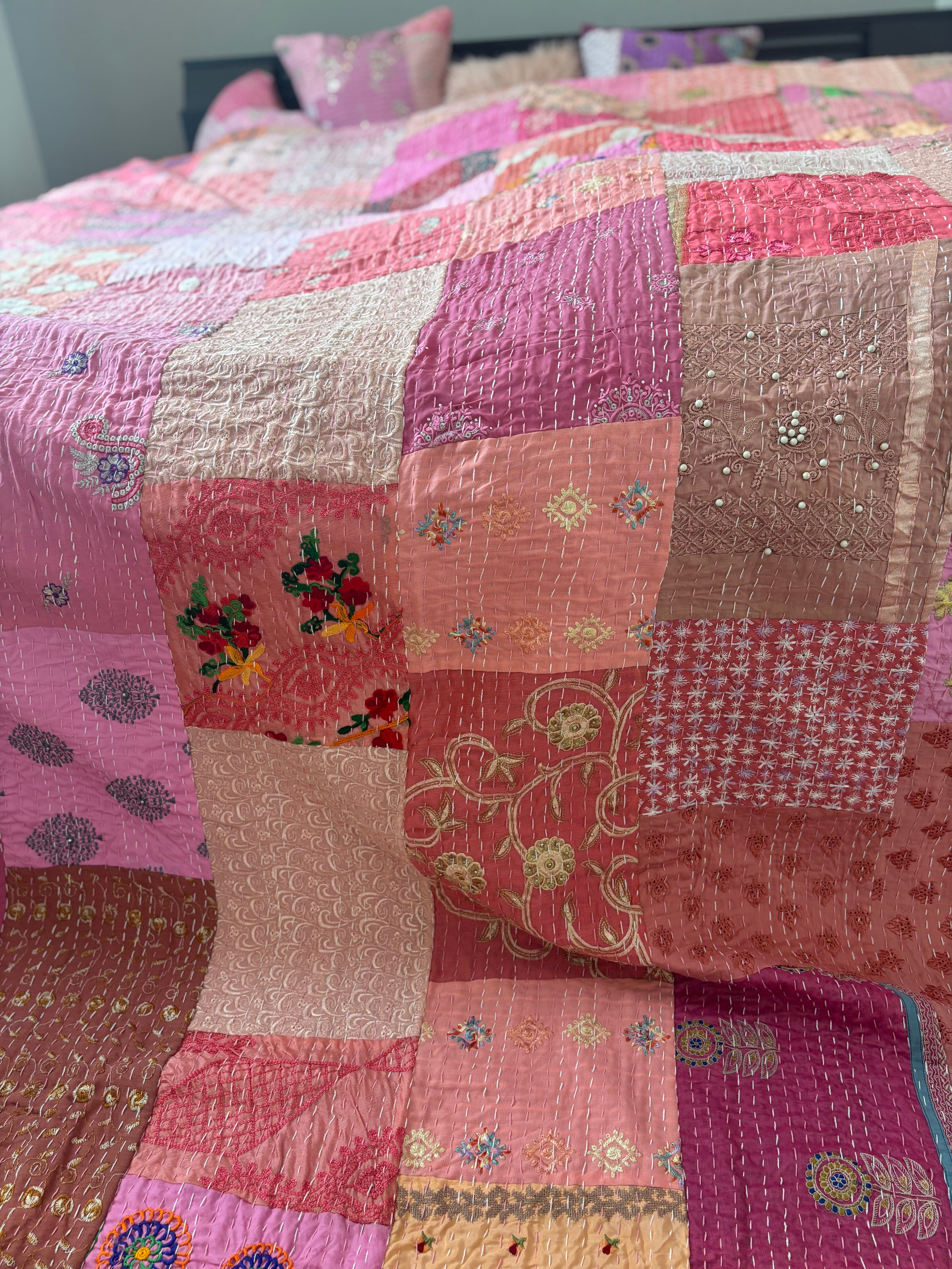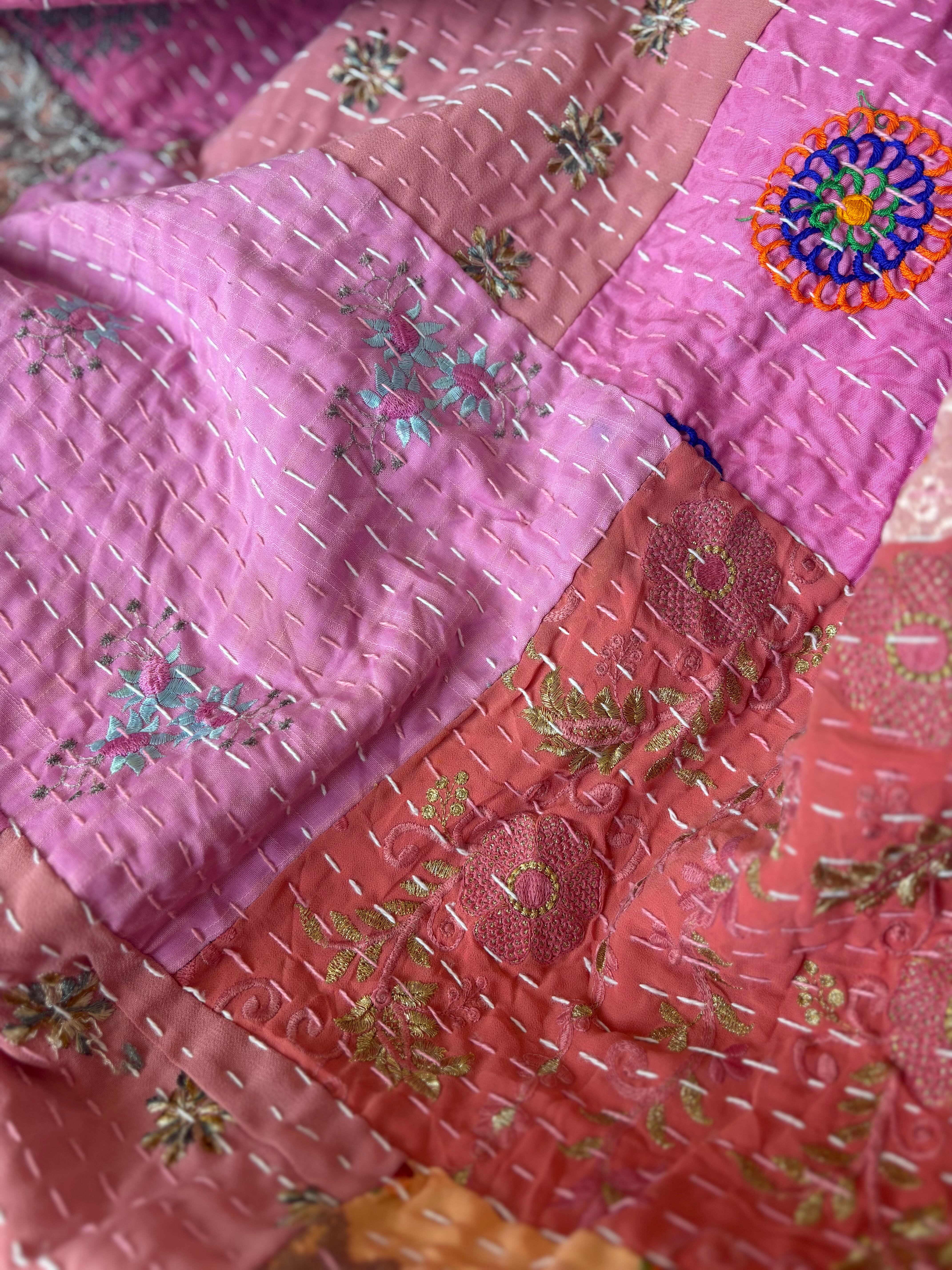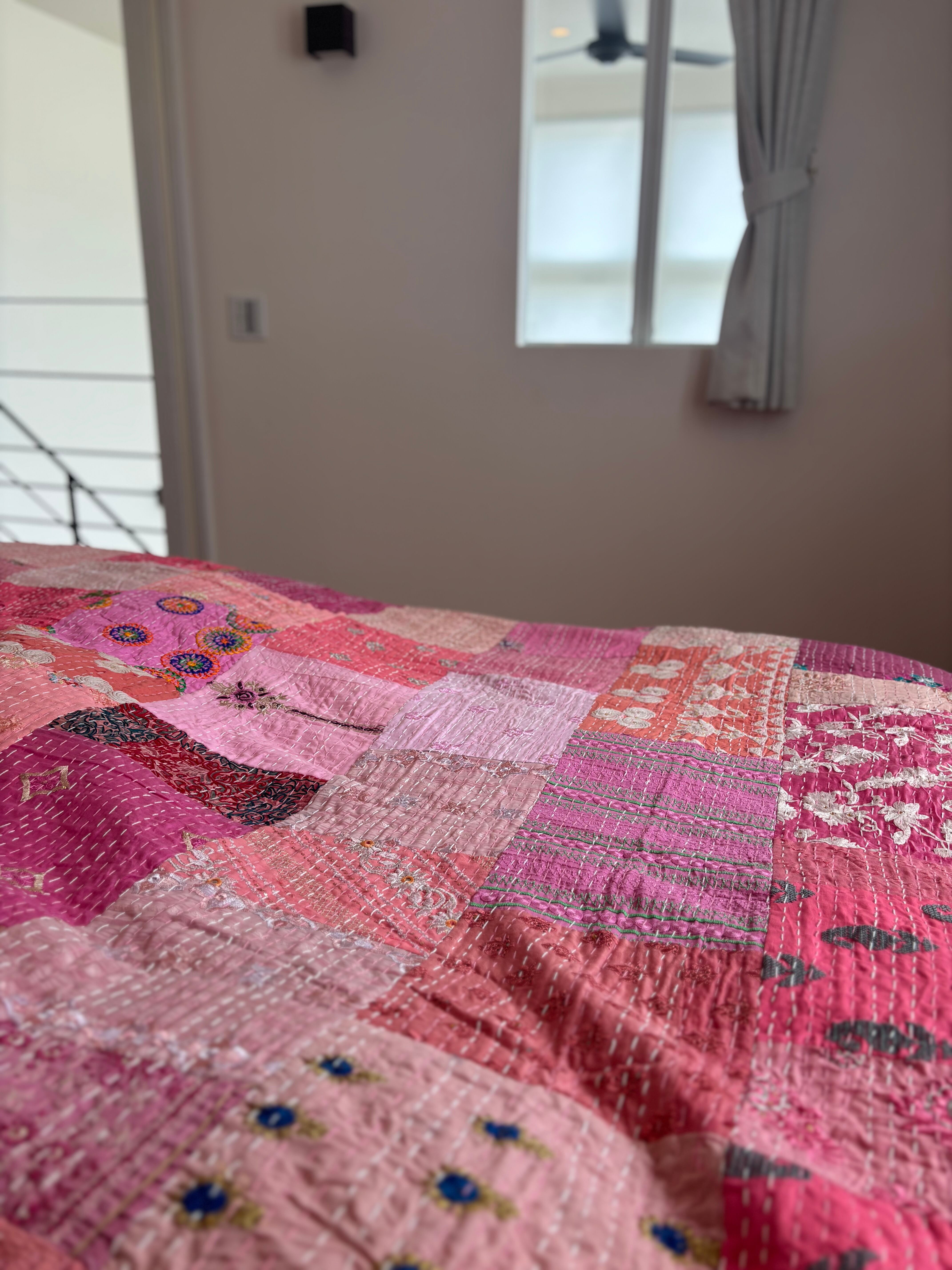 オンライン限定【L】ベビーピンクB カンバディアキルト(ダブルサイズ) インド刺繍パッチワーク