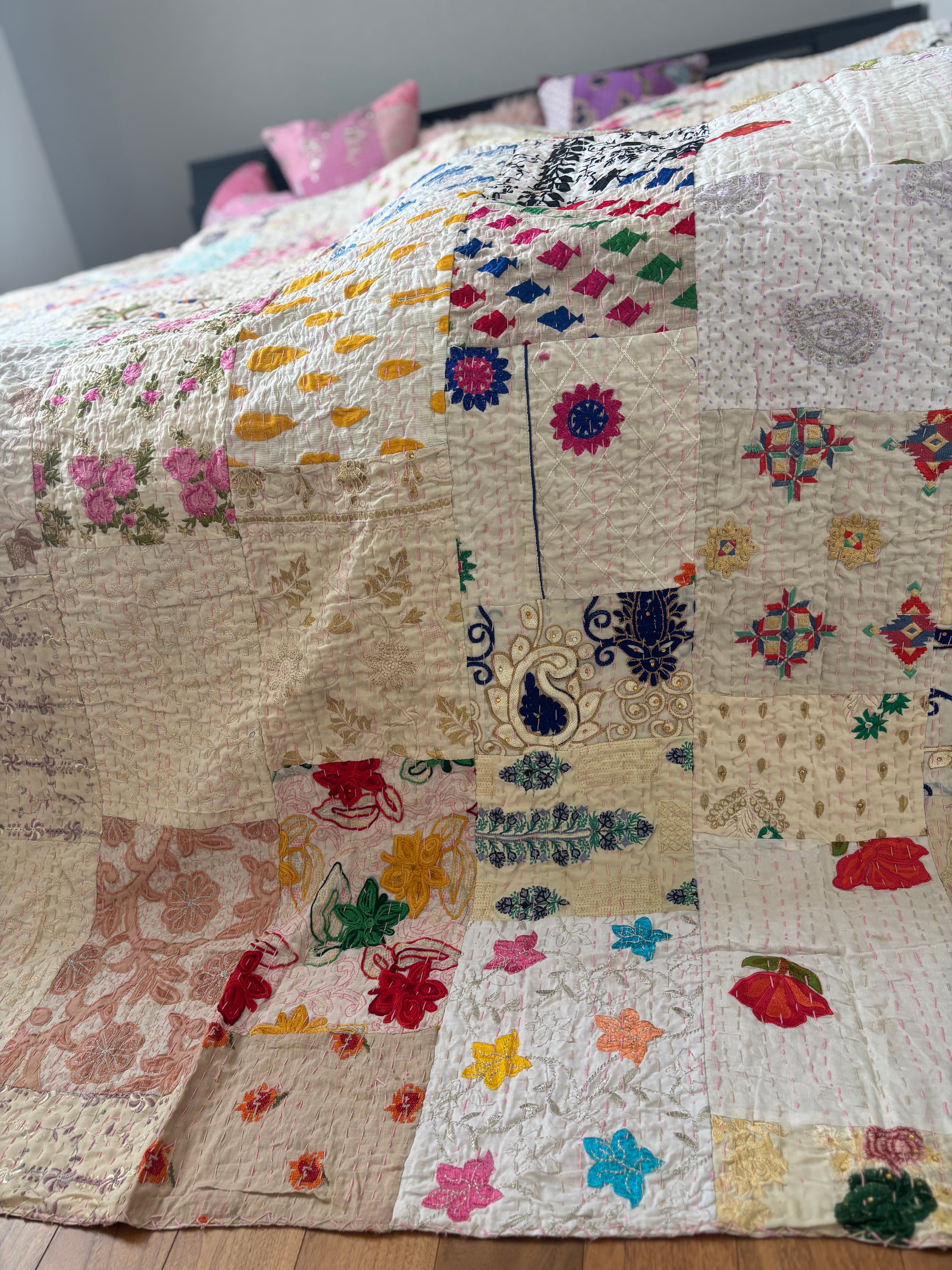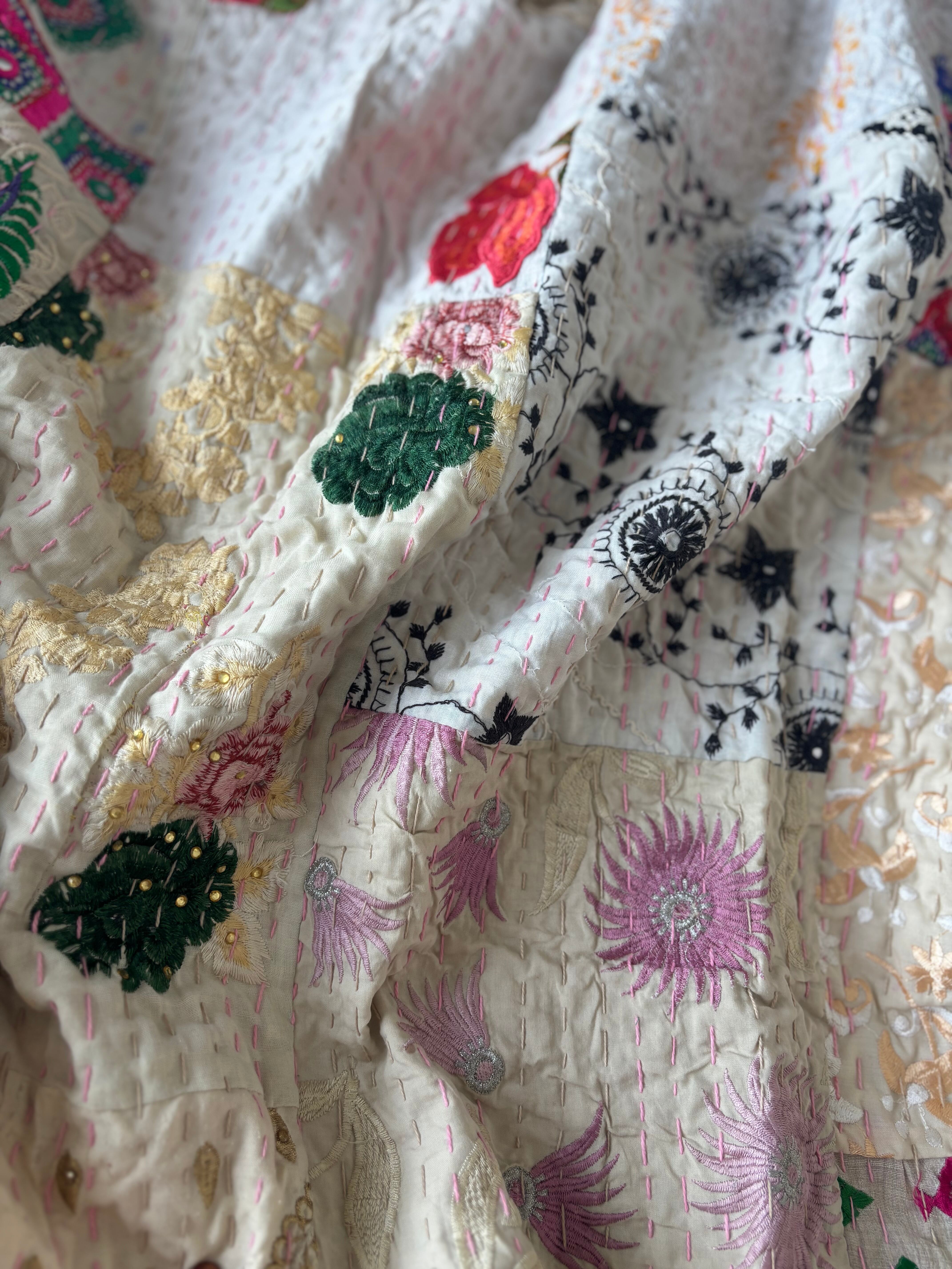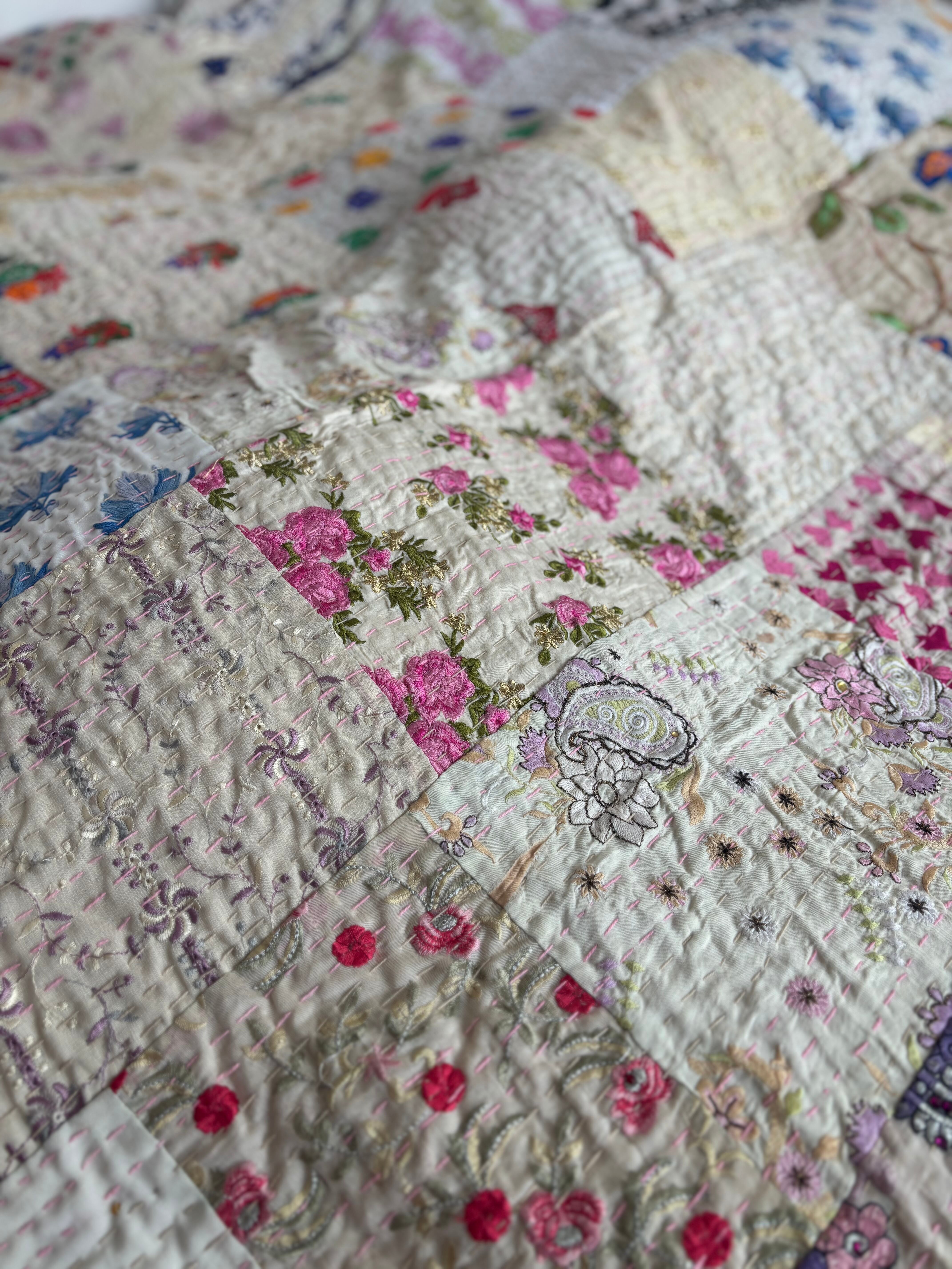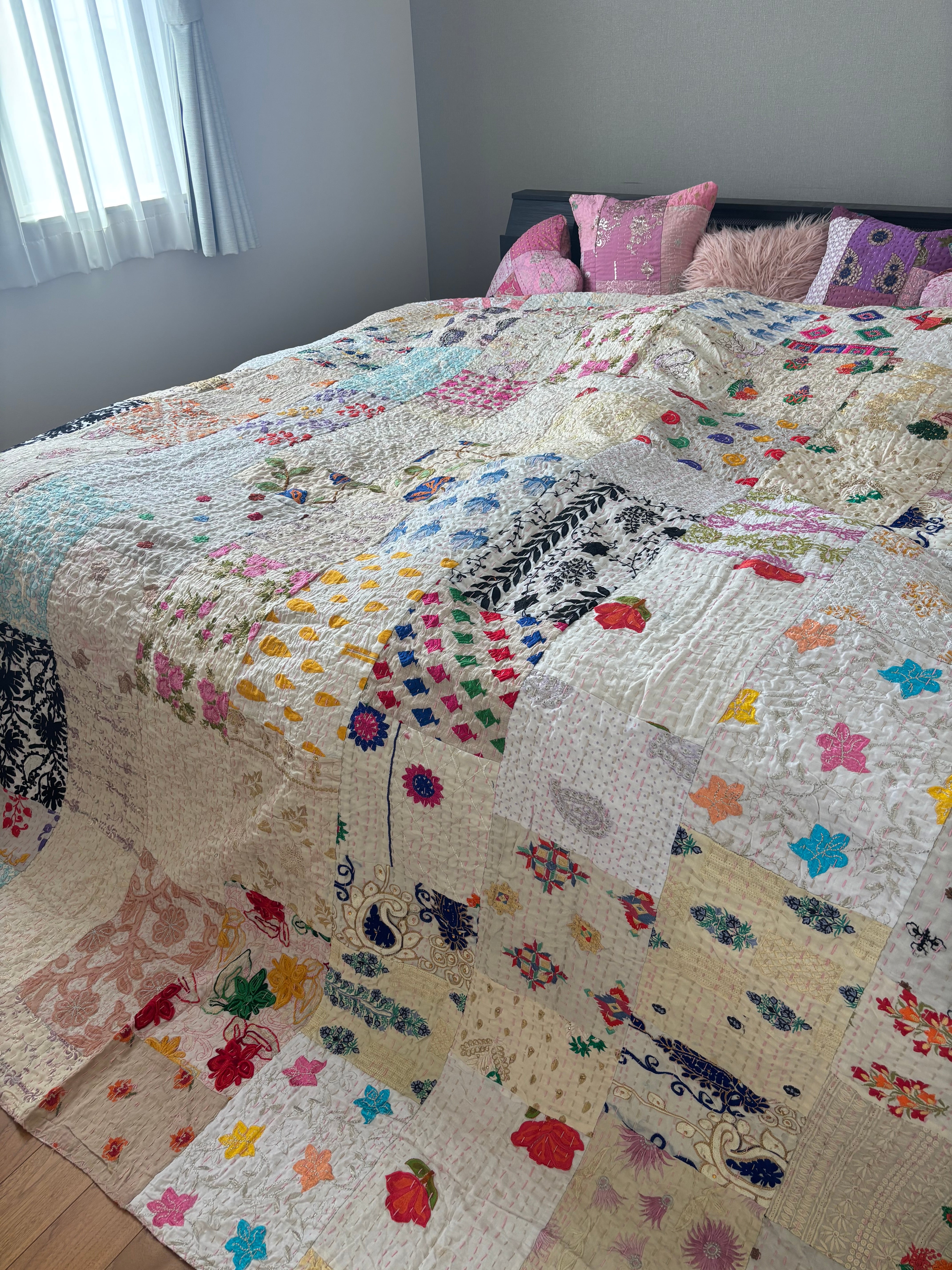 オンライン限定【L】アイボリーB カンバディアキルト(ダブルサイズ) インド刺繍パッチワーク