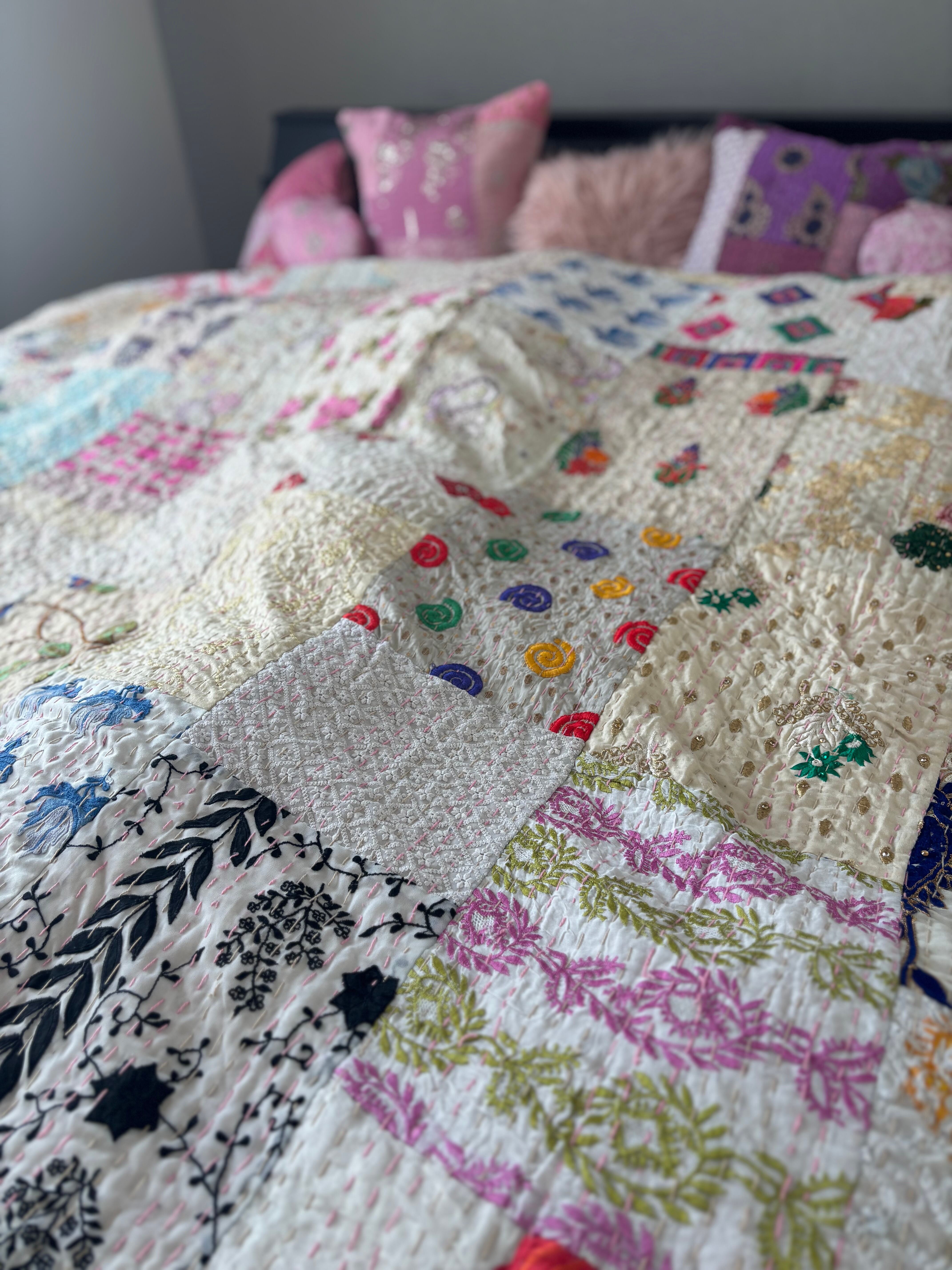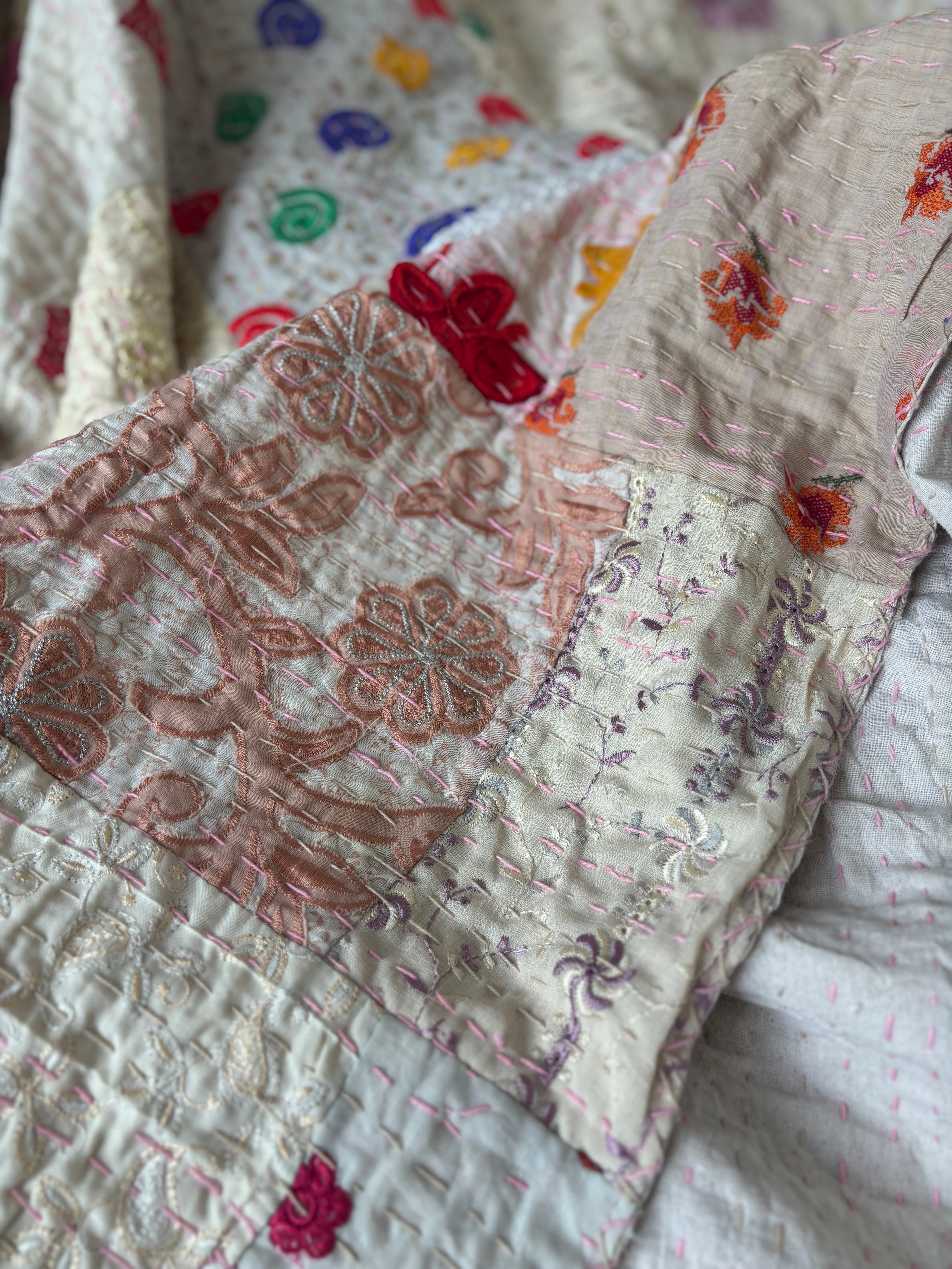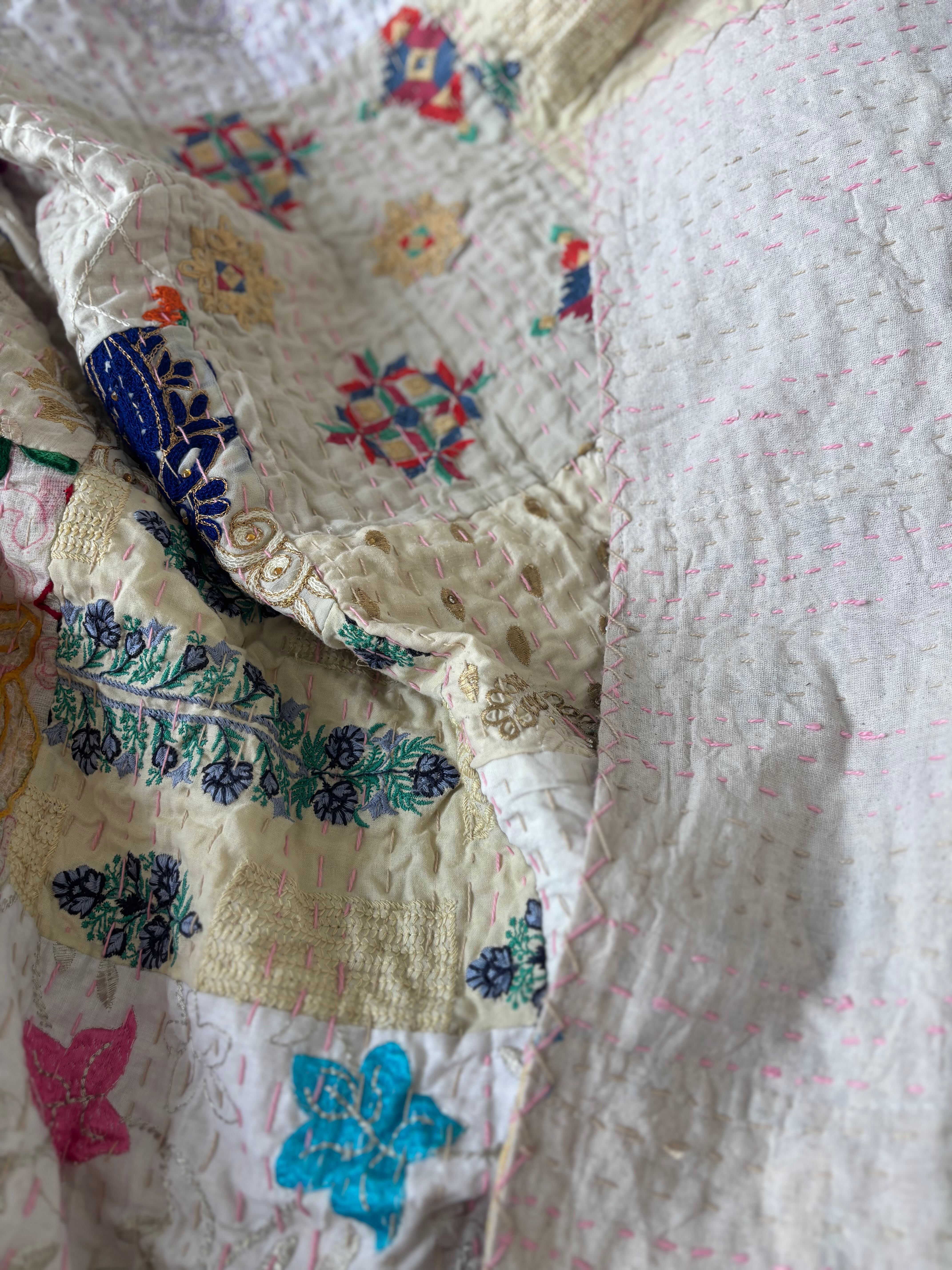 オンライン限定【L】アイボリーB カンバディアキルト(ダブルサイズ) インド刺繍パッチワーク