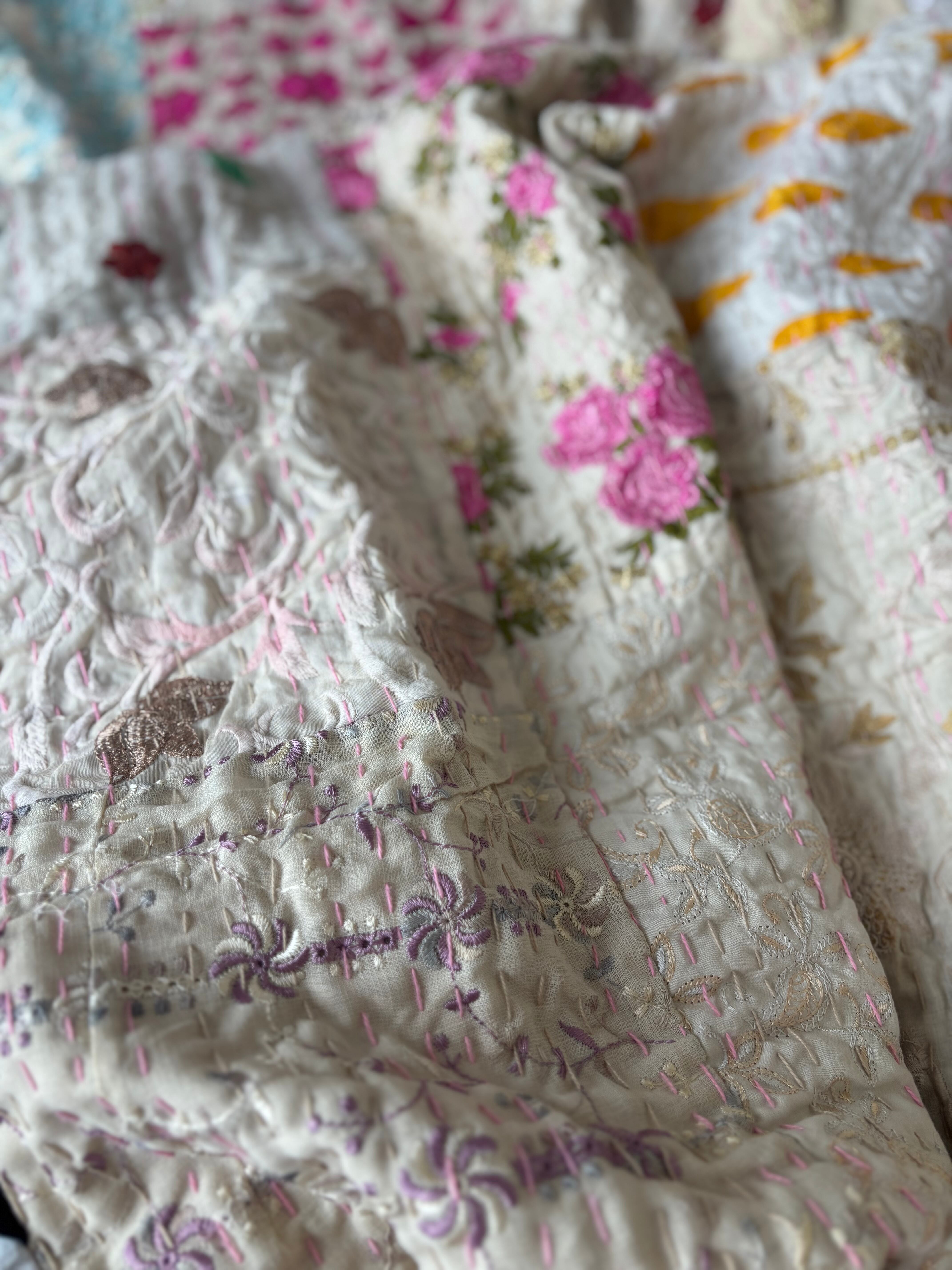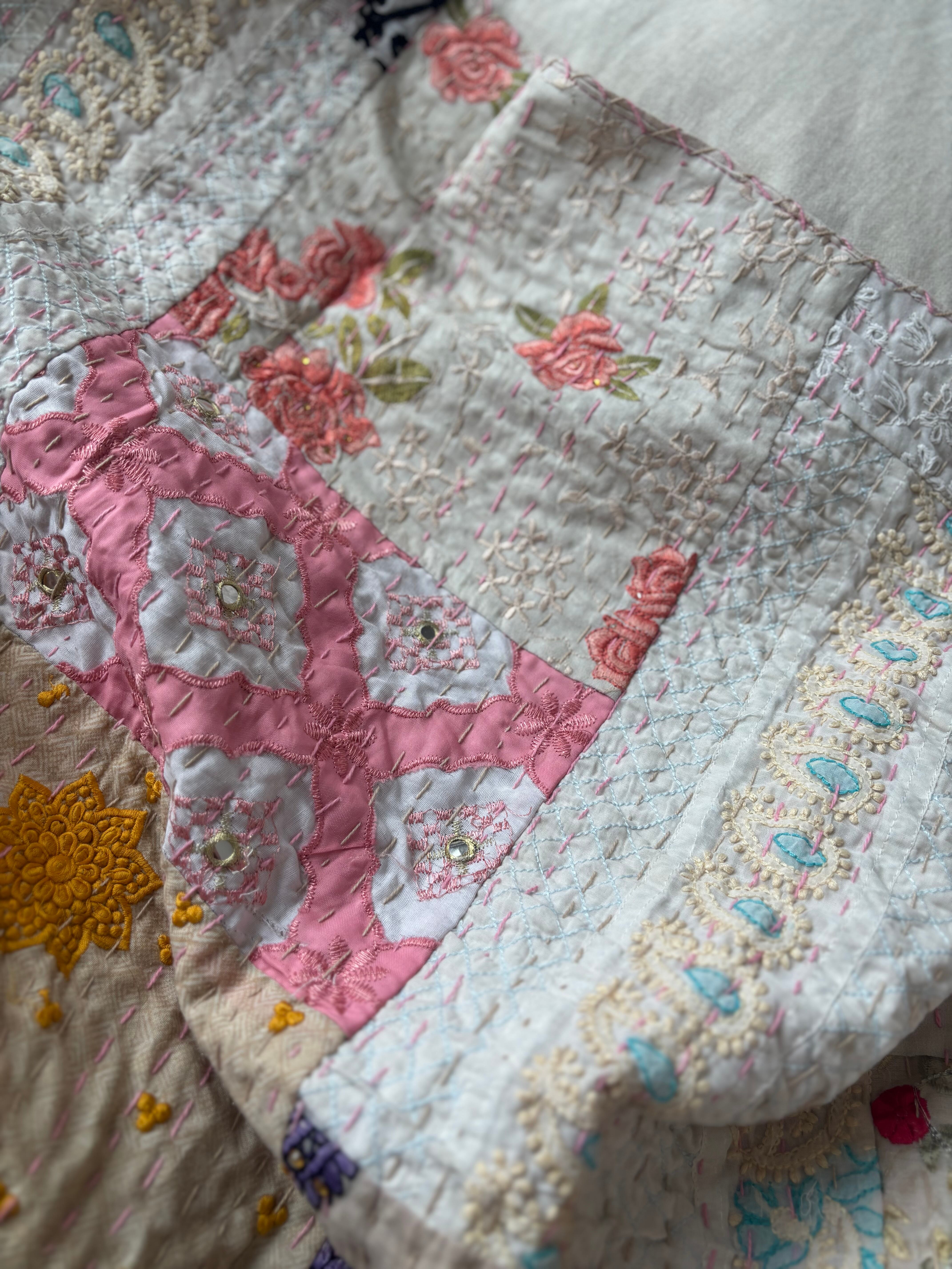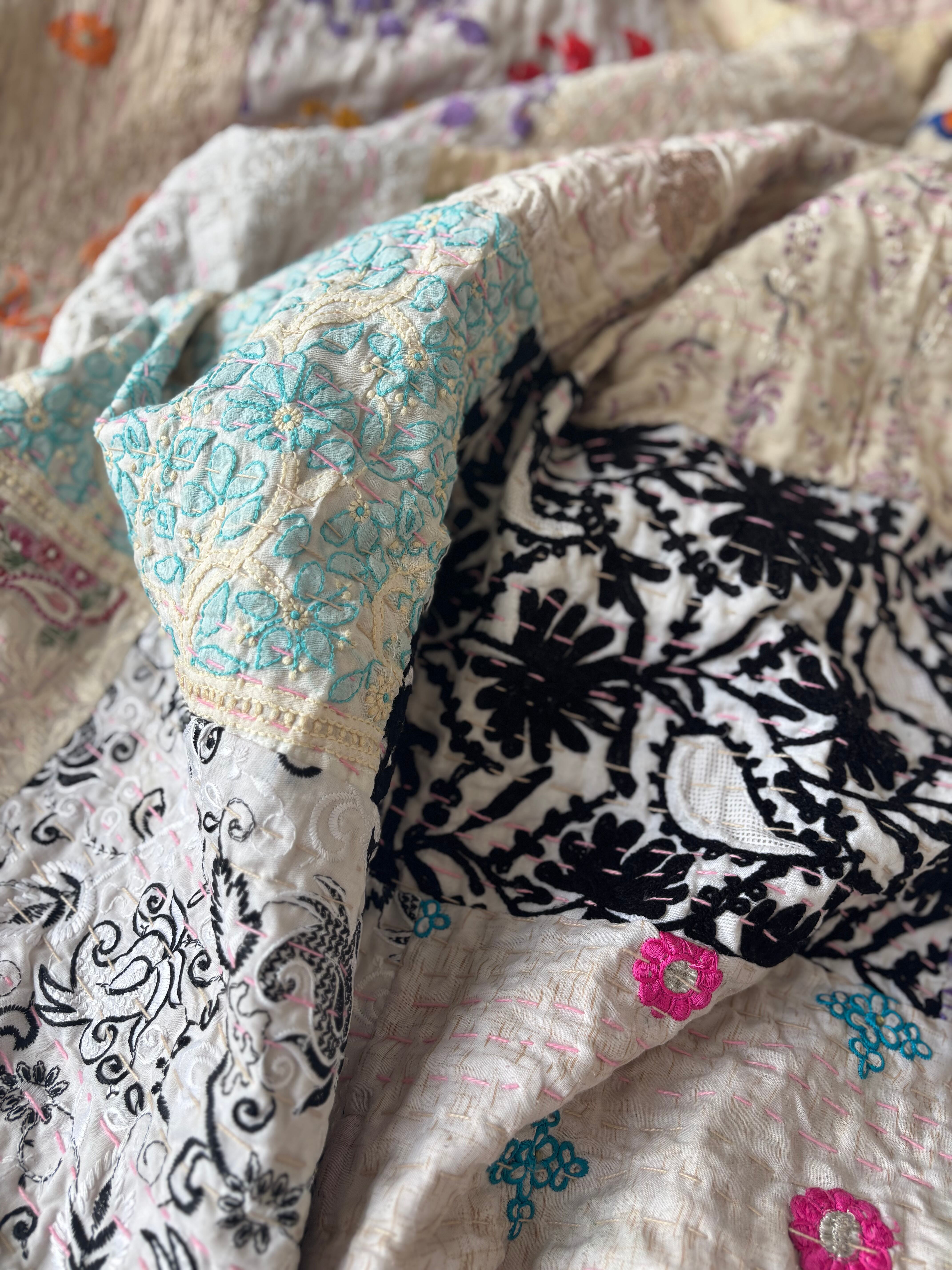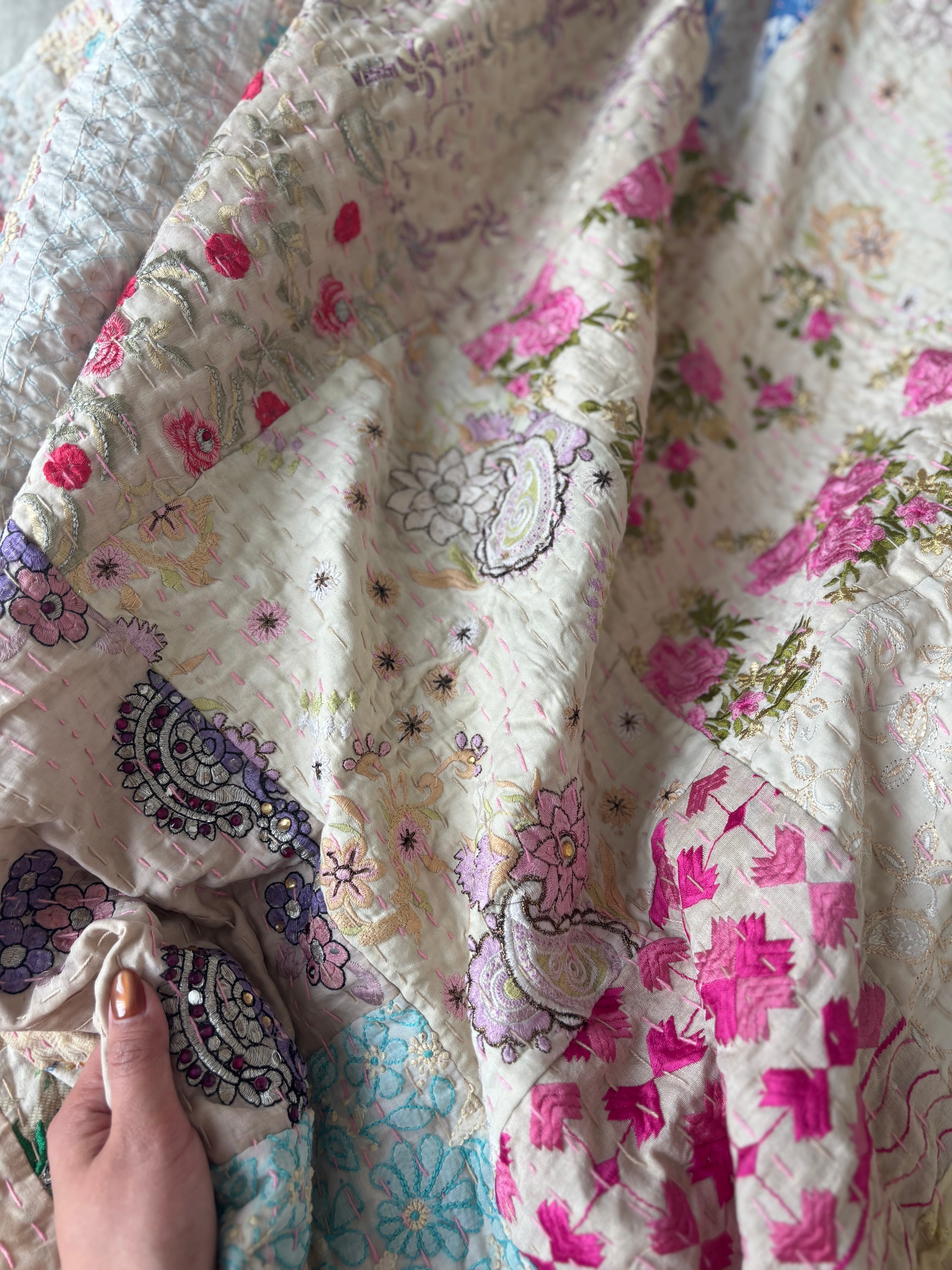 オンライン限定【L】アイボリーB カンバディアキルト(ダブルサイズ) インド刺繍パッチワーク