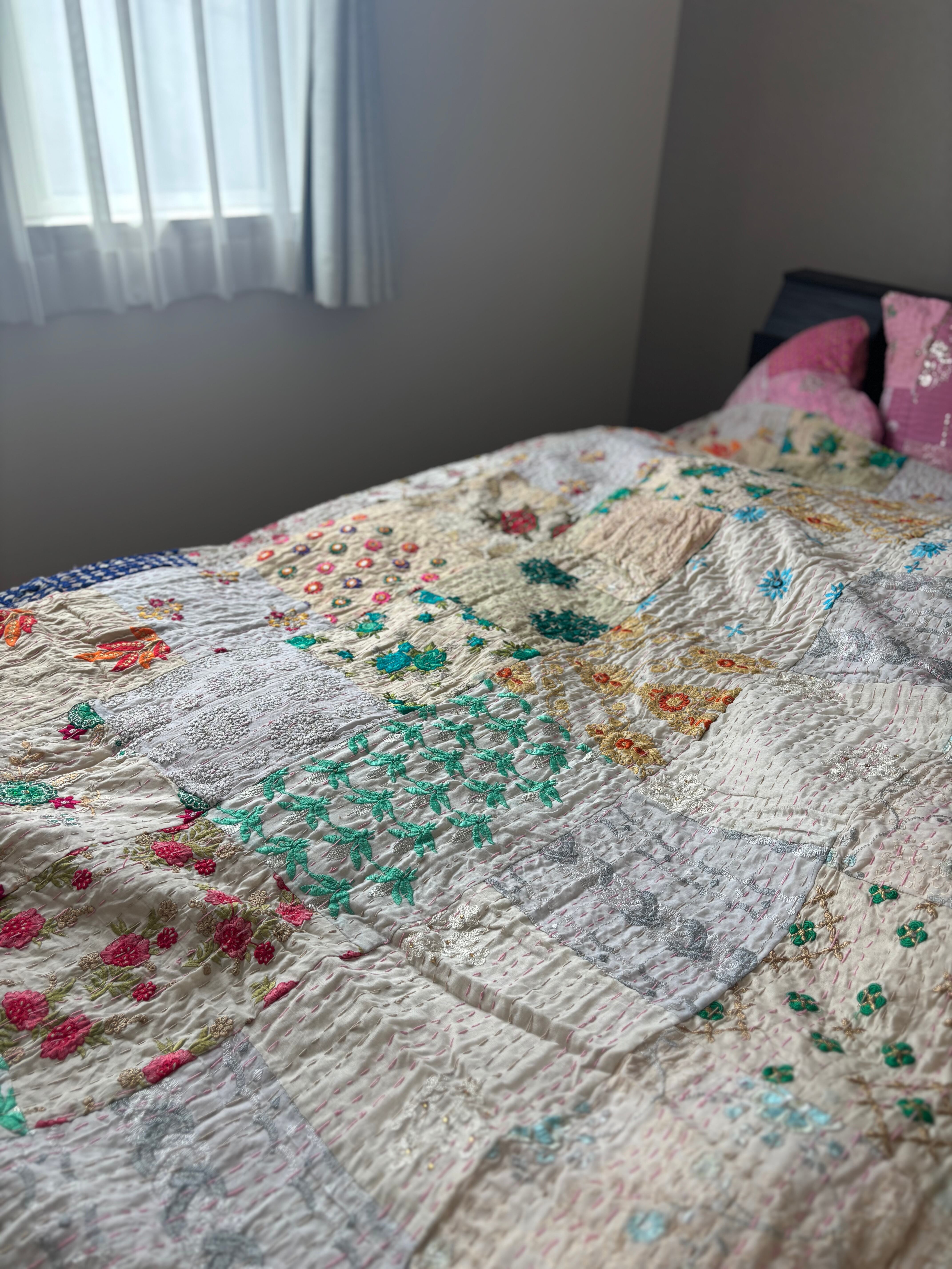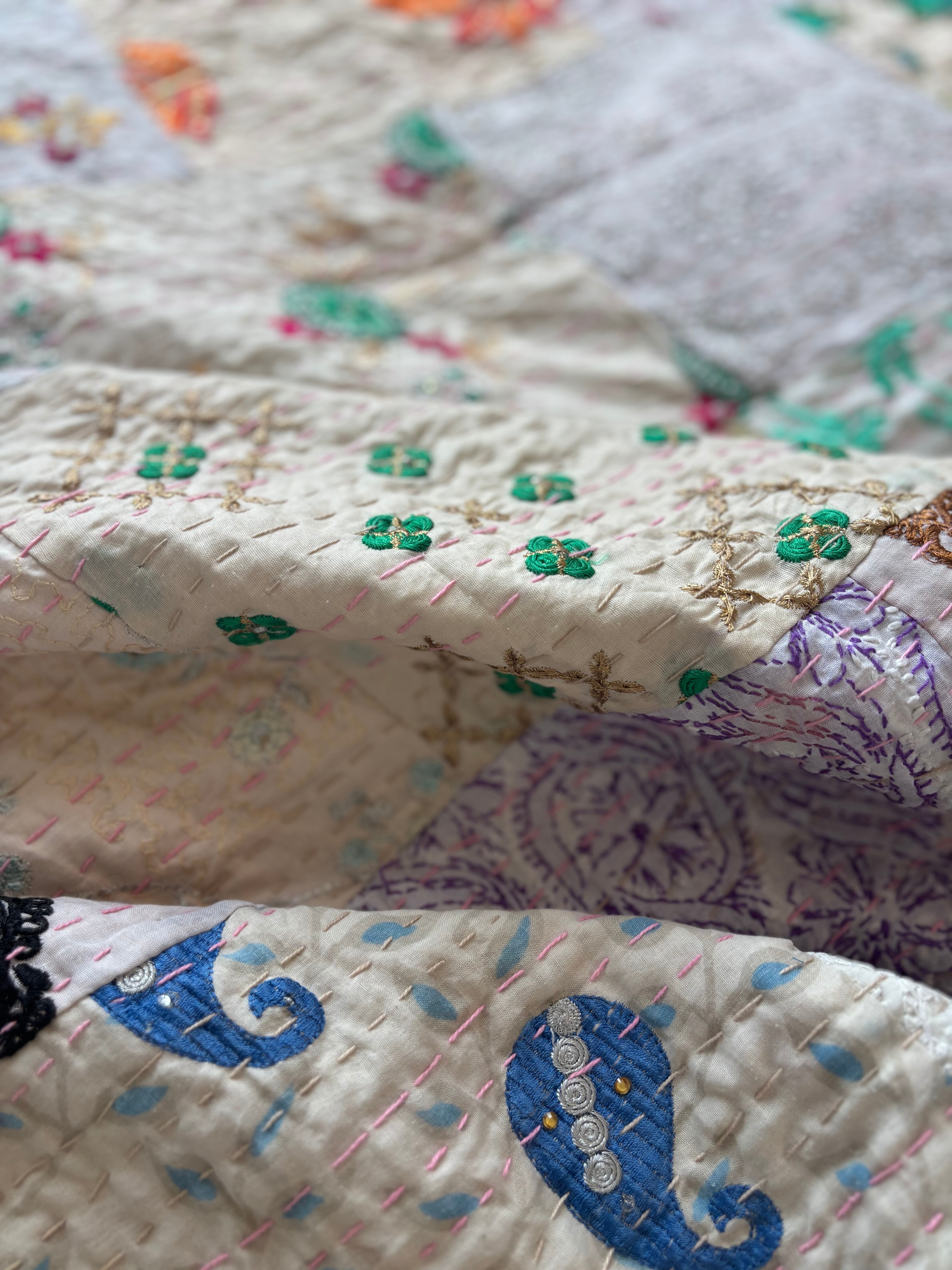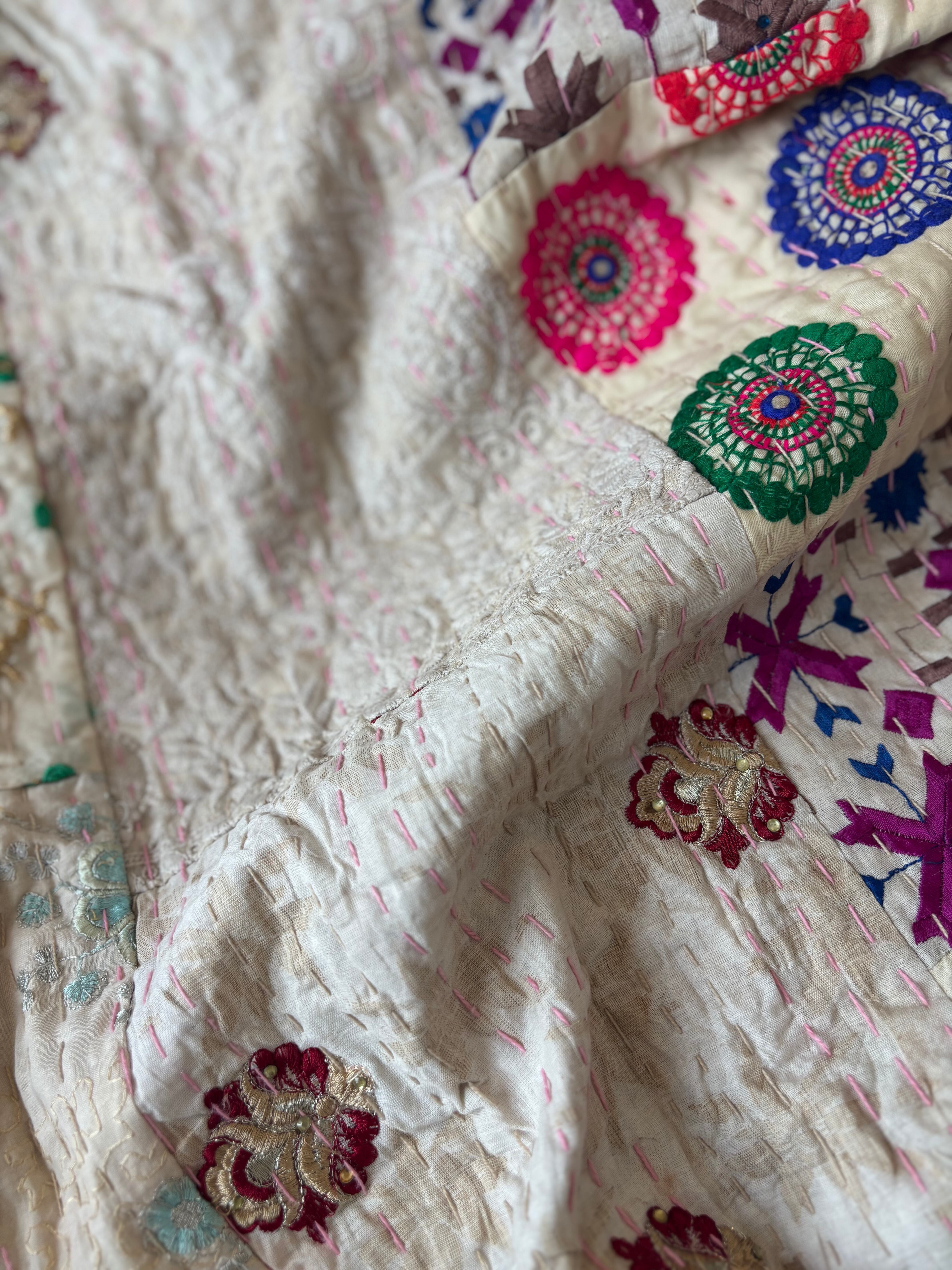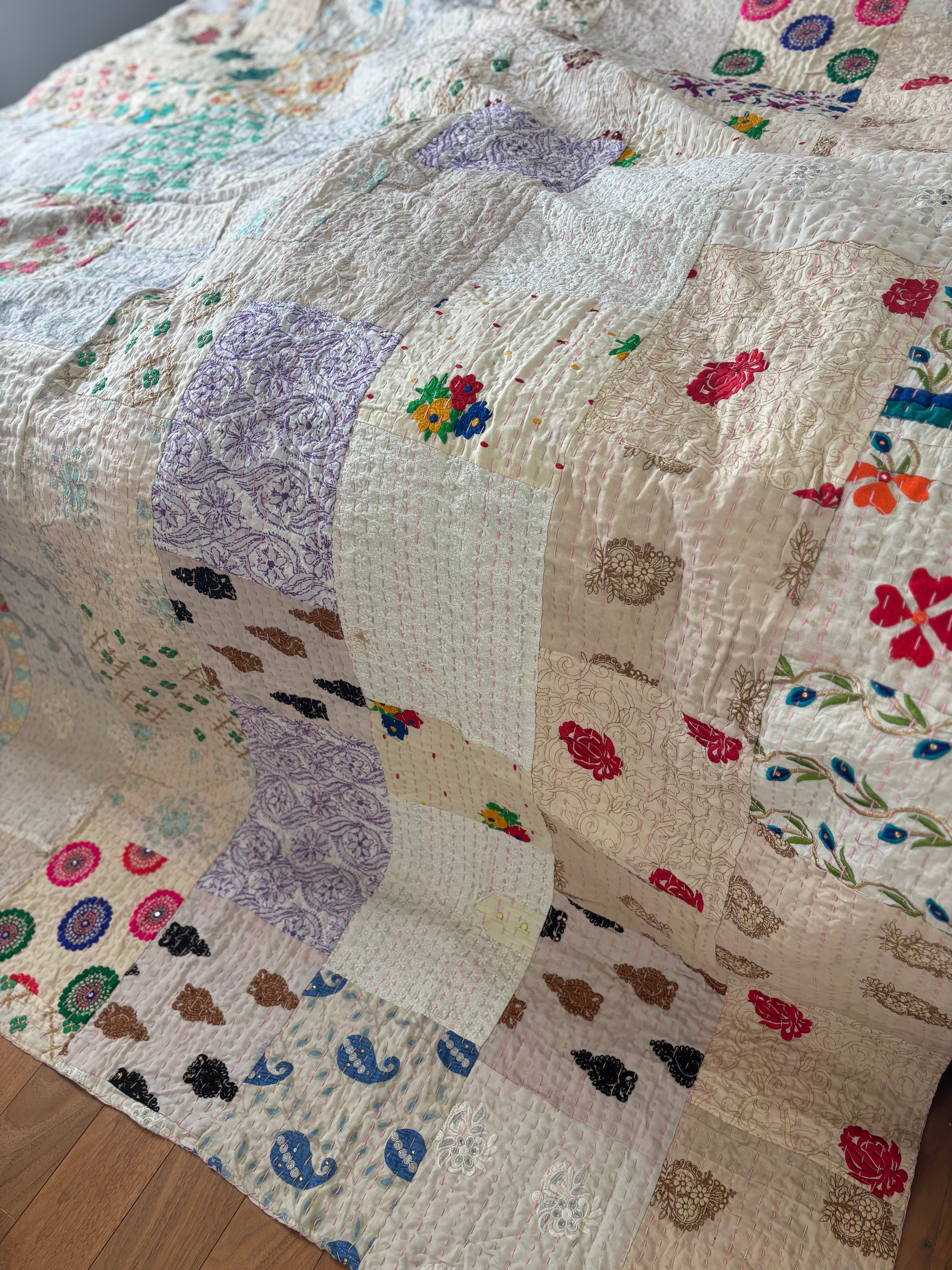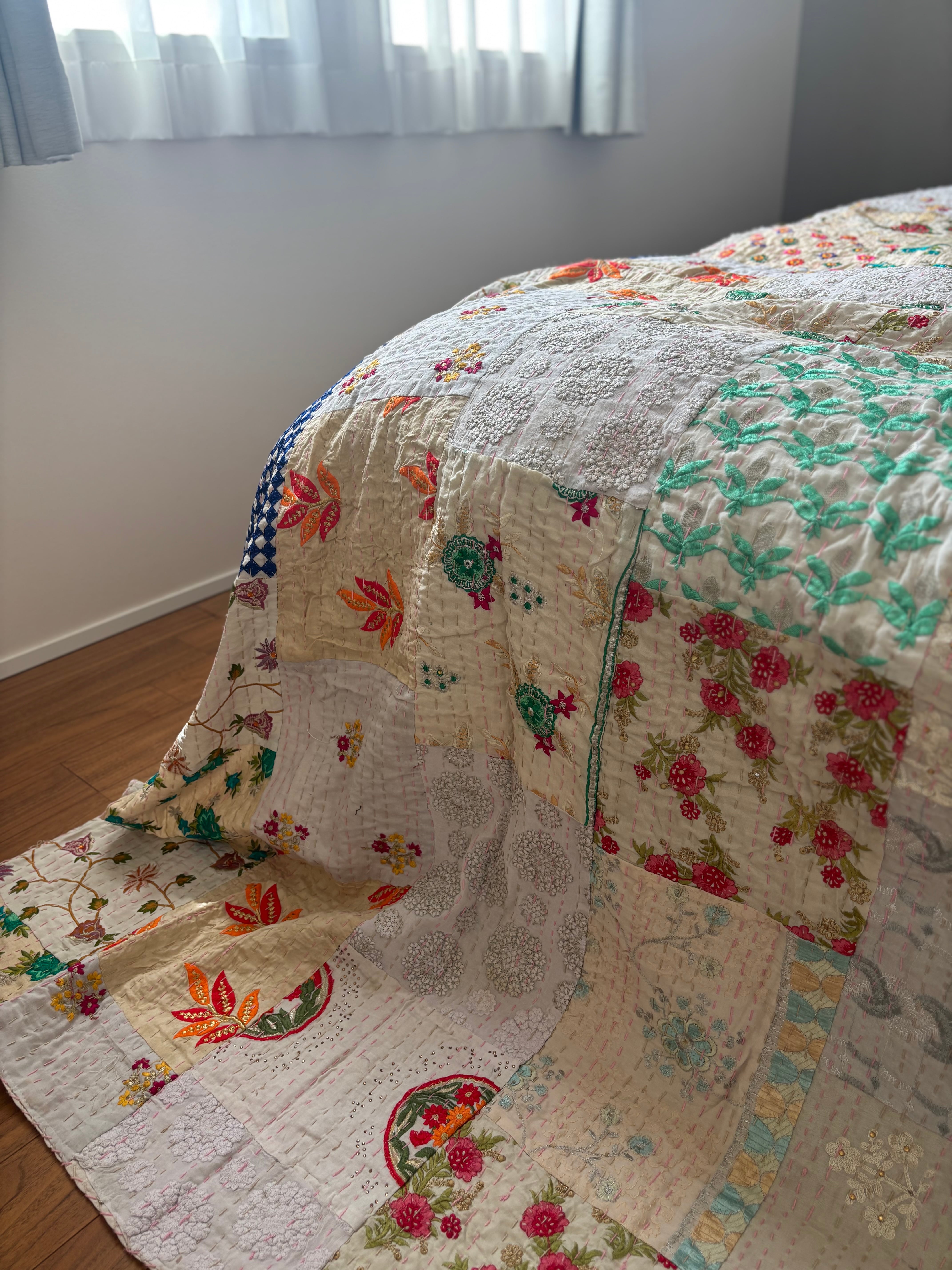 【L】アイボリーA カンバディアキルト(ダブルサイズ) インド刺繍パッチワーク