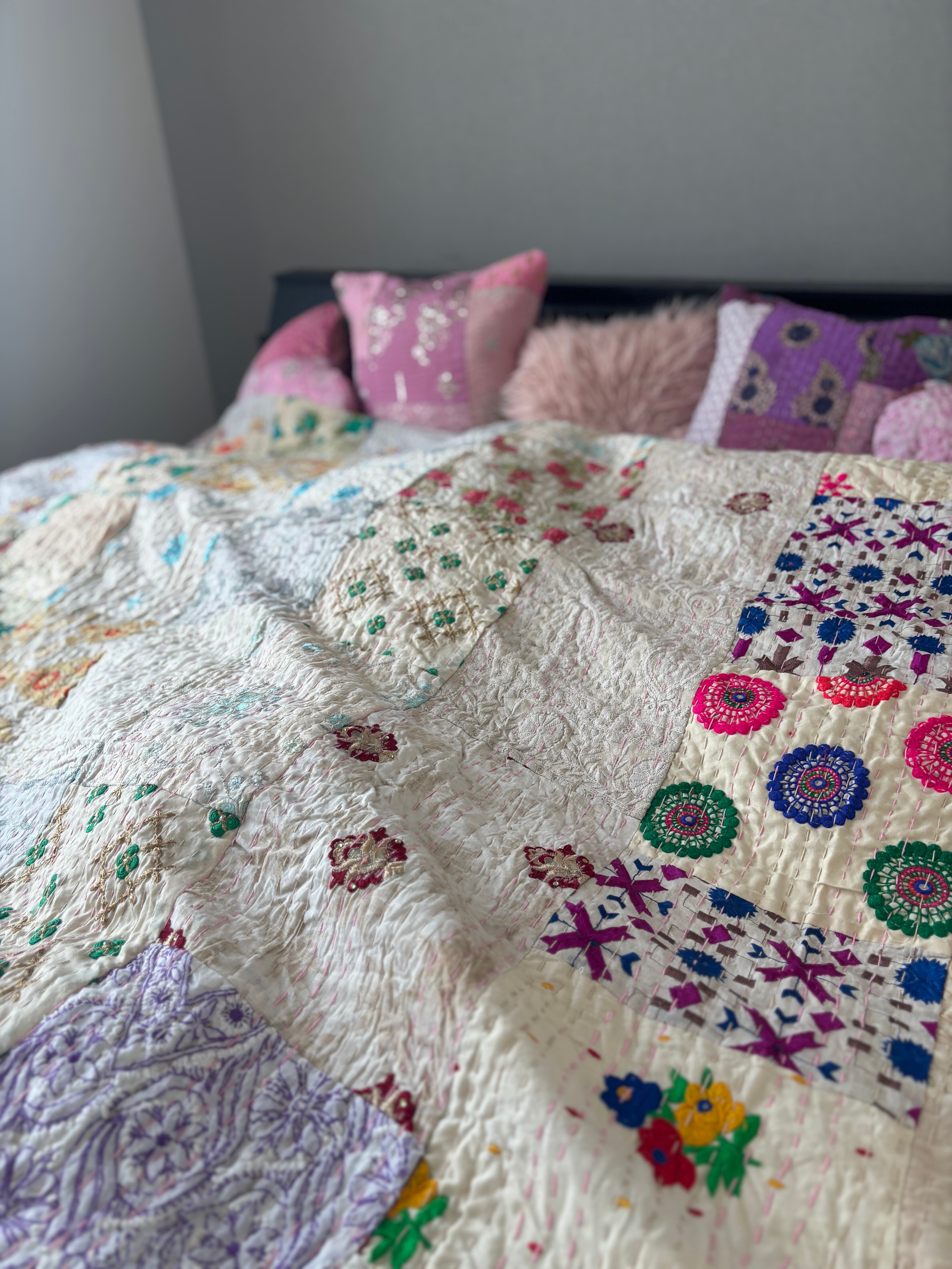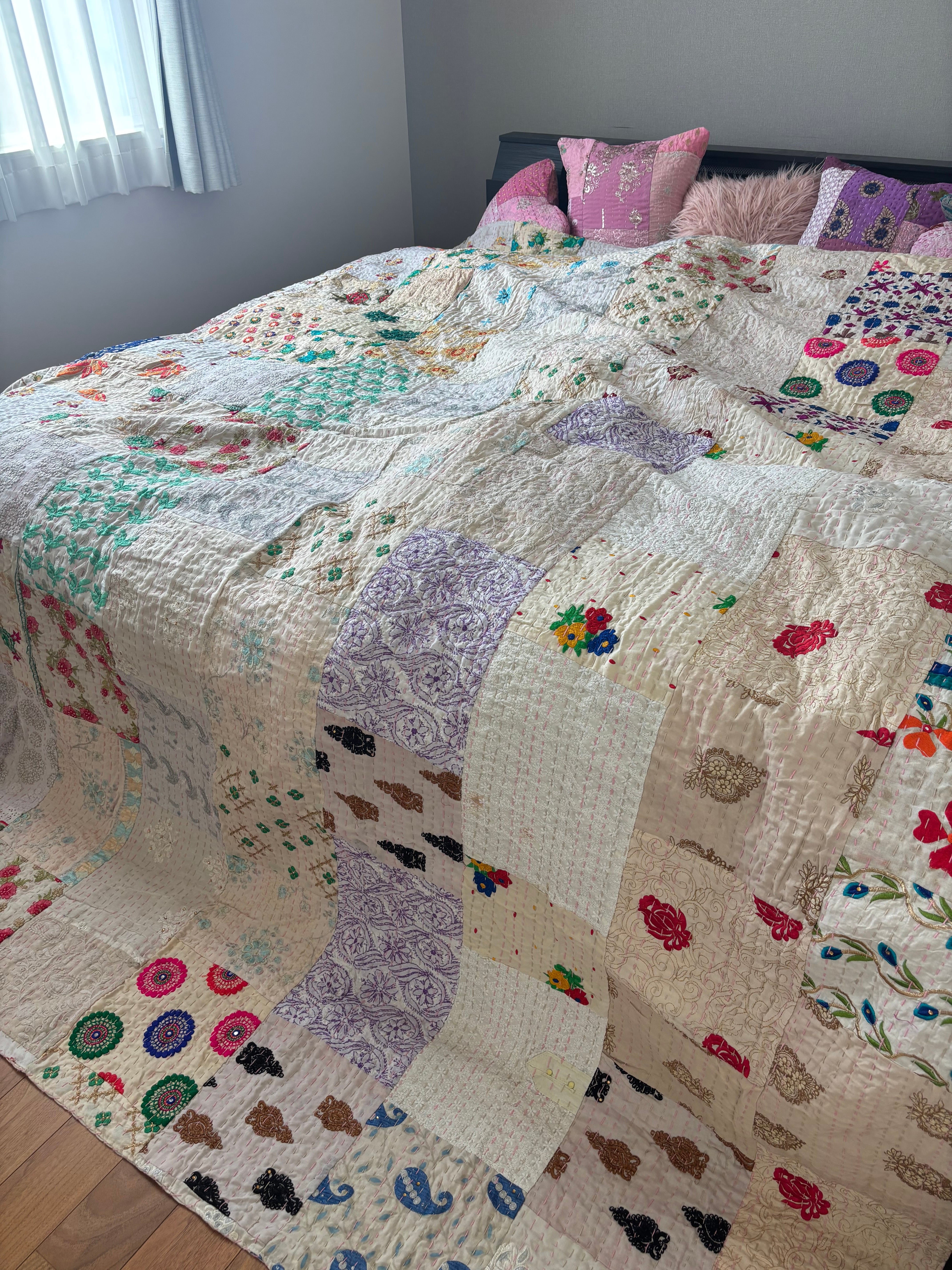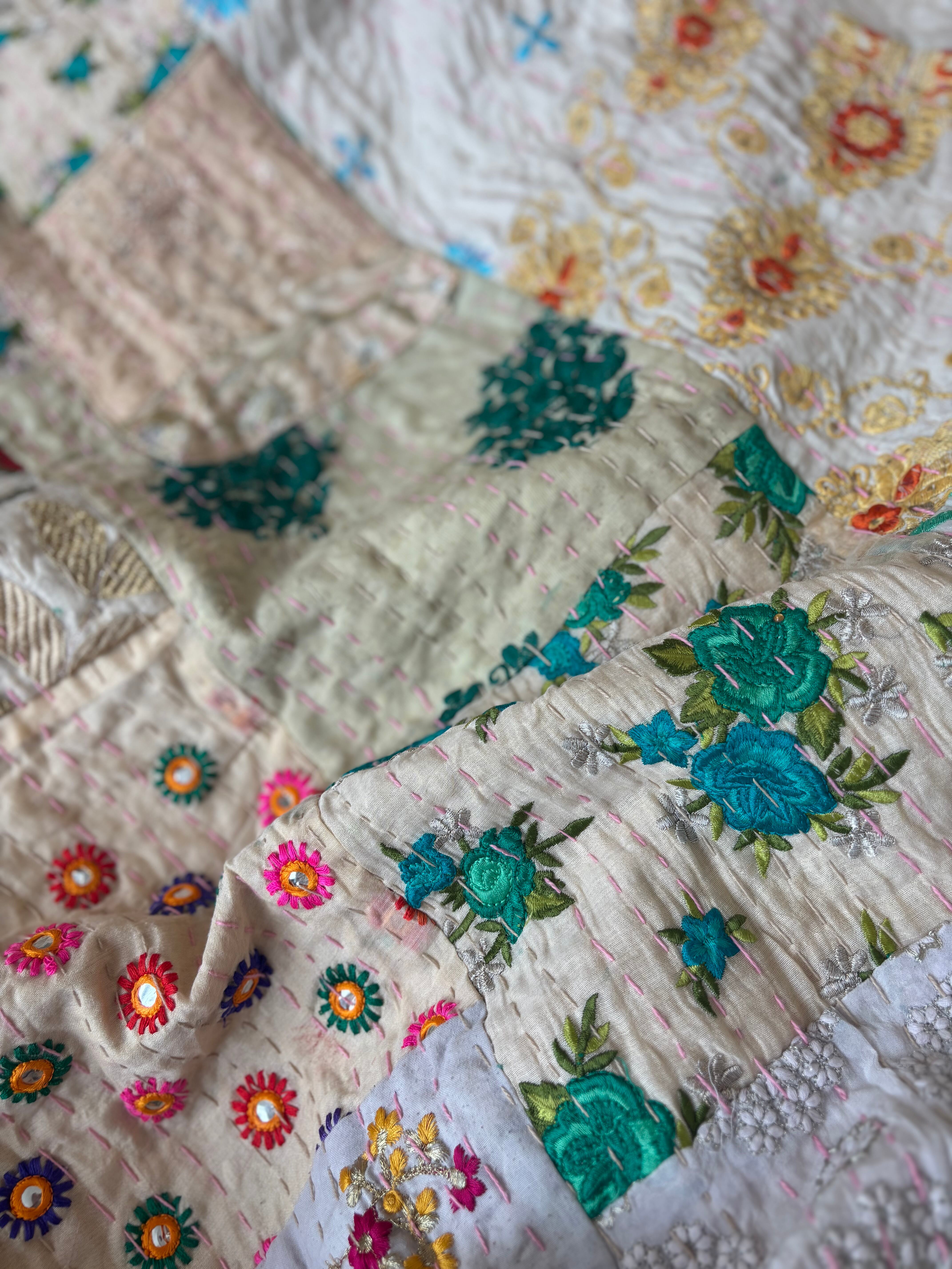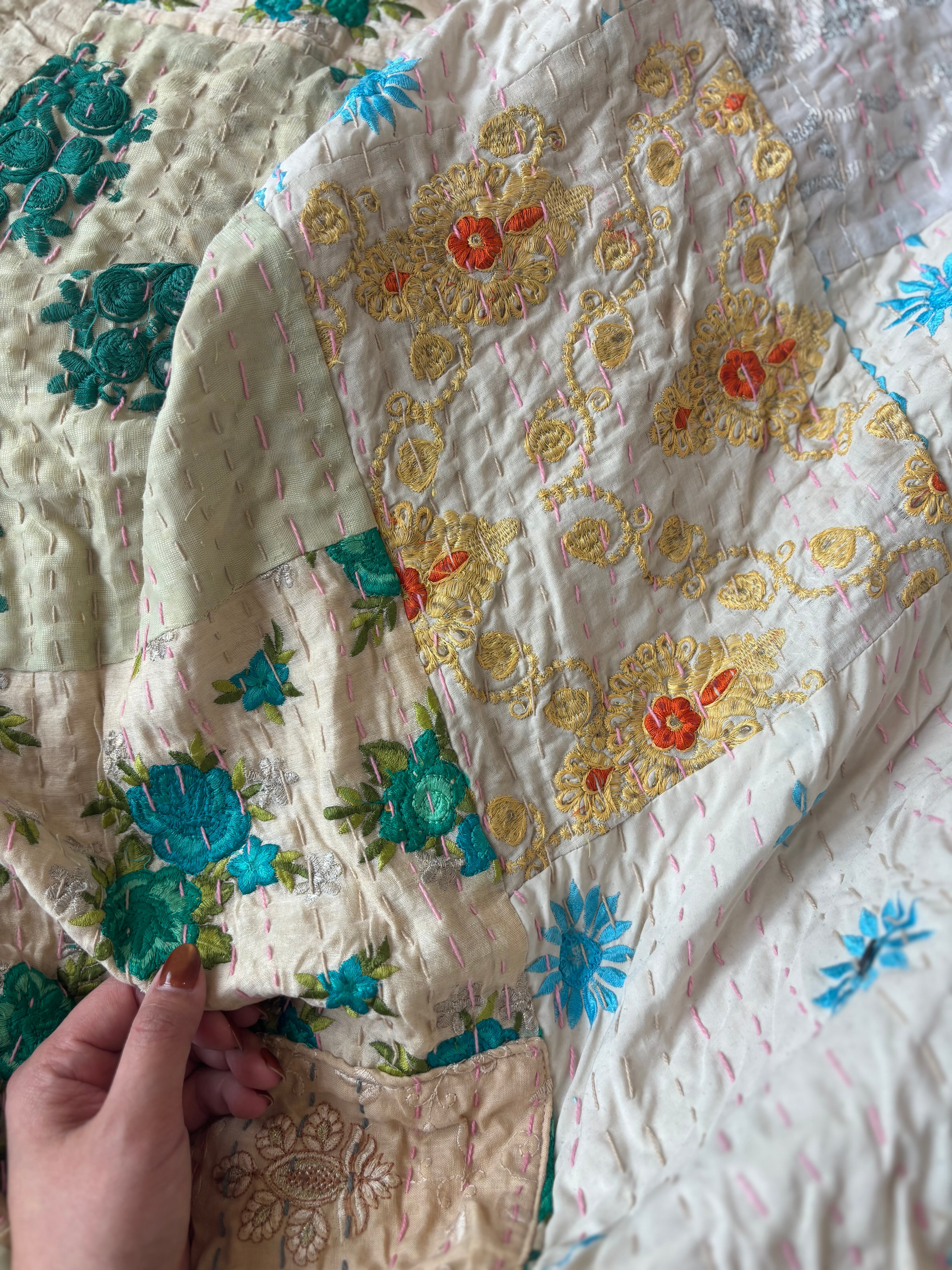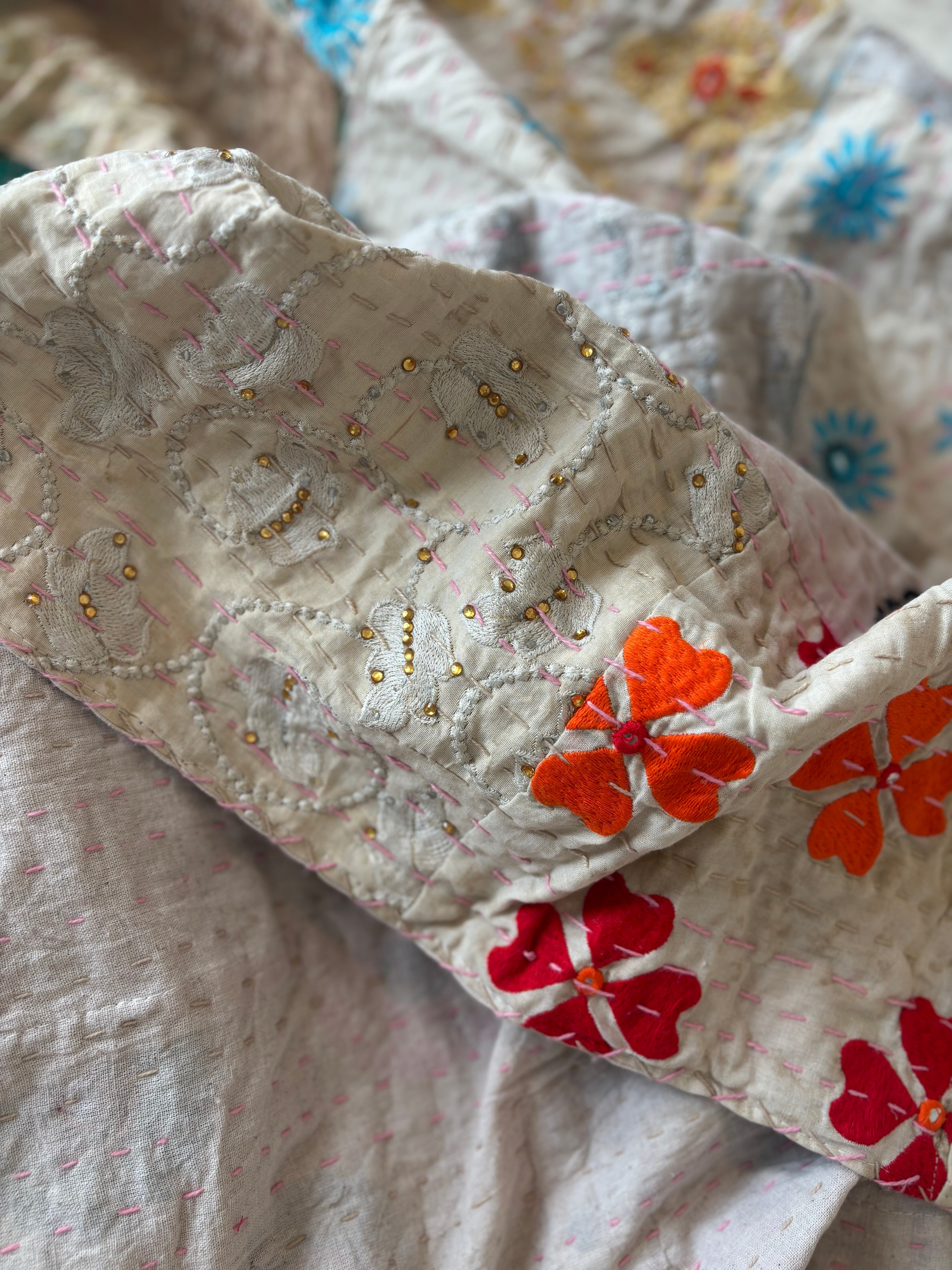 【L】アイボリーA カンバディアキルト(ダブルサイズ) インド刺繍パッチワーク