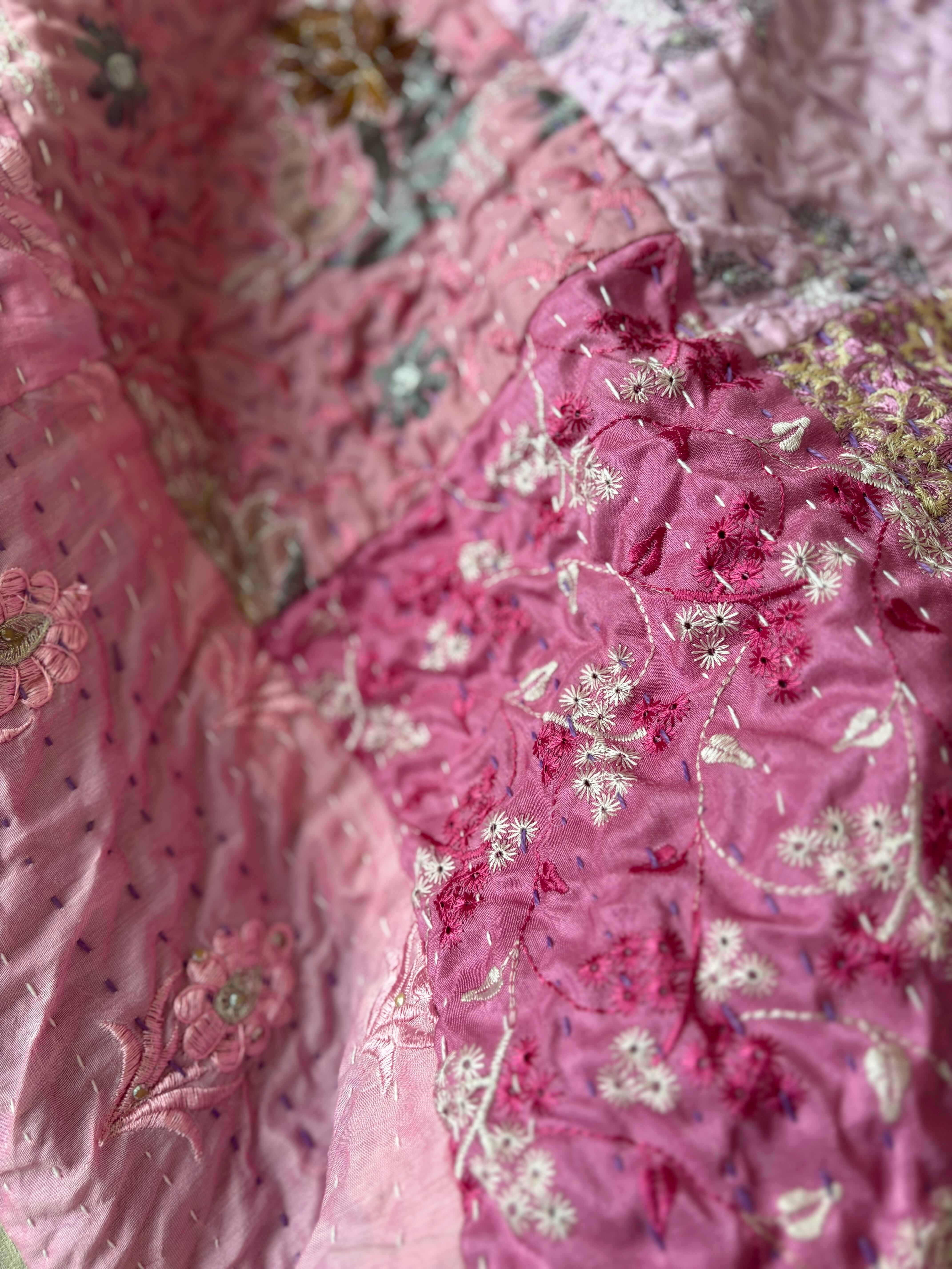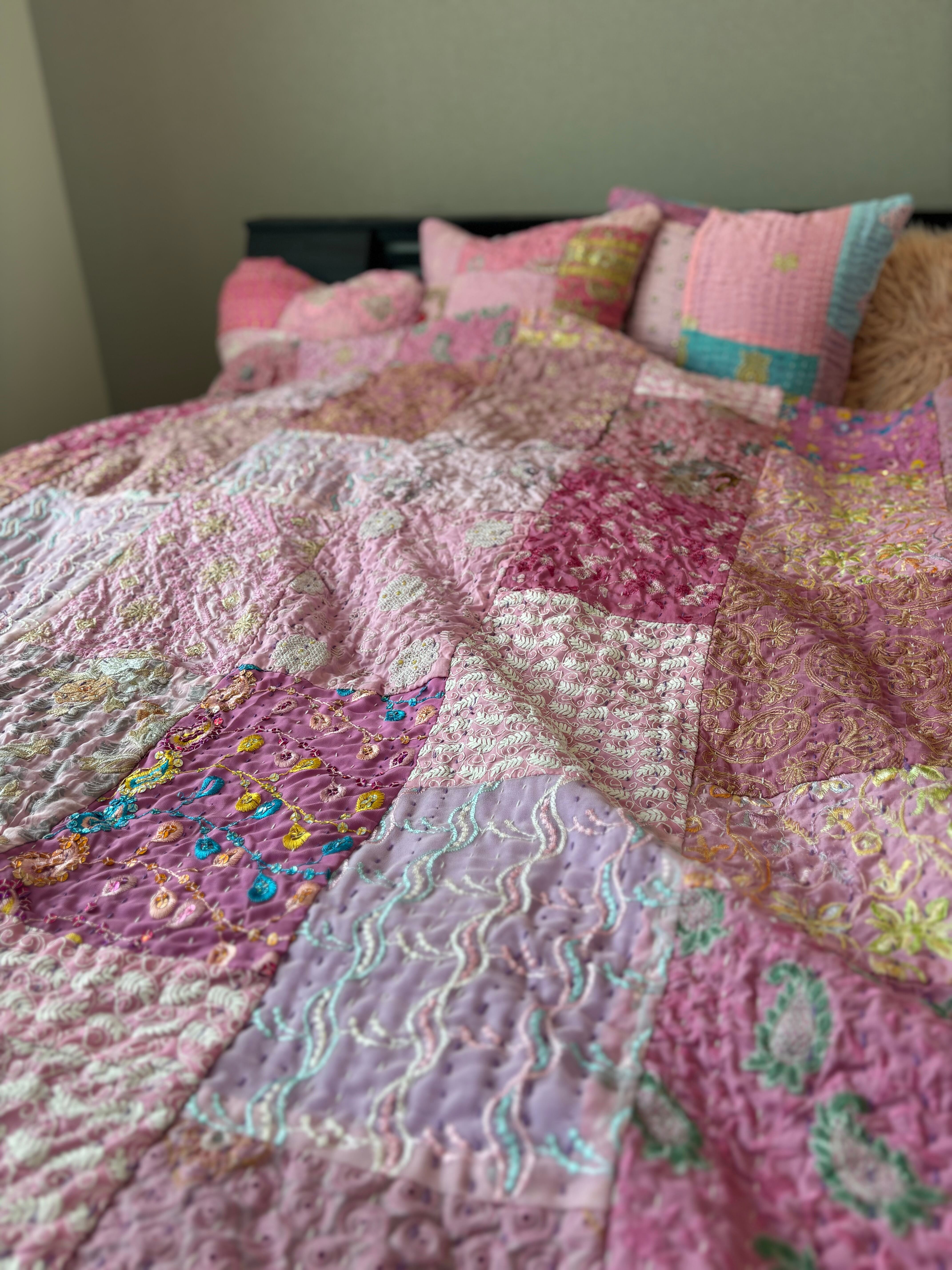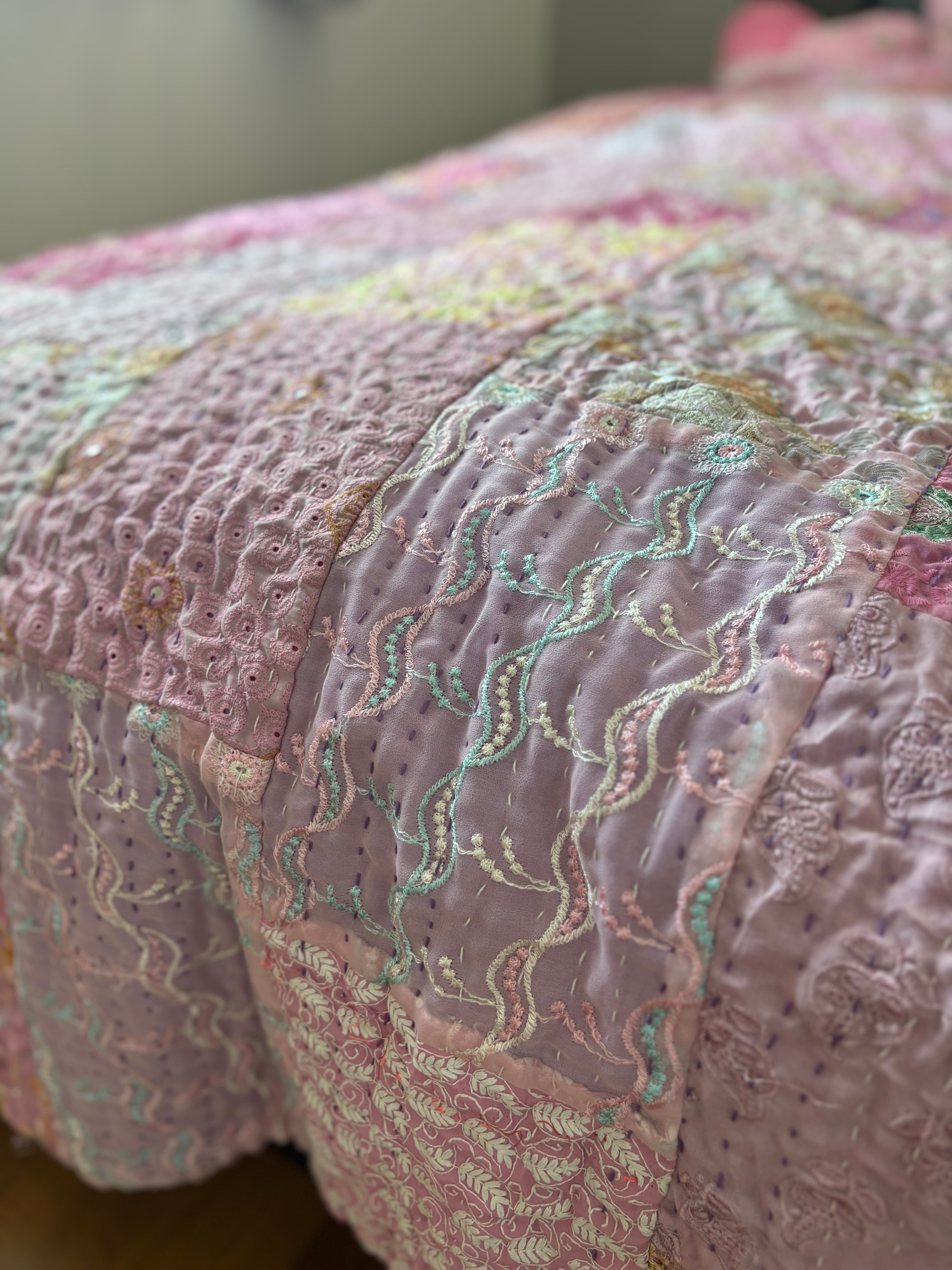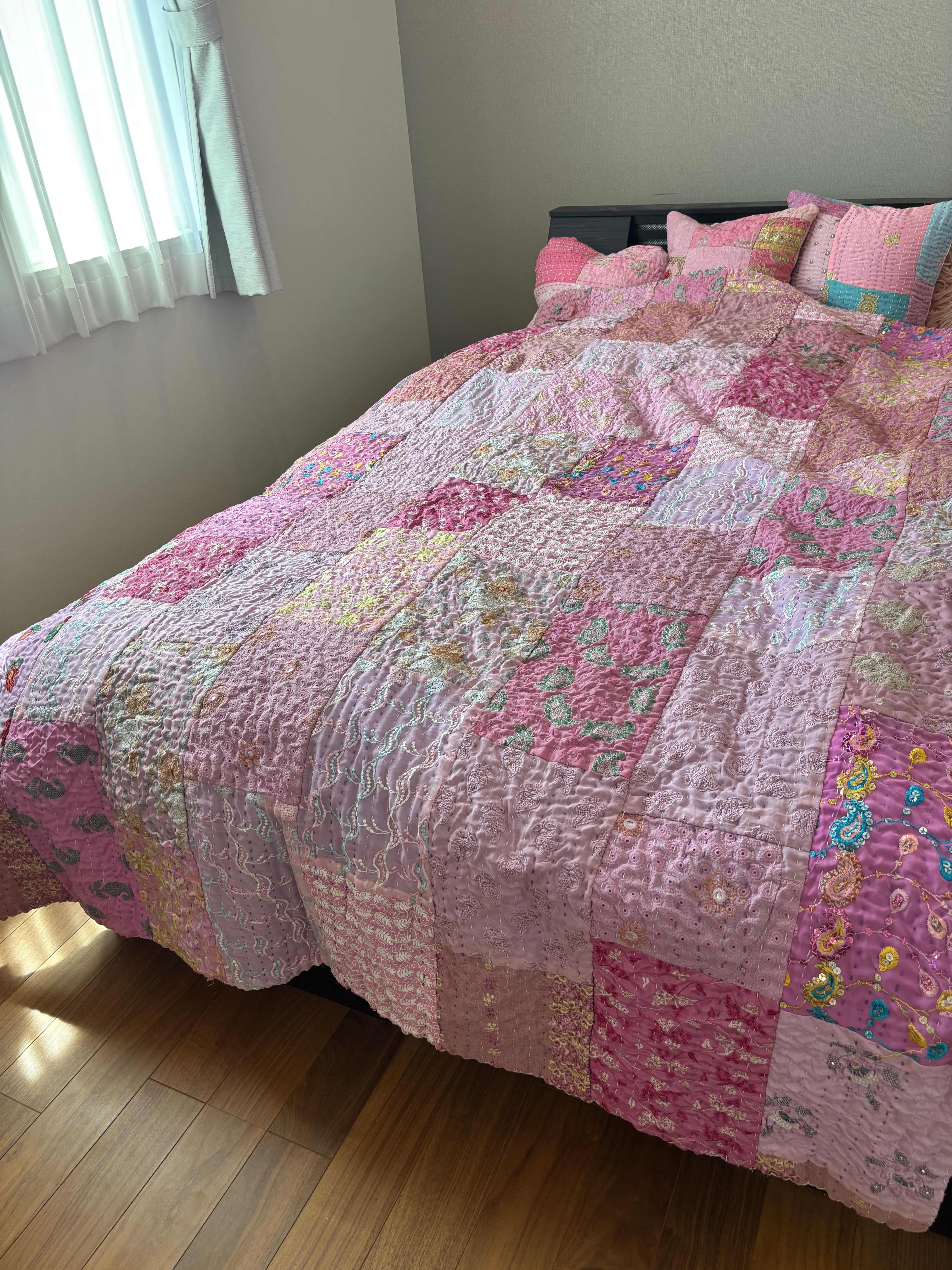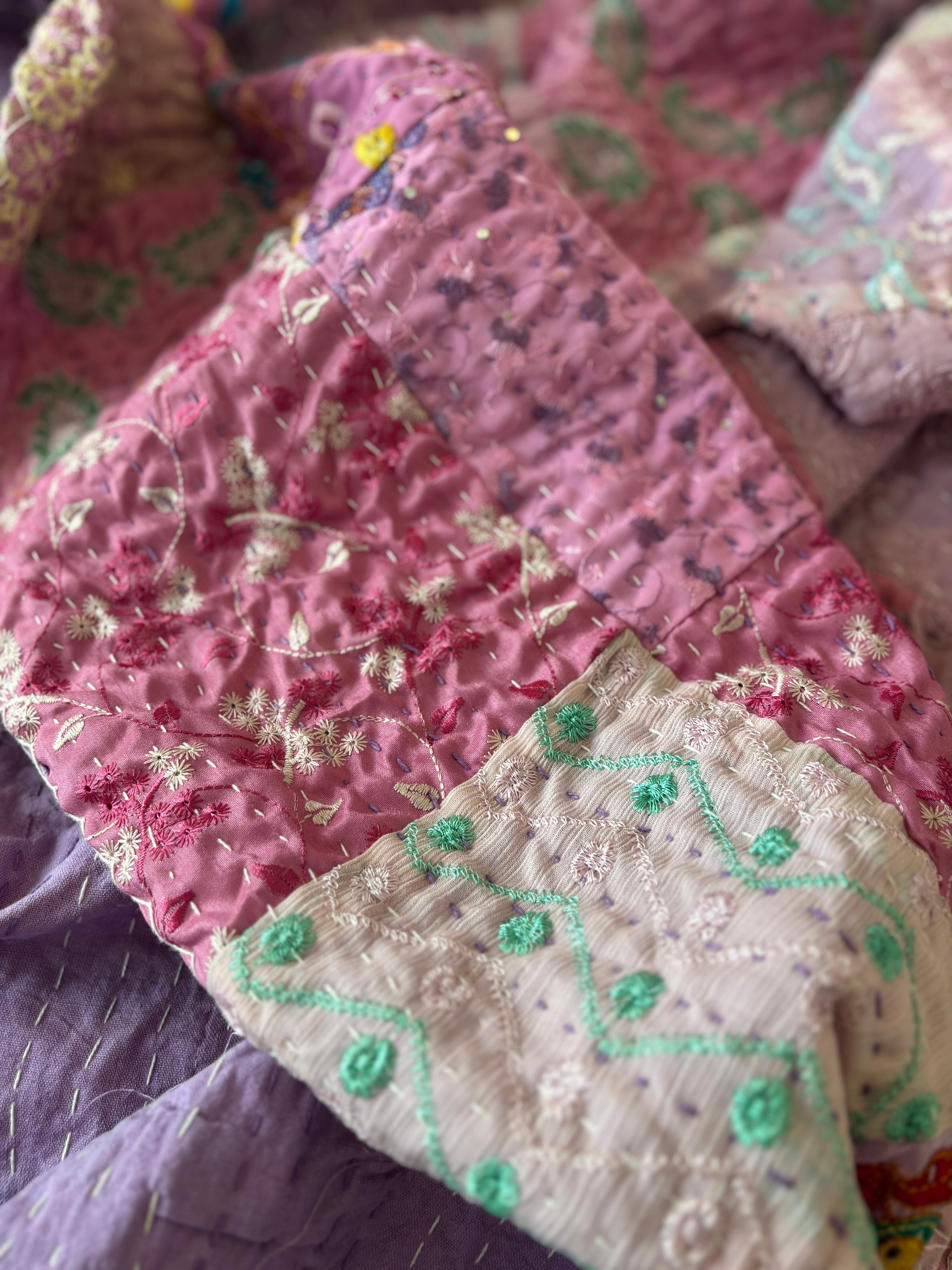 【M】ラベンダーC カンバディアキルト(シングルサイズ) インド刺繍パッチワーク