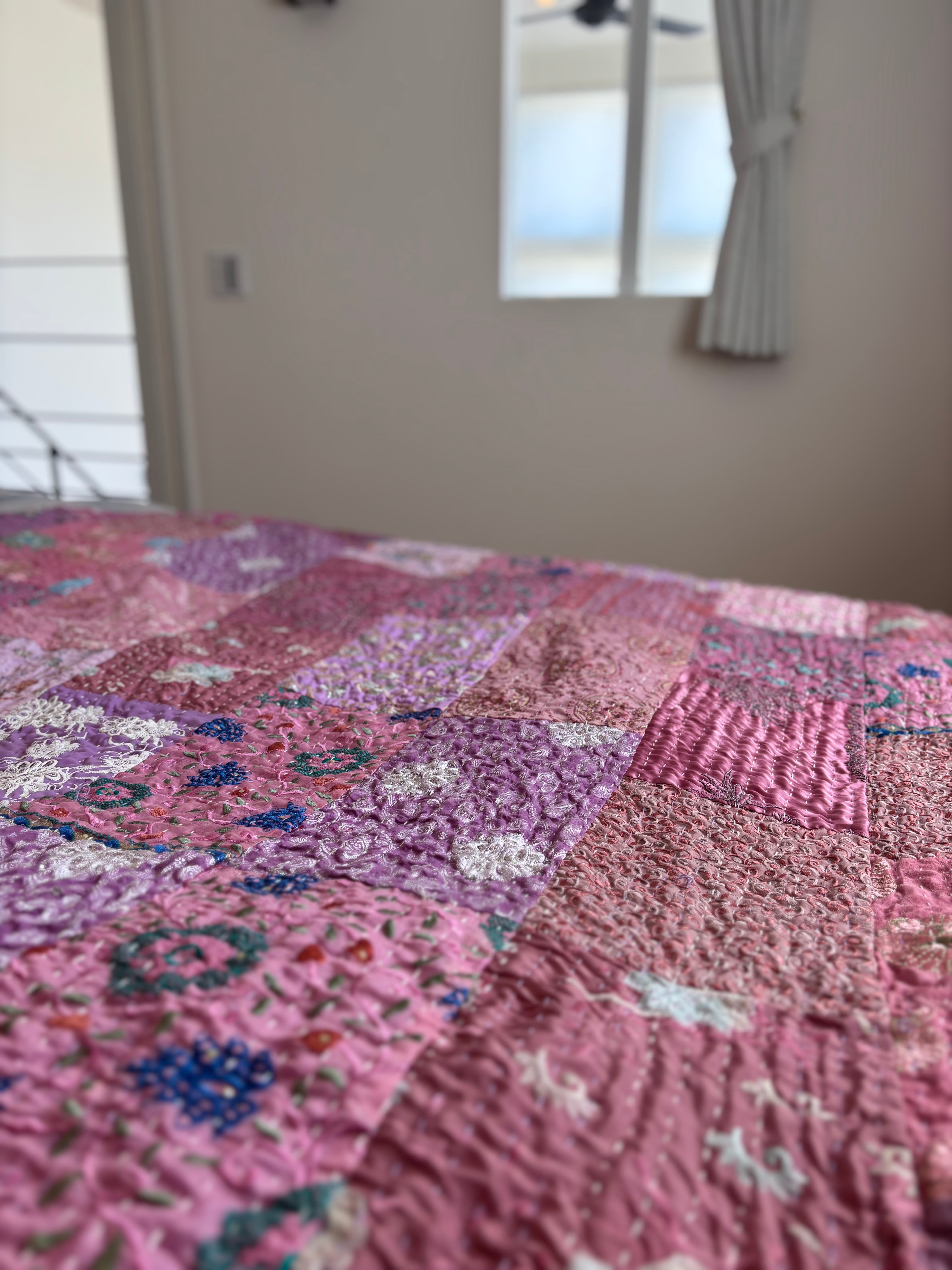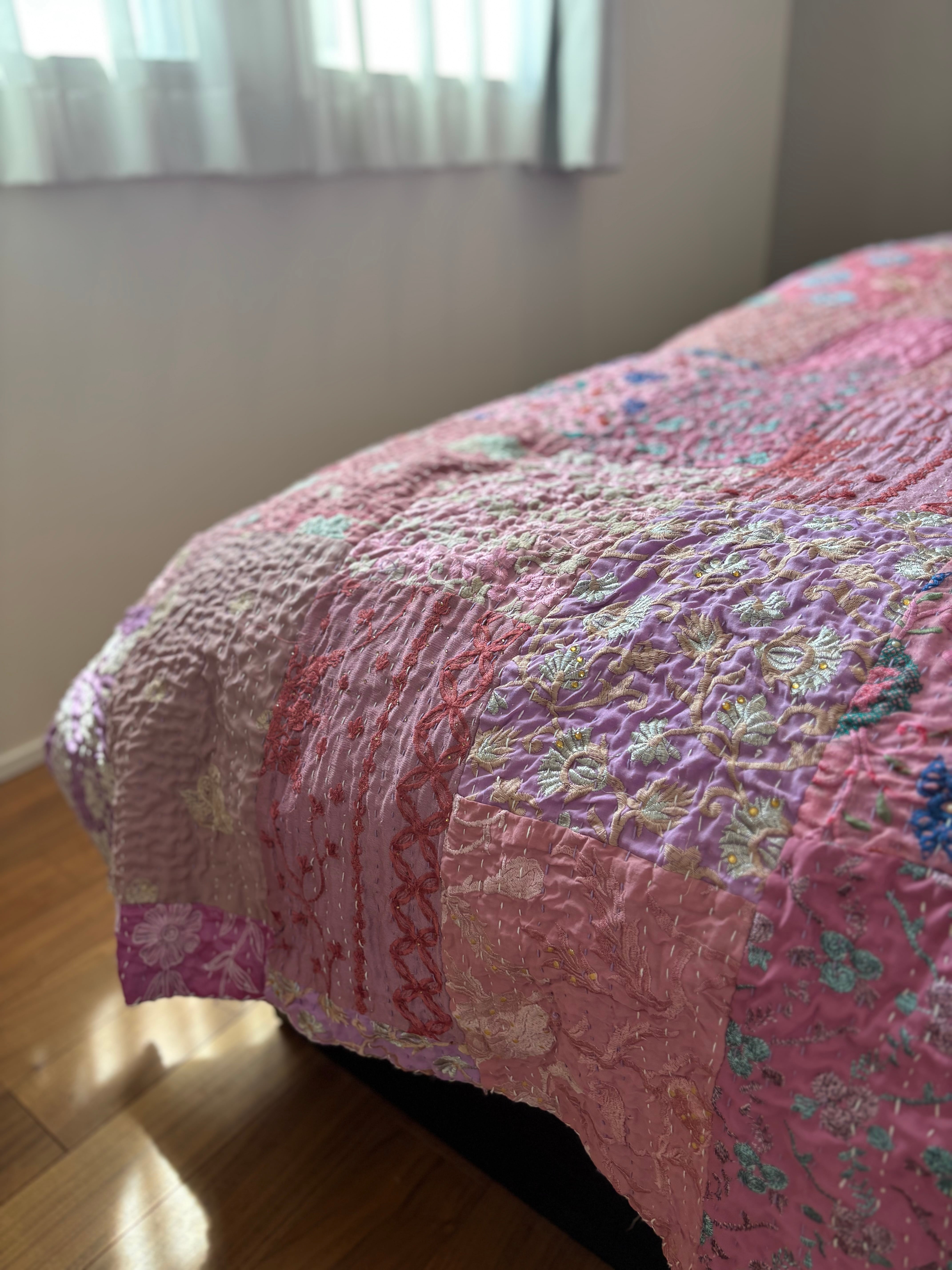 【M】ラベンダーB カンバディアキルト(シングルサイズ) インド刺繍パッチワーク
