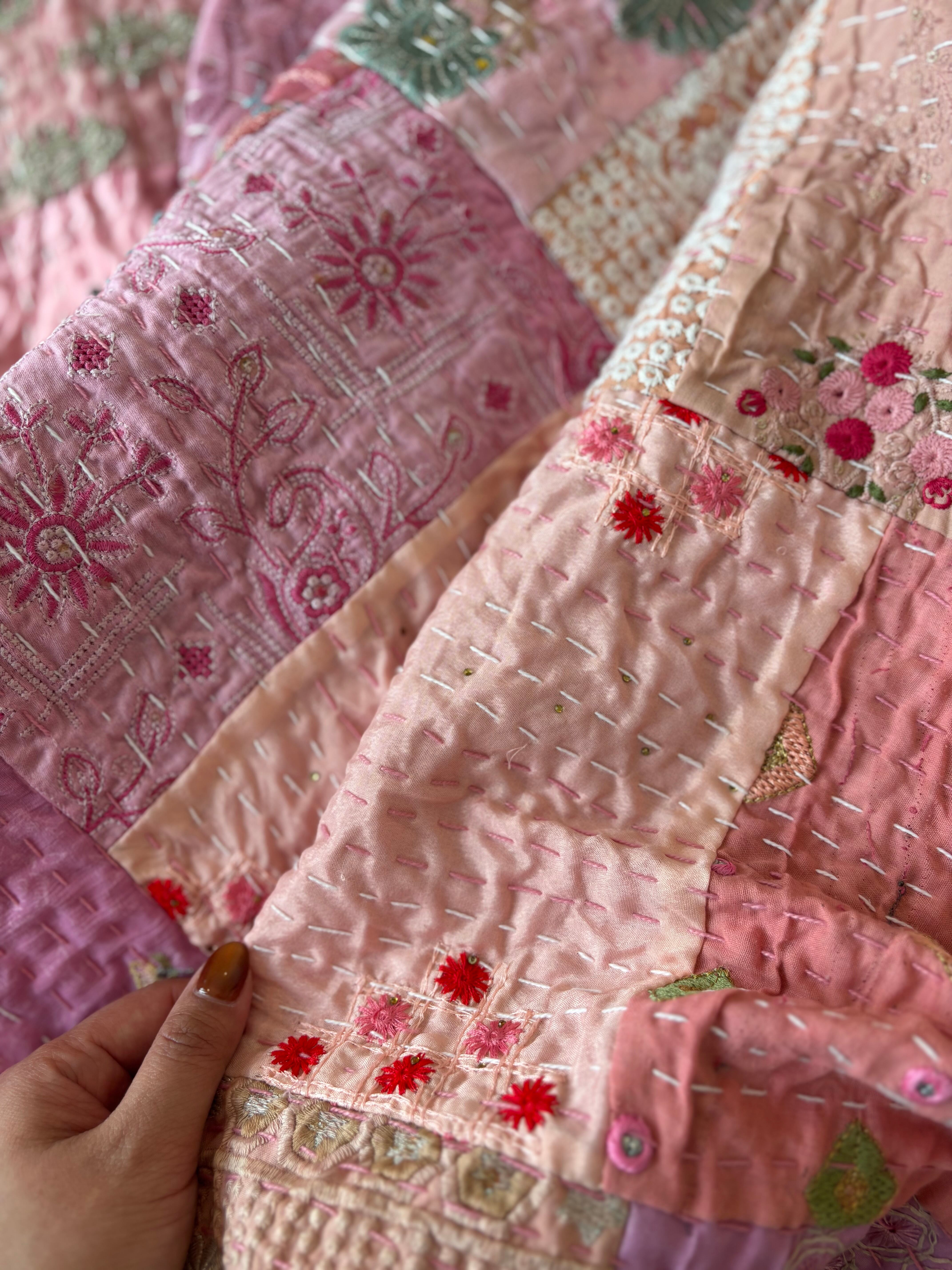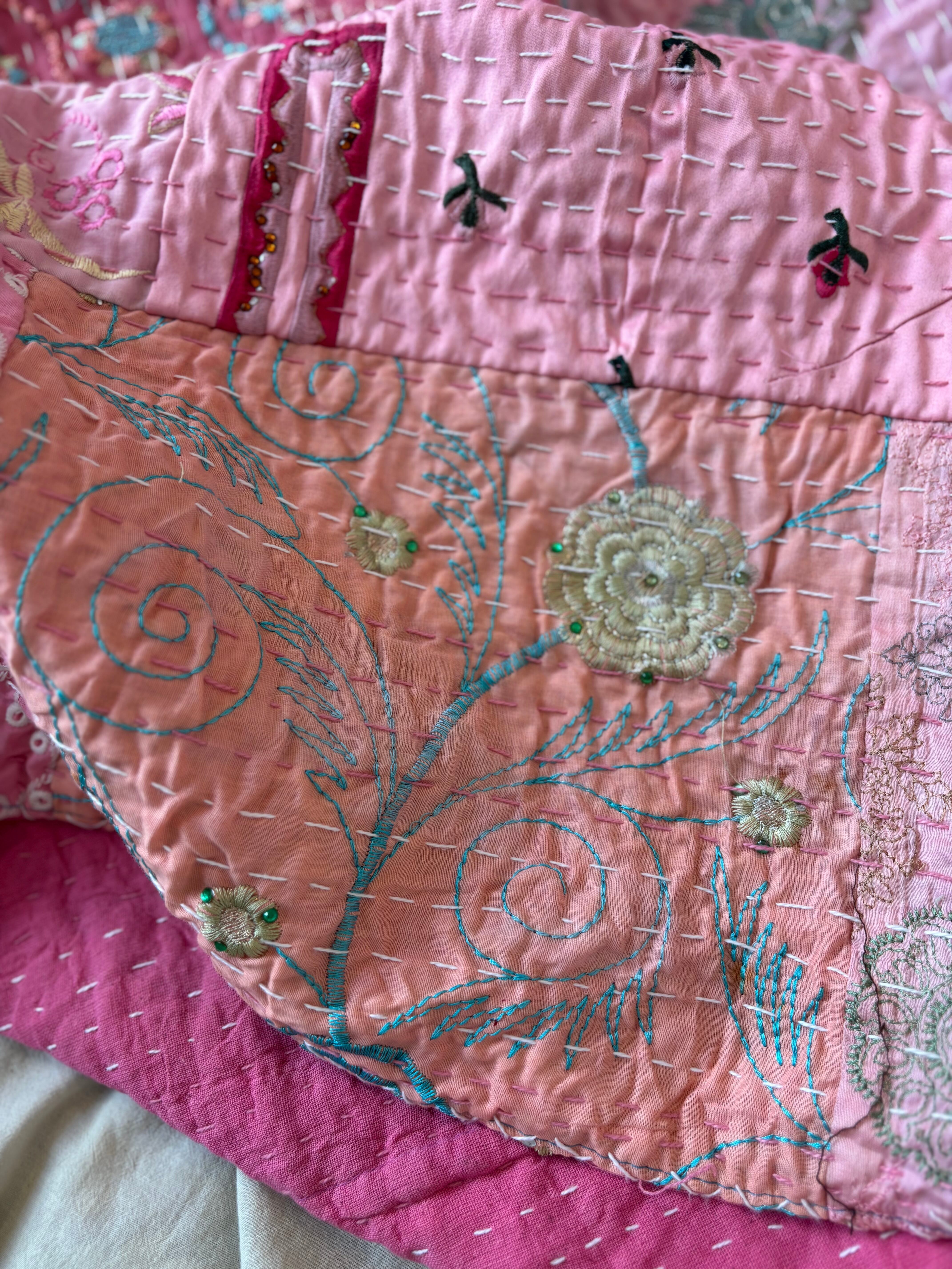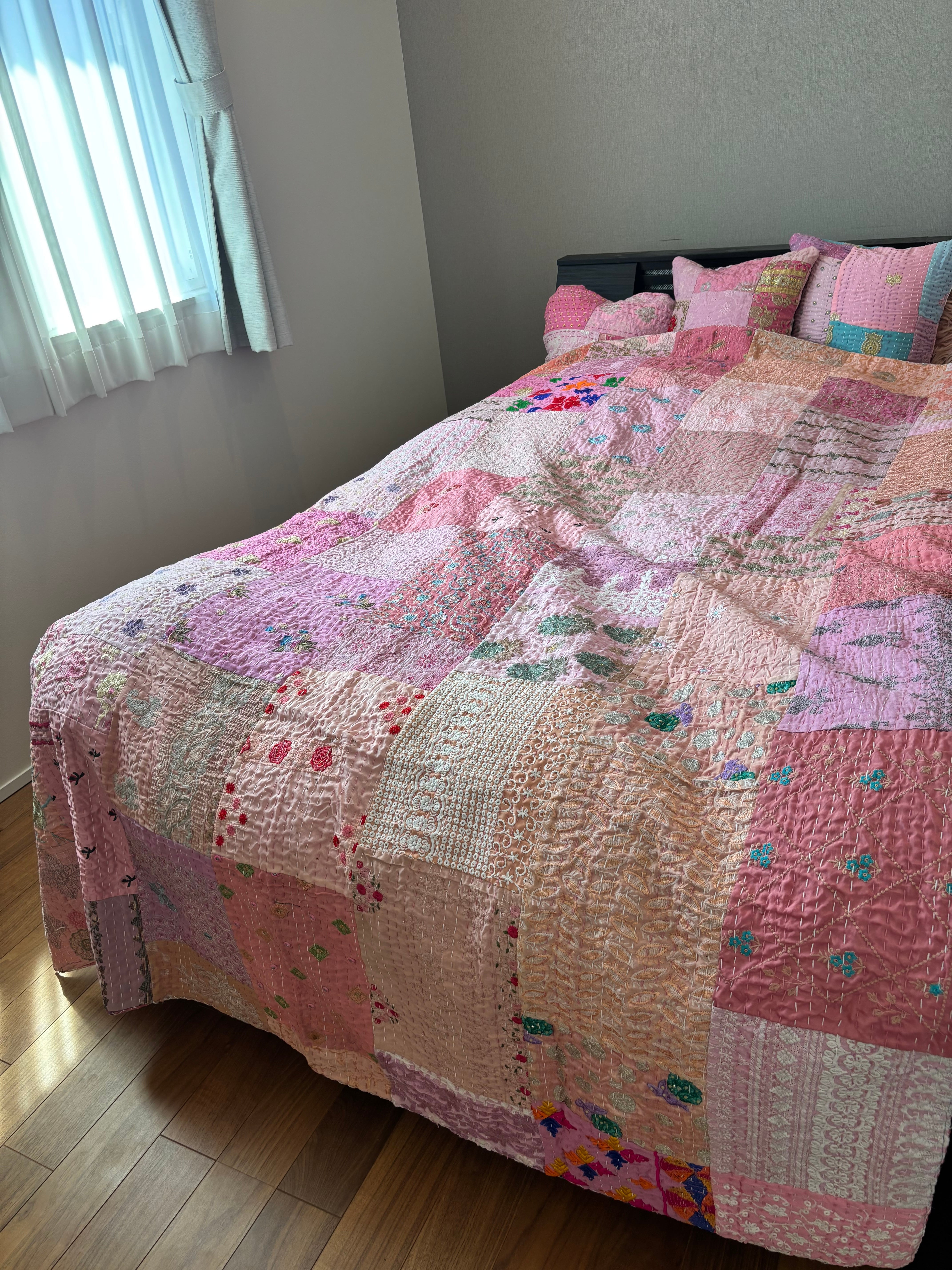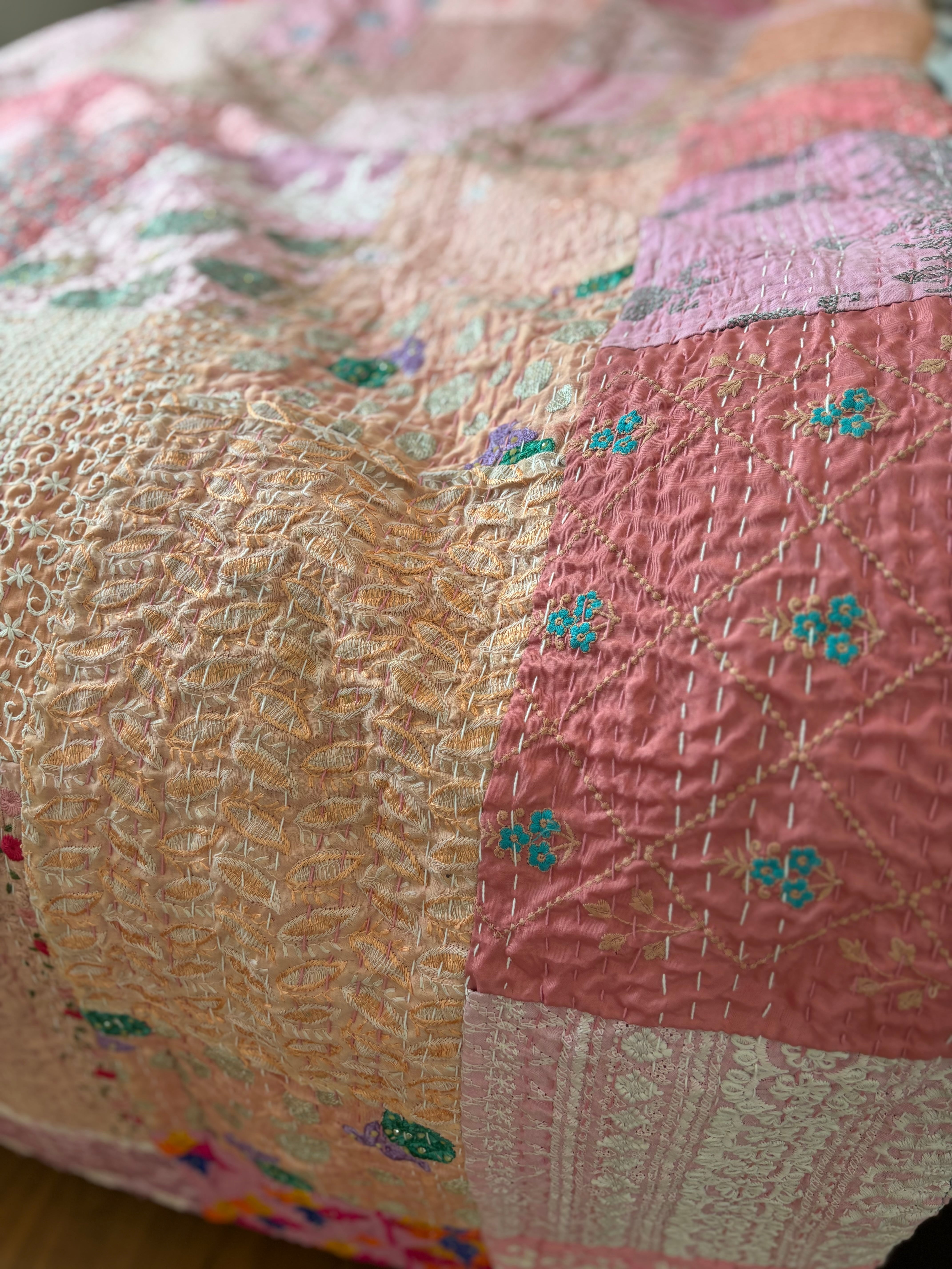【M】ベビーピンクC カンバディアキルト(シングルサイズ) インド刺繍パッチワーク
