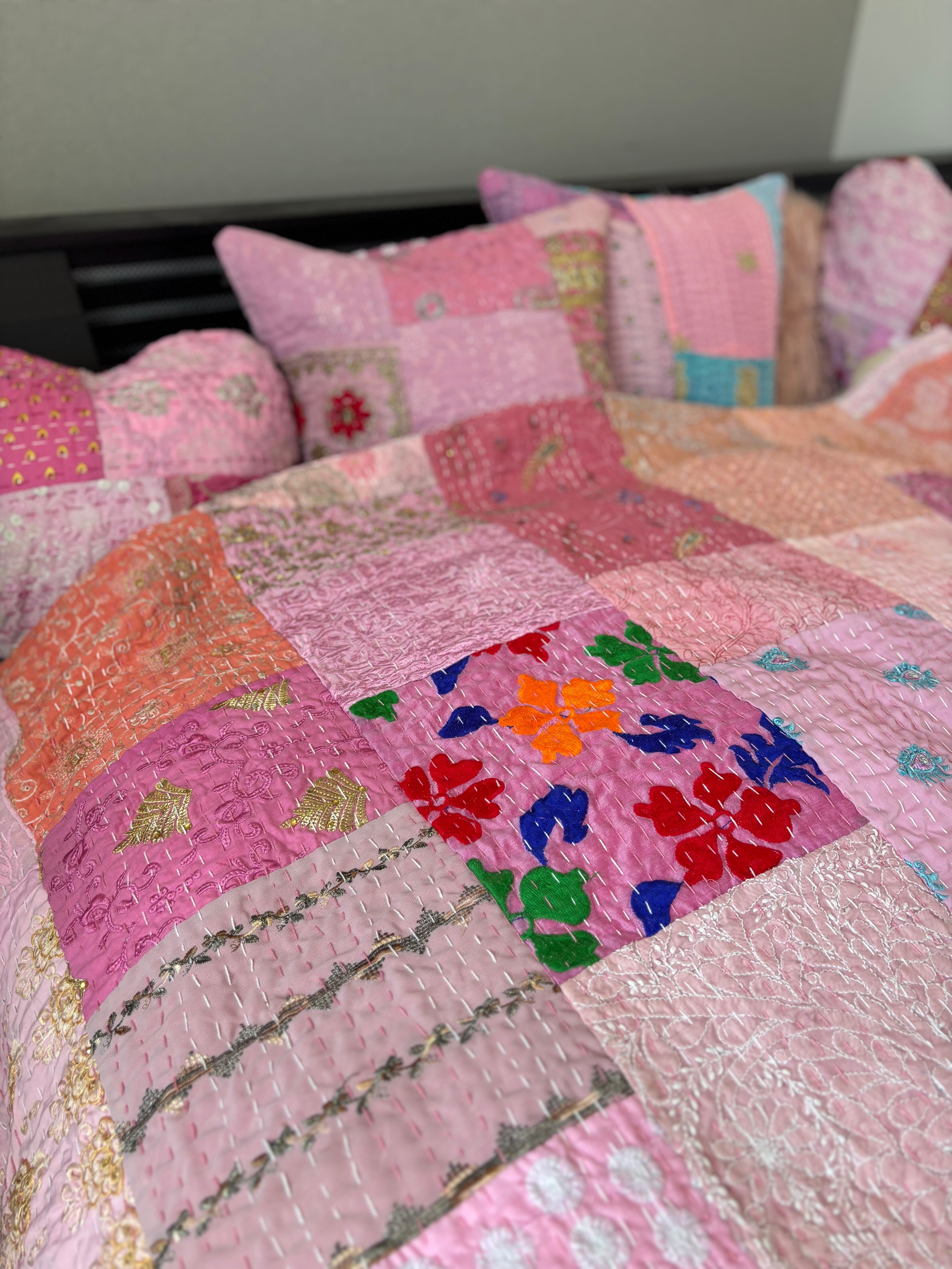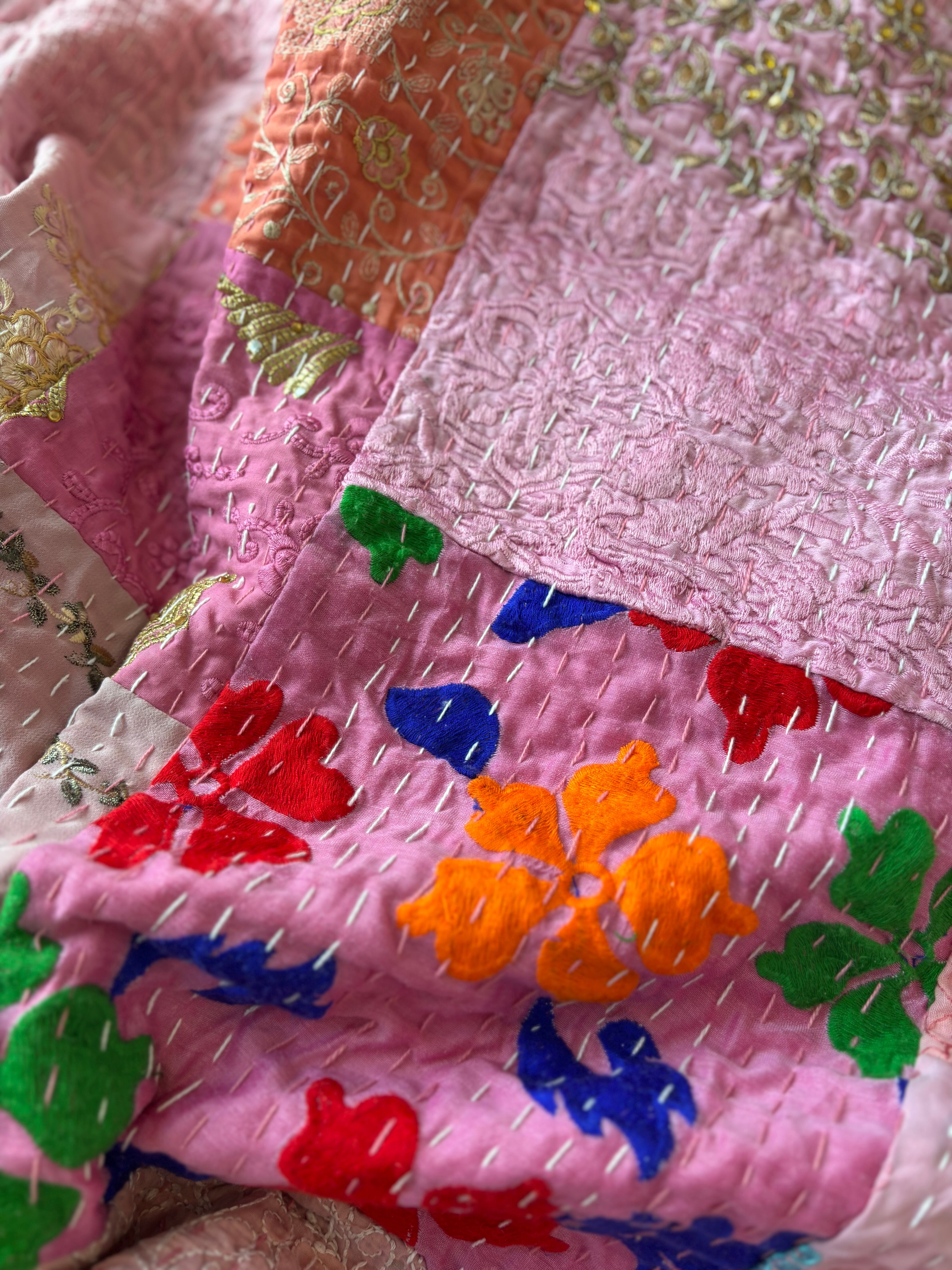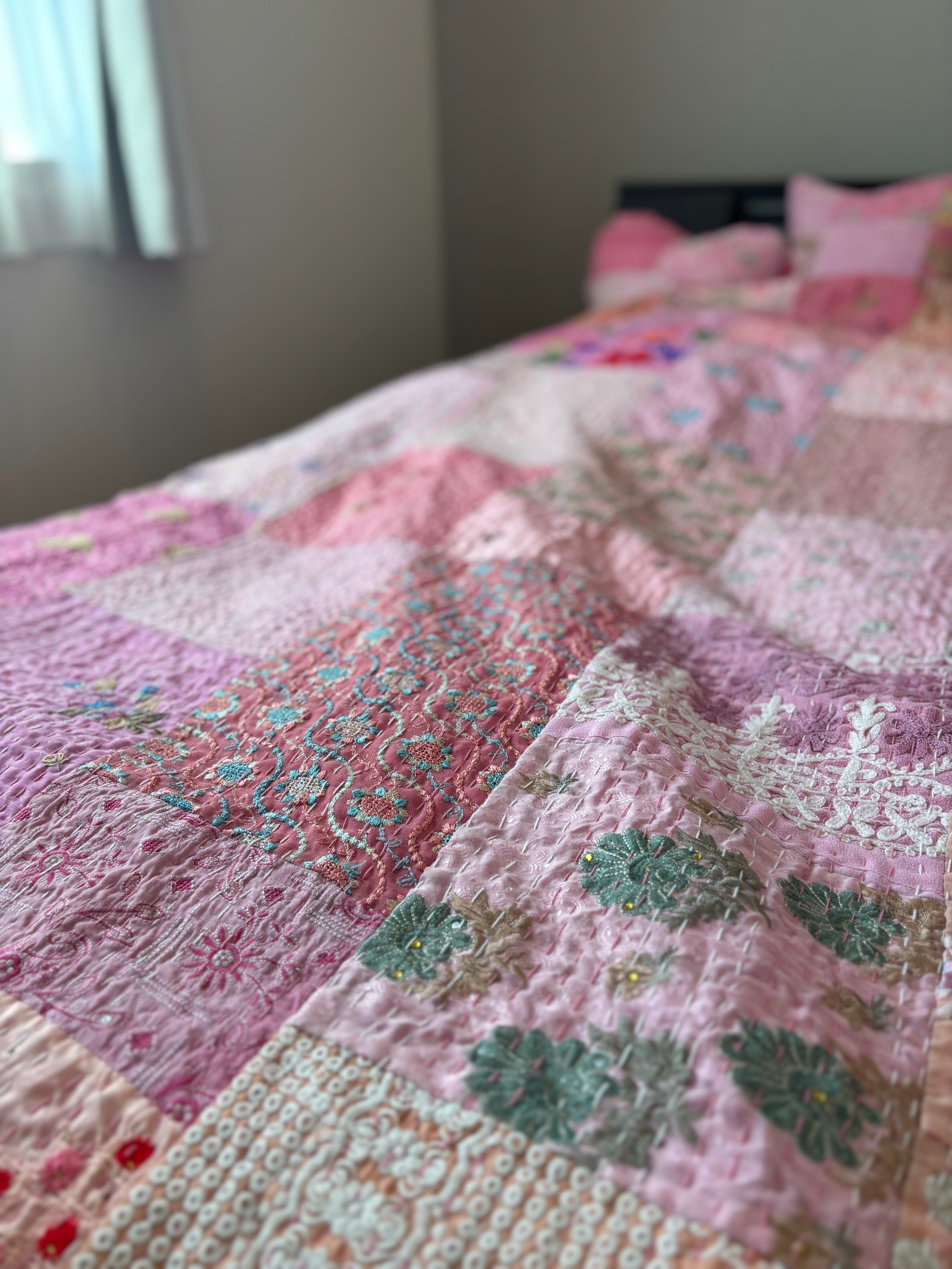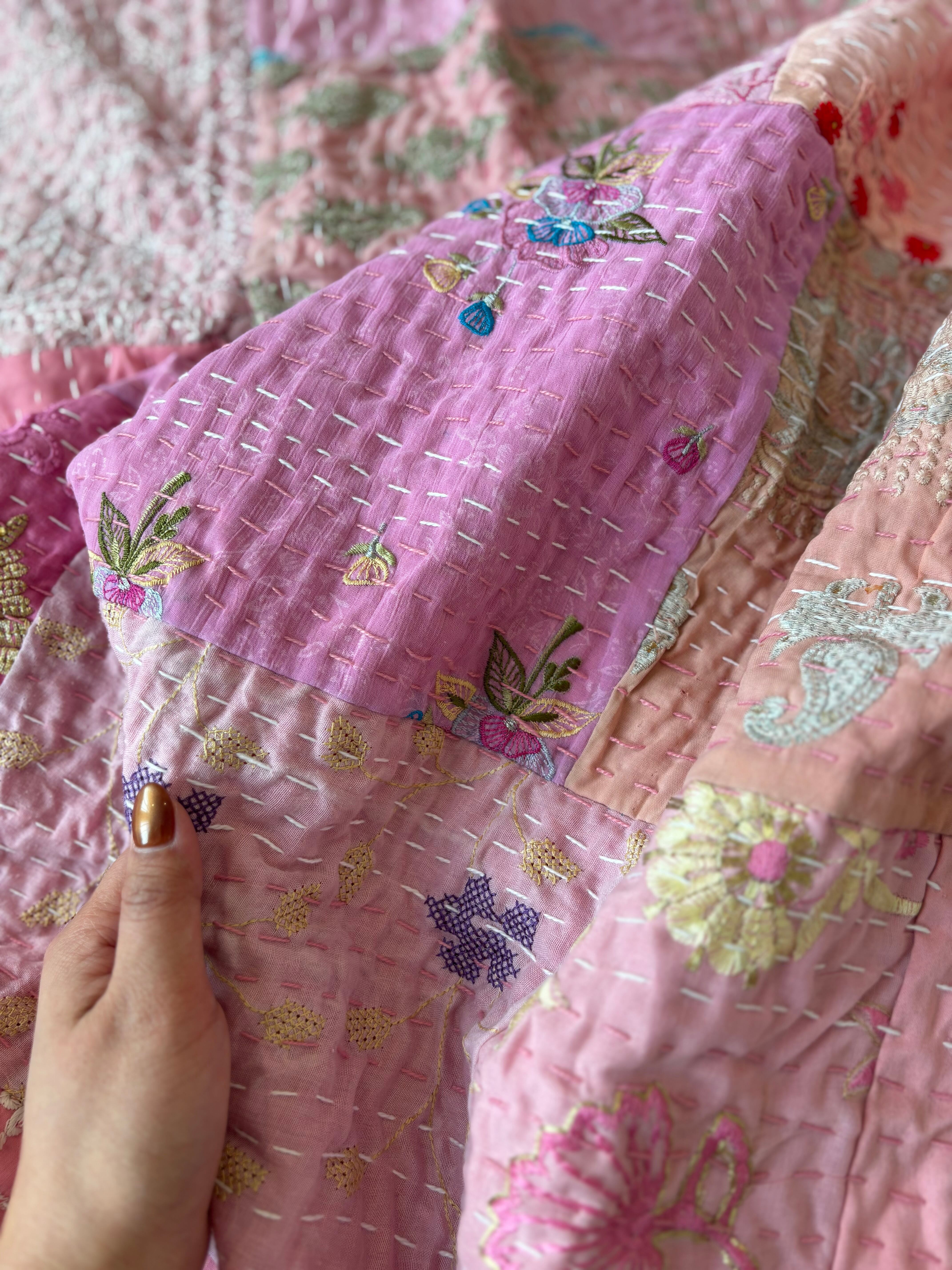 【M】ベビーピンクC カンバディアキルト(シングルサイズ) インド刺繍パッチワーク