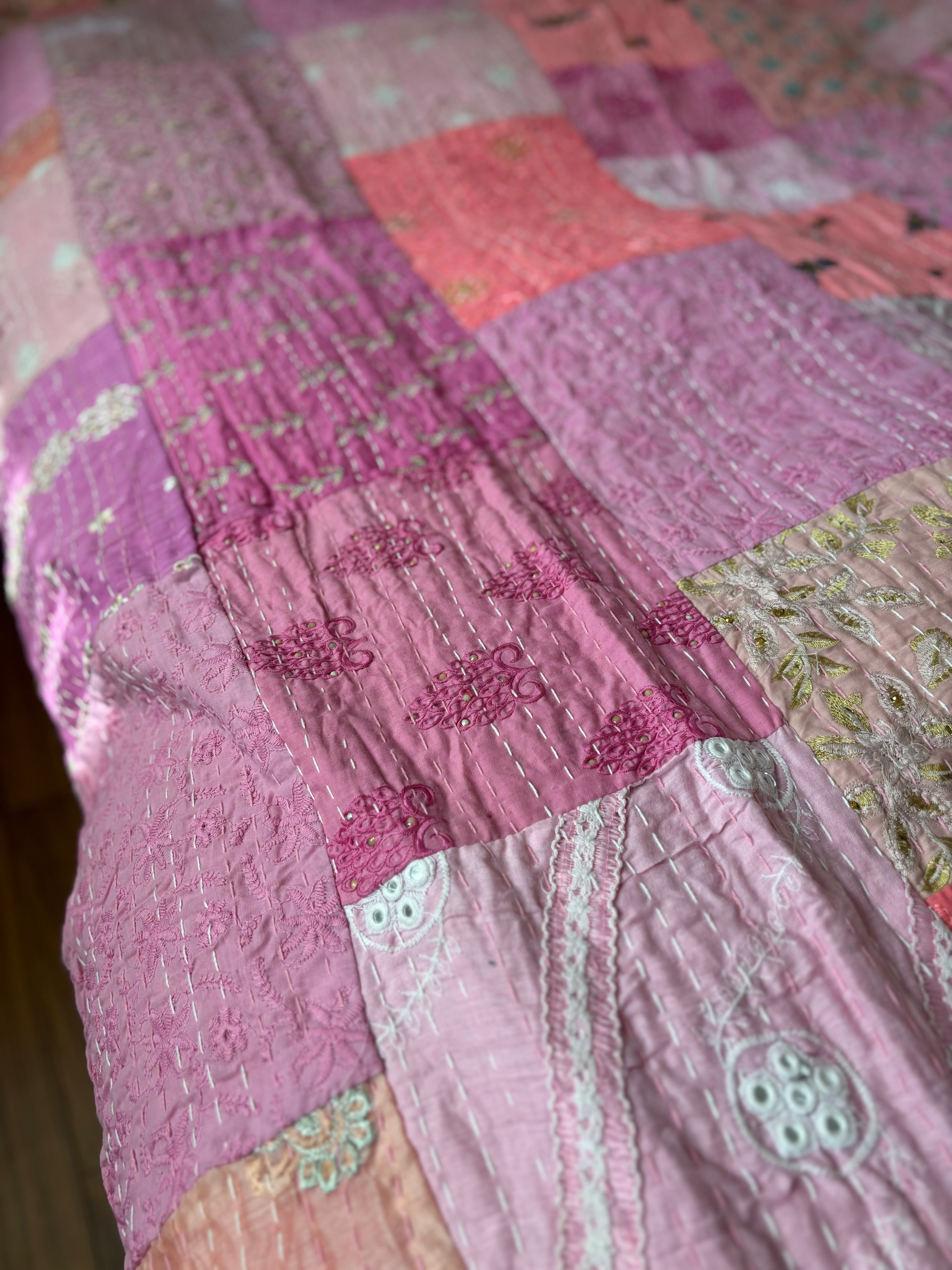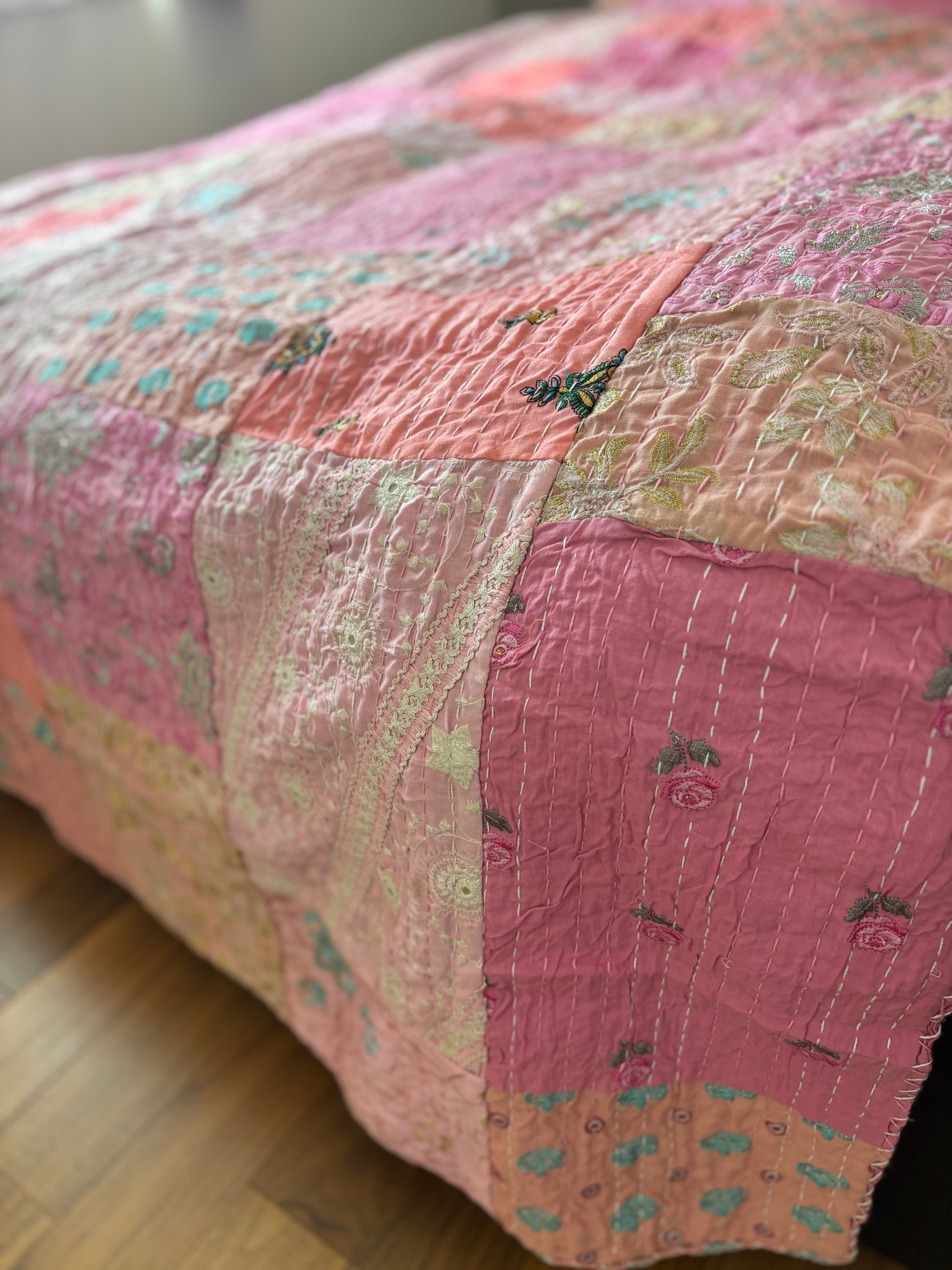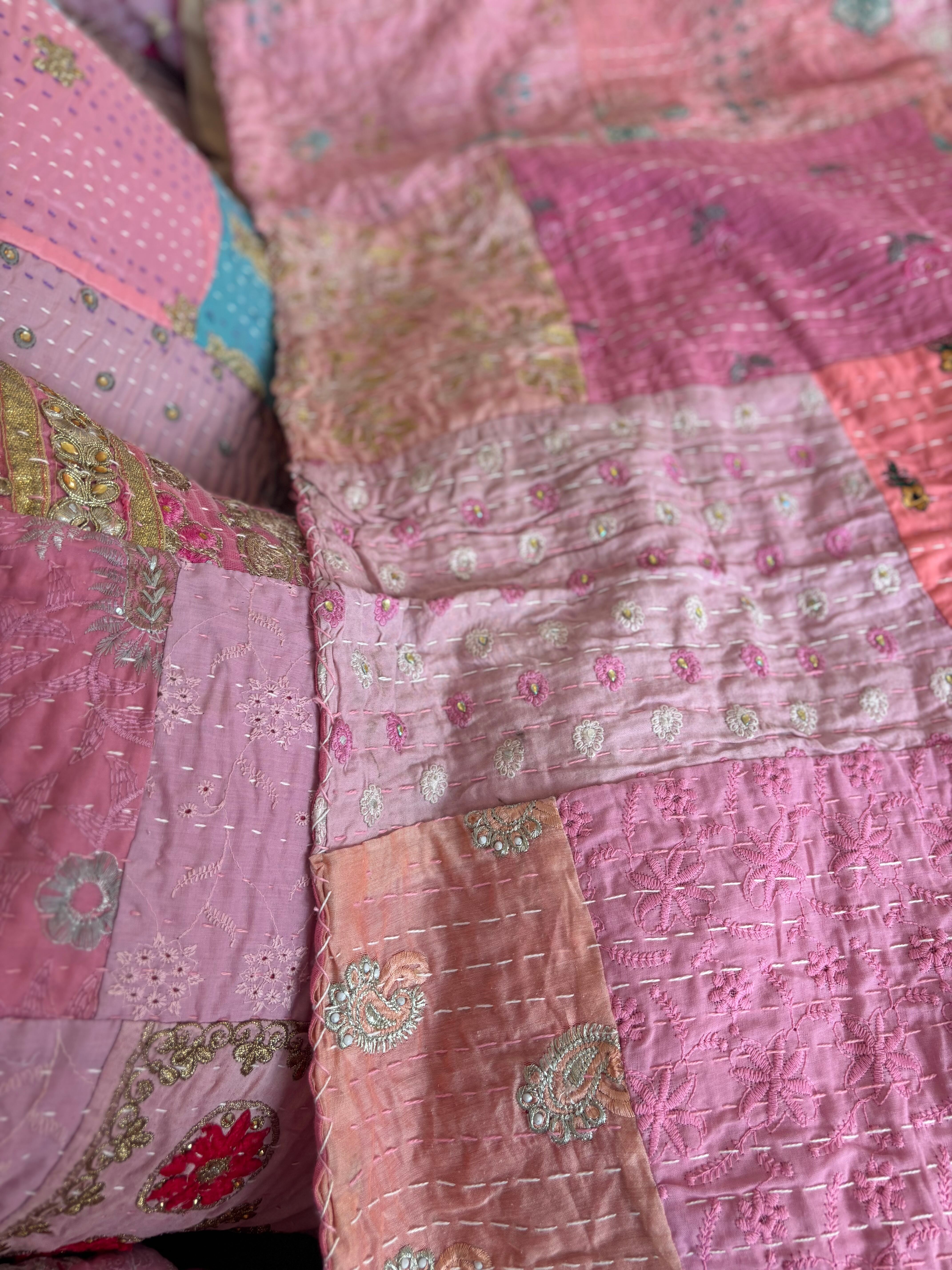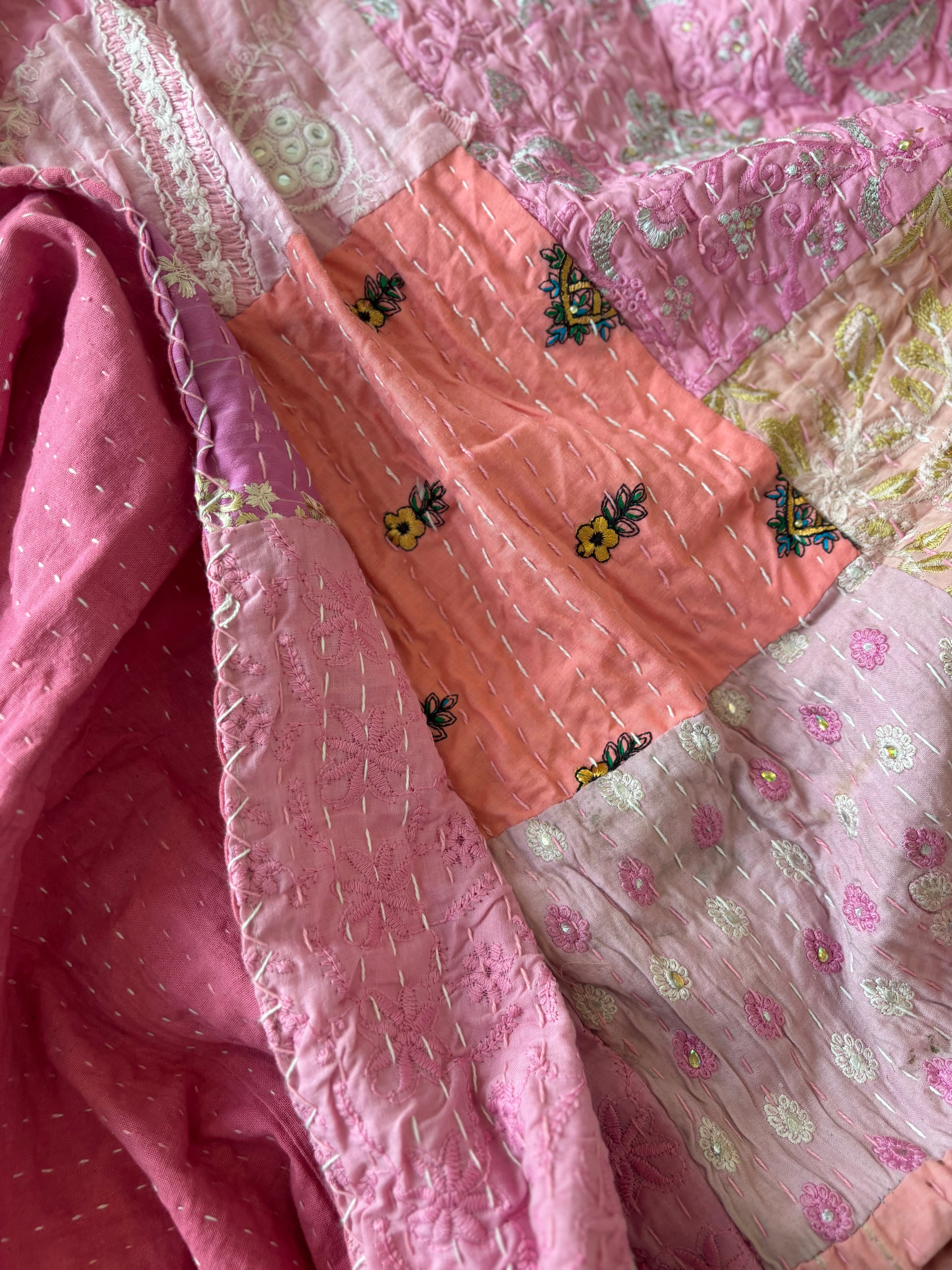 【M】ベビーピンクA カンバディアキルト(ダシングルサイズ) インド刺繍パッチワーク