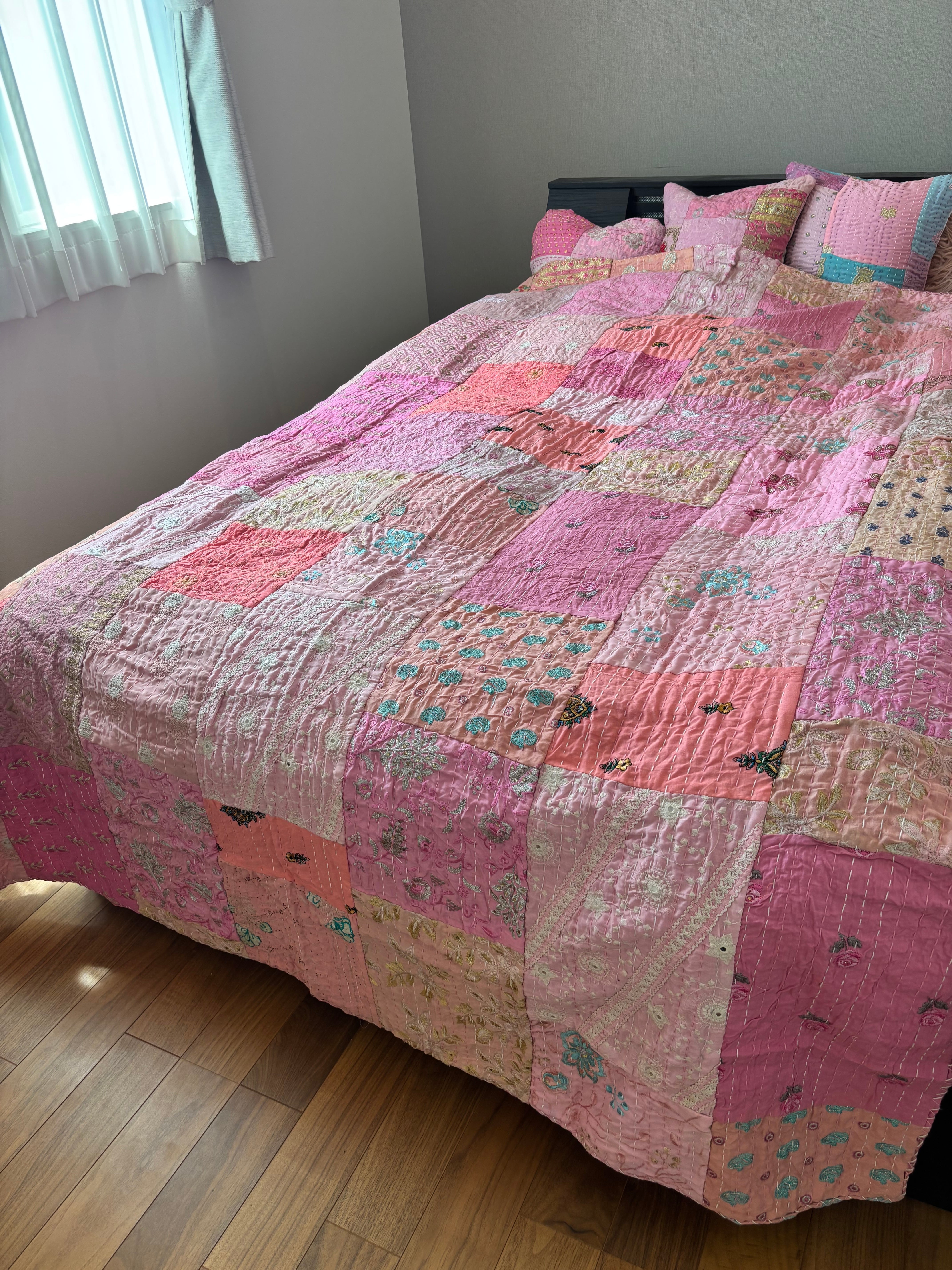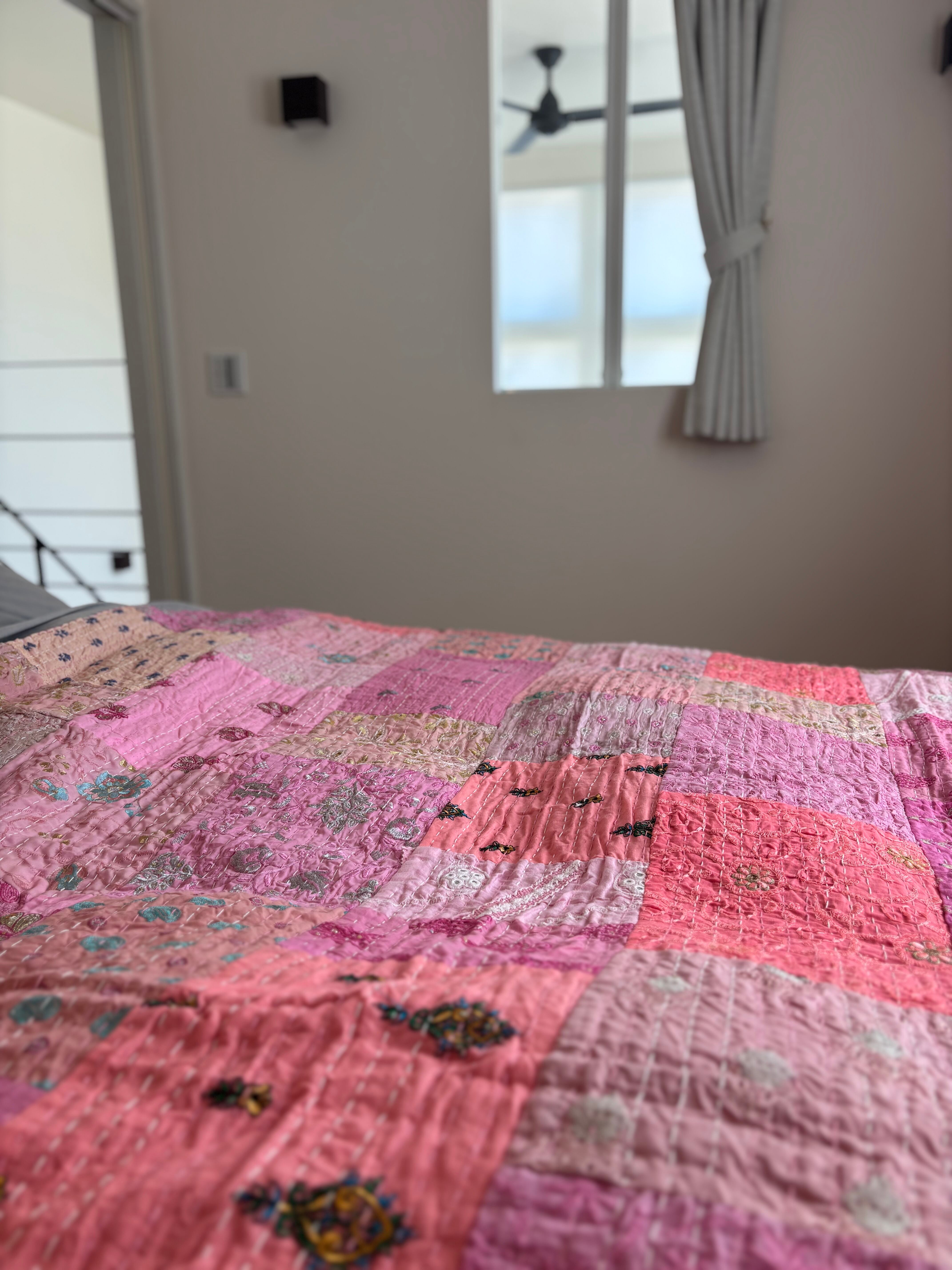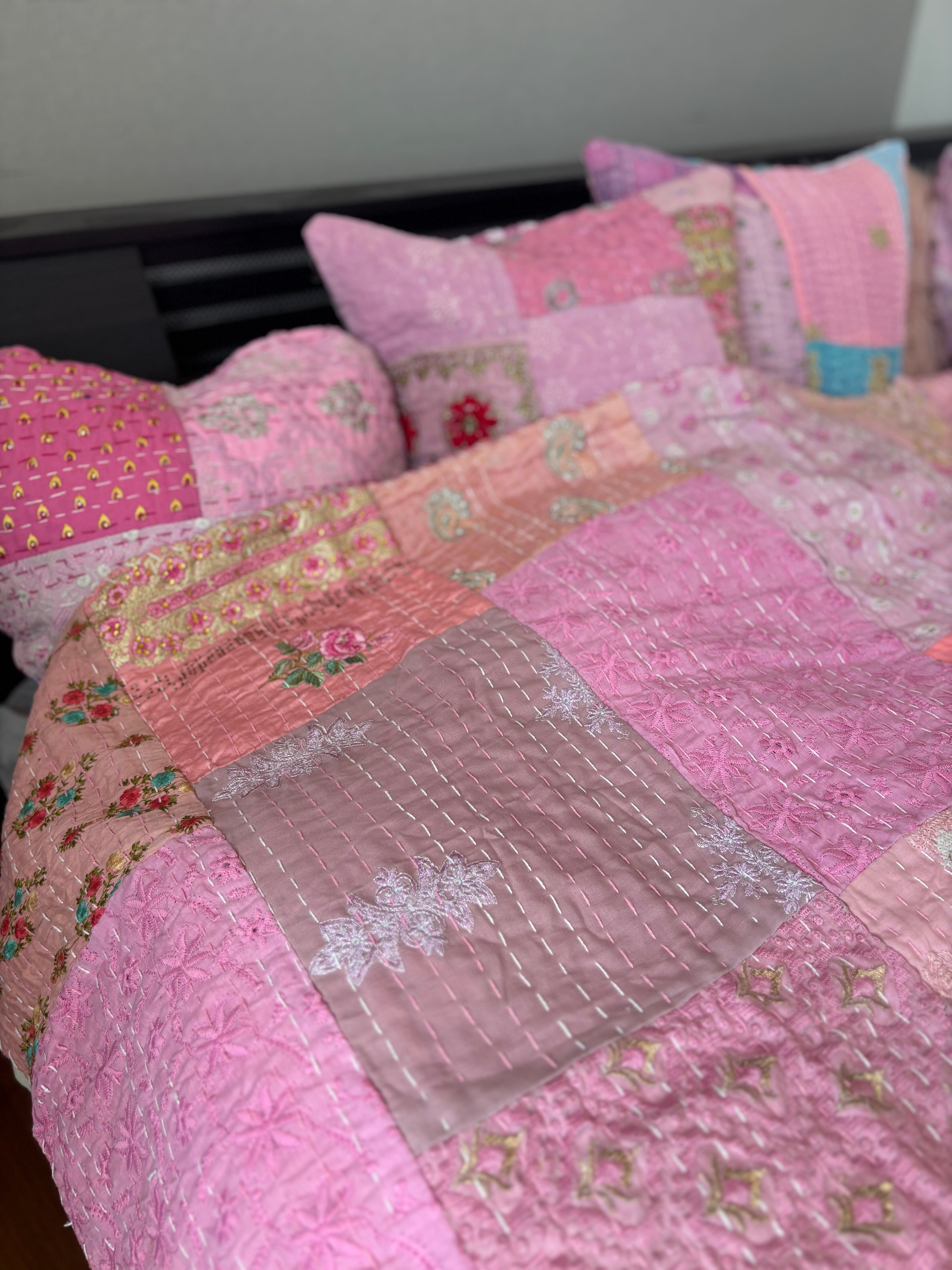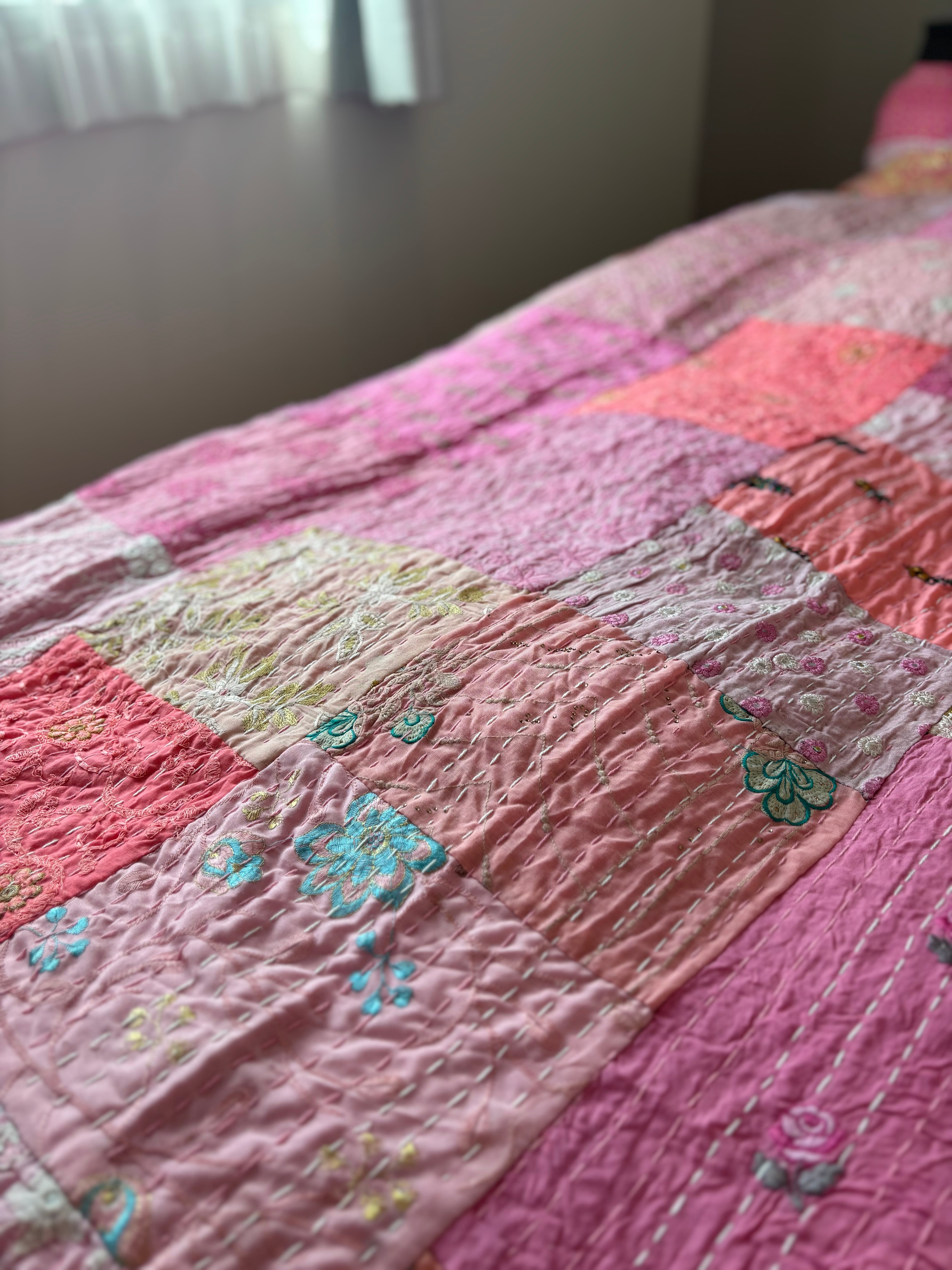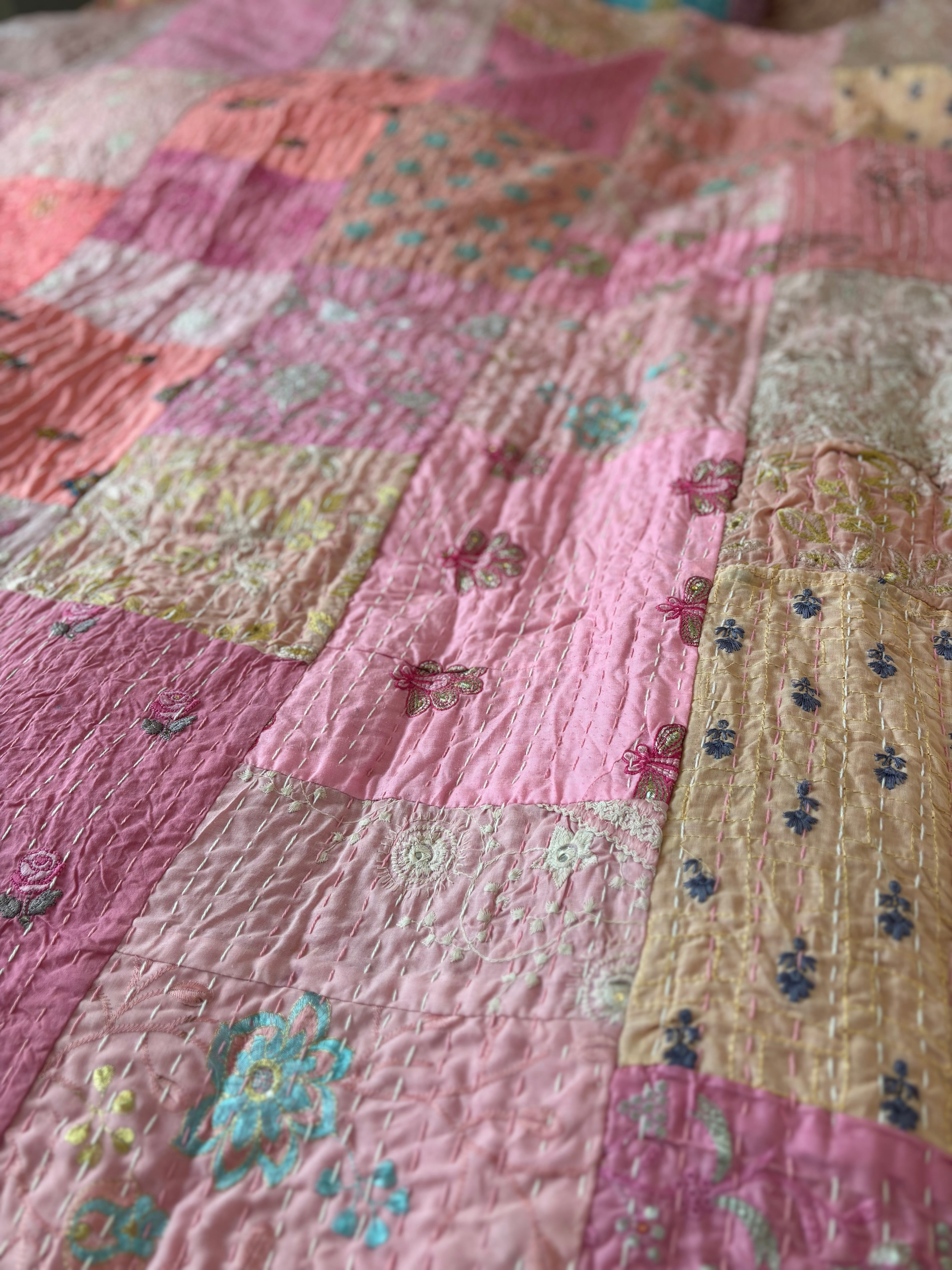 【M】ベビーピンクA カンバディアキルト(ダシングルサイズ) インド刺繍パッチワーク