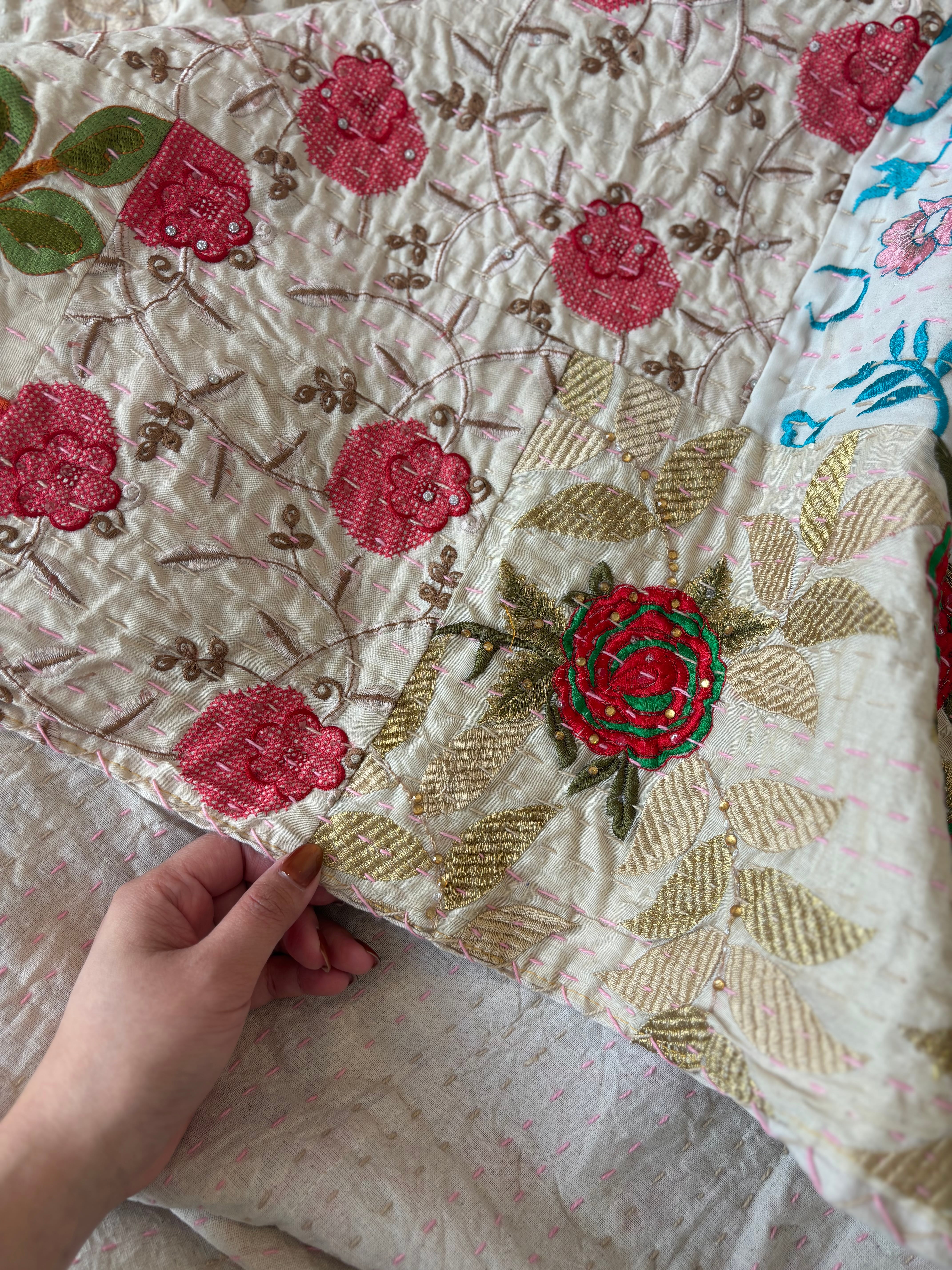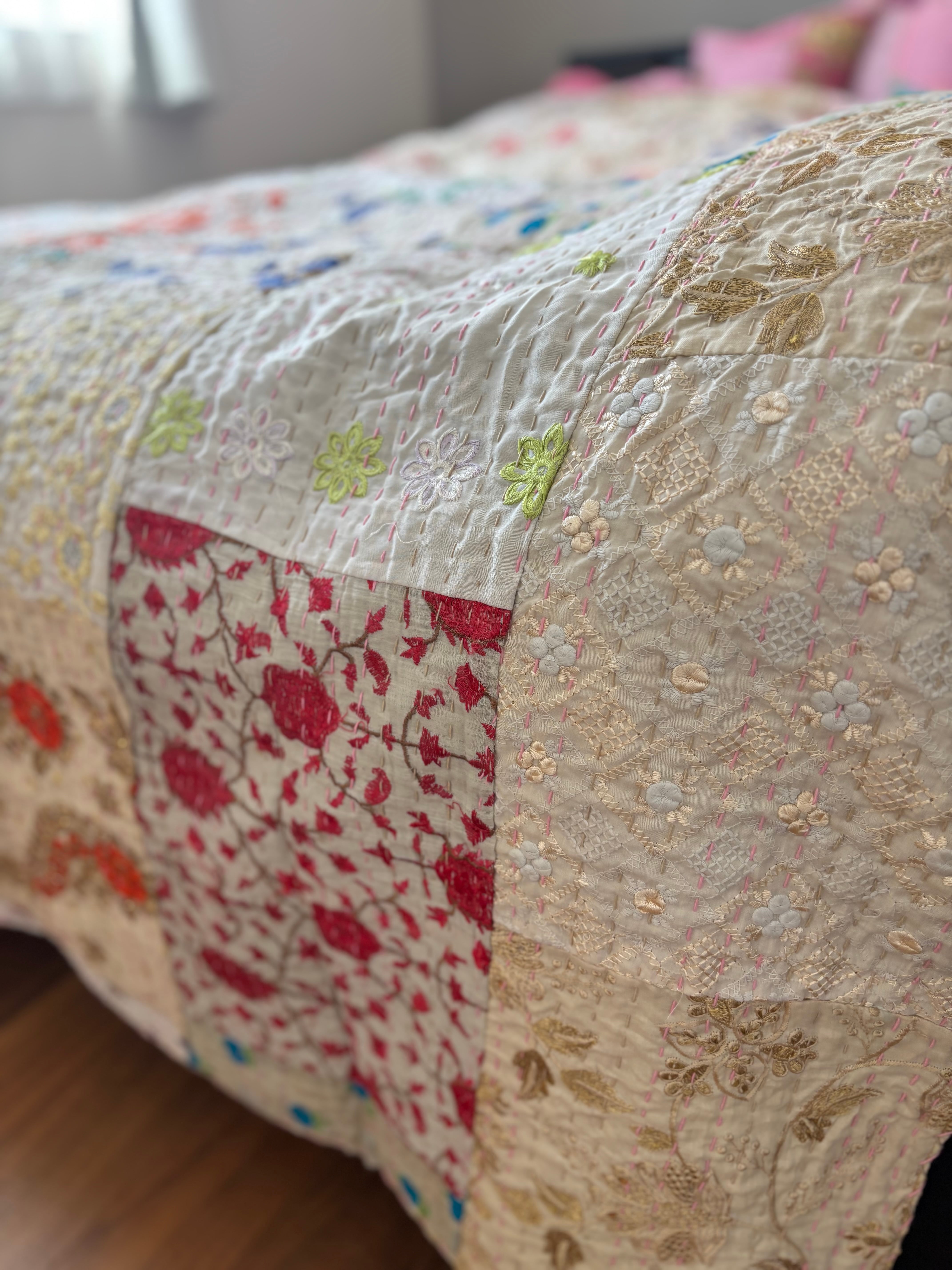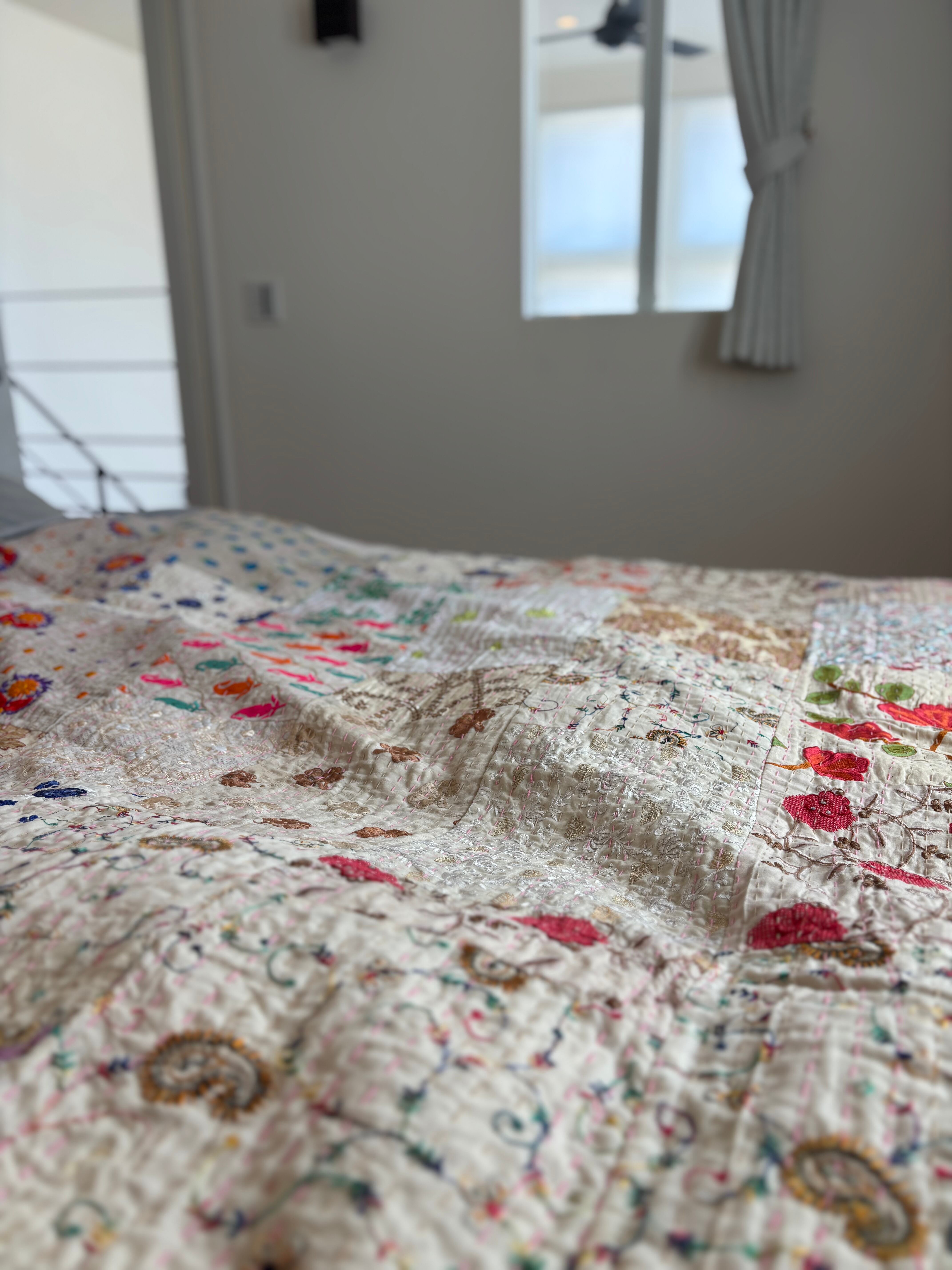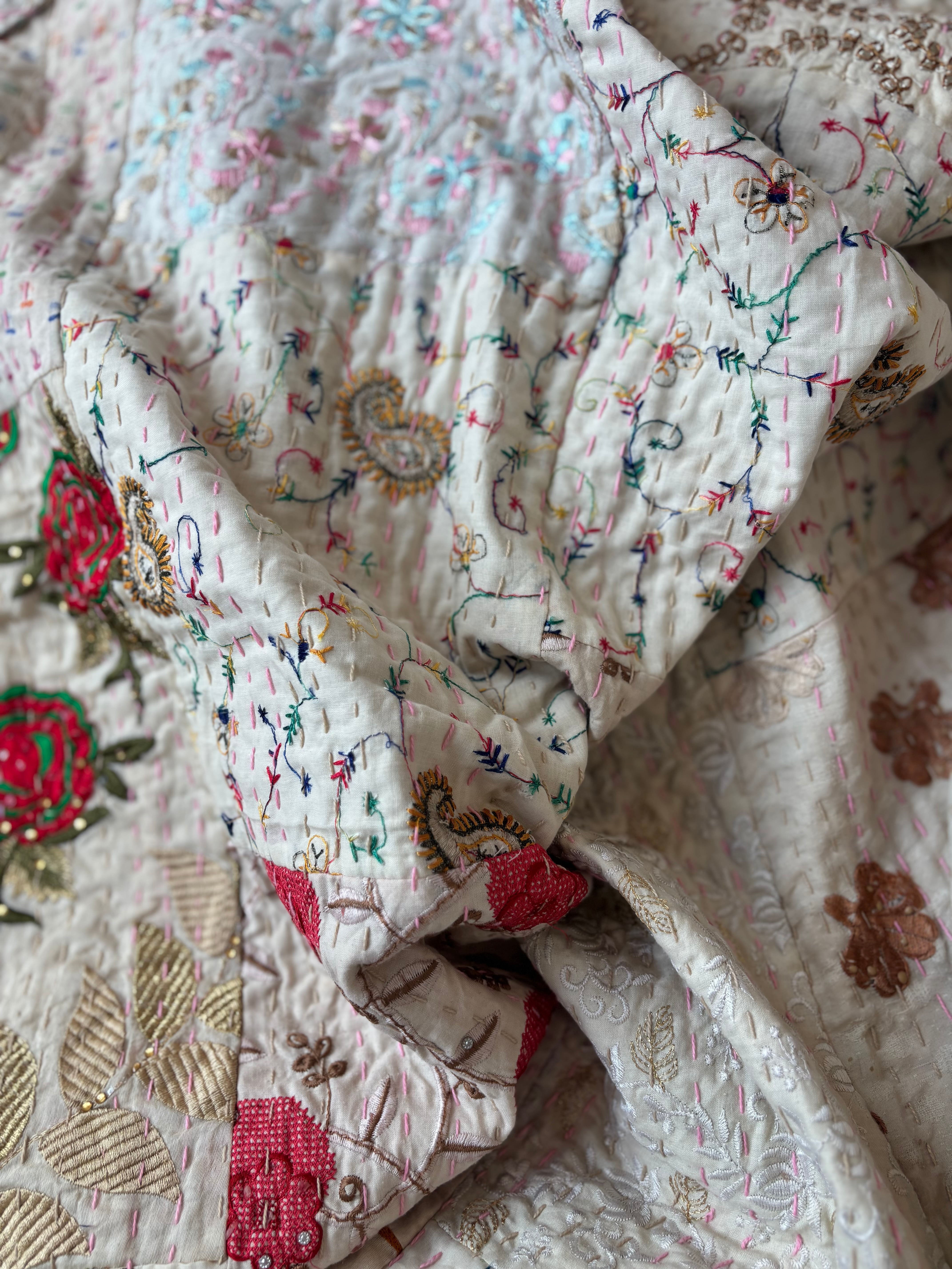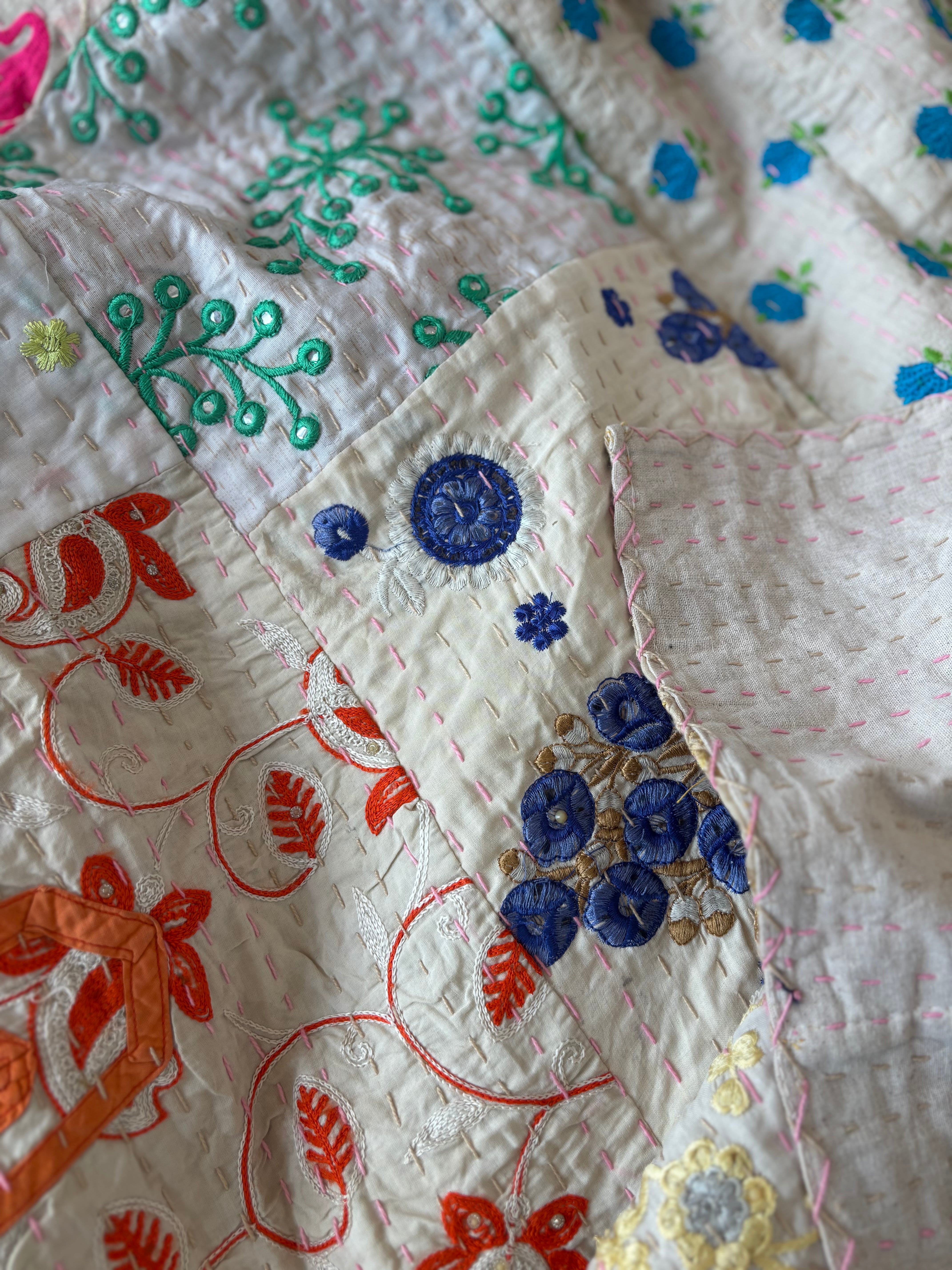 【M】アイボリーA カンバディアキルト(シングルサイズ) インド刺繍パッチワーク