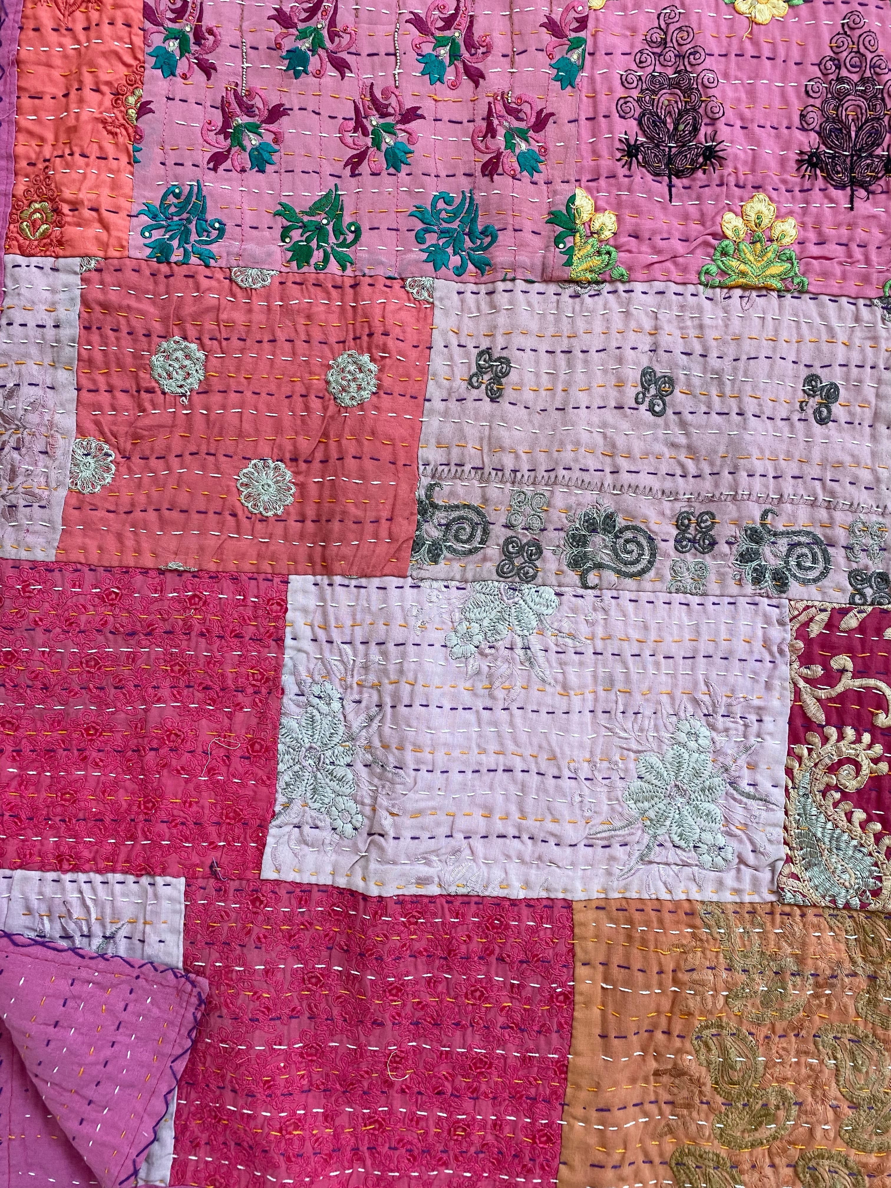 繋ぎ合わせたパッチワークキルトはとても華やか。