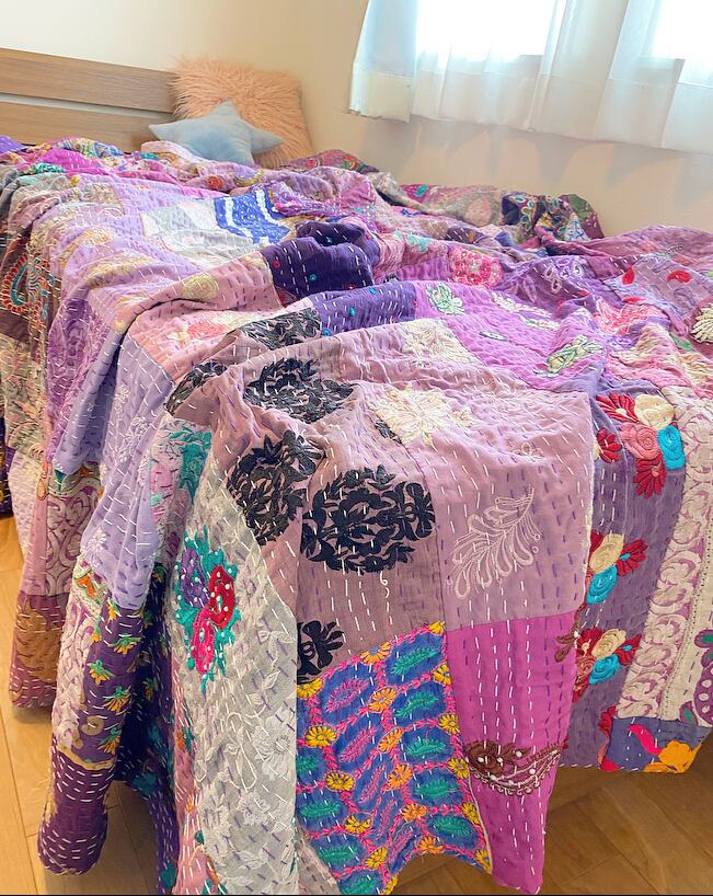 繋ぎ合わせたパッチワークキルトはとても華やか。