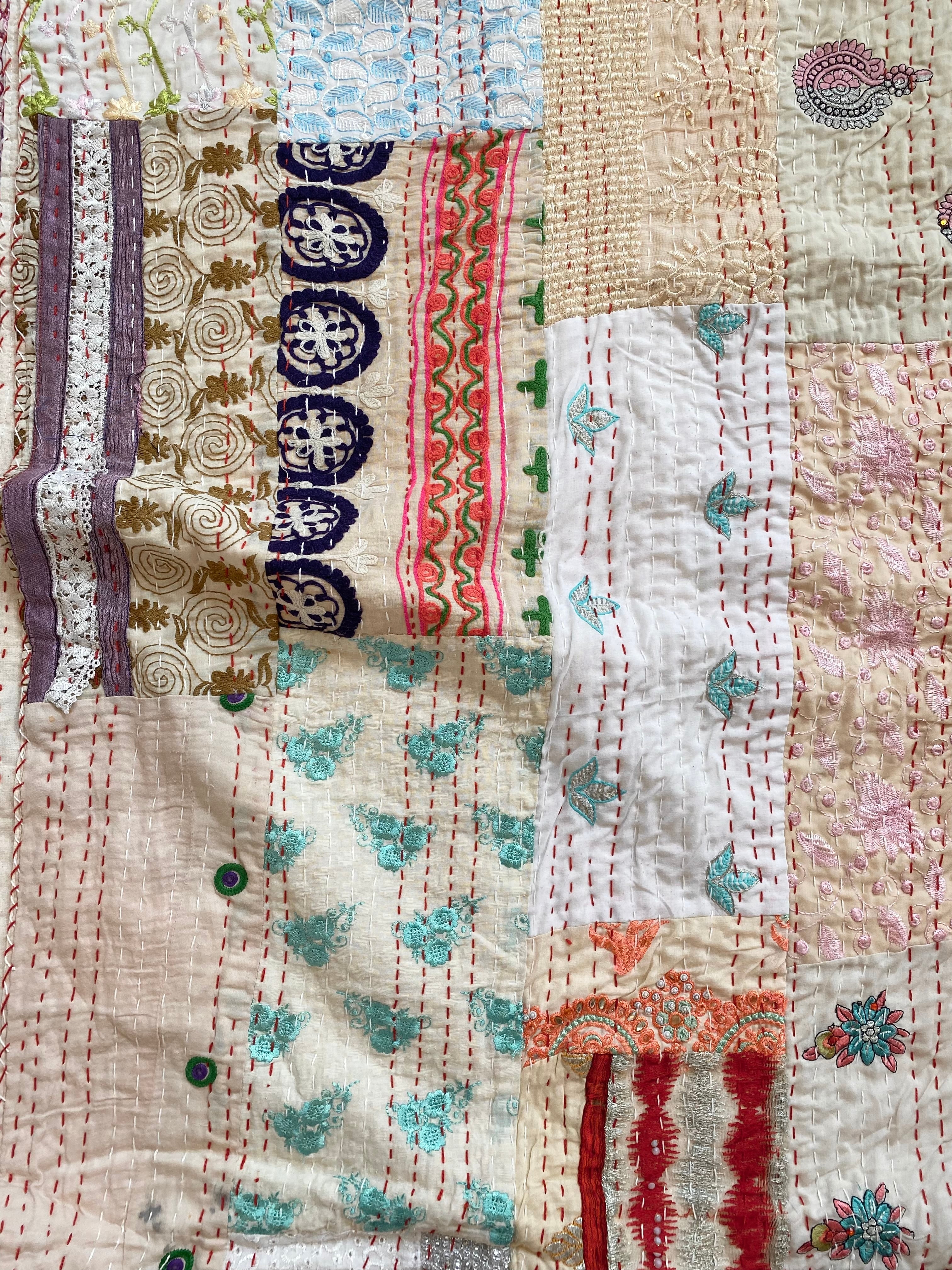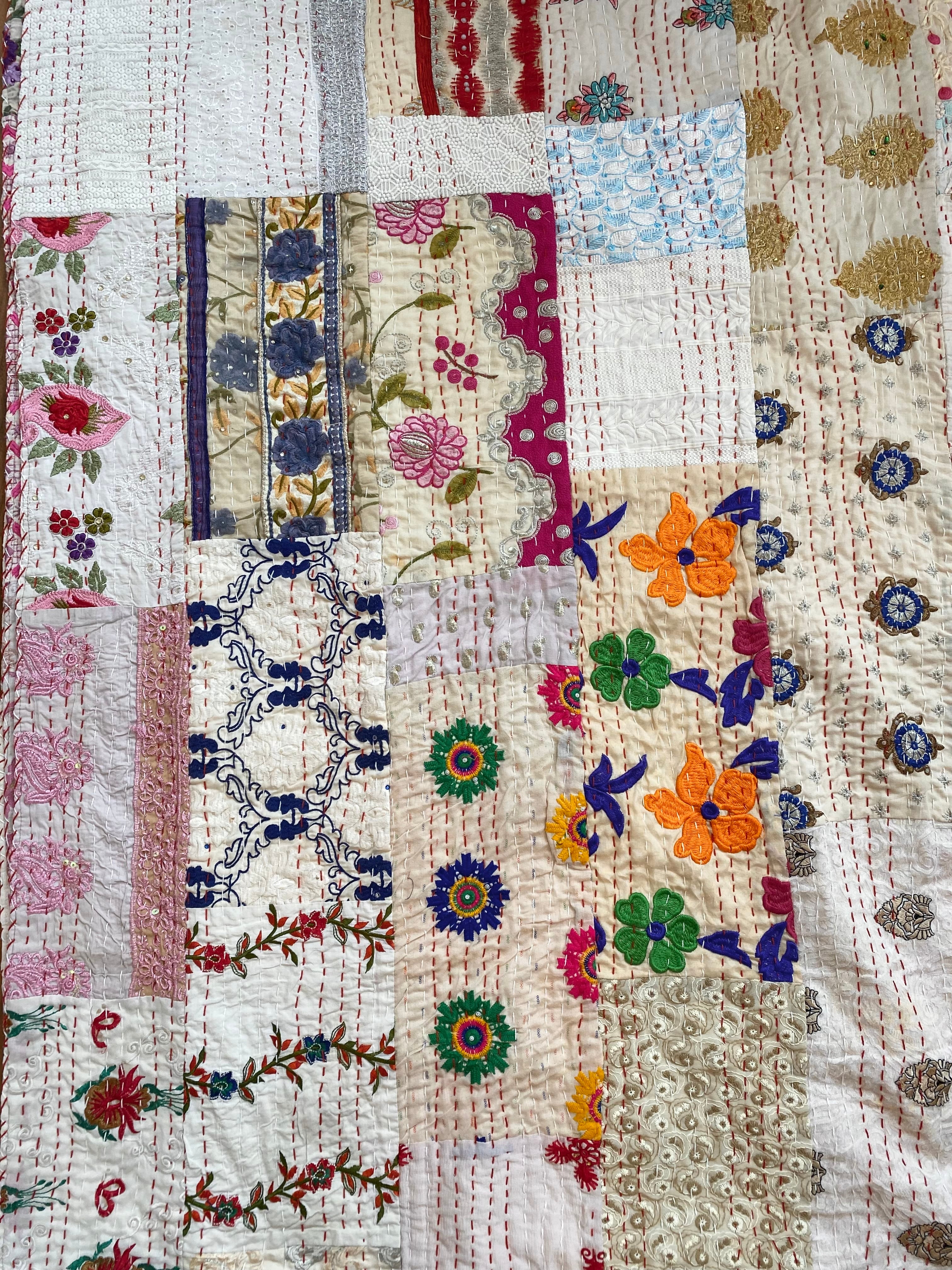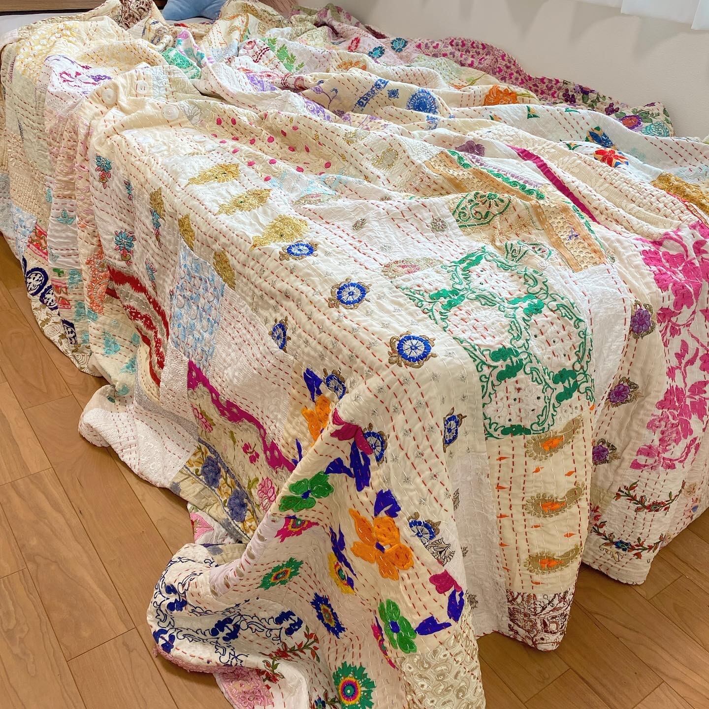 繋ぎ合わせたパッチワークキルトはとても華やか。