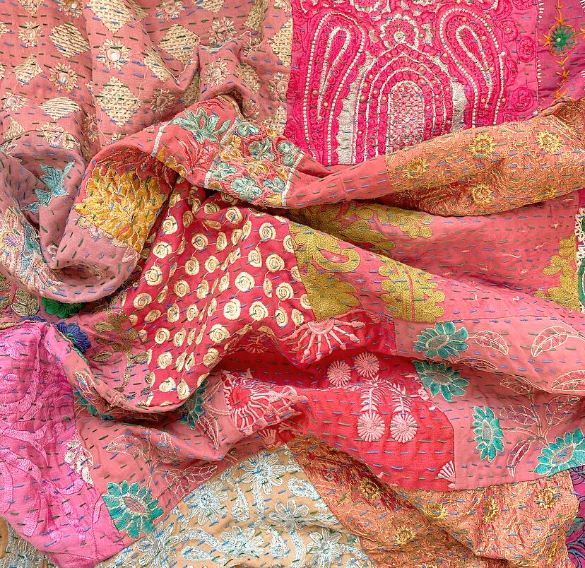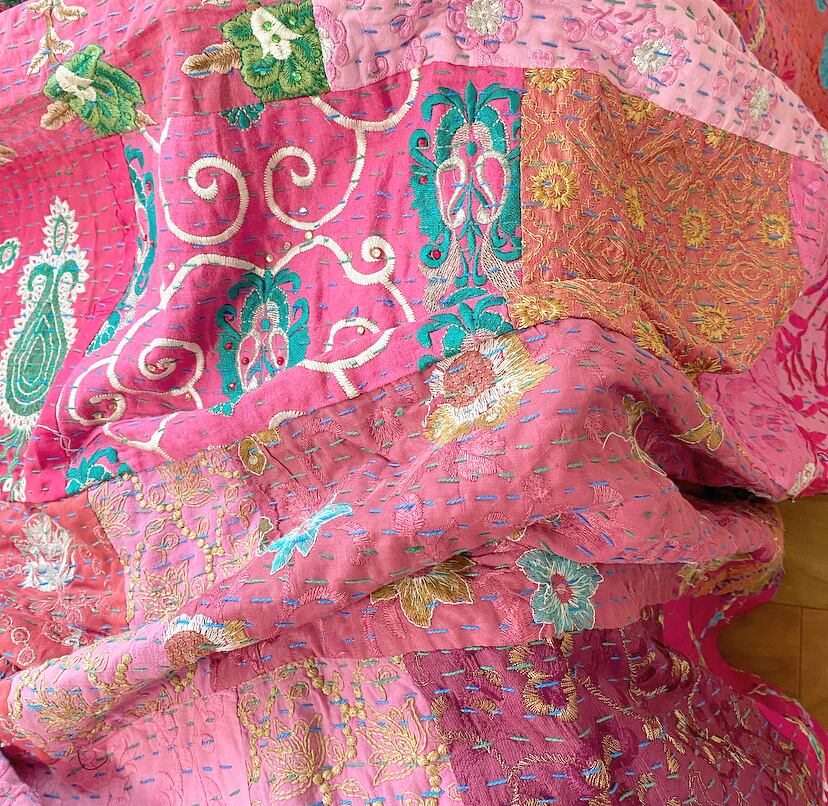 繋ぎ合わせたパッチワークキルトはとても華やか。