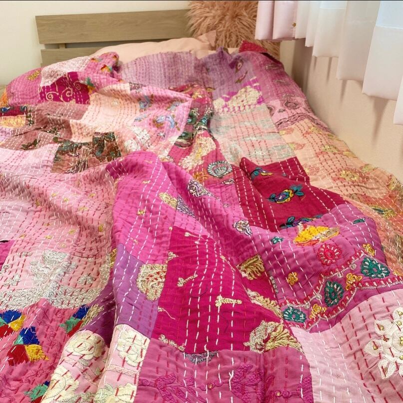 繋ぎ合わせたパッチワークキルトはとても華やか。
