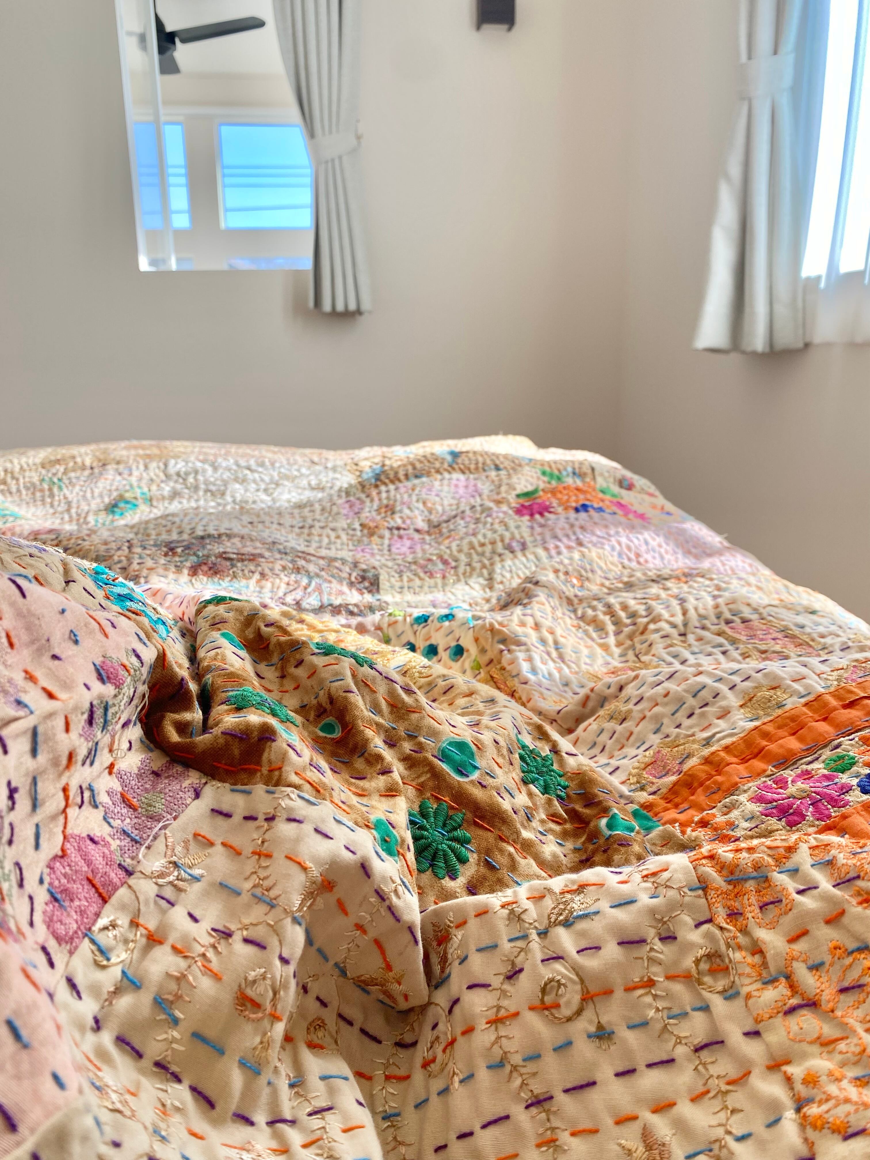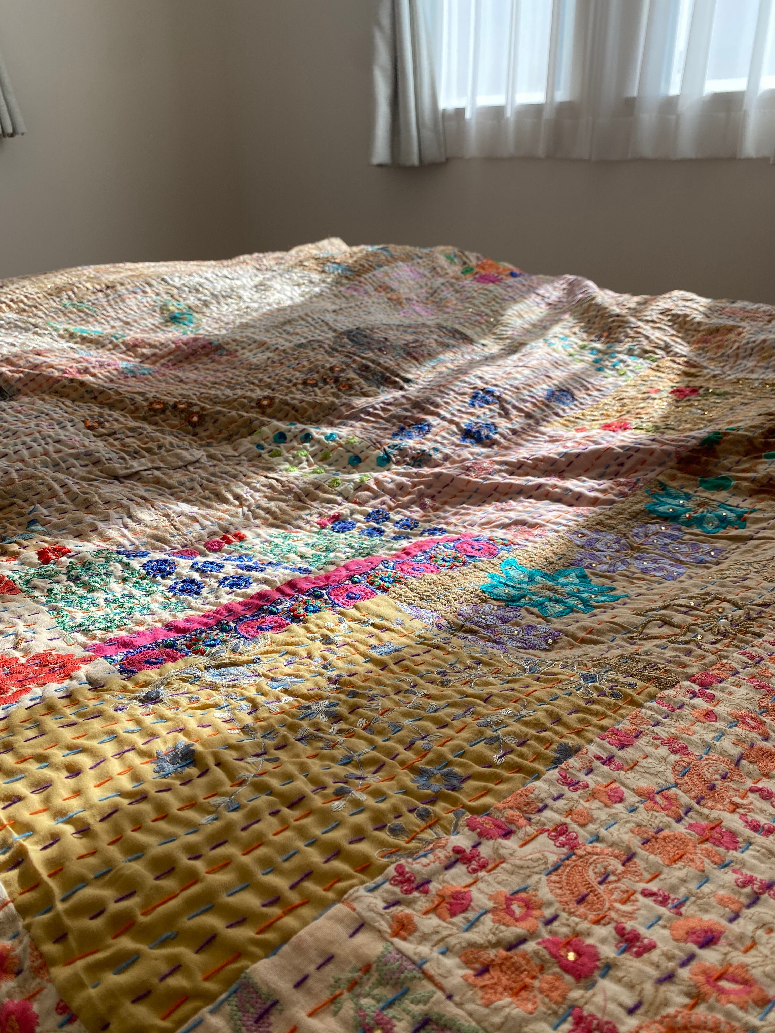 繋ぎ合わせたパッチワークキルトはとても華やか。