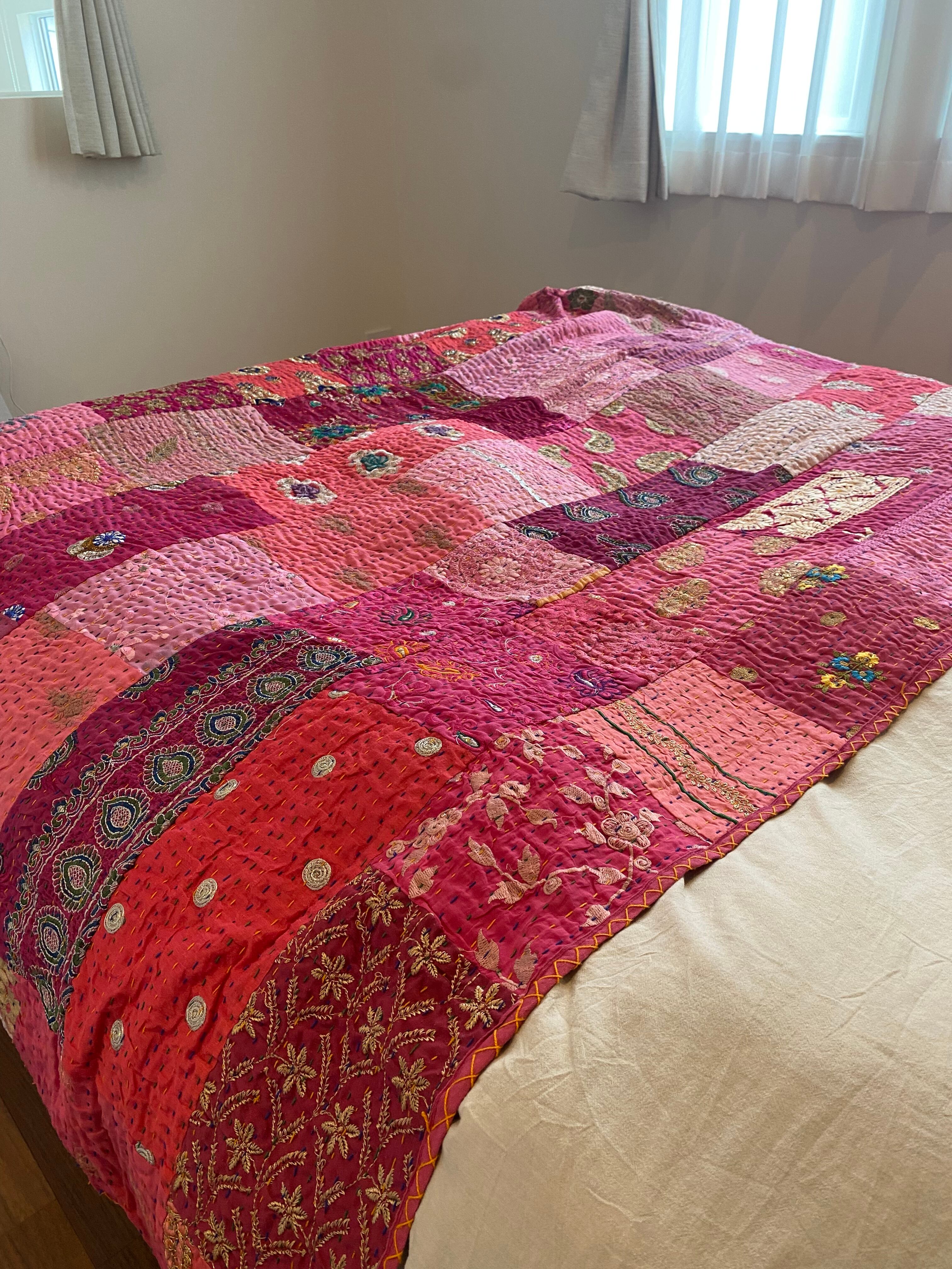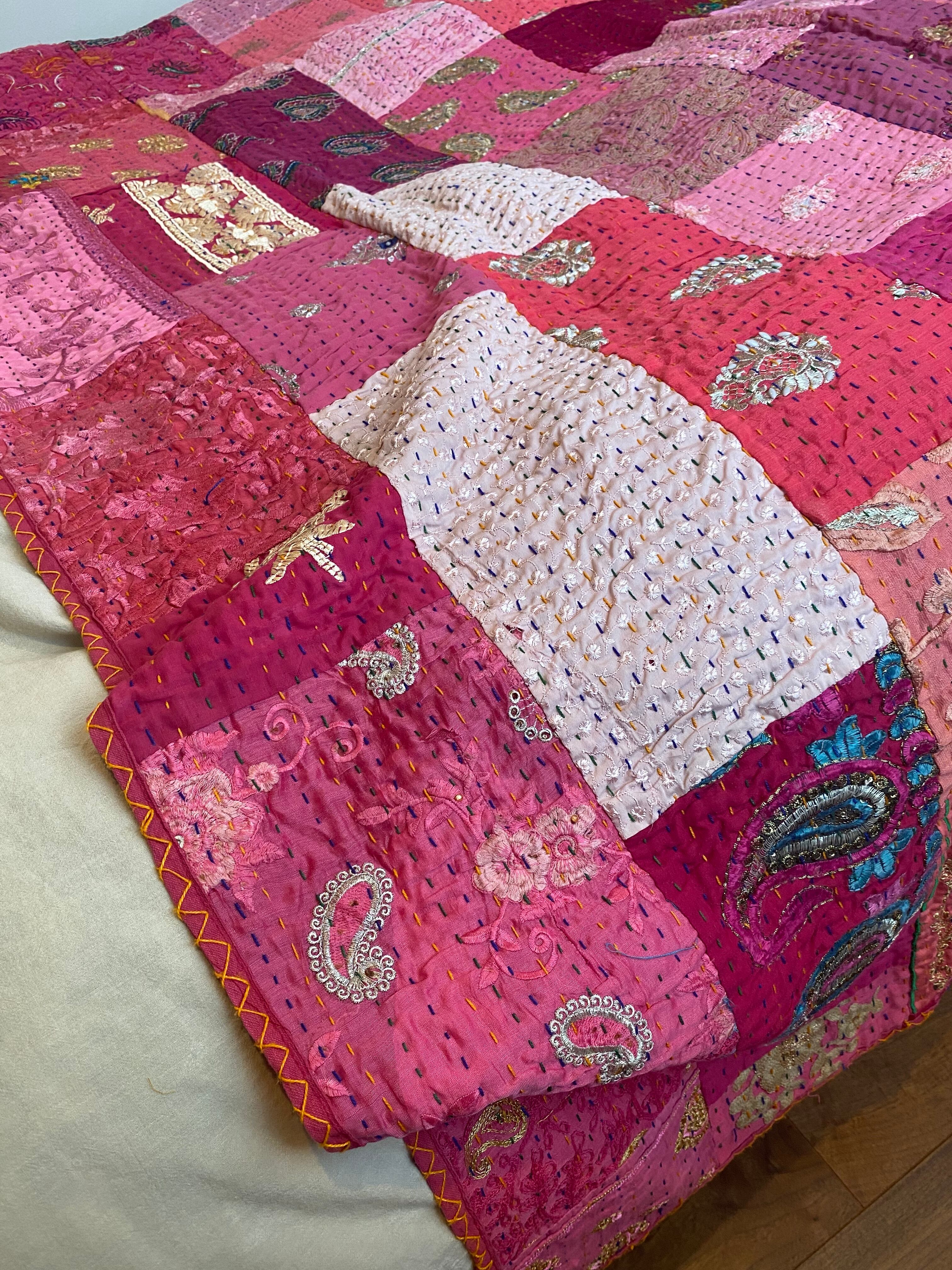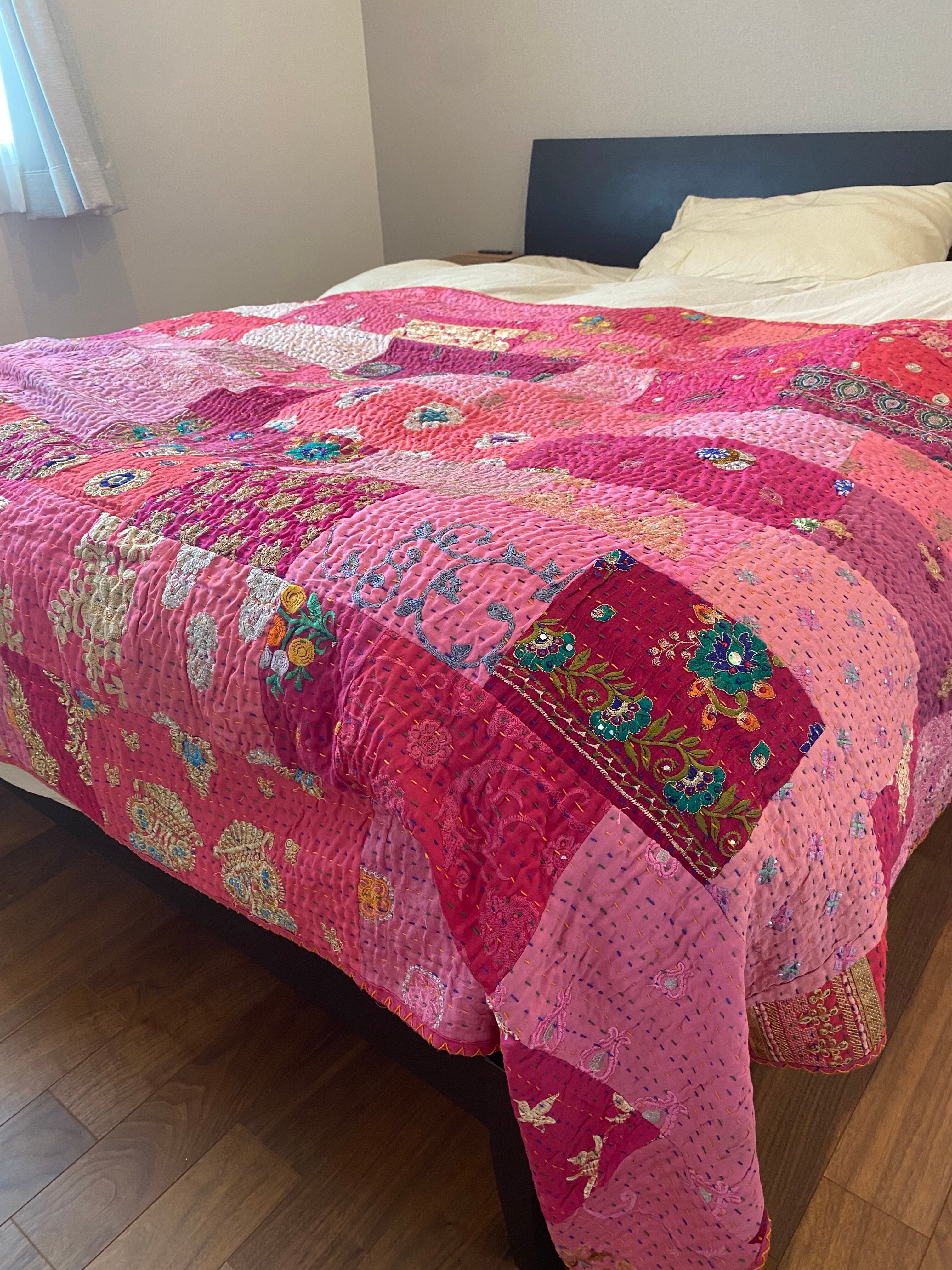 繋ぎ合わせたパッチワークキルトはとても華やか。