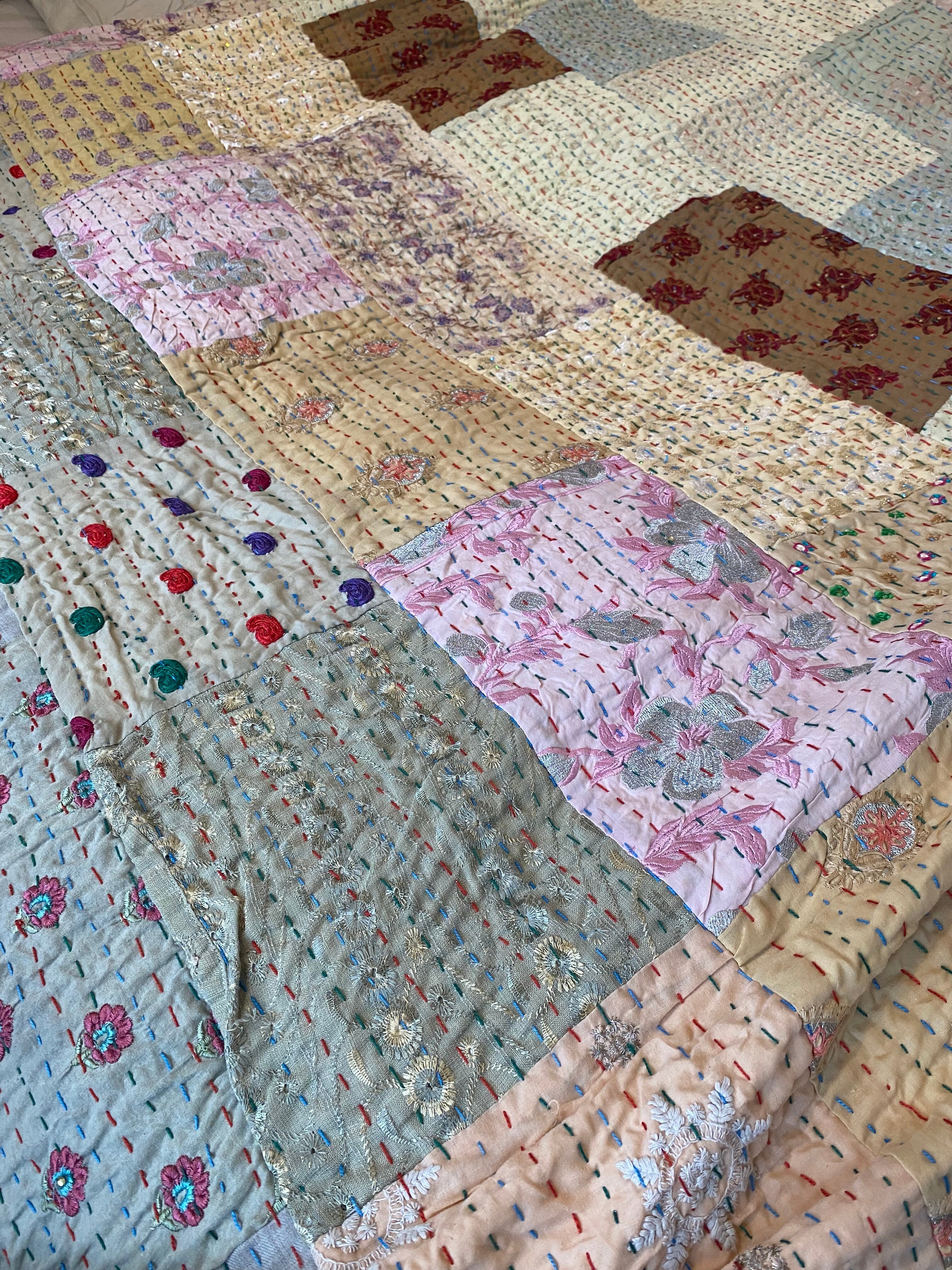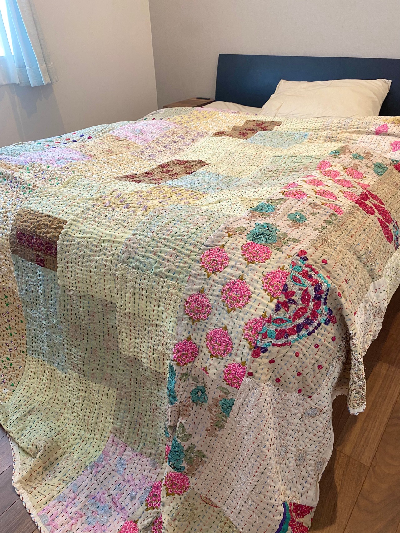 繋ぎ合わせたパッチワークキルトはとても華やか。