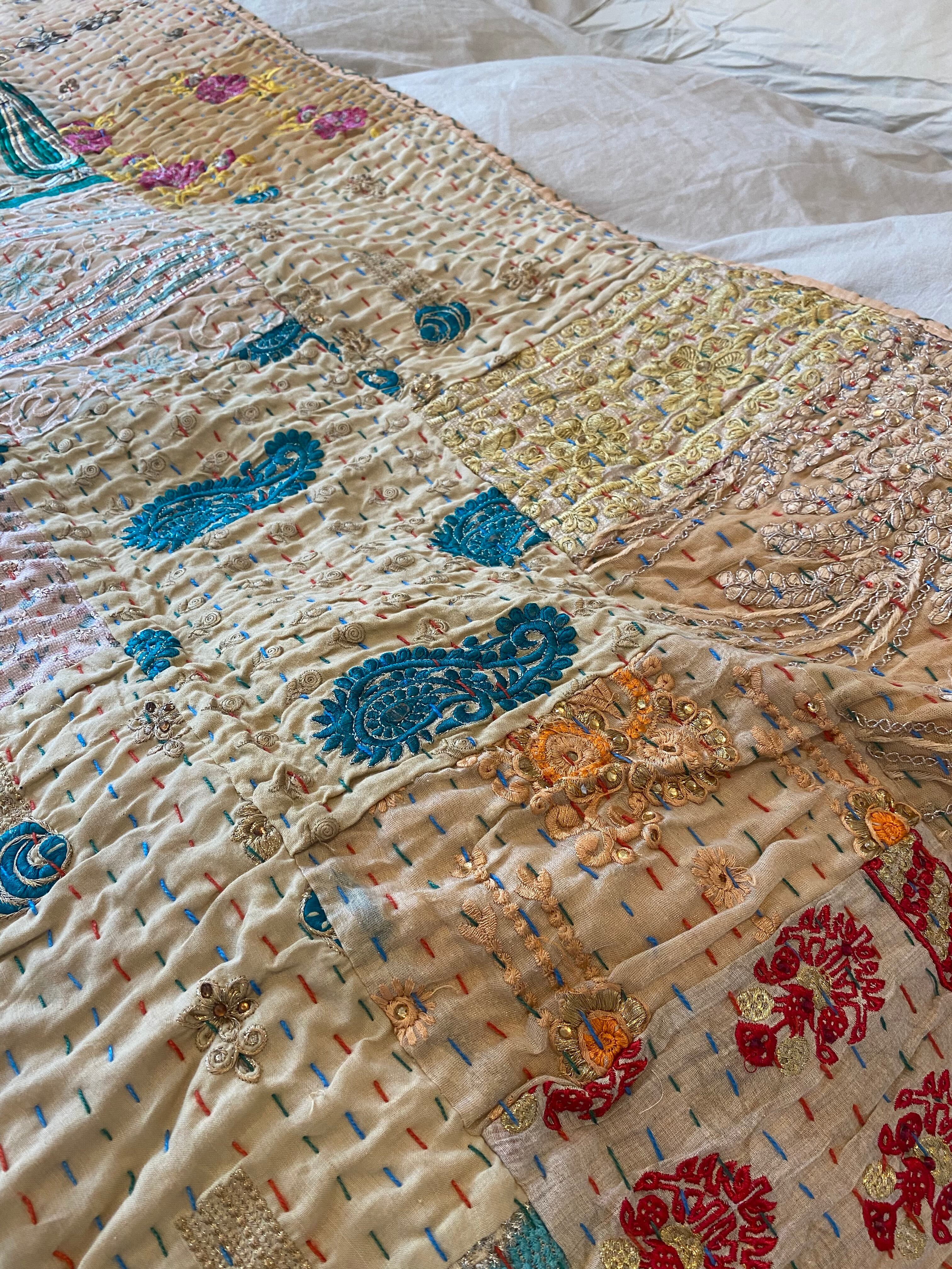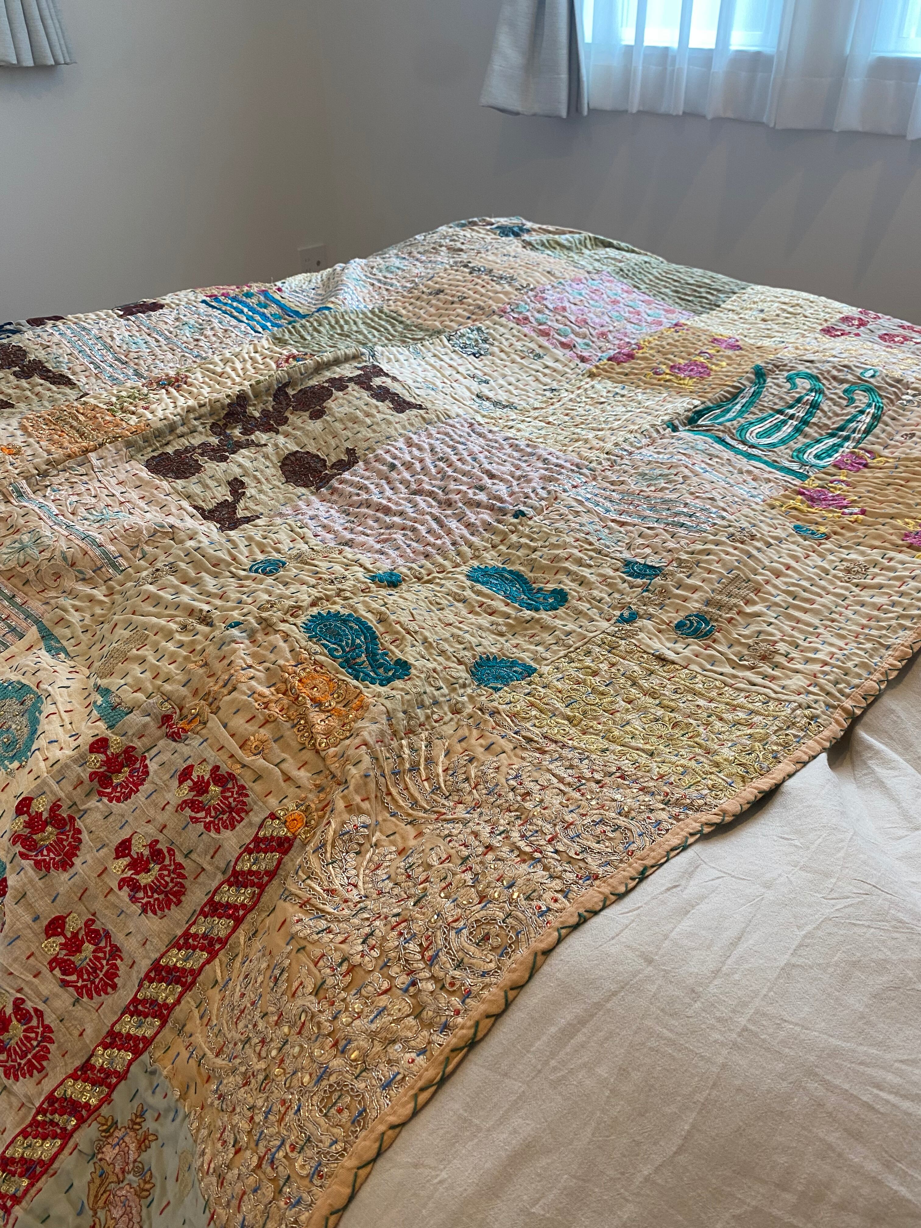 繋ぎ合わせたパッチワークキルトはとても華やか。