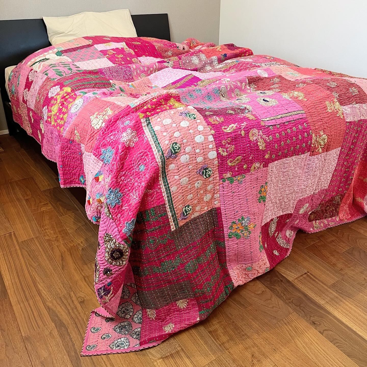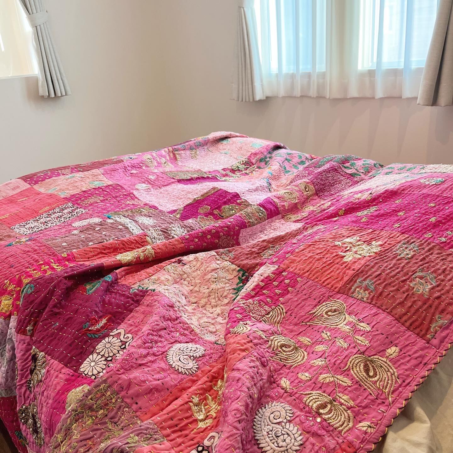 繋ぎ合わせたパッチワークキルトはとても華やか。