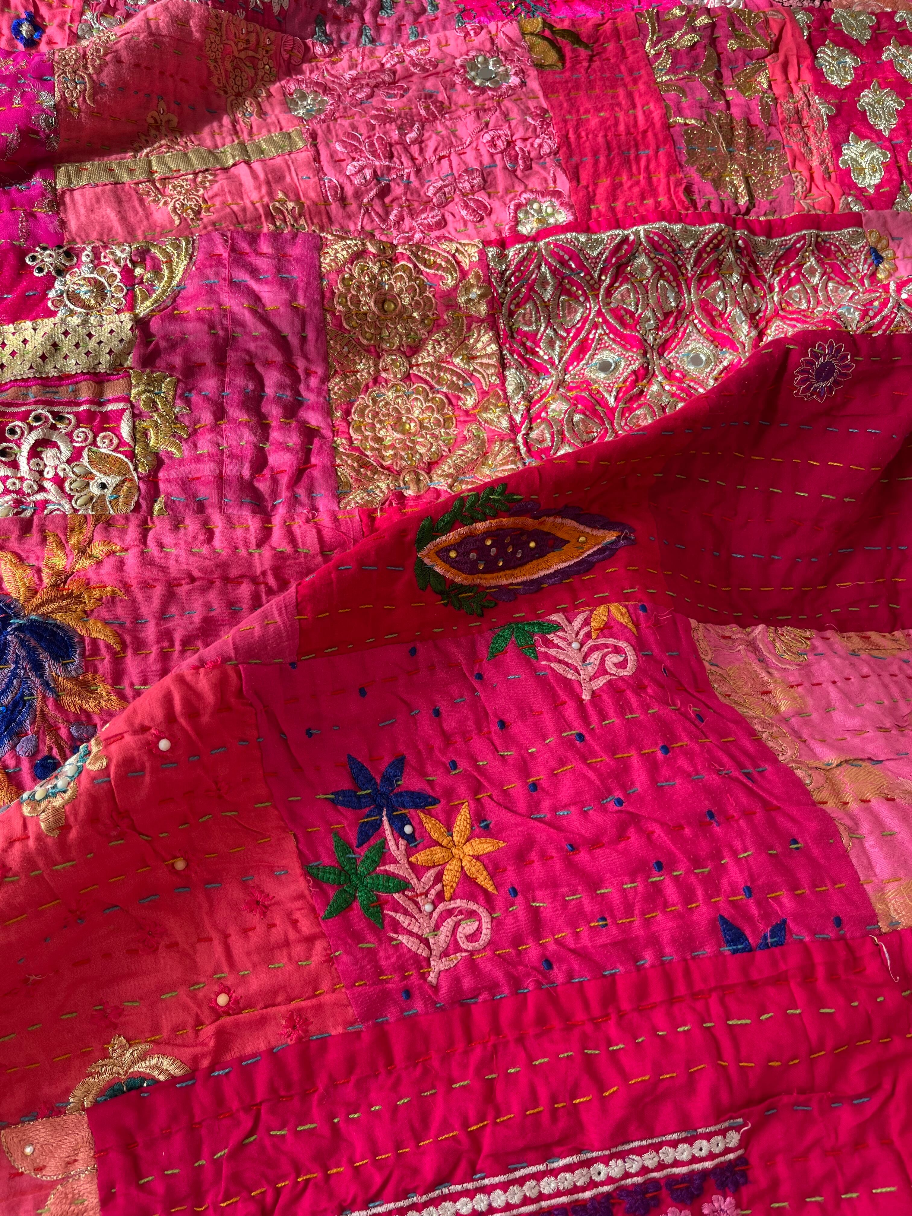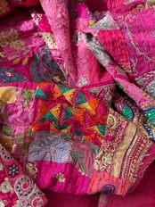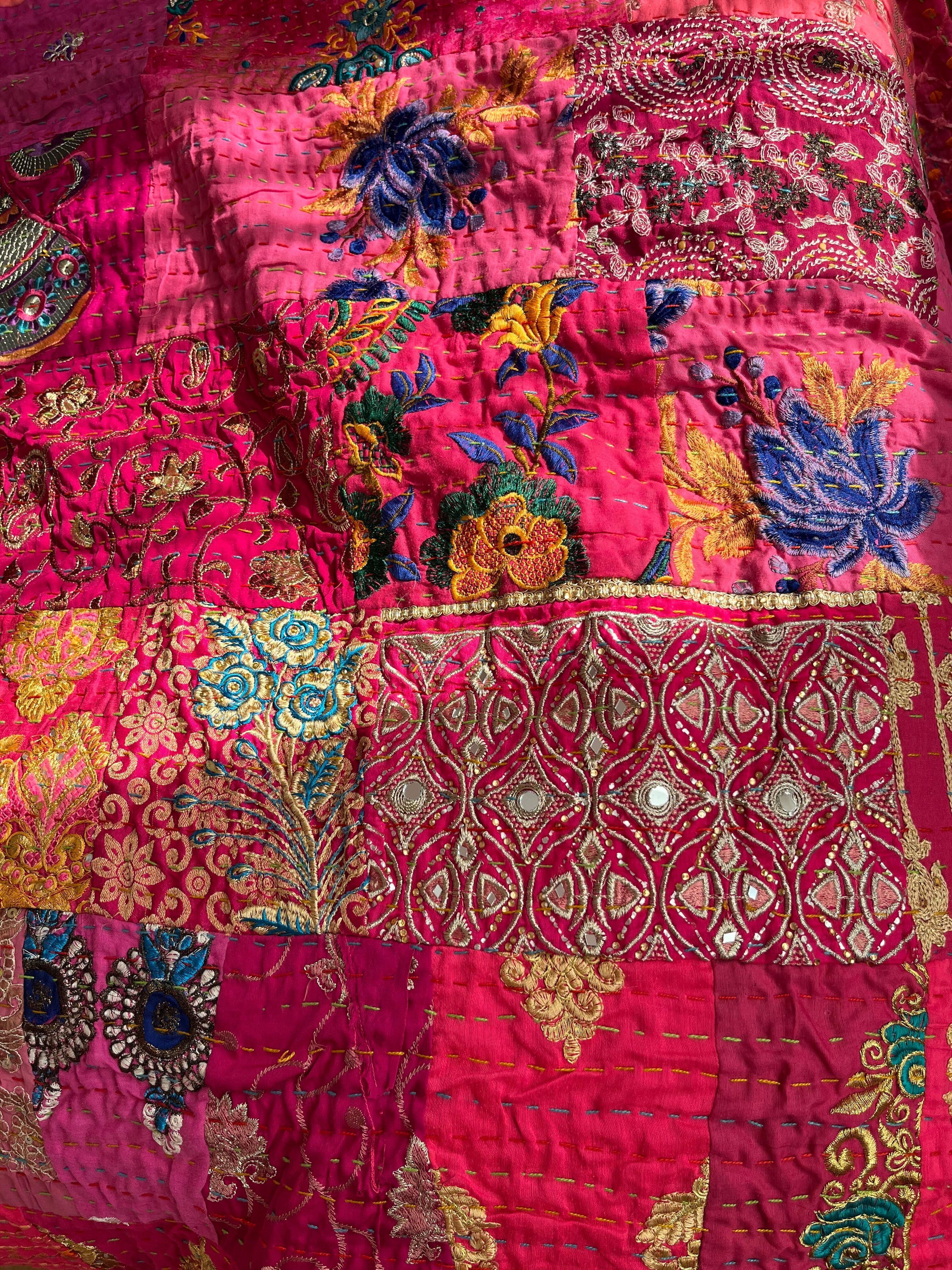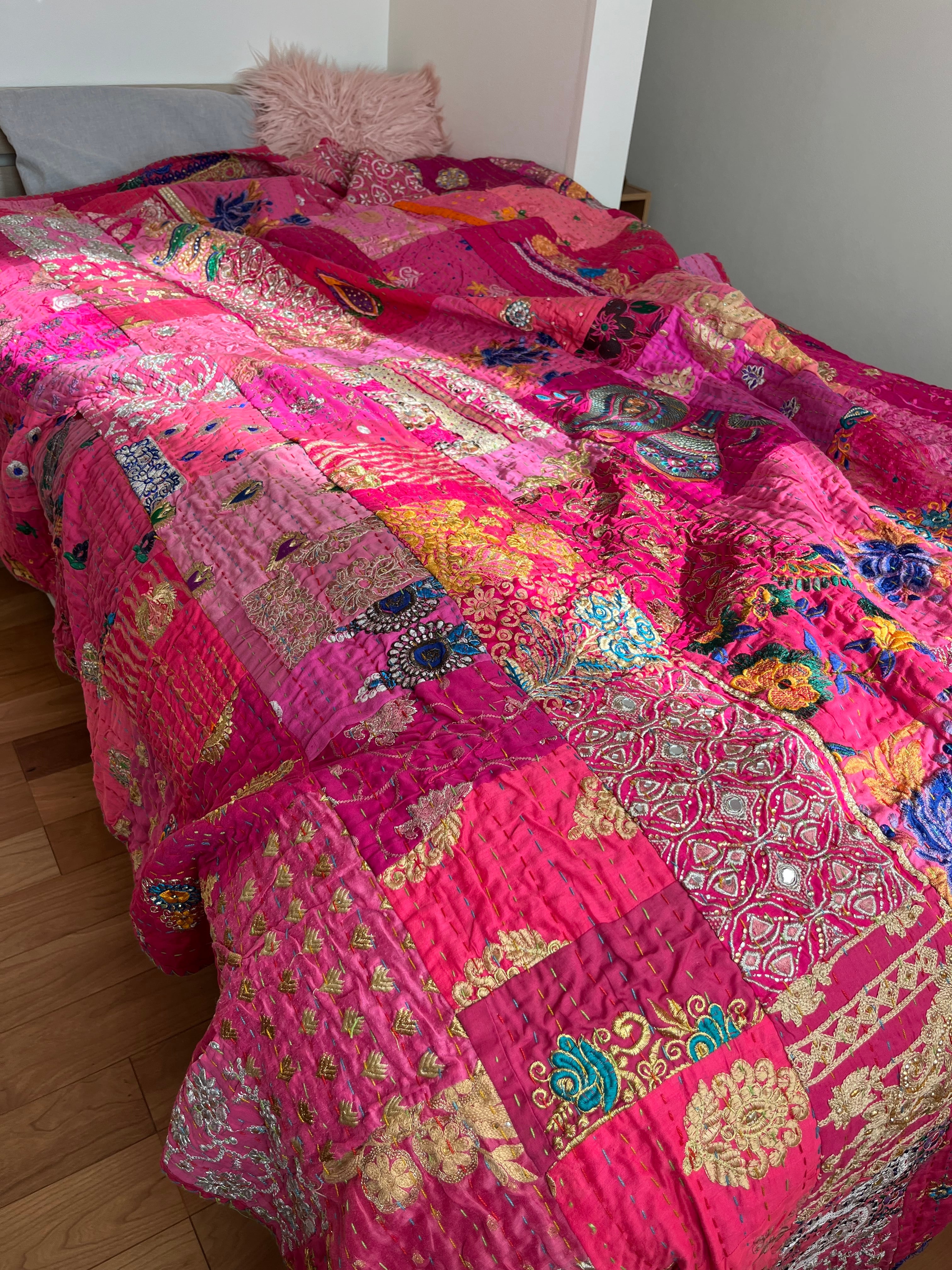 繋ぎ合わせたパッチワークキルトはとても華やか。