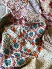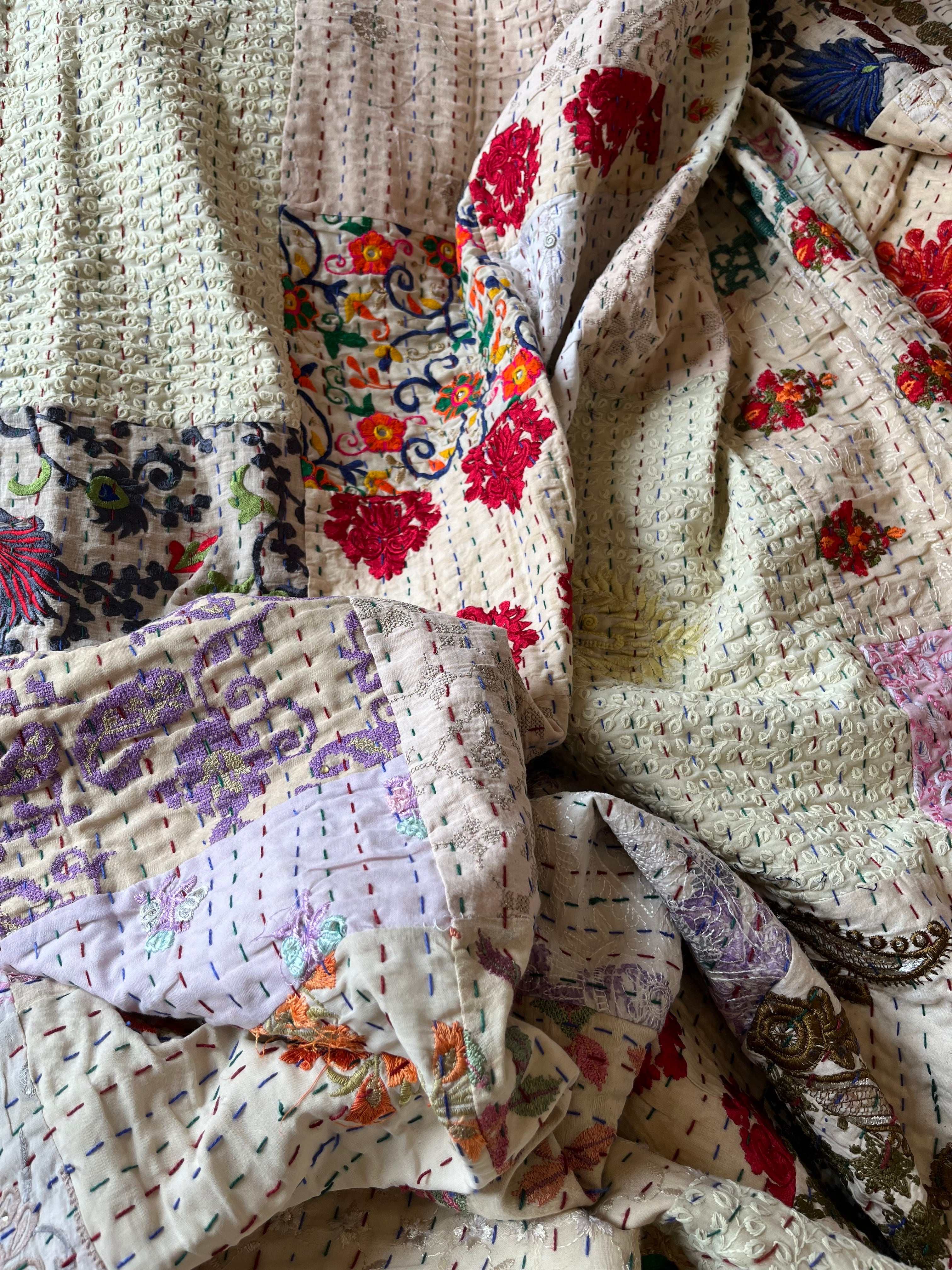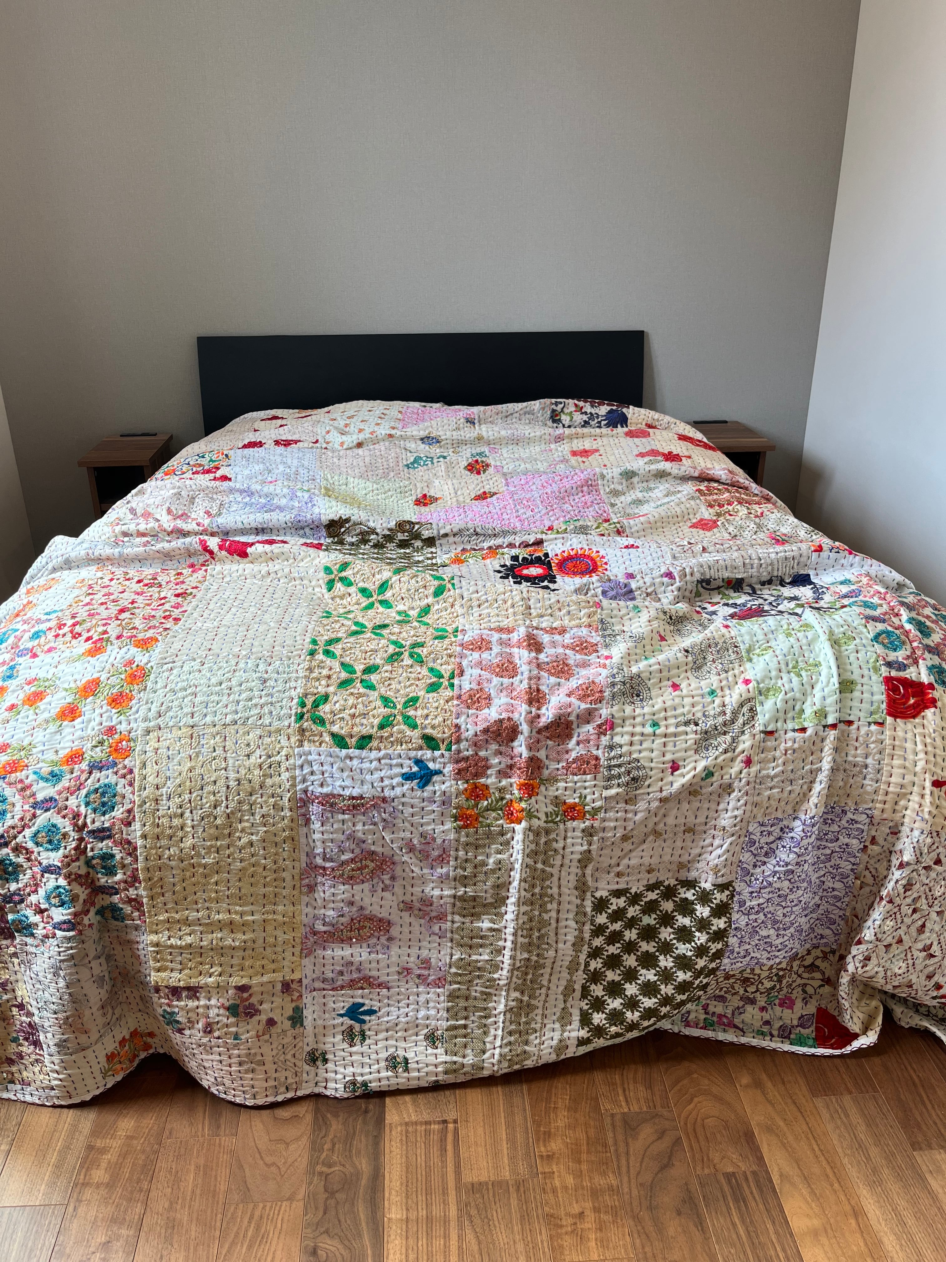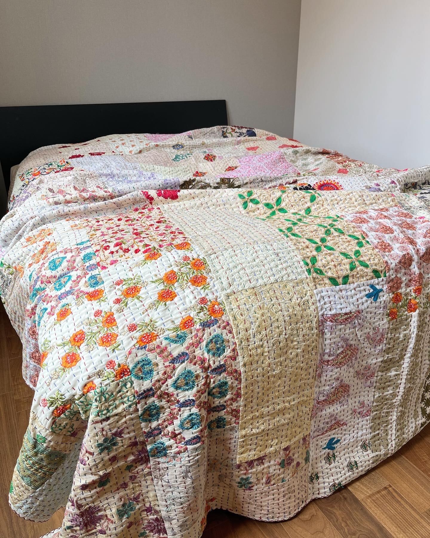 繋ぎ合わせたパッチワークキルトはとても華やか。