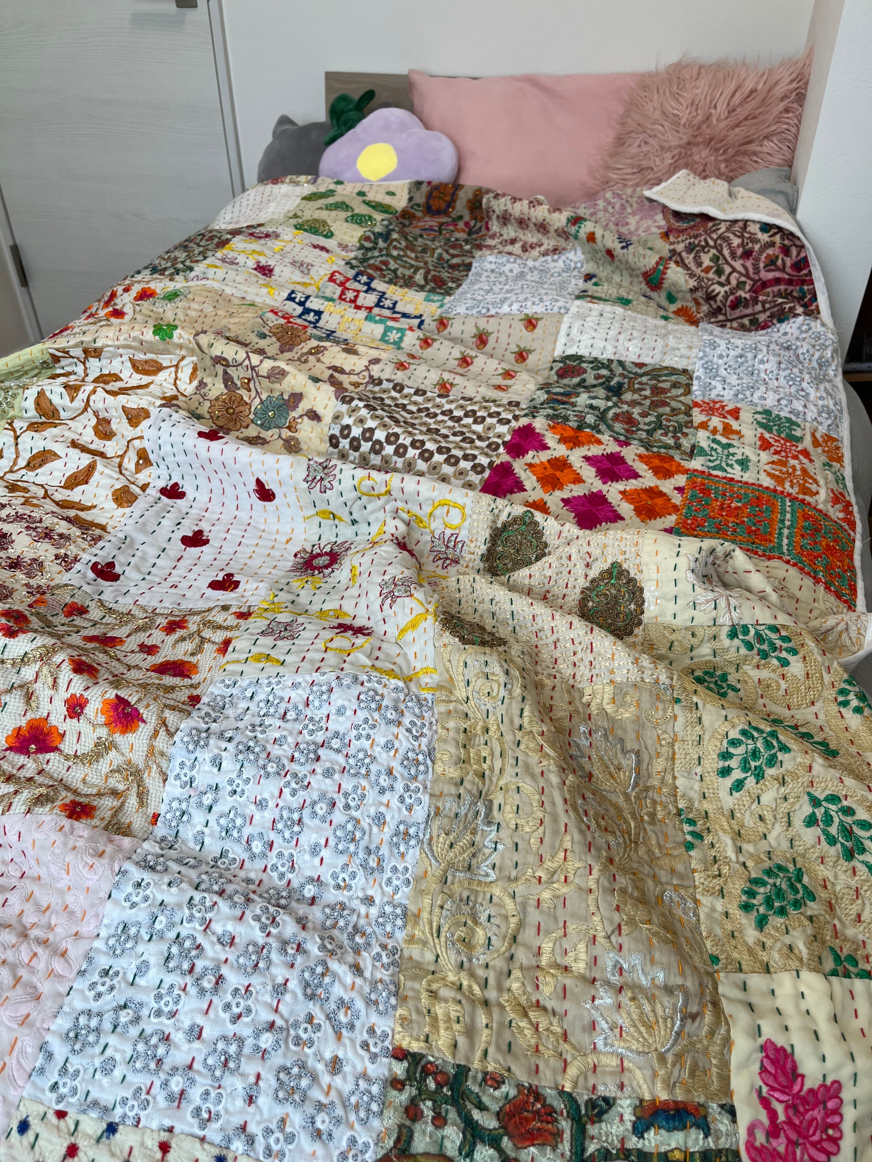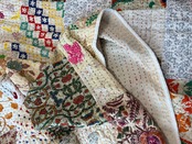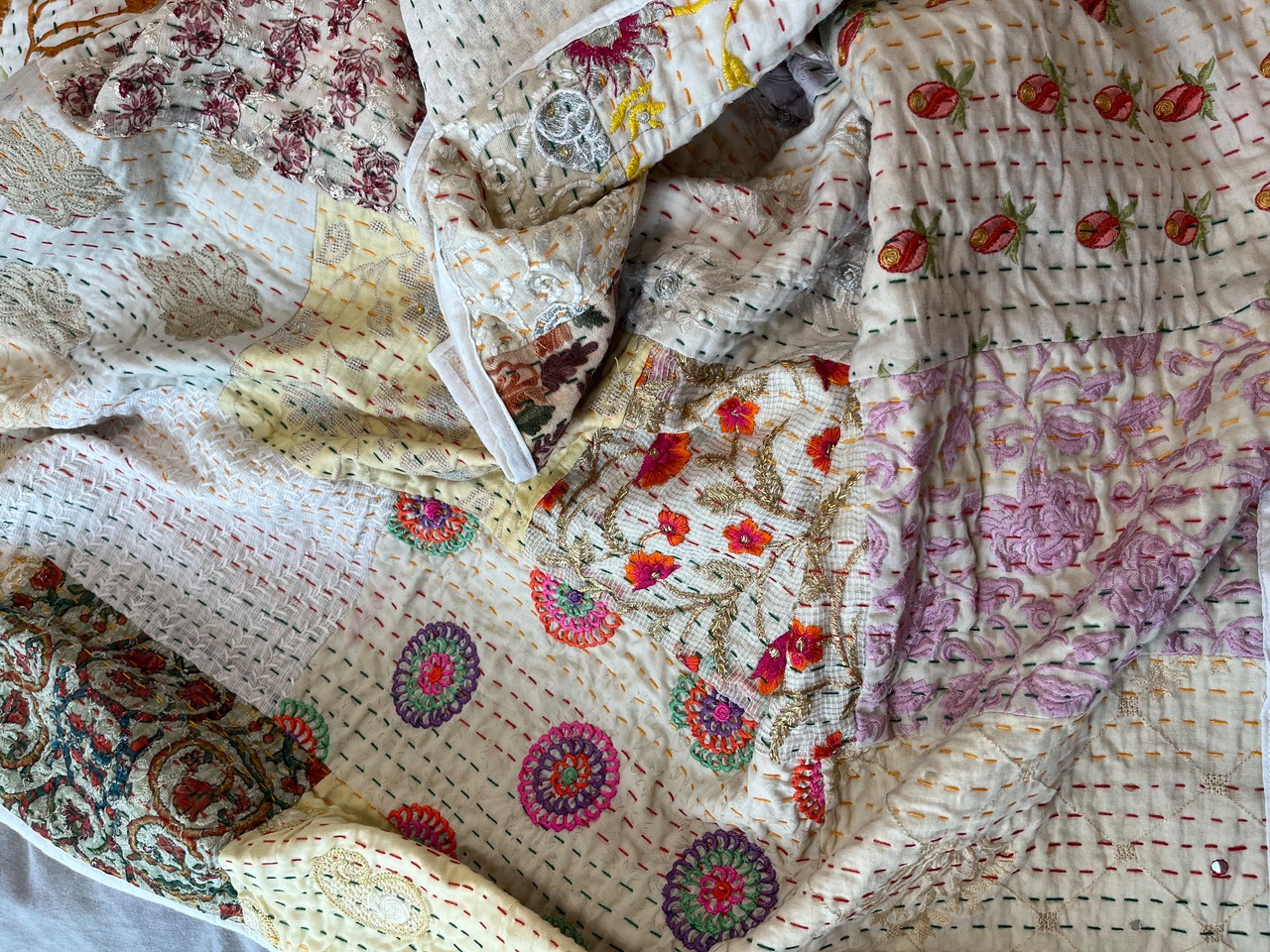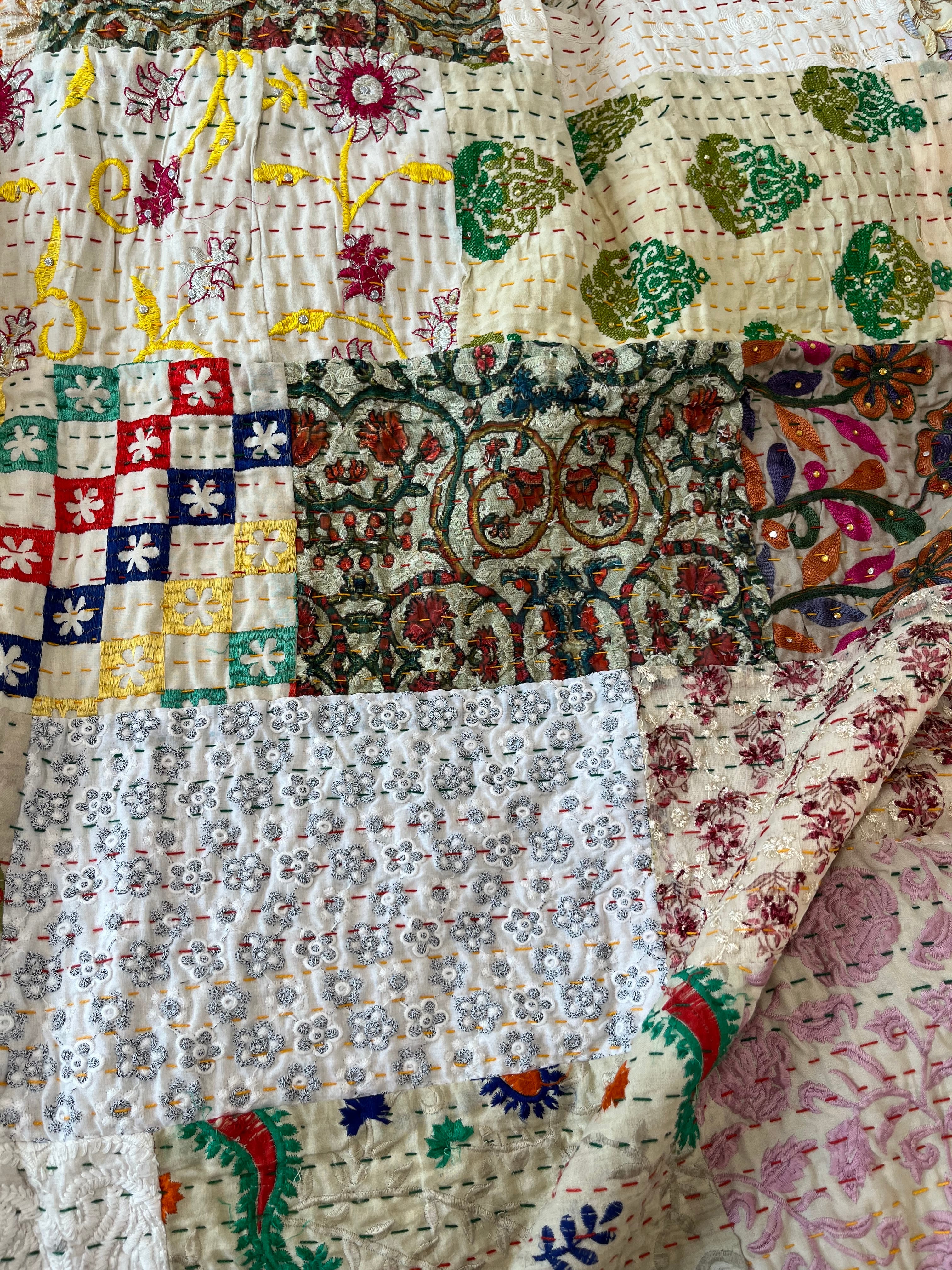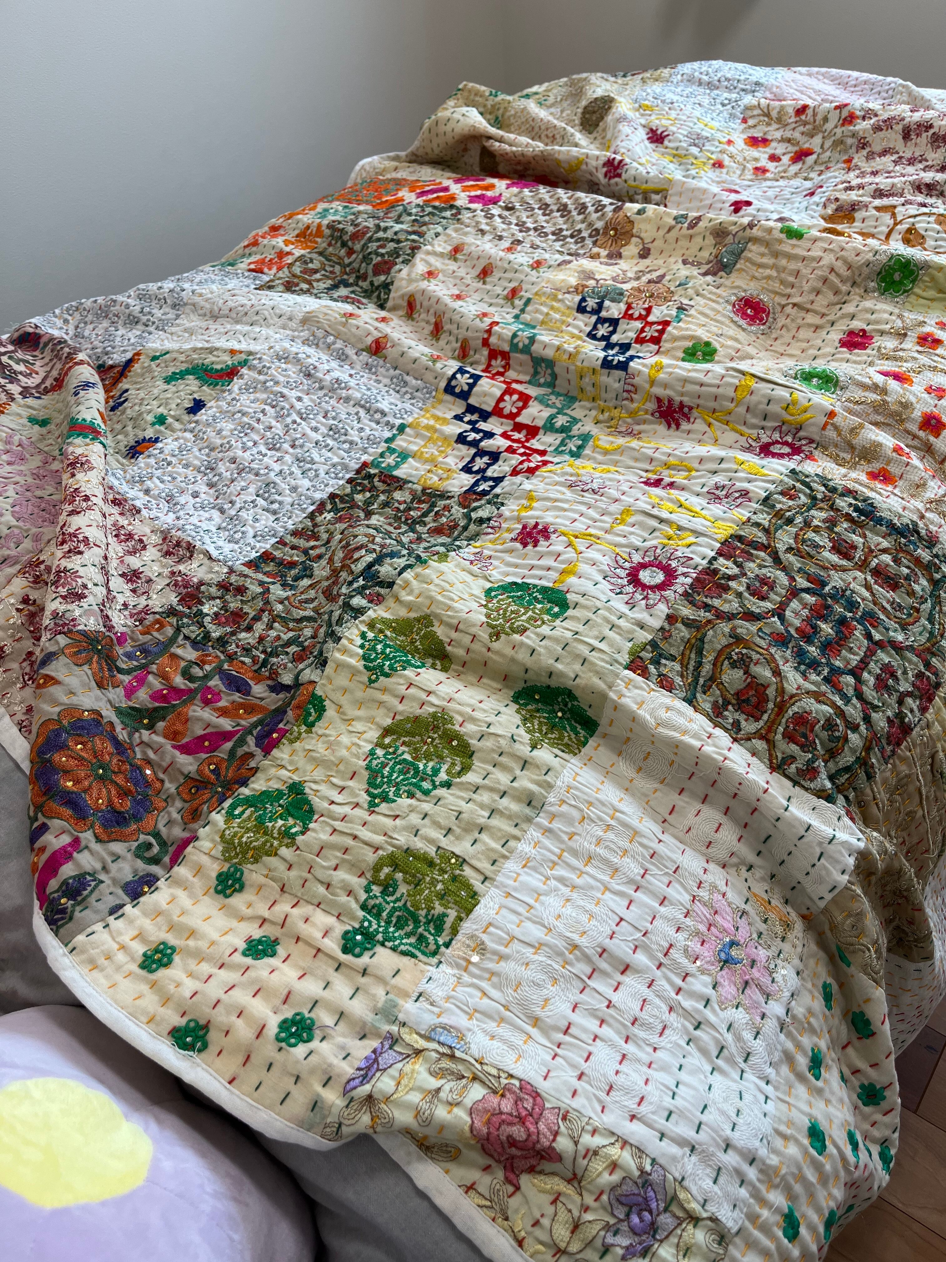 繋ぎ合わせたパッチワークキルトはとても華やか。